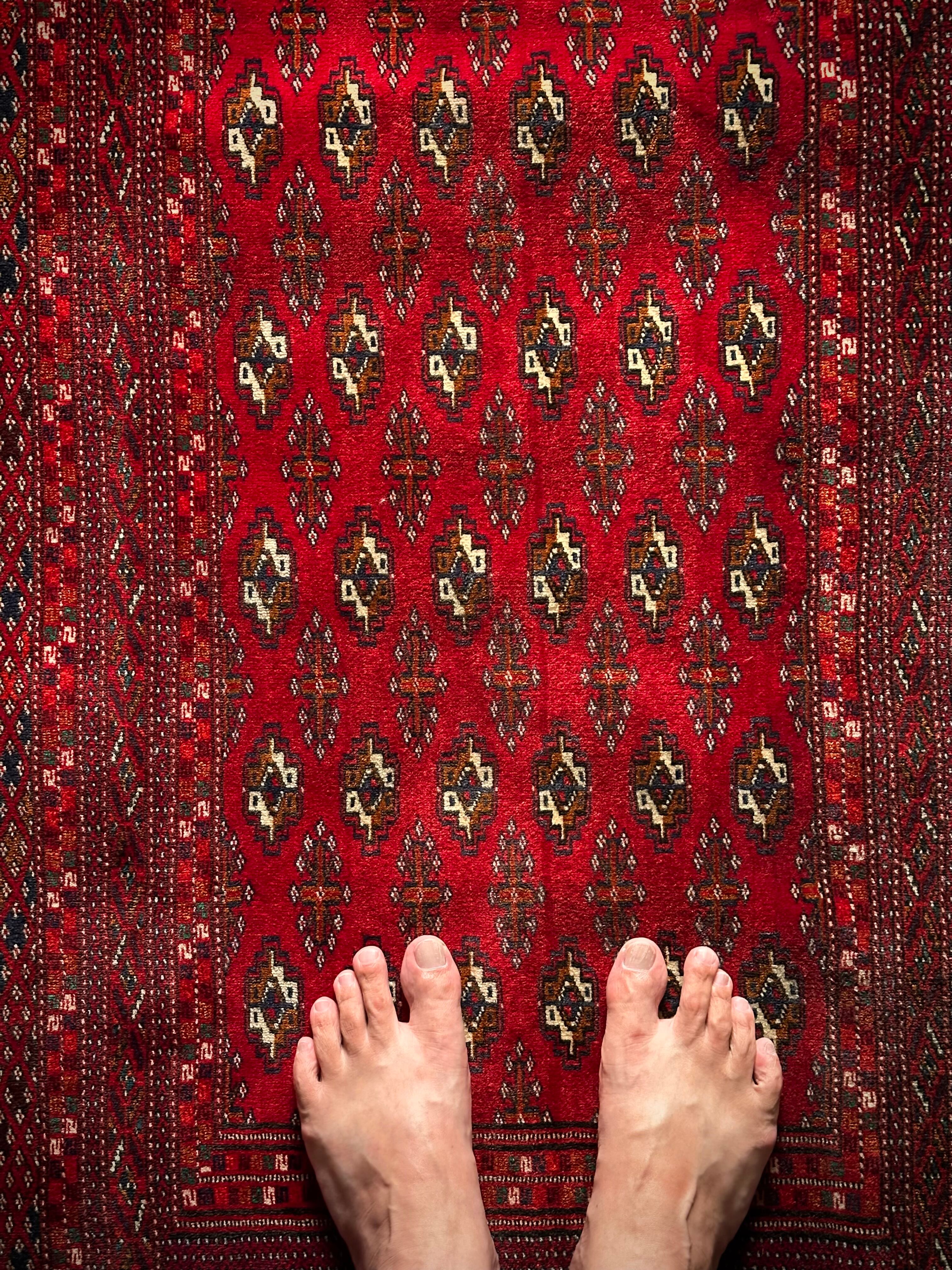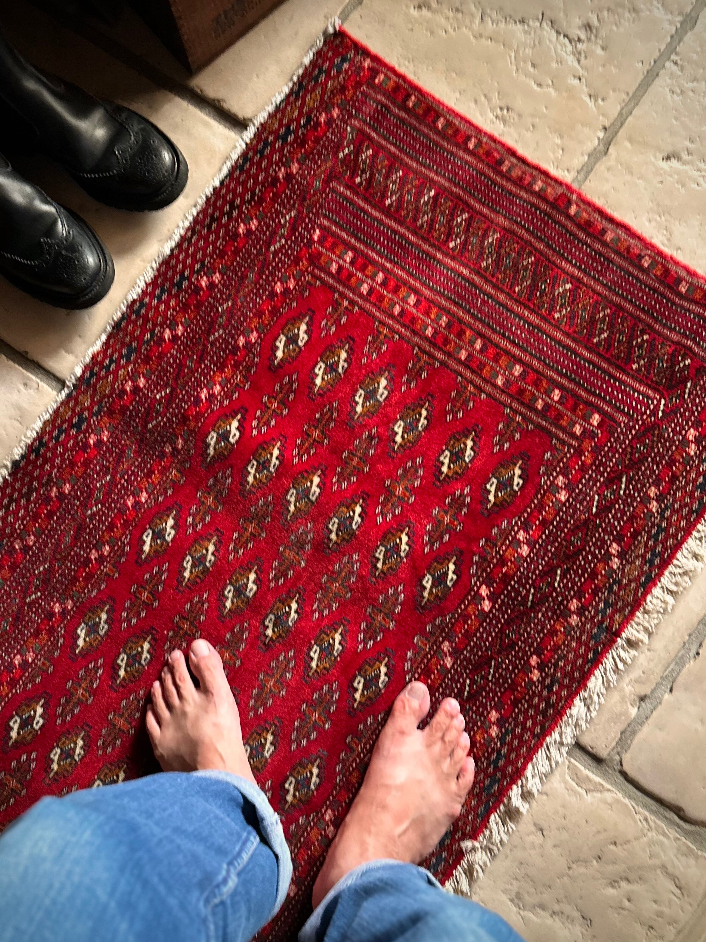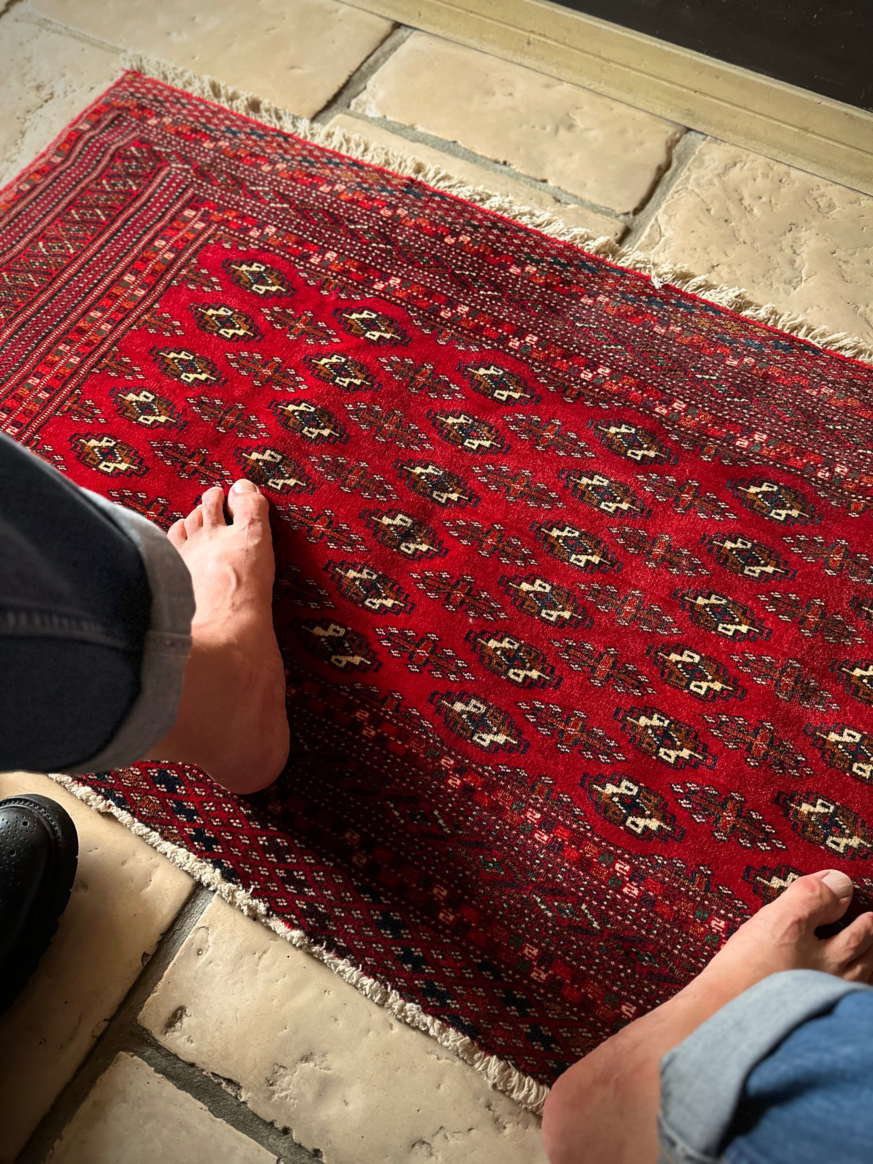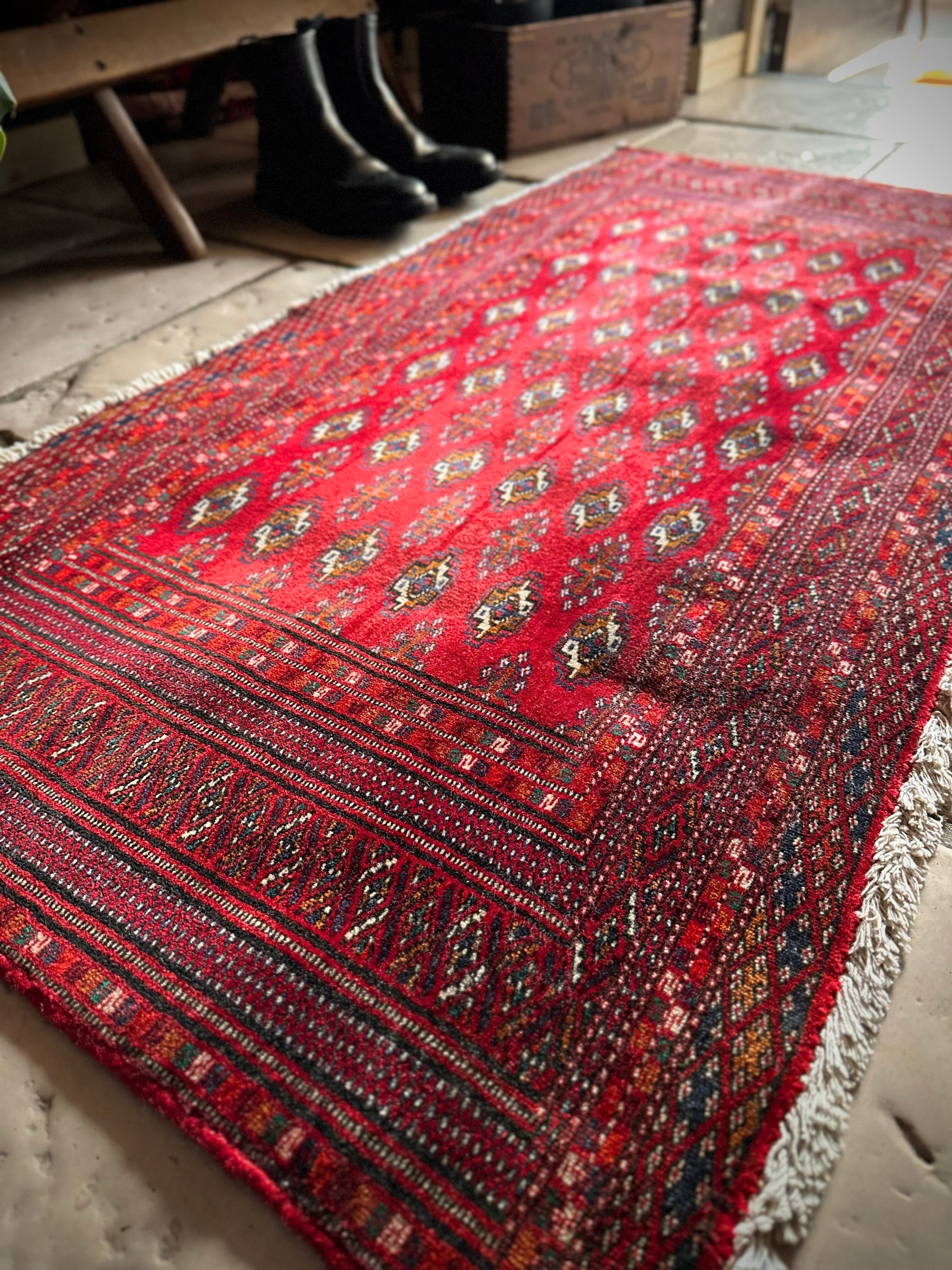 真っ赤な絨毯を代表するトルクメンから、こちらは細かな織りの模様に深みのある赤がヴィンテージ然としたトライバルラグになります。
