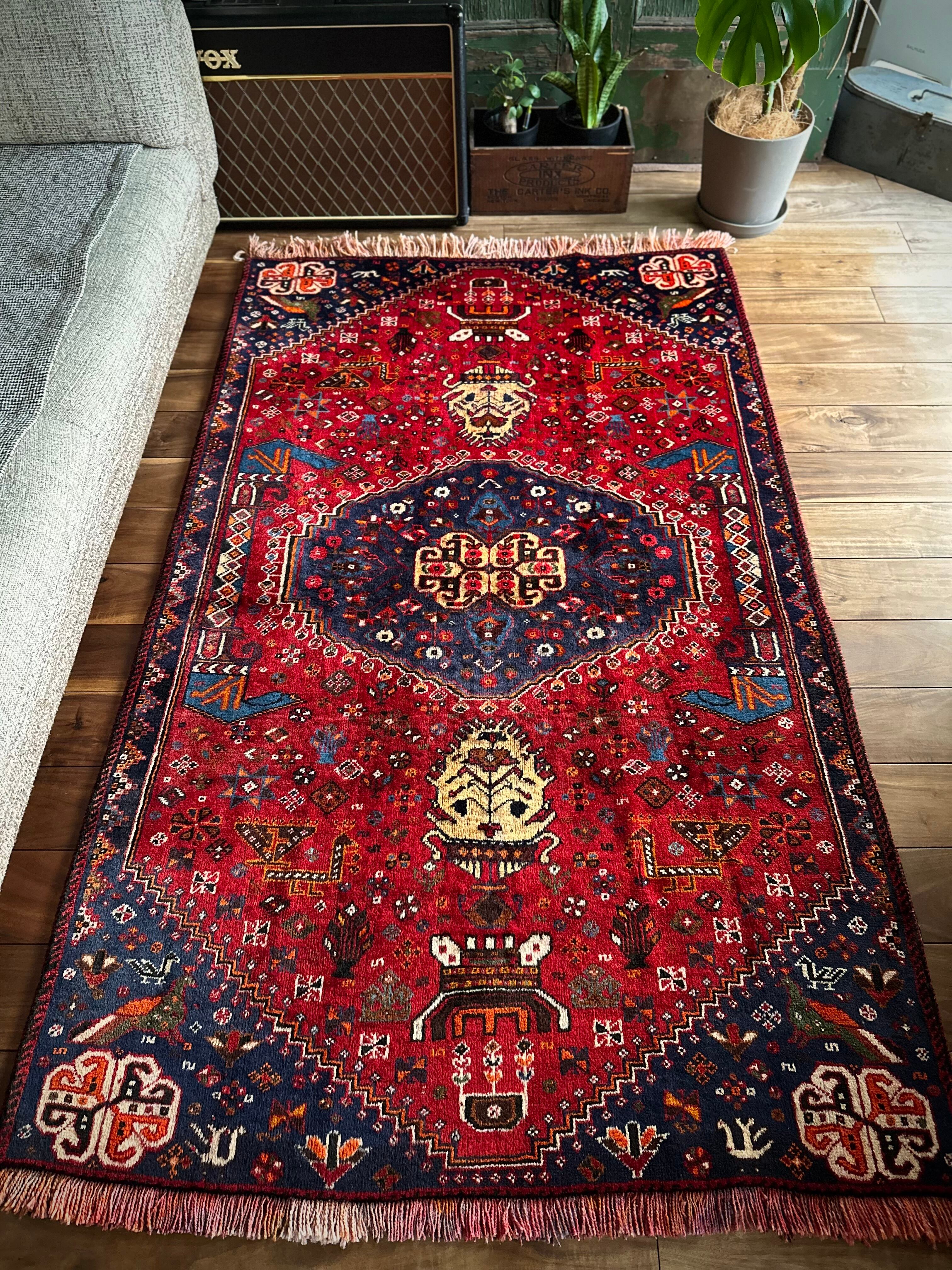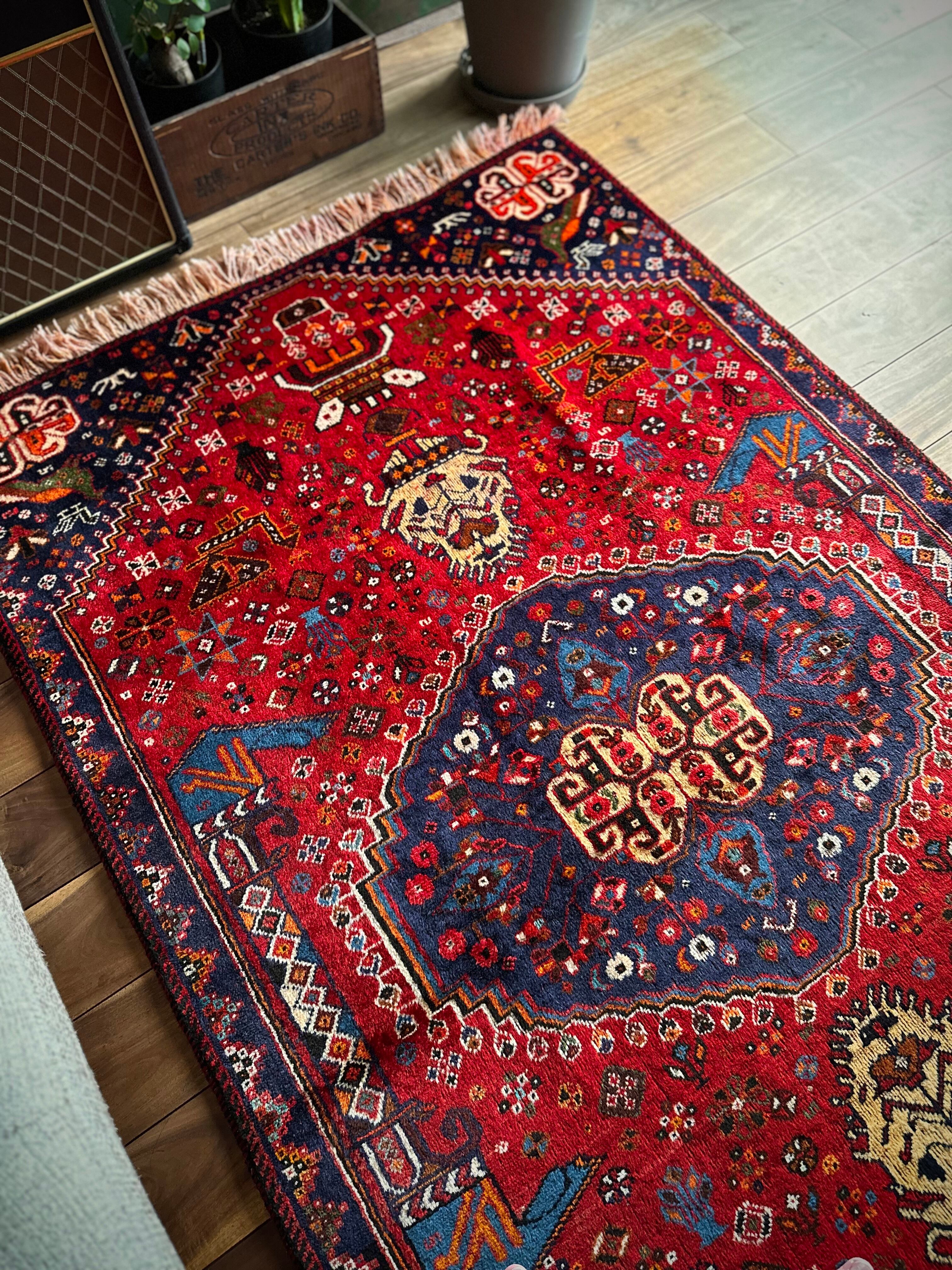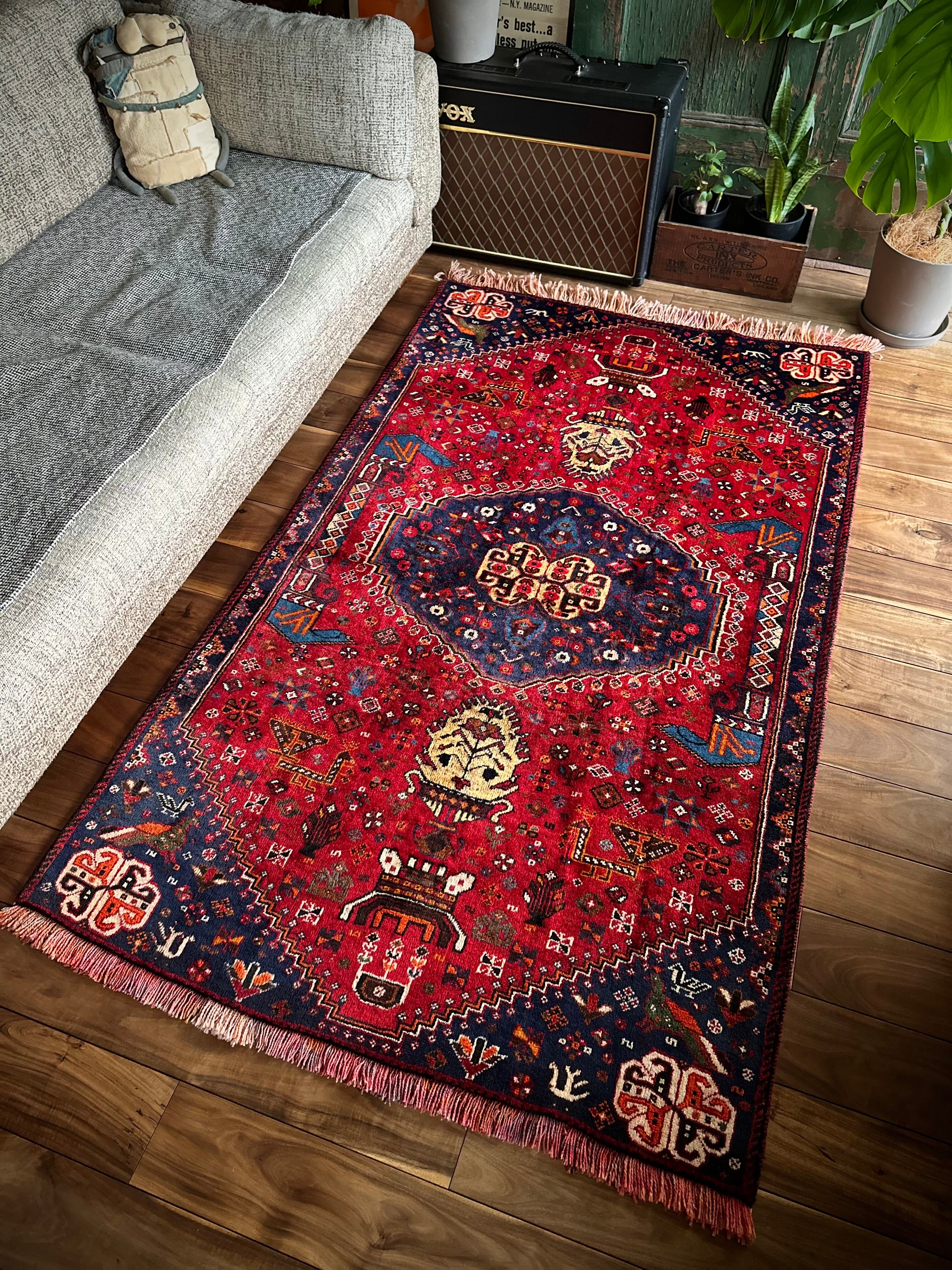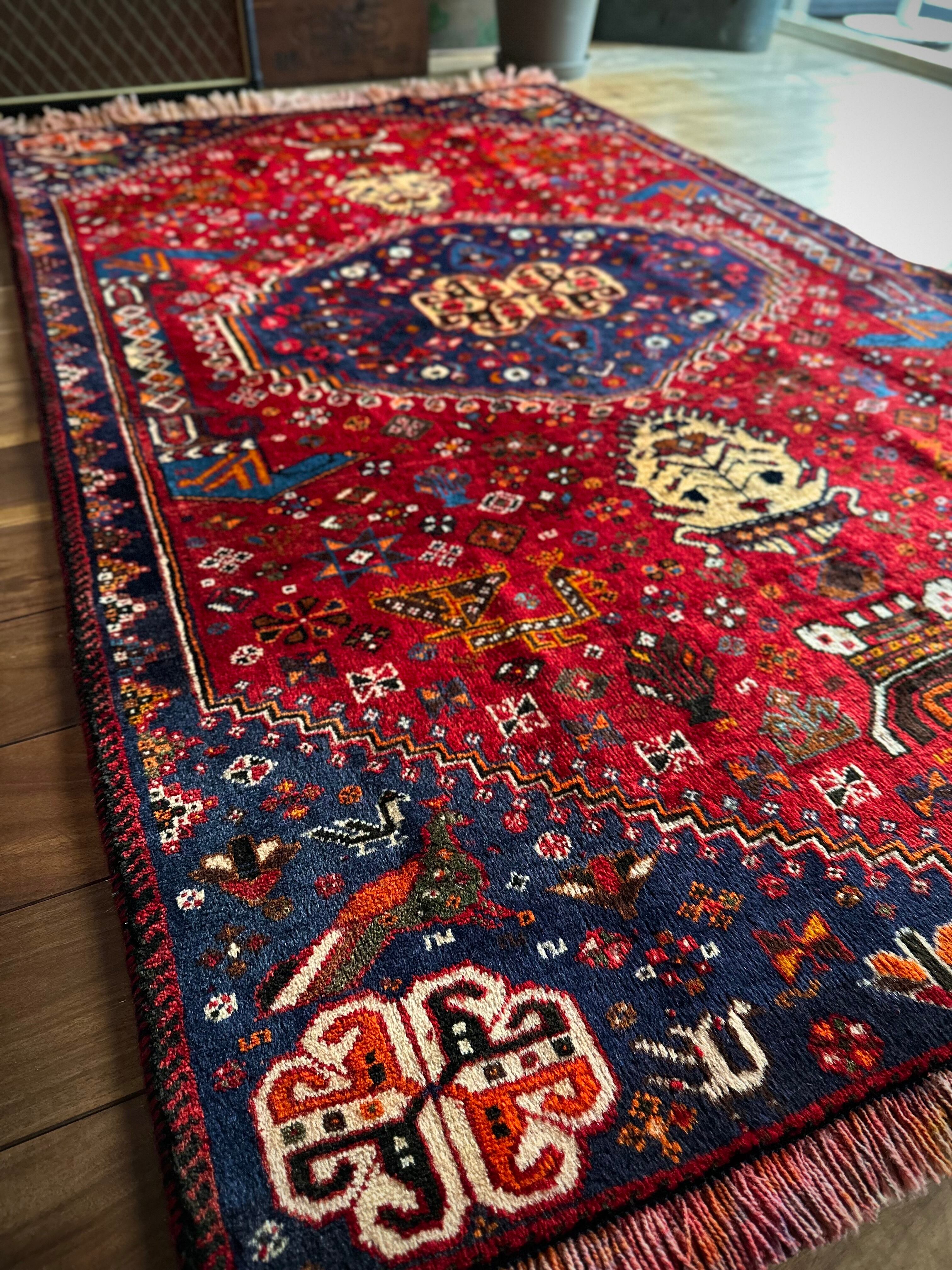 パッと見た目にお花畑〜な印象が持たれるシラーズはカシュガイ族のトライバルラグで、真っ赤なフィールドを際立たせる艶やかなネイビーの縁取りが良いですねーと、全体的に散りばめられた花や鳥が賑やかな1枚になります。
