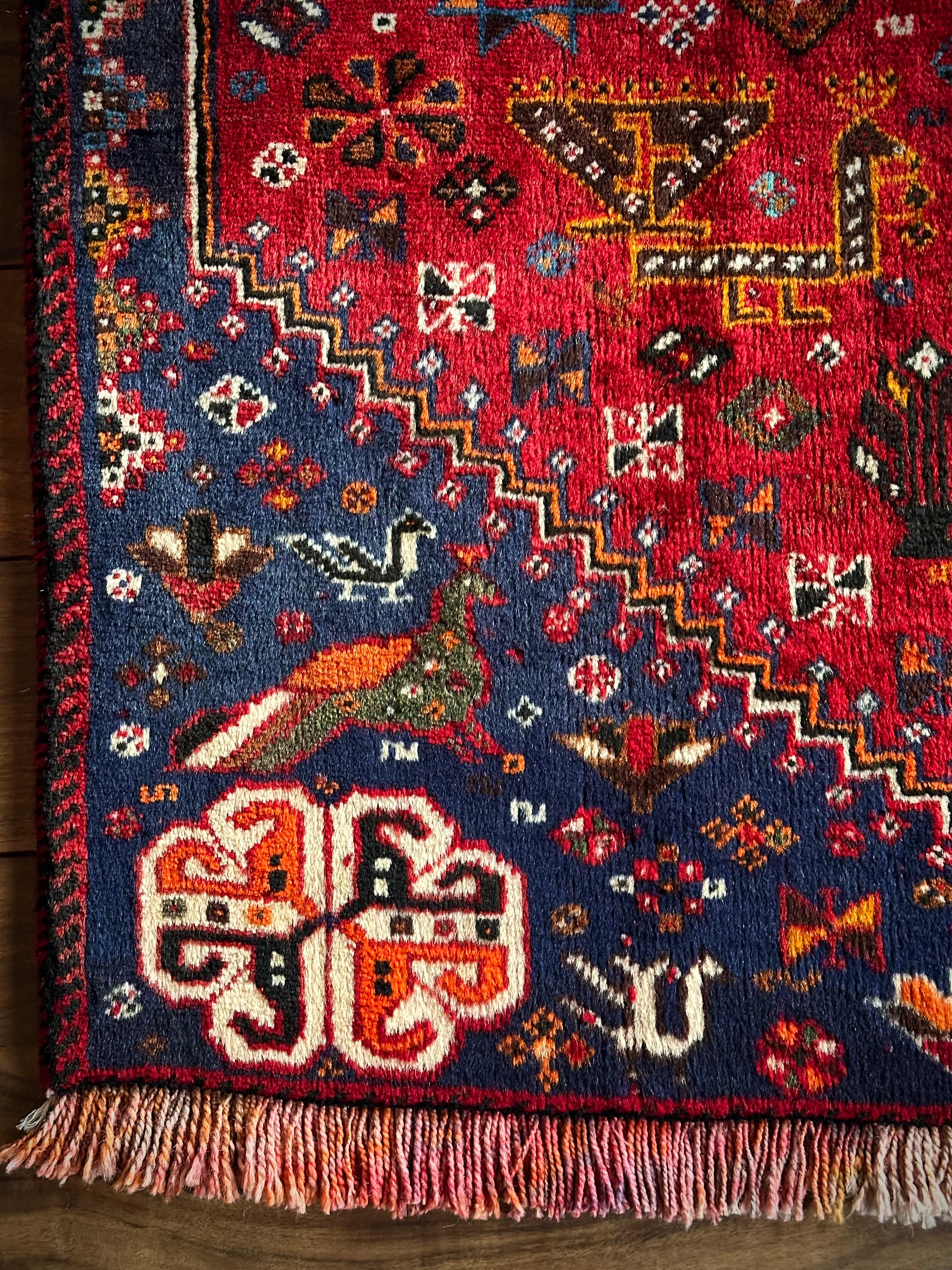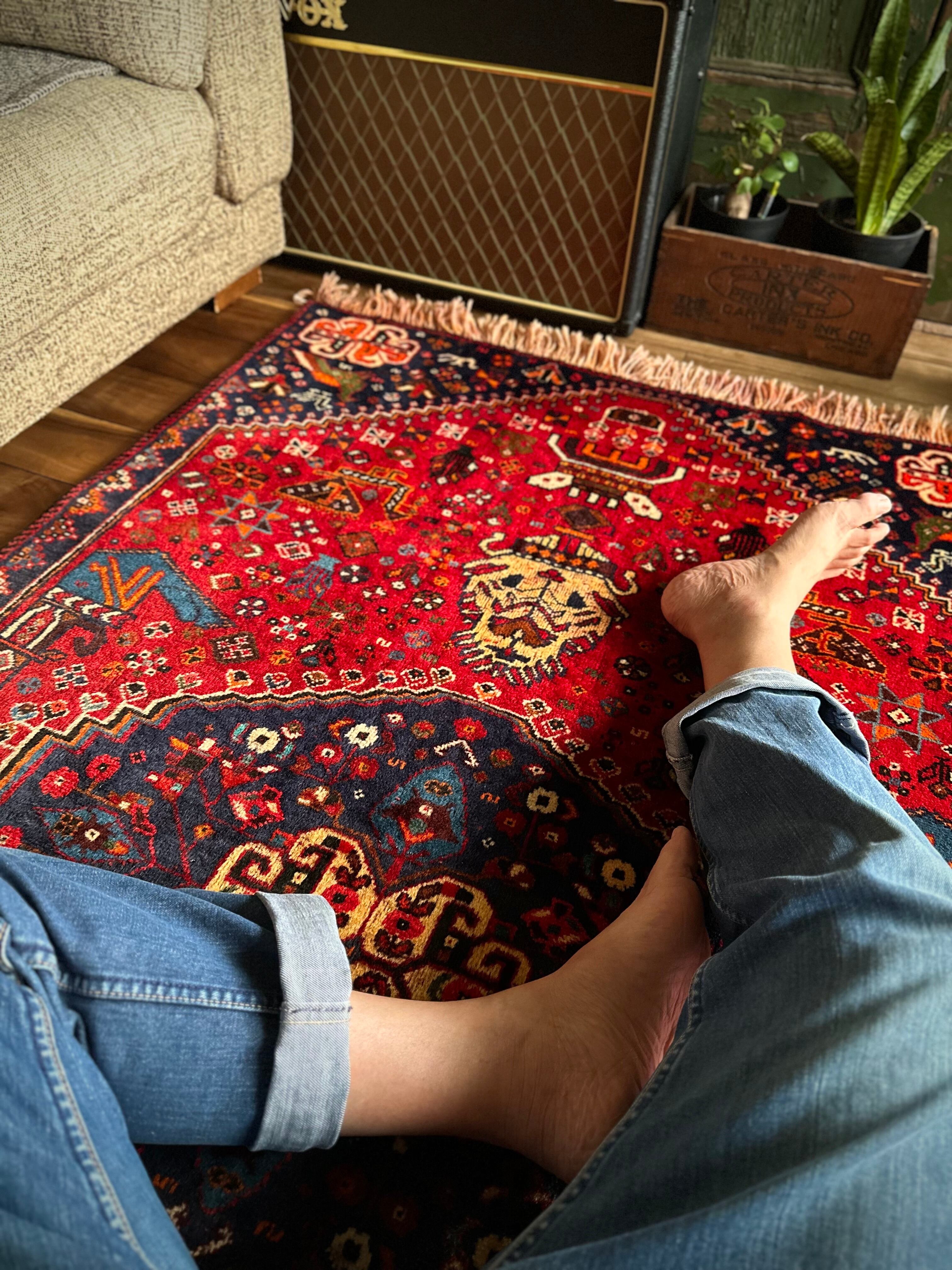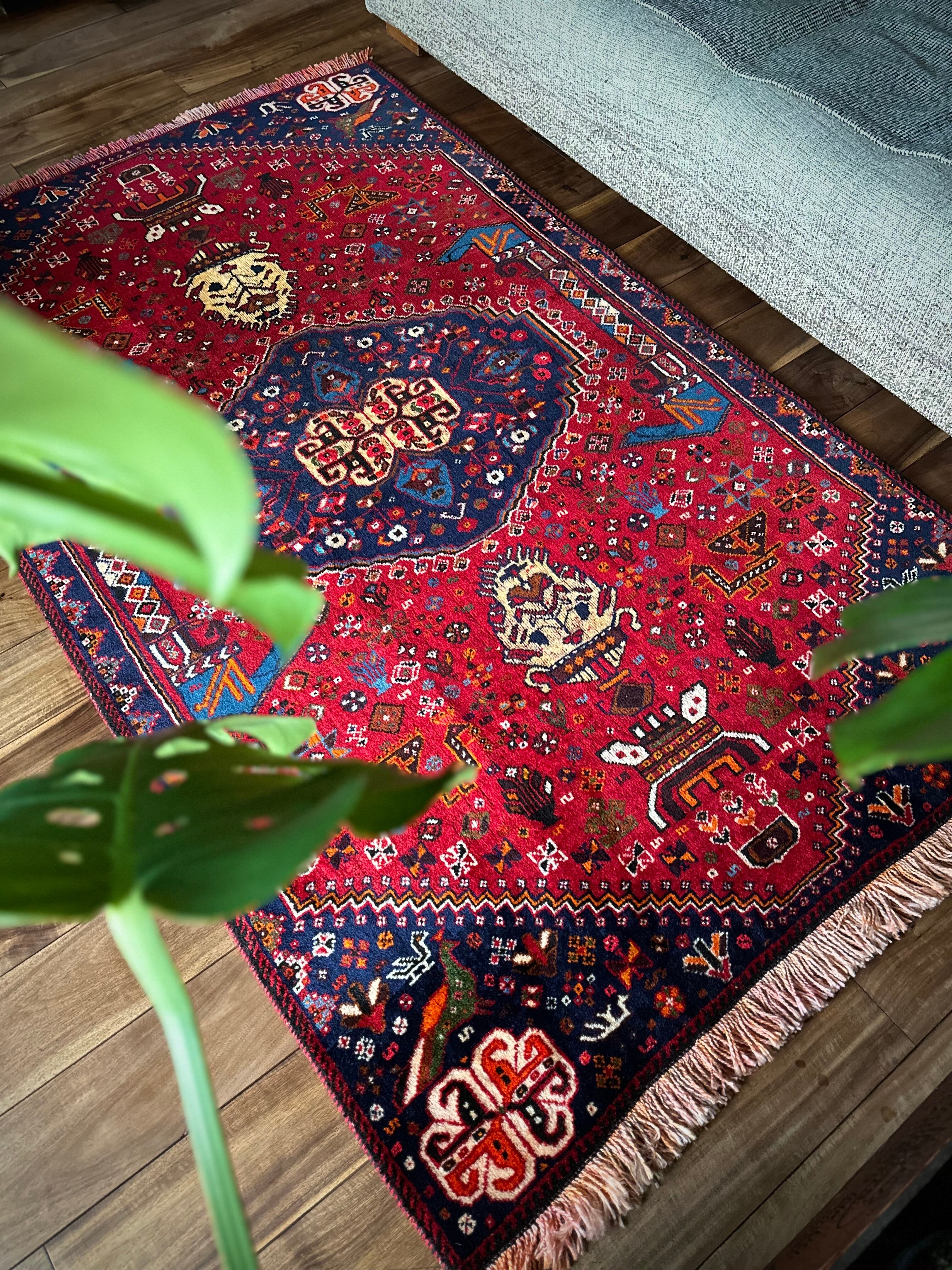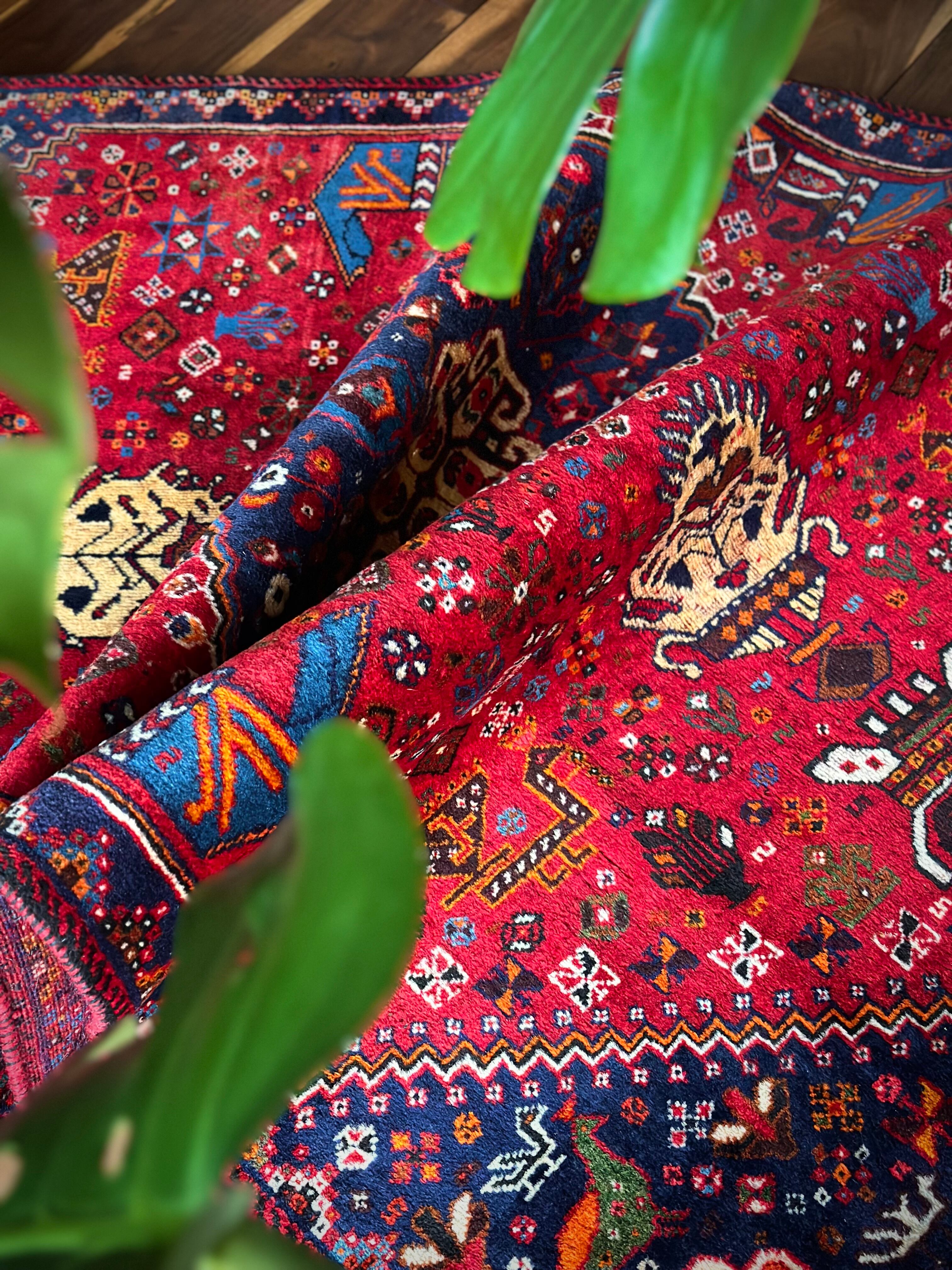 パッと見た目にお花畑〜な印象が持たれるシラーズはカシュガイ族のトライバルラグで、真っ赤なフィールドを際立たせる艶やかなネイビーの縁取りが良いですねーと、全体的に散りばめられた花や鳥が賑やかな1枚になります。