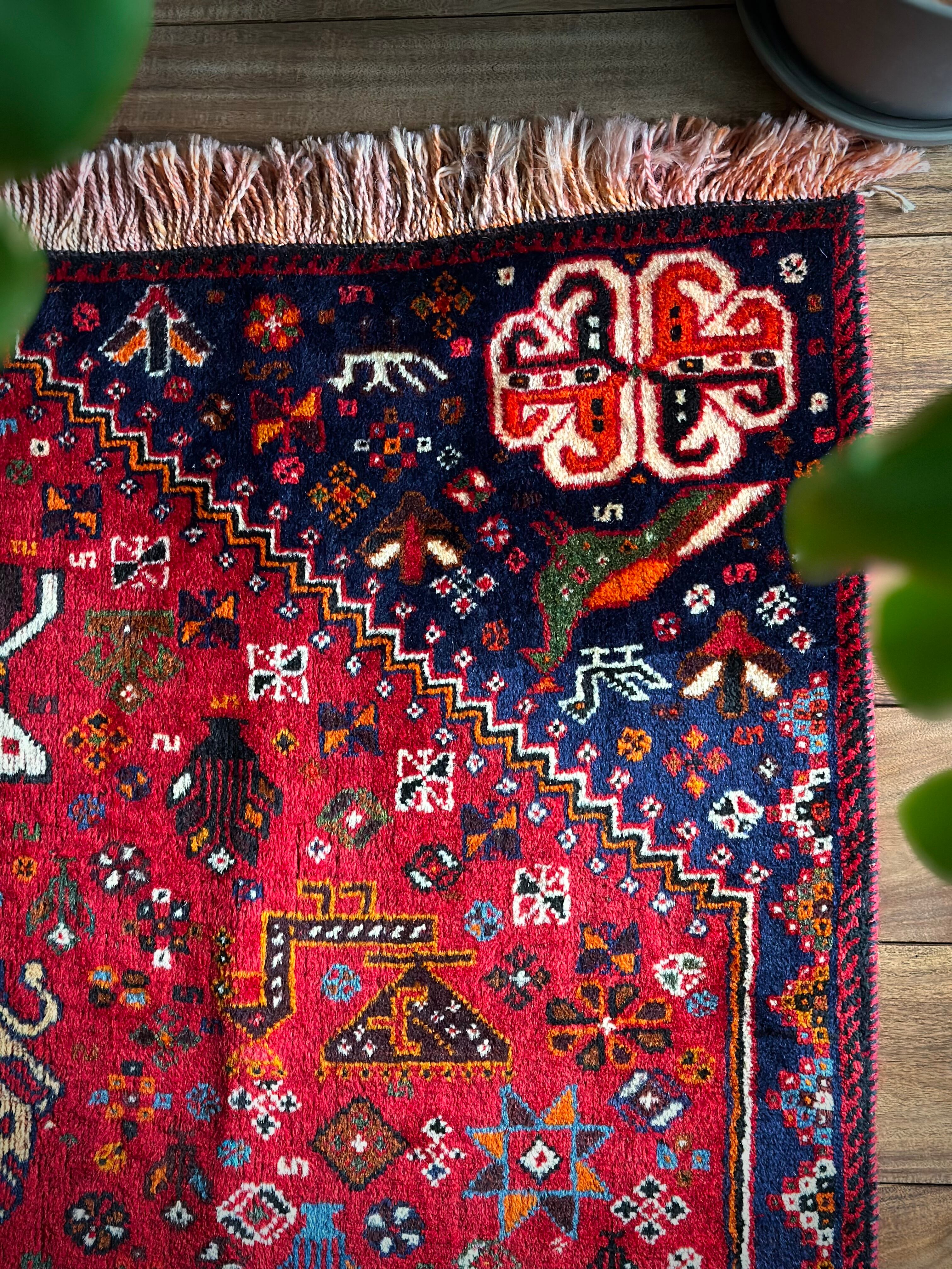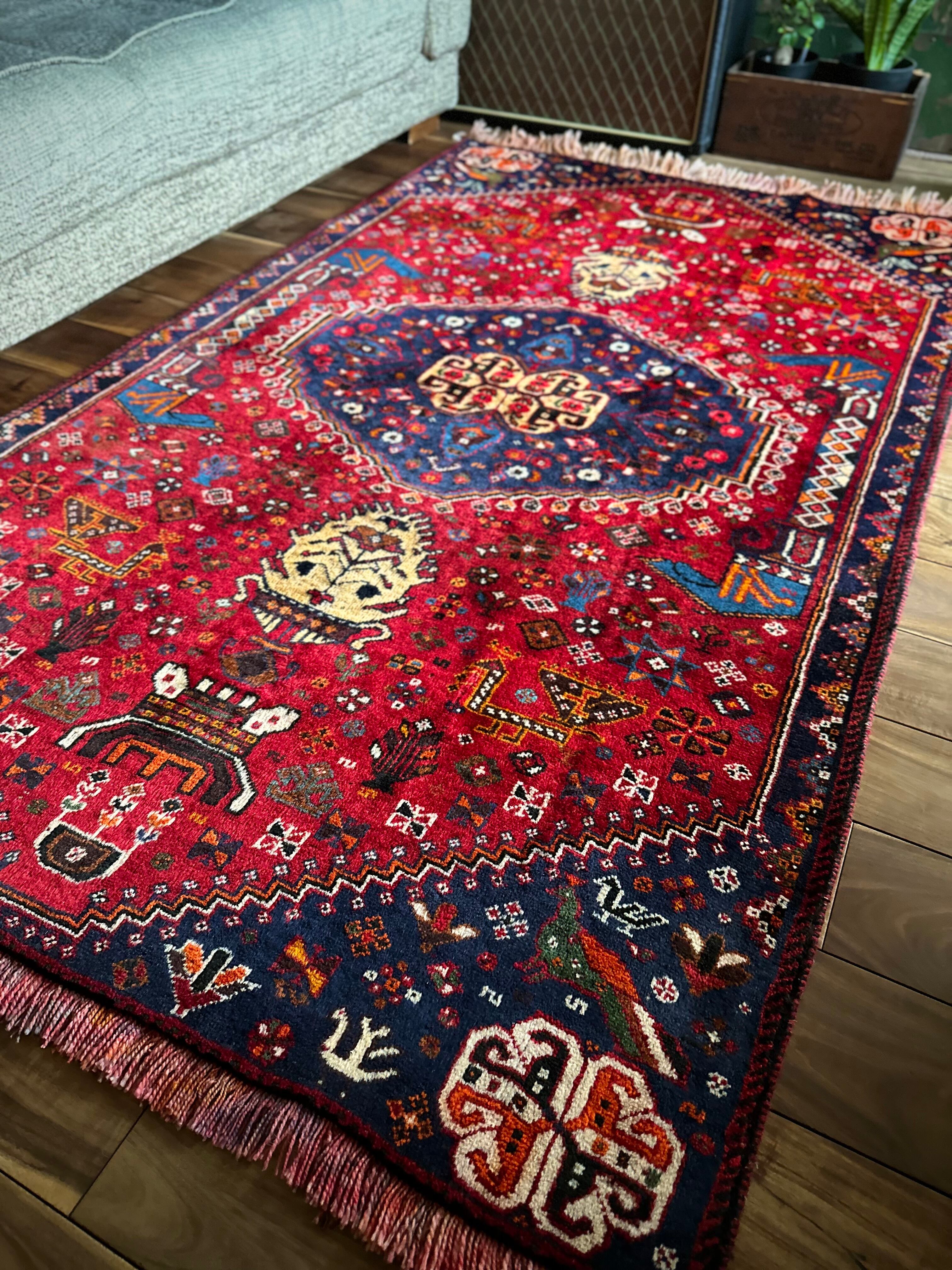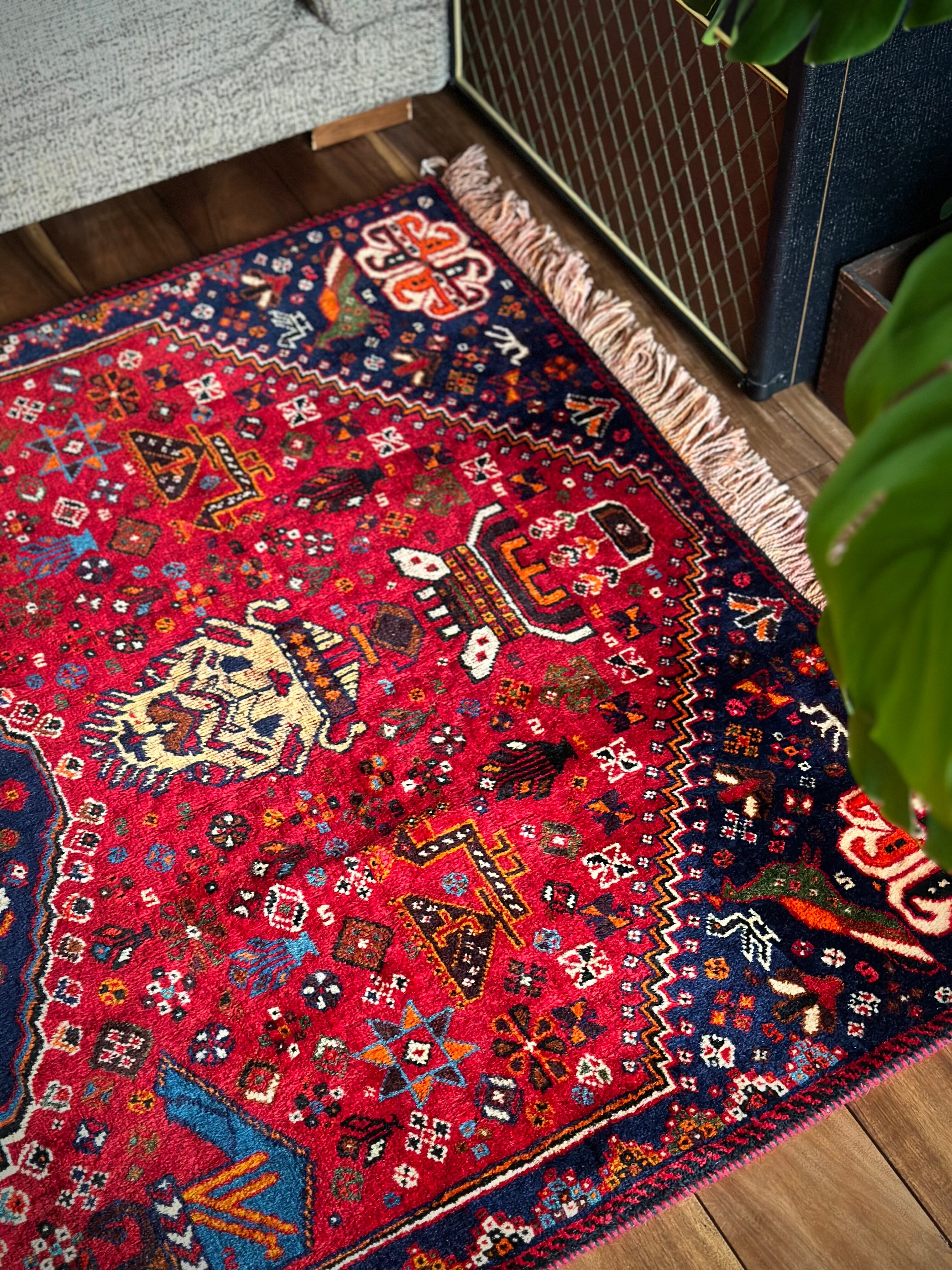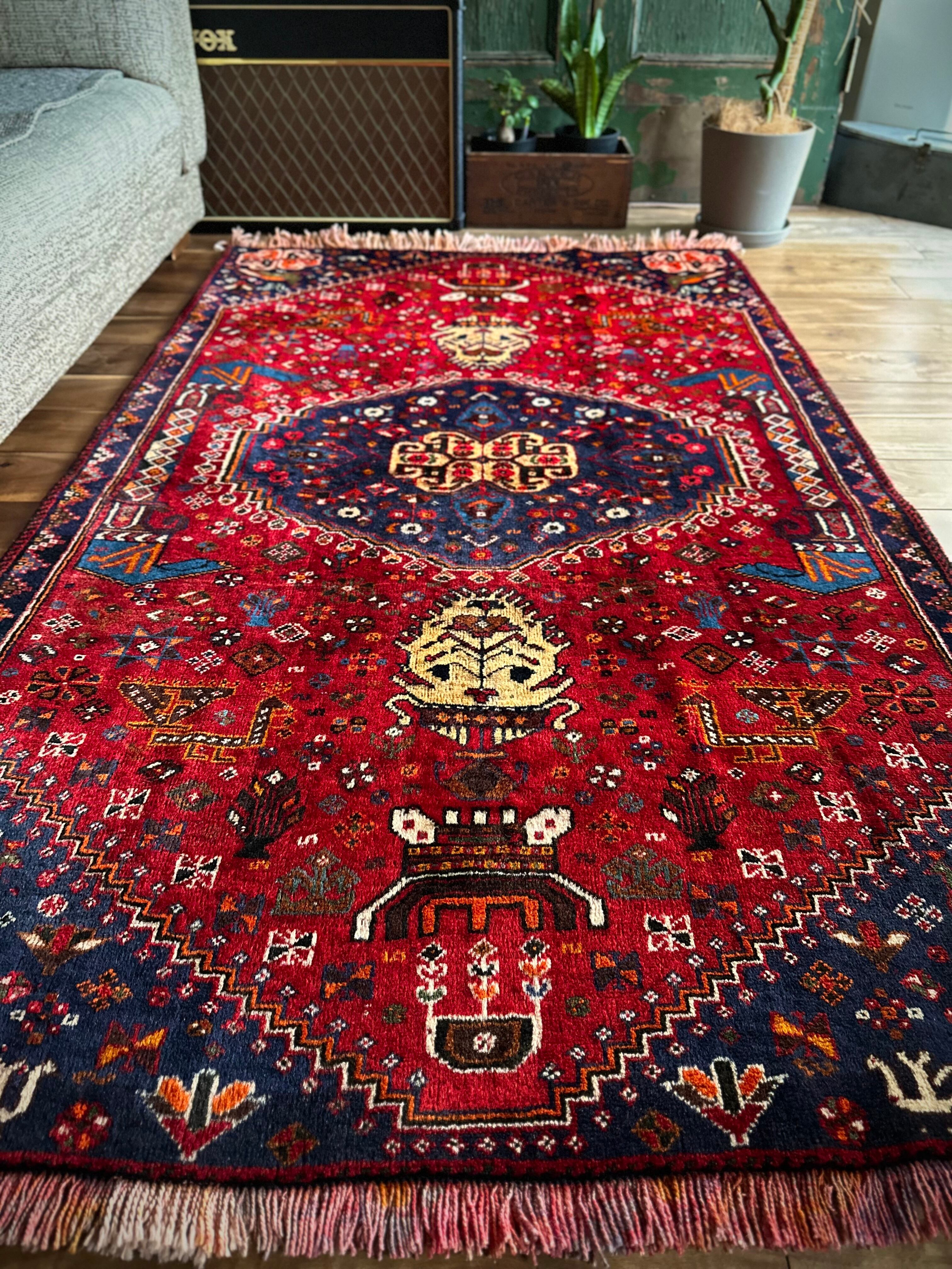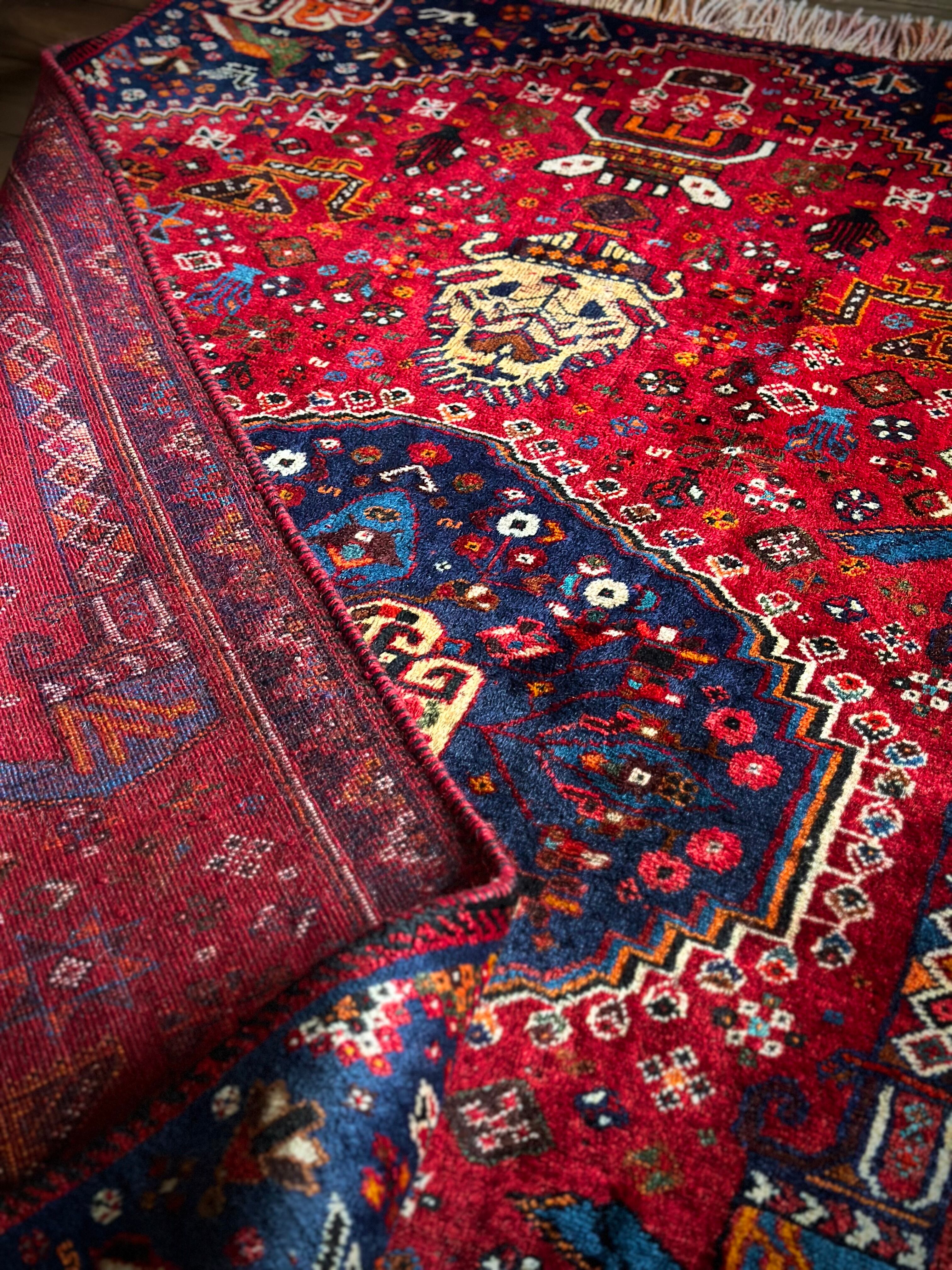 パッと見た目にお花畑〜な印象が持たれるシラーズはカシュガイ族のトライバルラグで、真っ赤なフィールドを際立たせる艶やかなネイビーの縁取りが良いですねーと、全体的に散りばめられた花や鳥が賑やかな1枚になります。