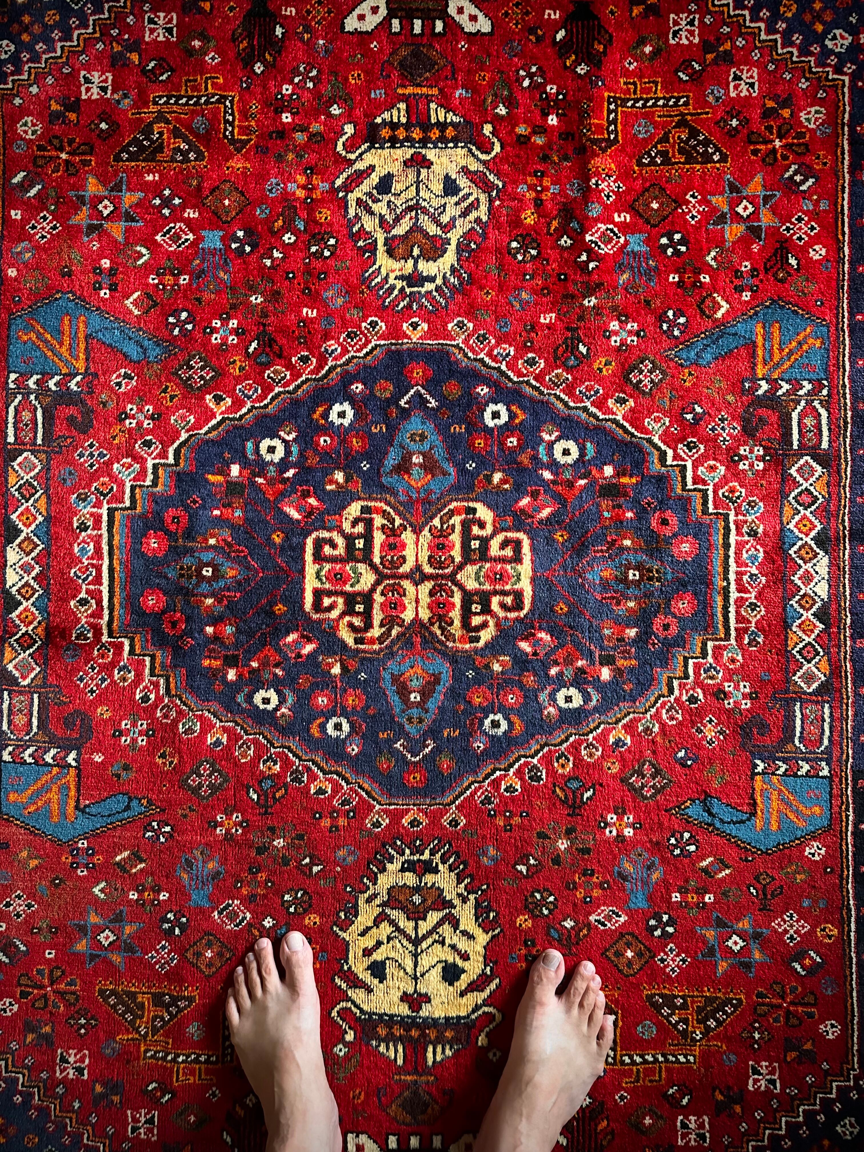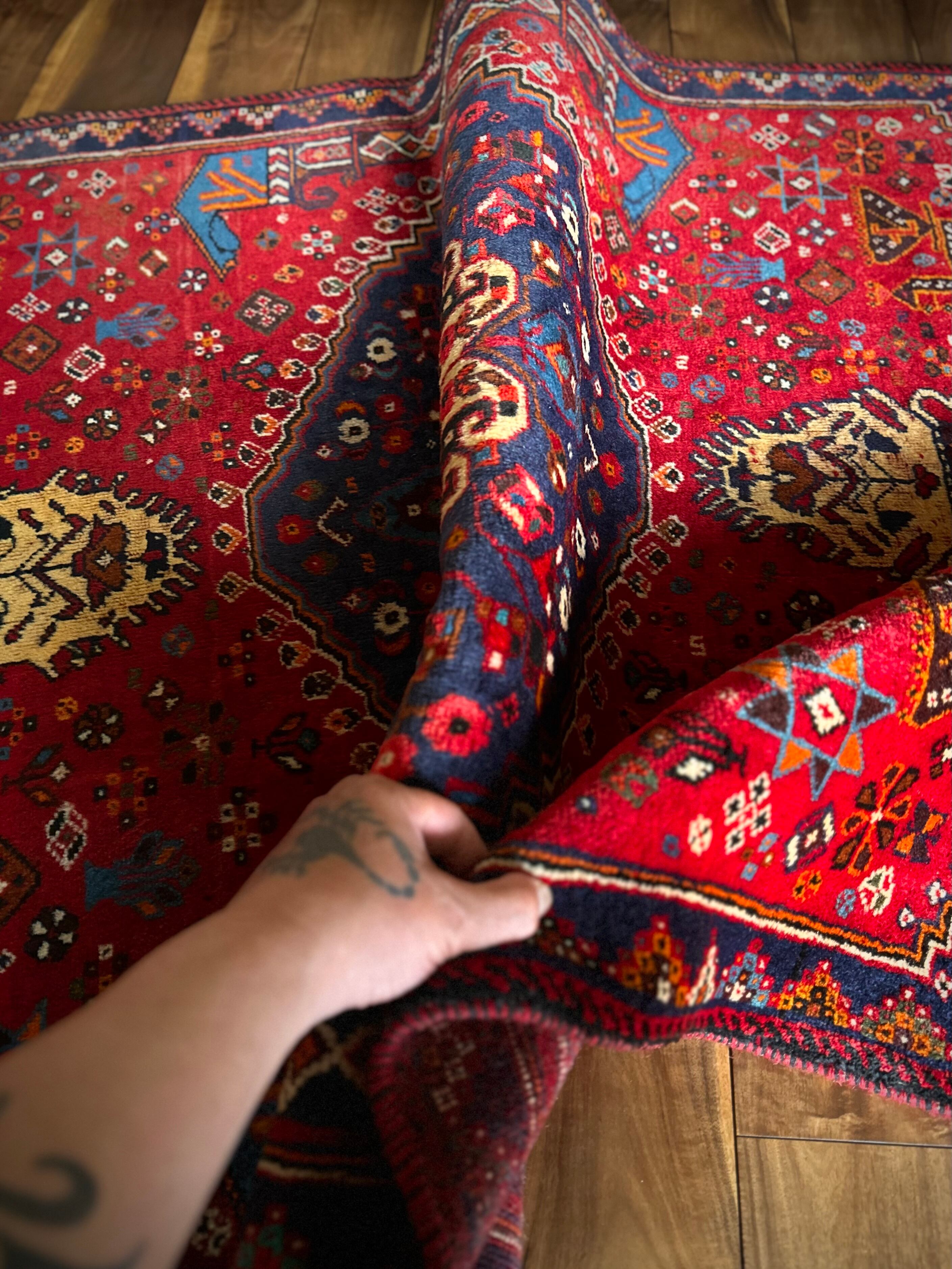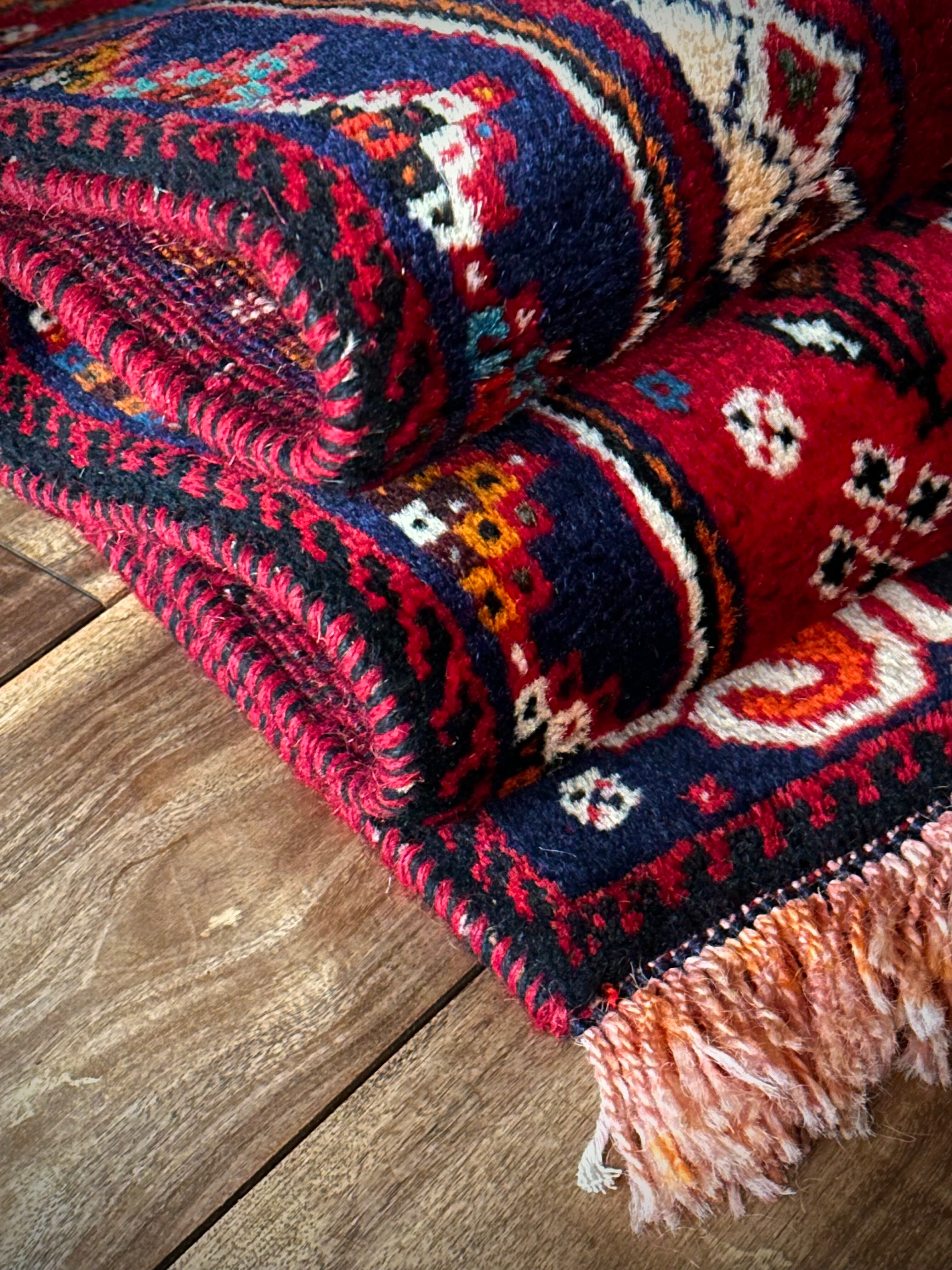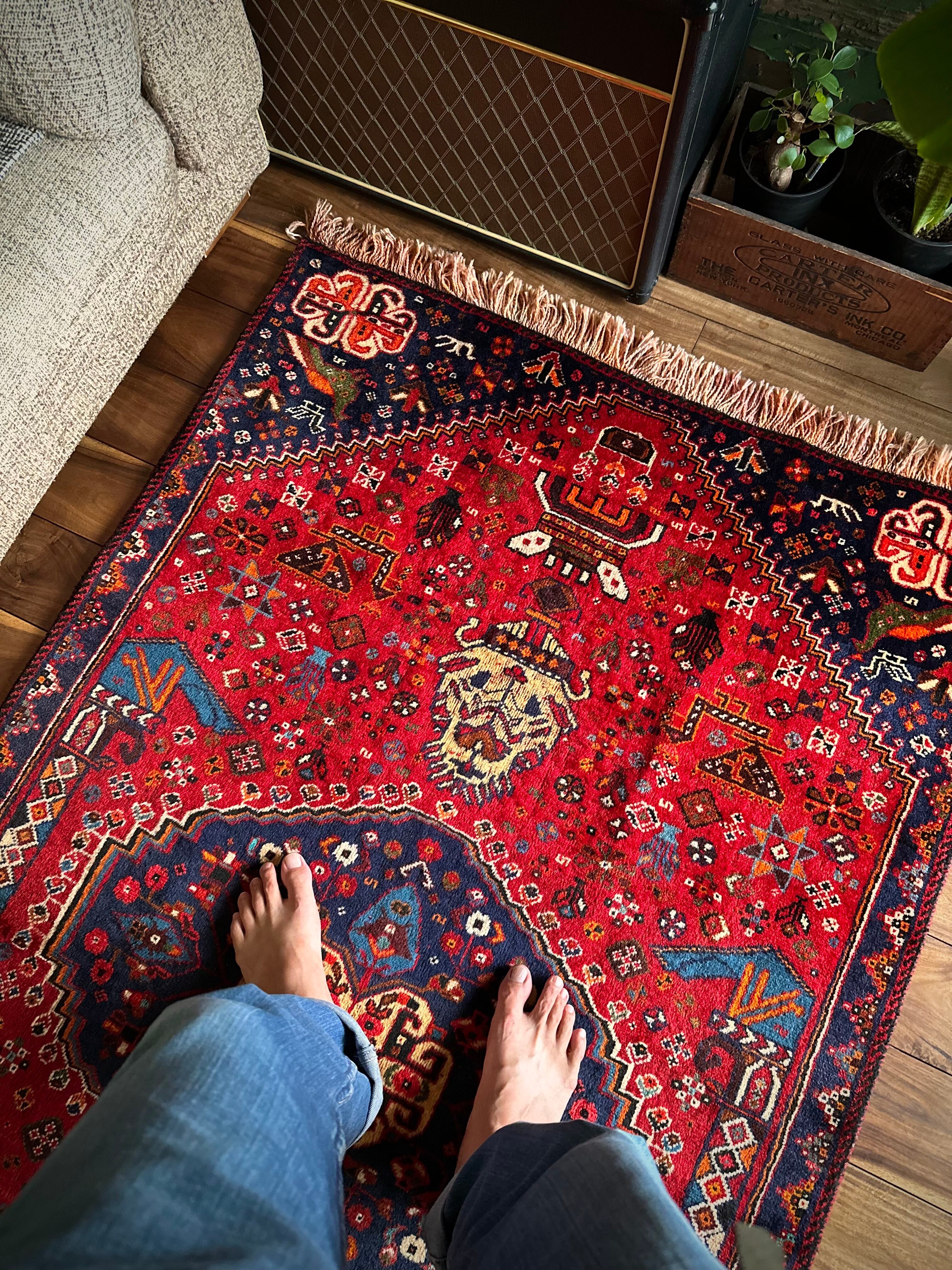 パッと見た目にお花畑〜な印象が持たれるシラーズはカシュガイ族のトライバルラグで、真っ赤なフィールドを際立たせる艶やかなネイビーの縁取りが良いですねーと、全体的に散りばめられた花や鳥が賑やかな1枚になります。