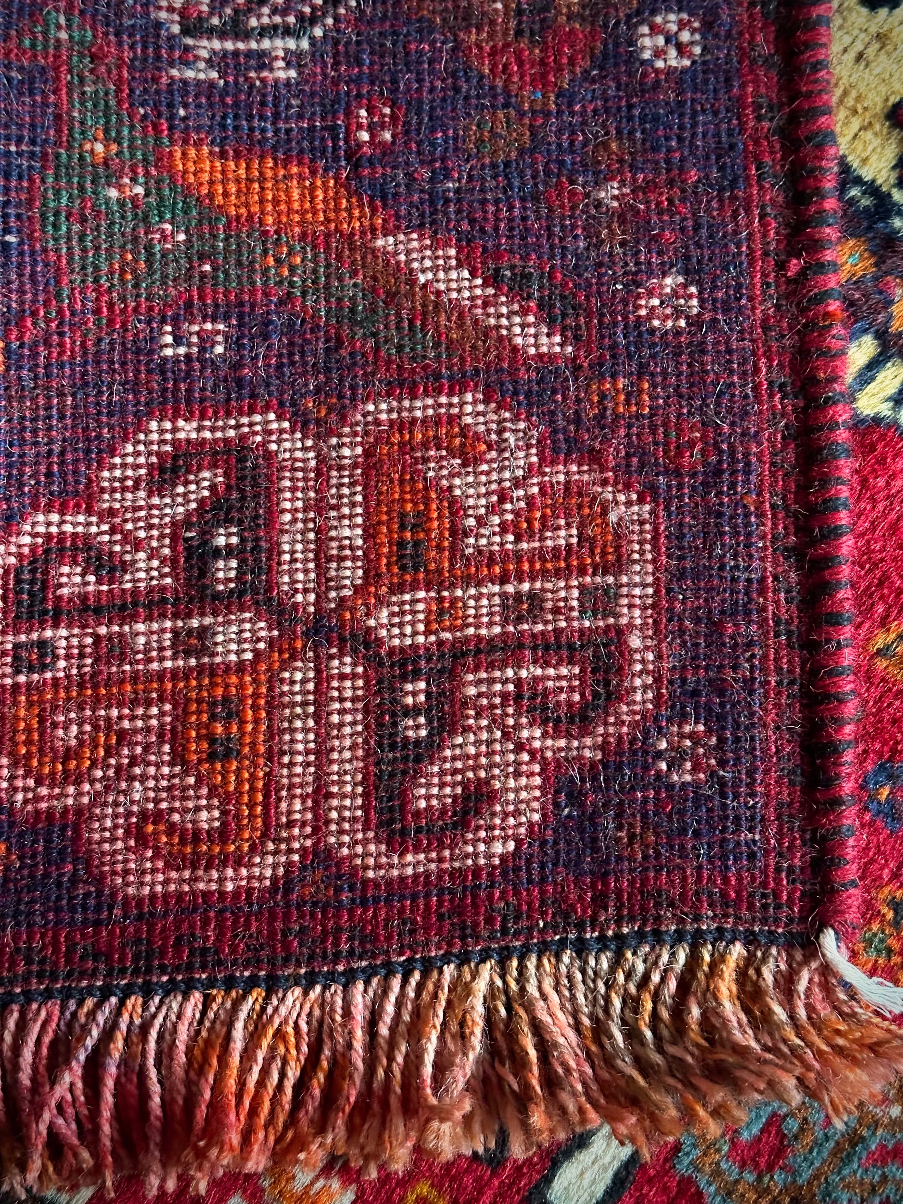中央の風変わりなメダリオンに、上下にあしらわれたガイコツのような模様が面白く、四隅の孔雀がカシュガイらしいでしょうか。経糸にウールが使用され厚みも申し分ありません。