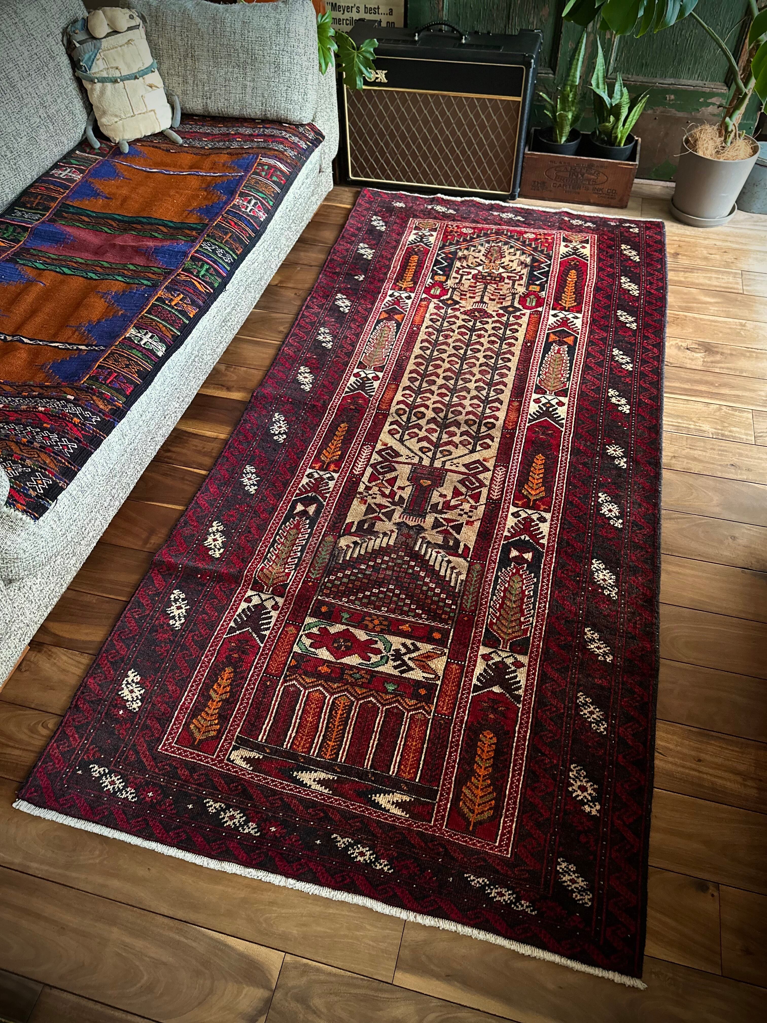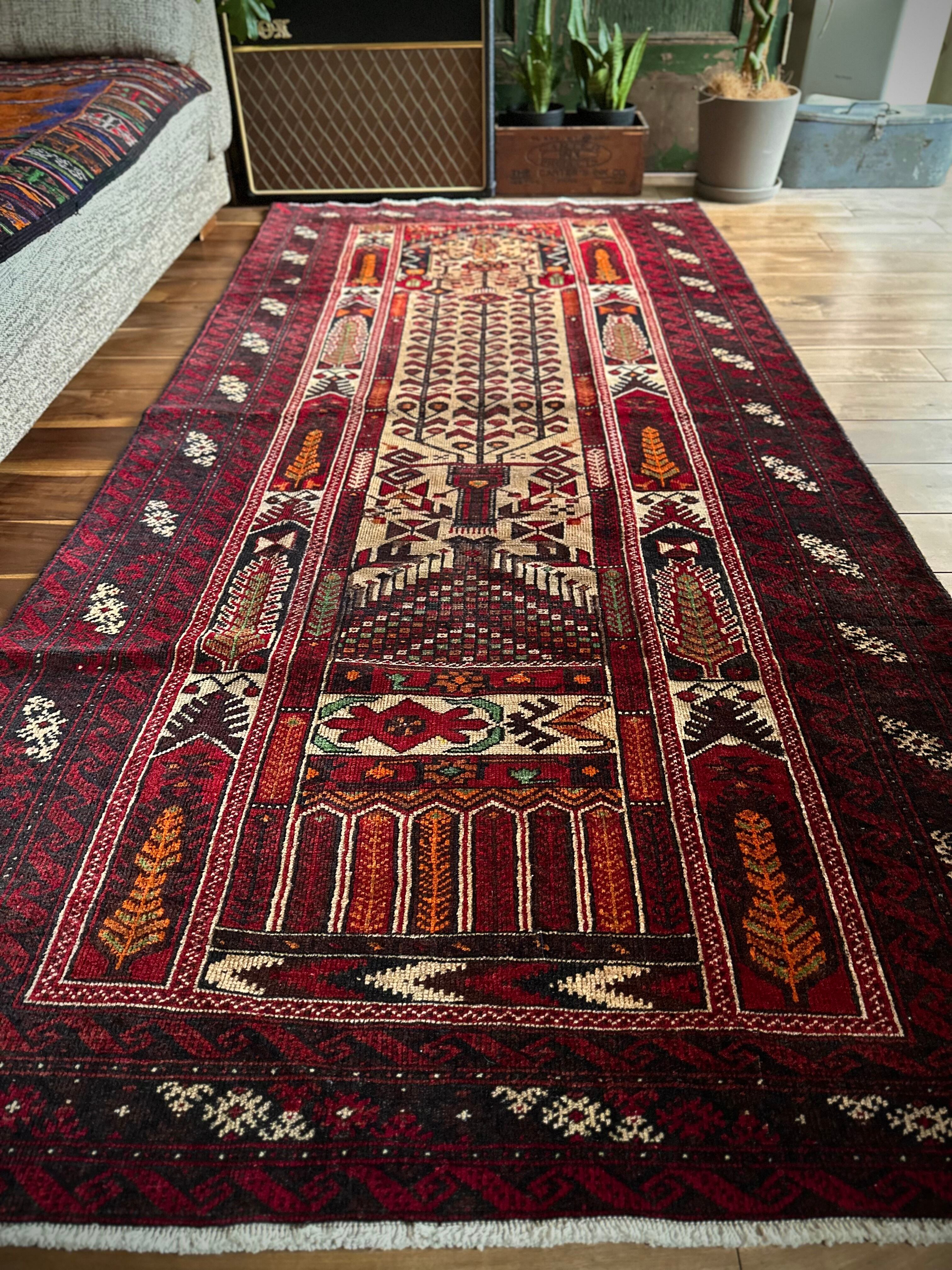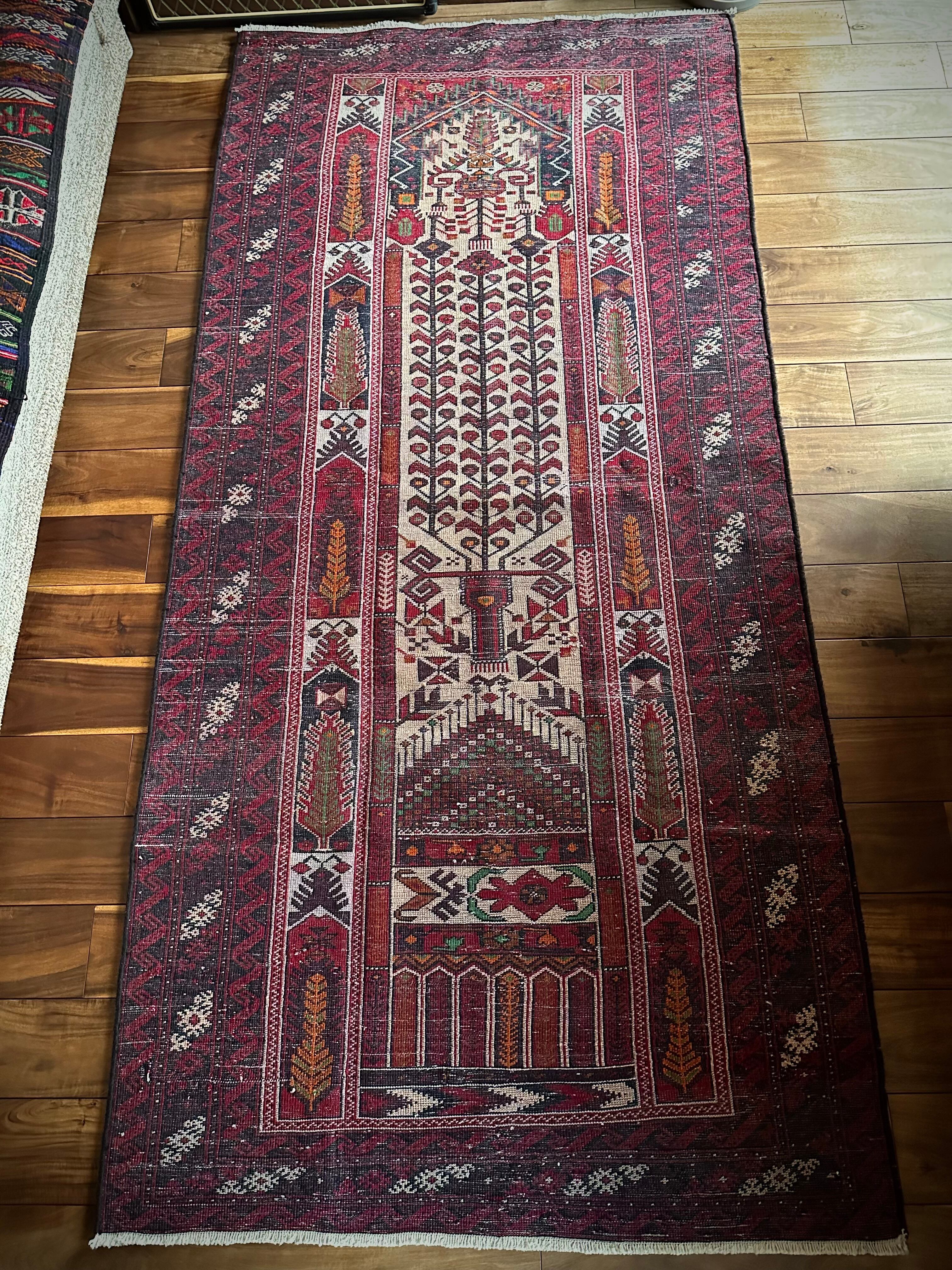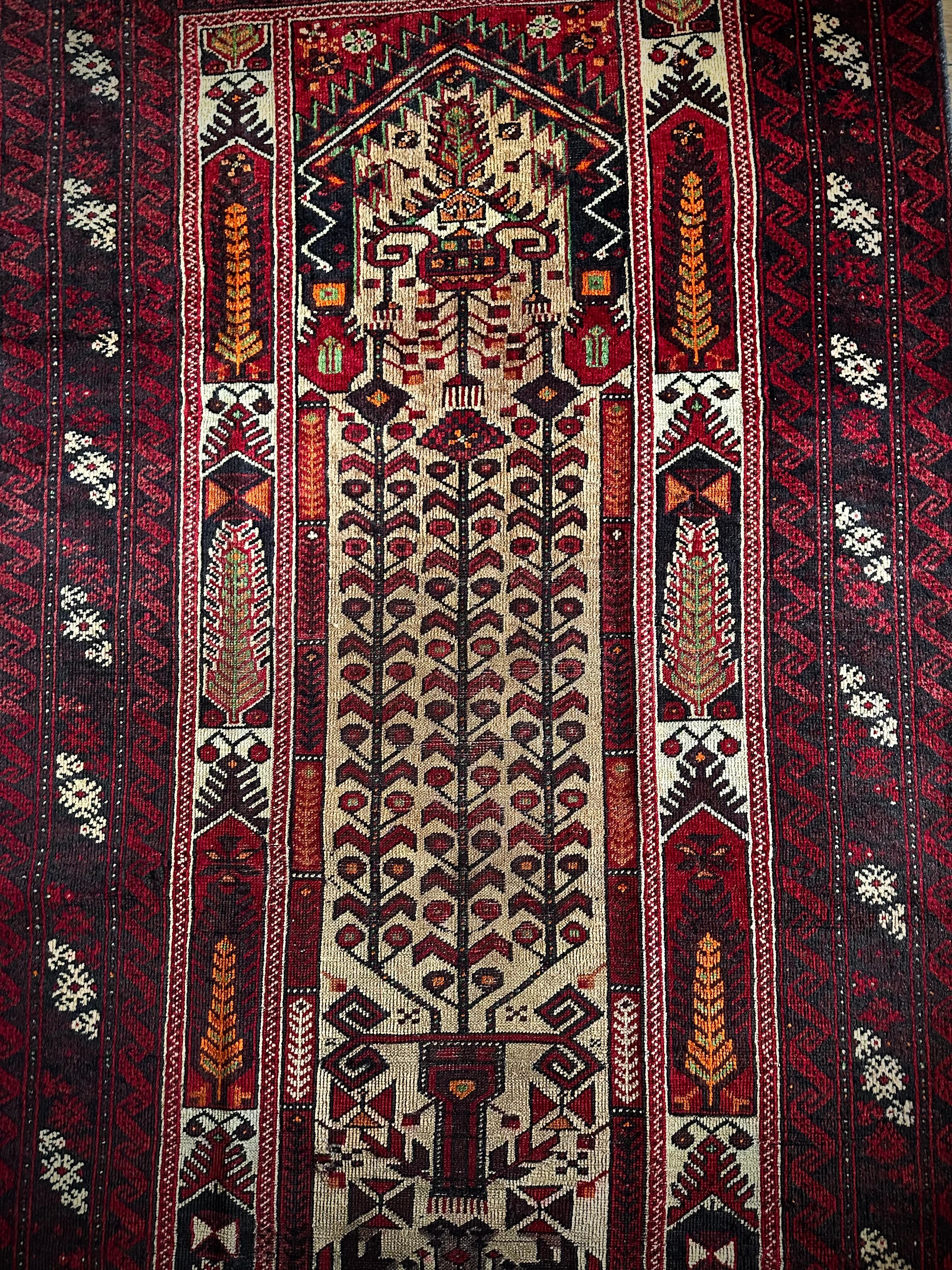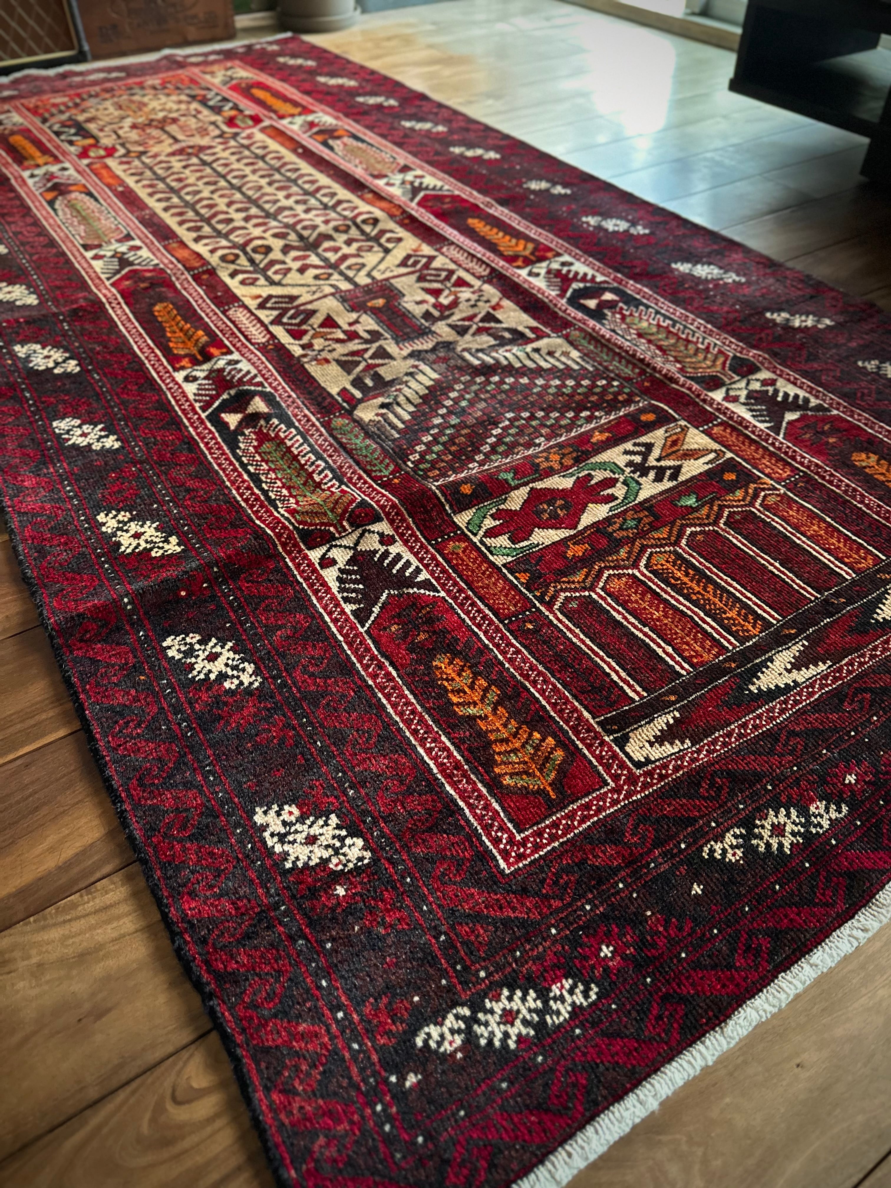 色彩豊かなモスクのような絵柄に生命の樹がデザインされた、イランとアフガニスタンの国境付近に居住するバルーチ族のトライバルラグになります。