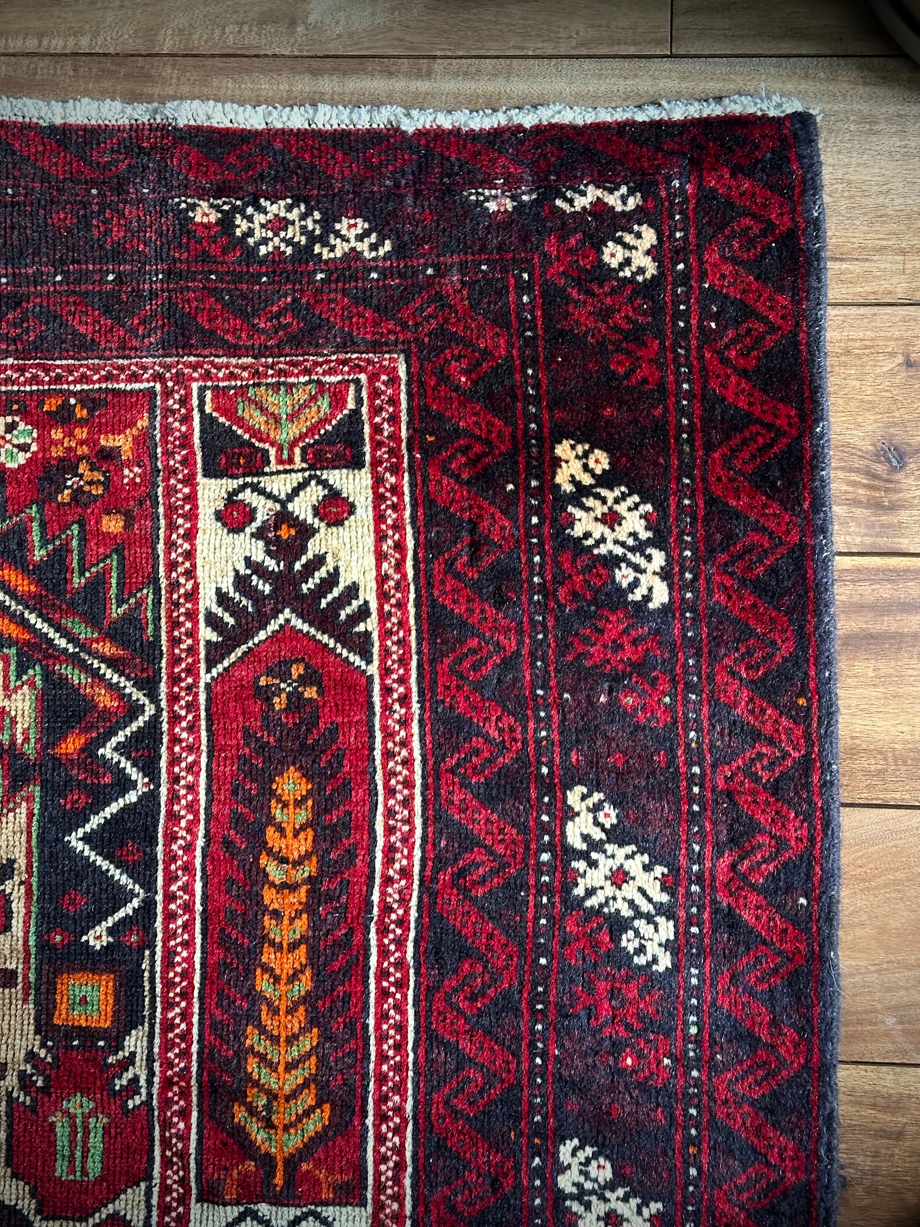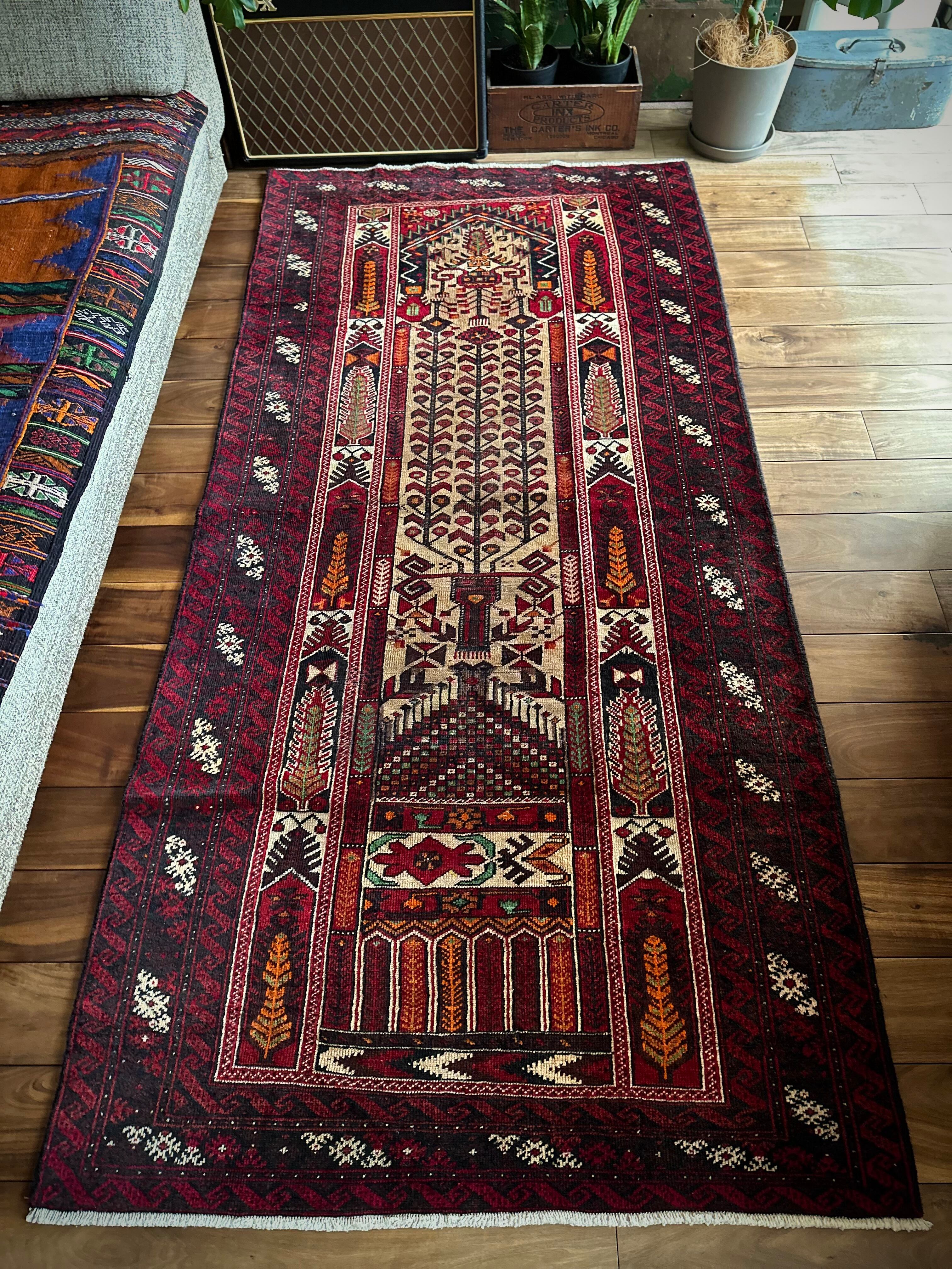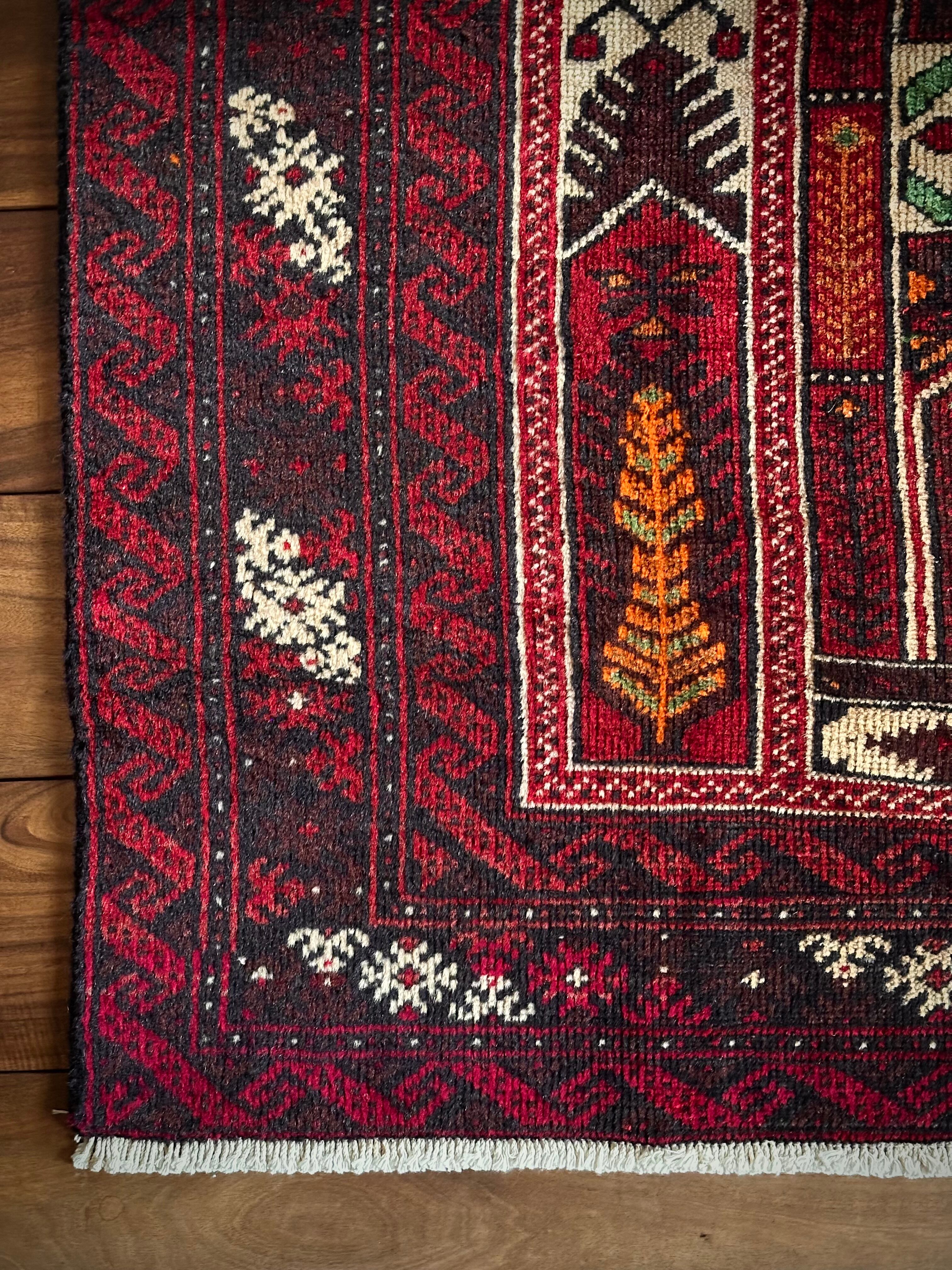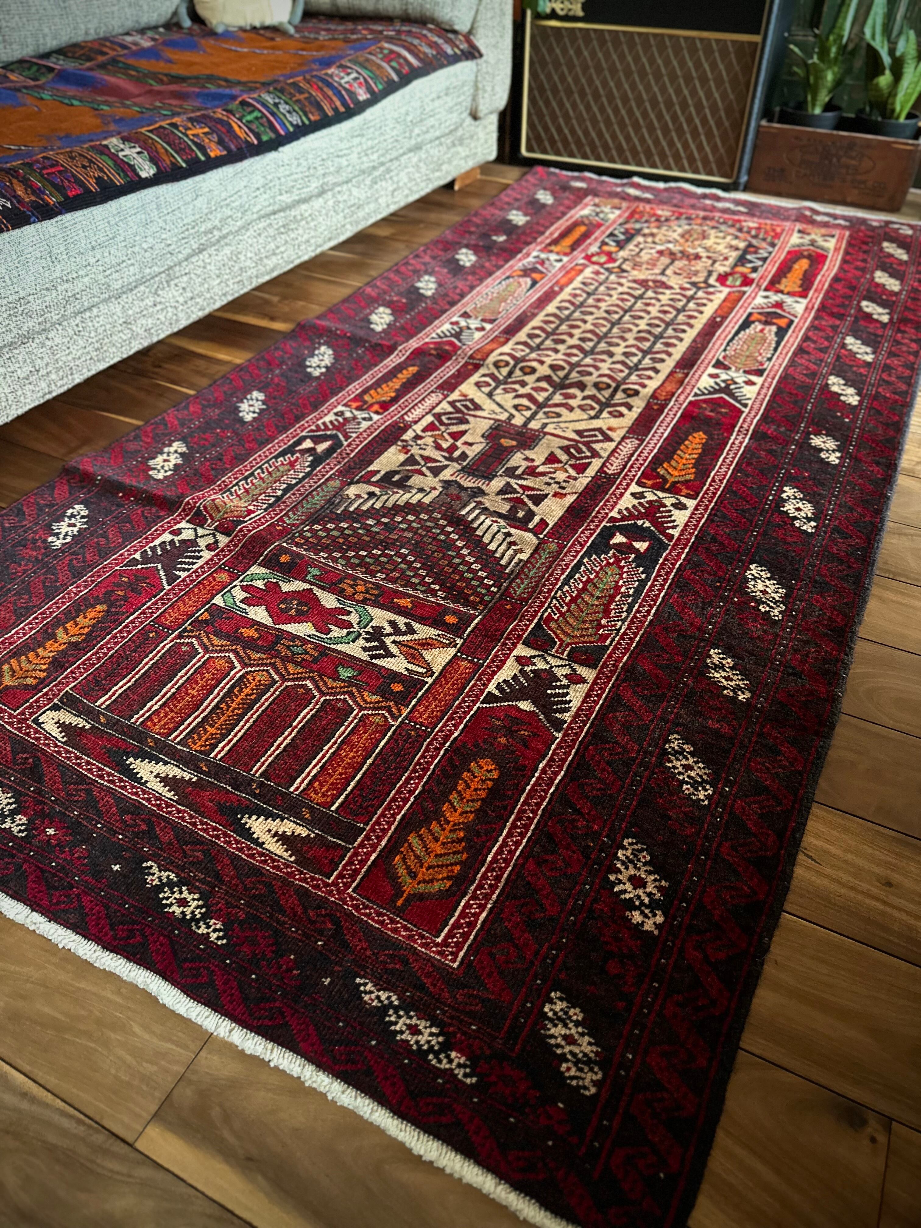 色彩豊かなモスクのような絵柄に生命の樹がデザインされた、イランとアフガニスタンの国境付近に居住するバルーチ族のトライバルラグになります。