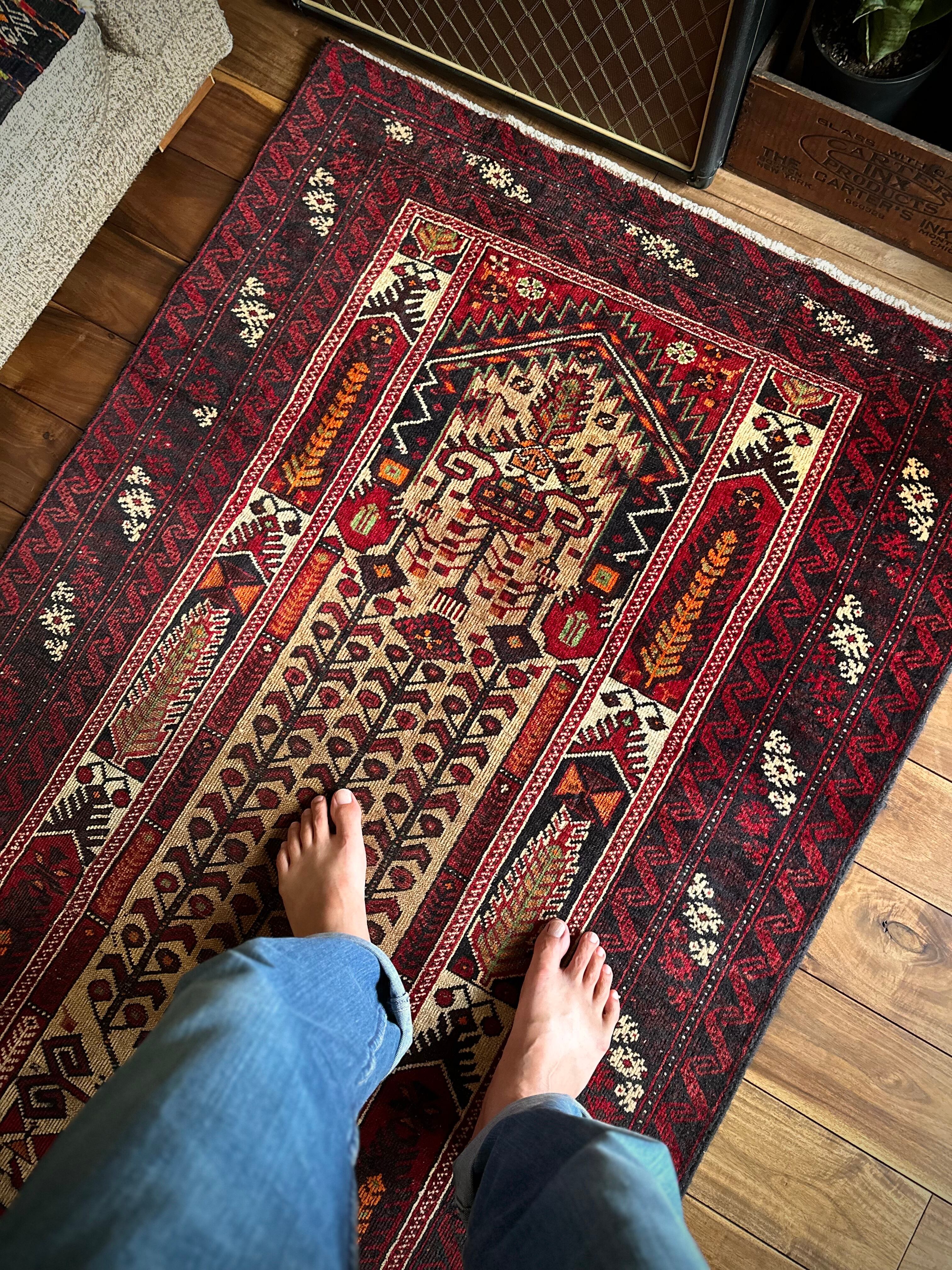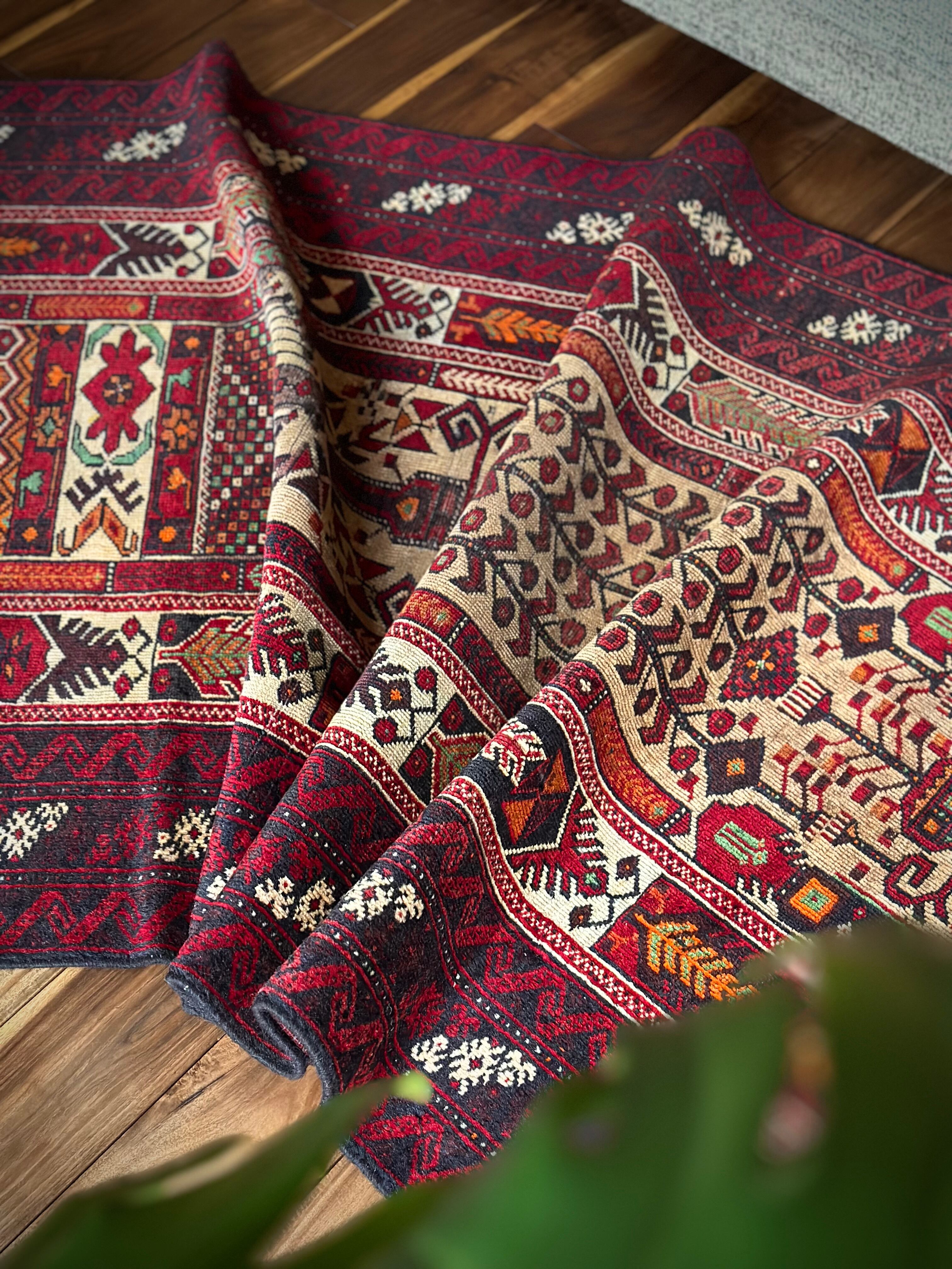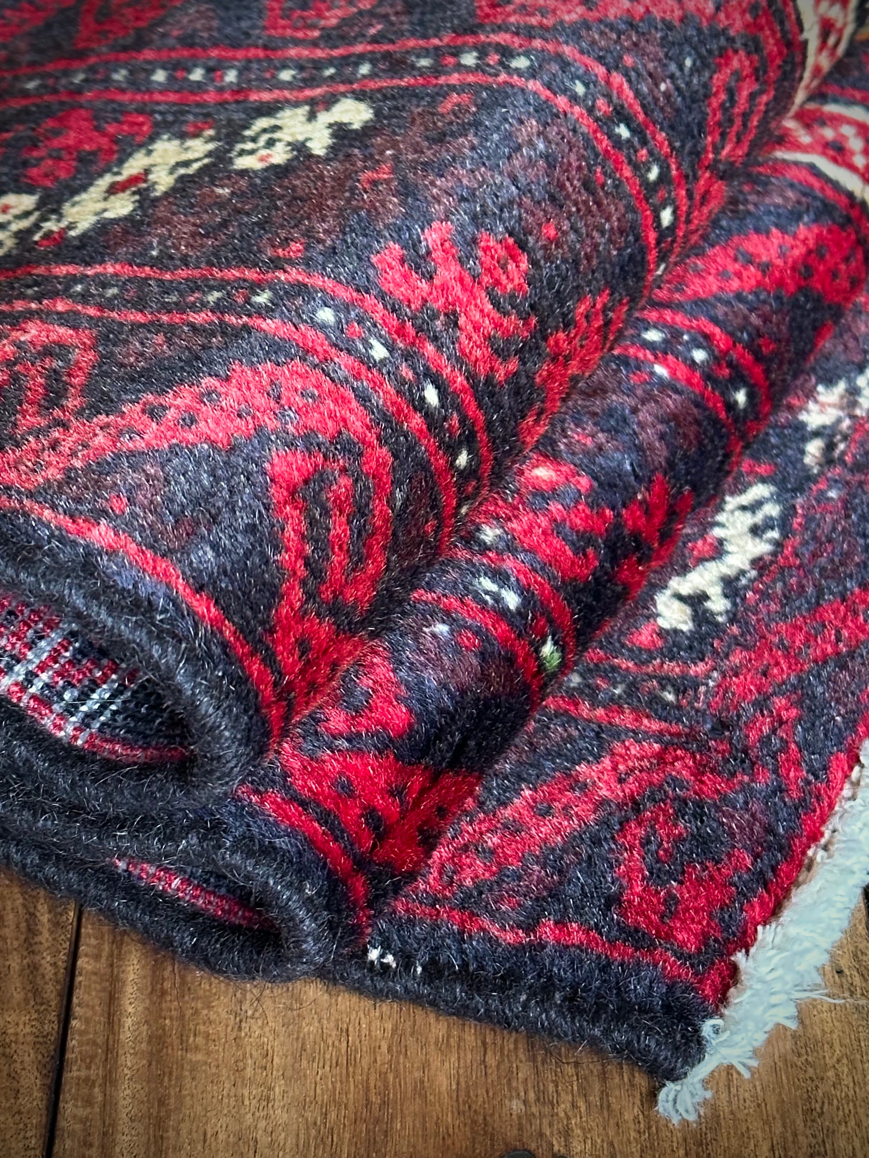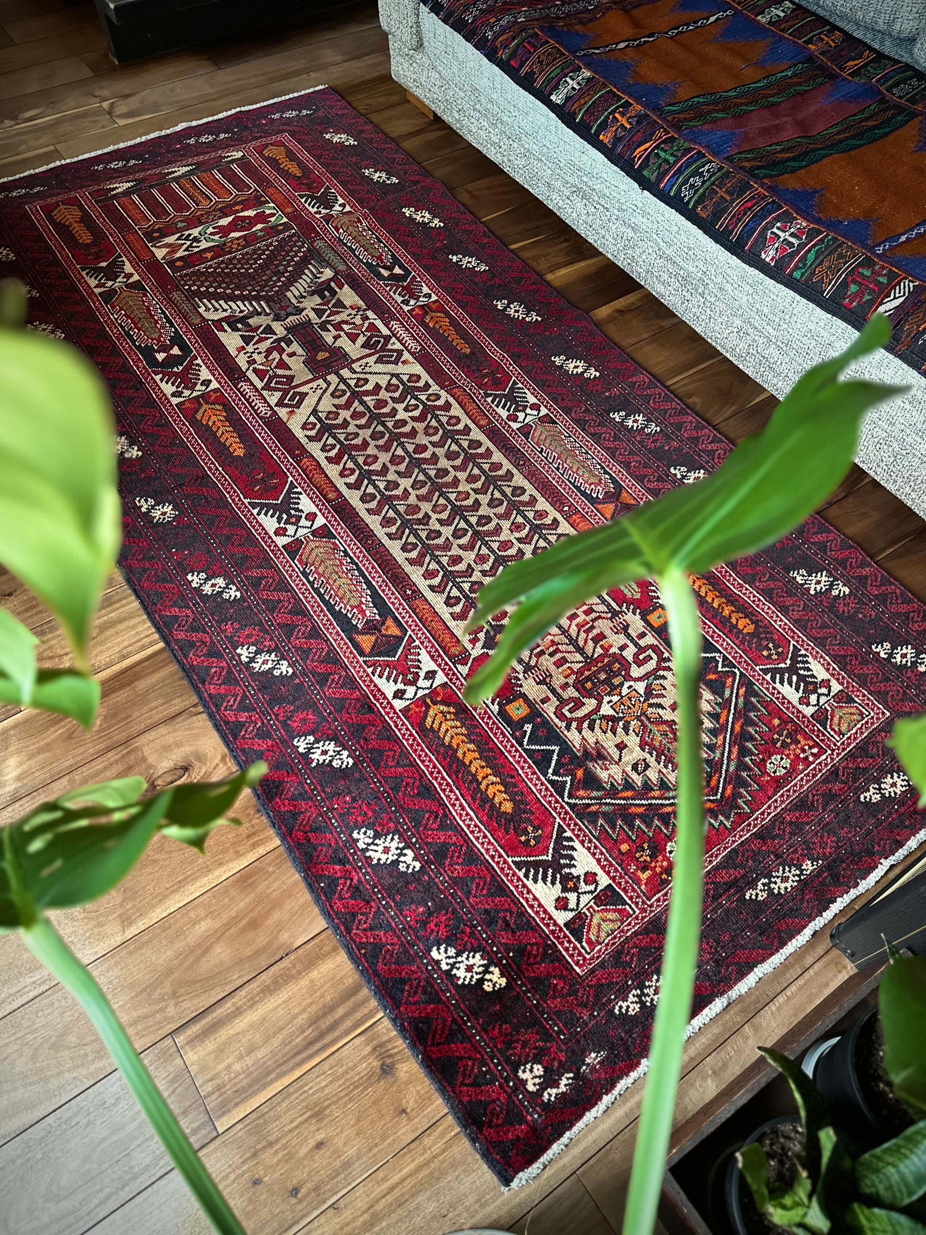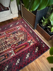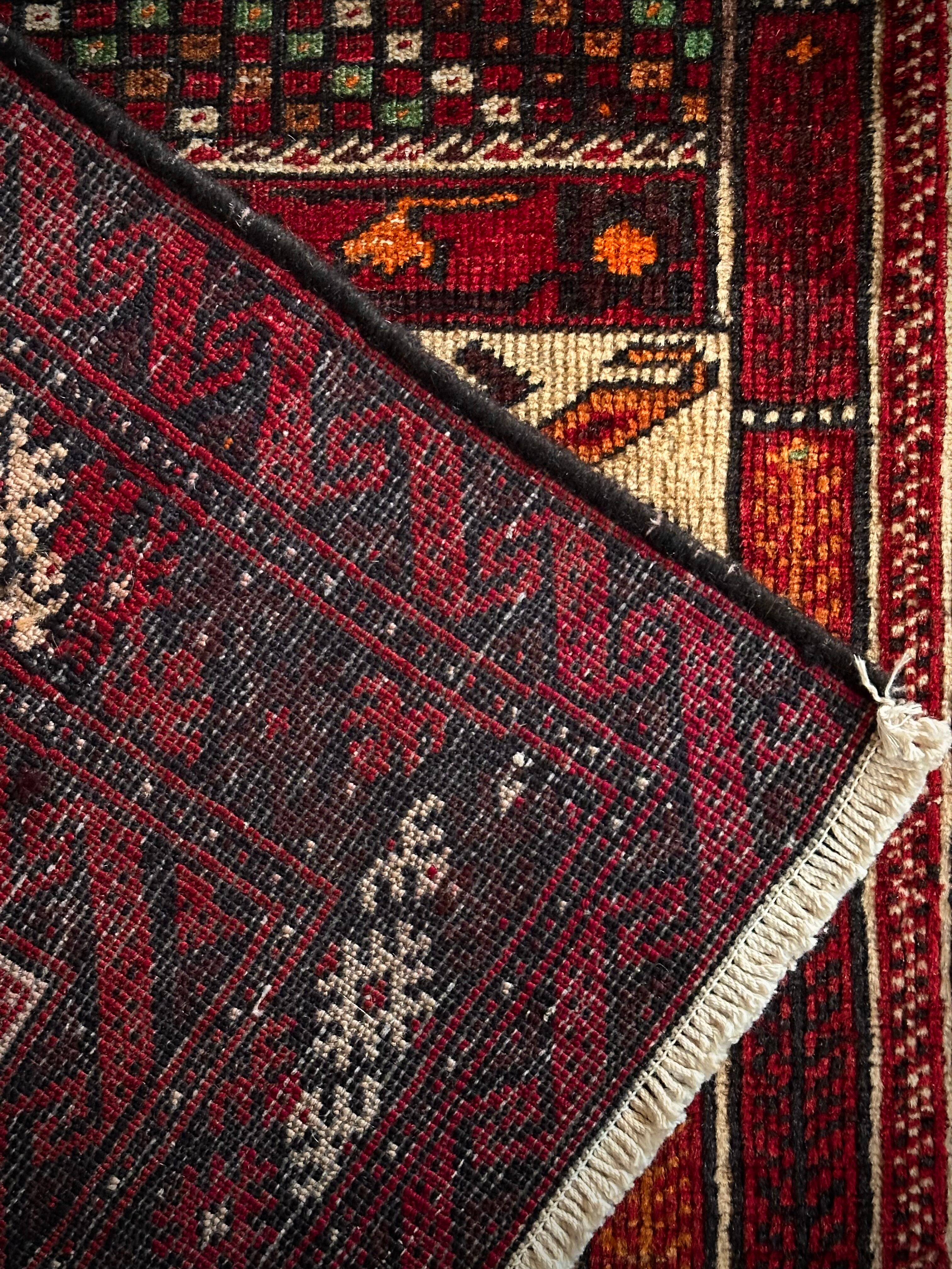色彩豊かなモスクのような絵柄に生命の樹がデザインされた、イランとアフガニスタンの国境付近に居住するバルーチ族のトライバルラグになります。