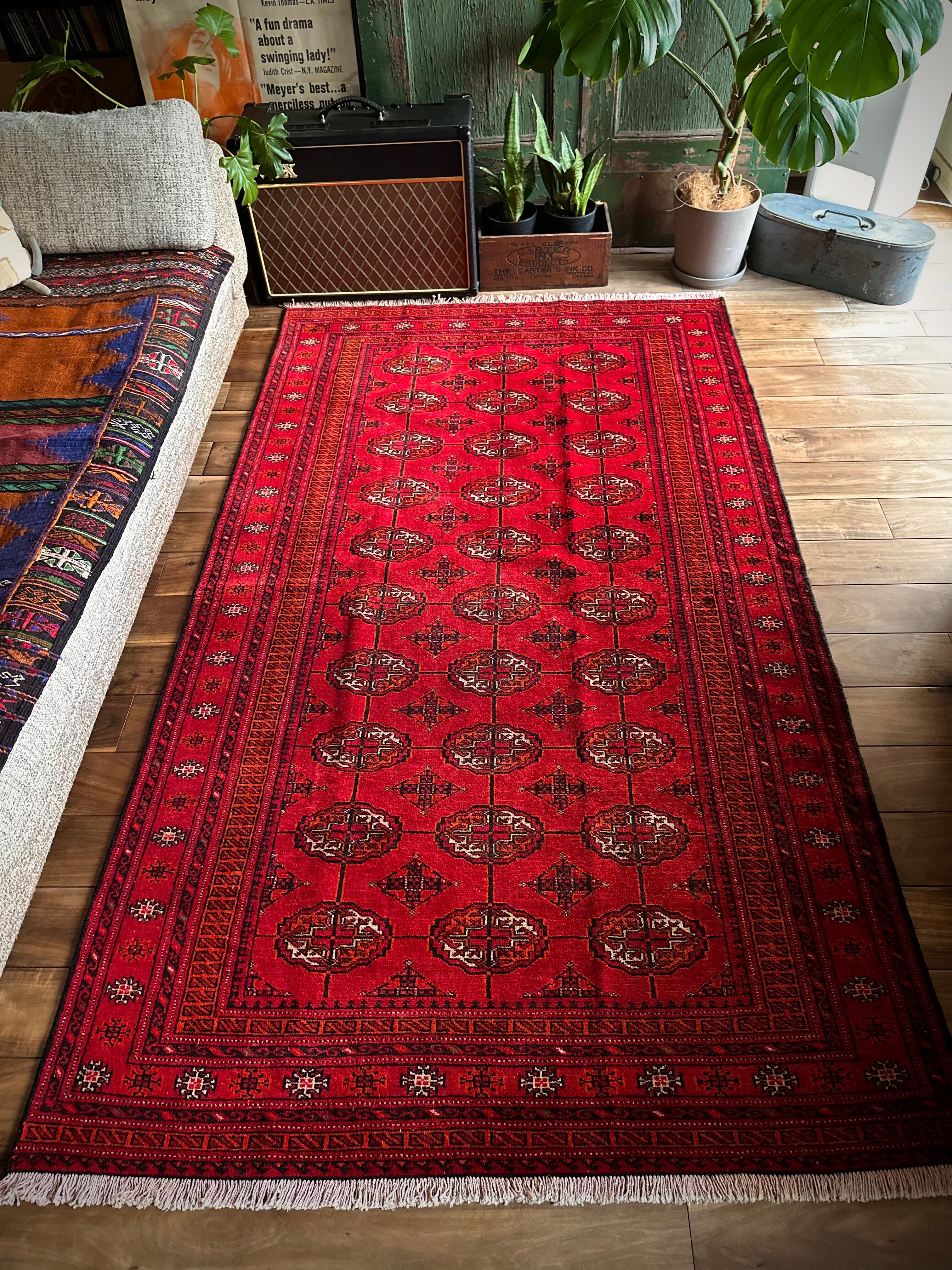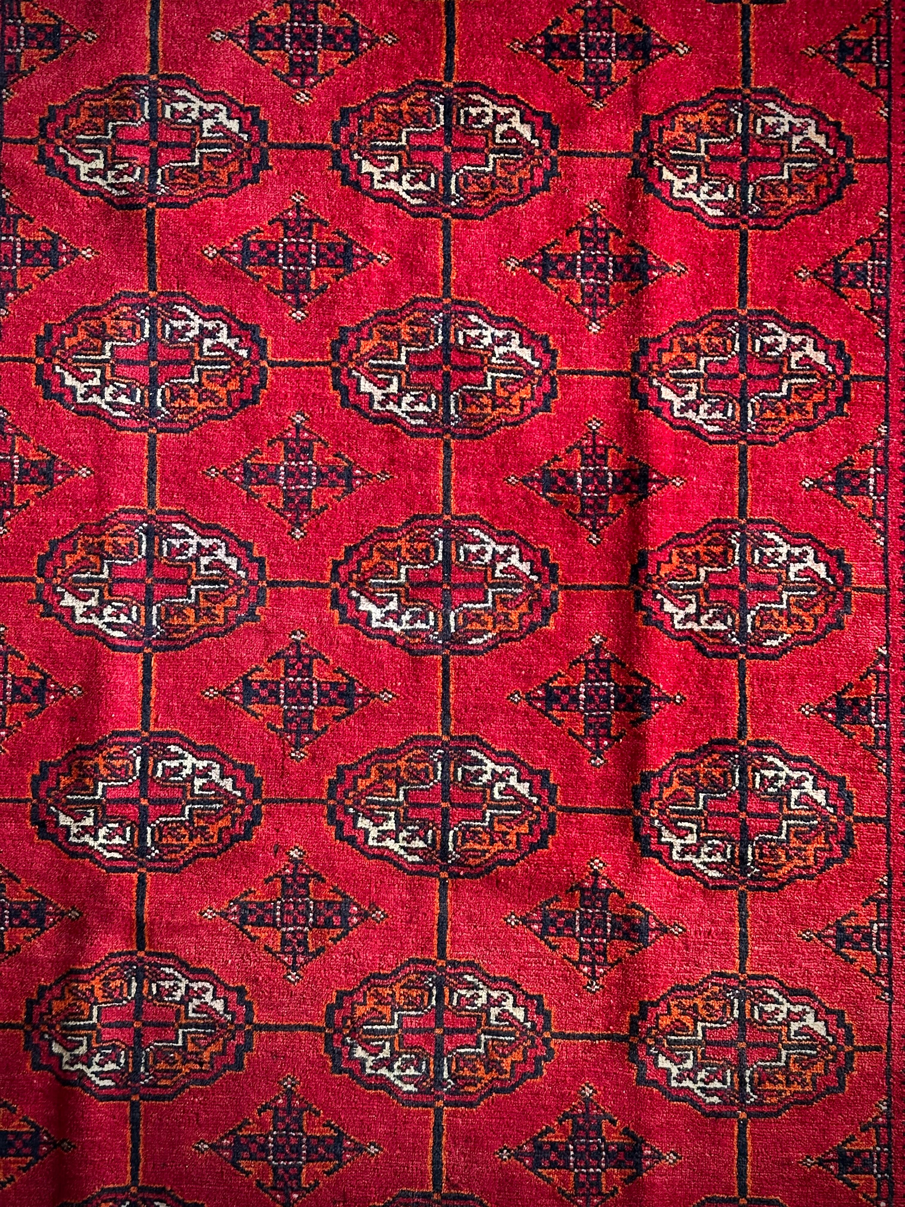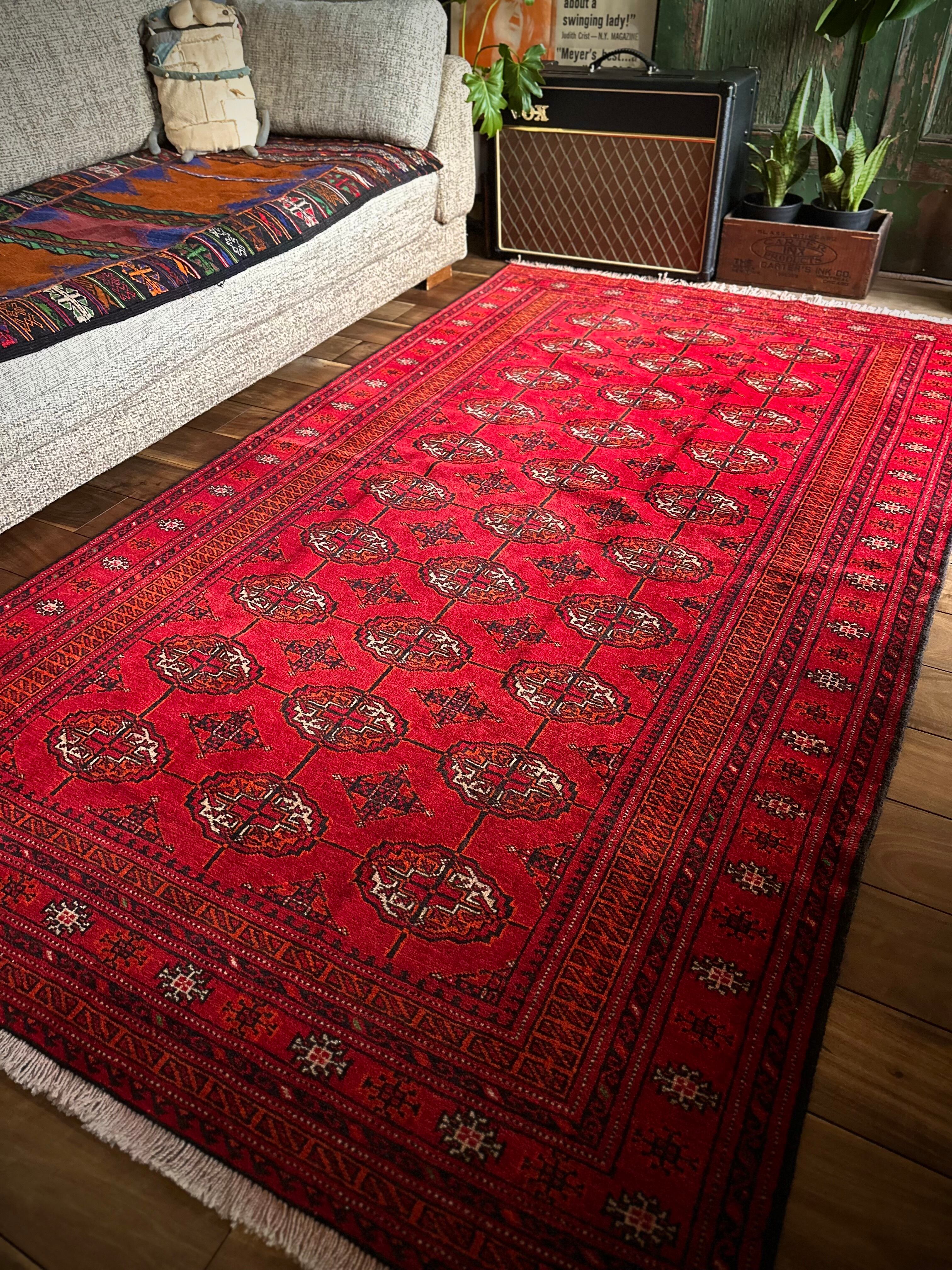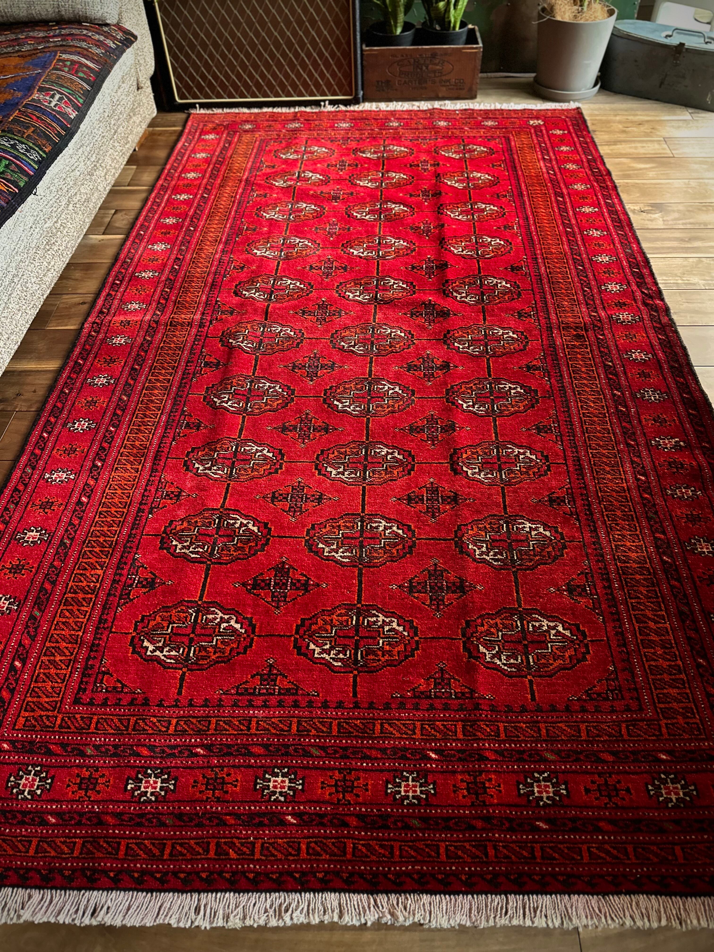 トルクメンのなかでも最大部族と言われるテッケ支族の紋章があしらわれたこちら、パキスタンではブハラ柄と呼ばれる紋様ですが、大判サイズで探すとなかなか手が出せないプライスで、絨毯の代名詞とも言える伝統的なデザインになります。