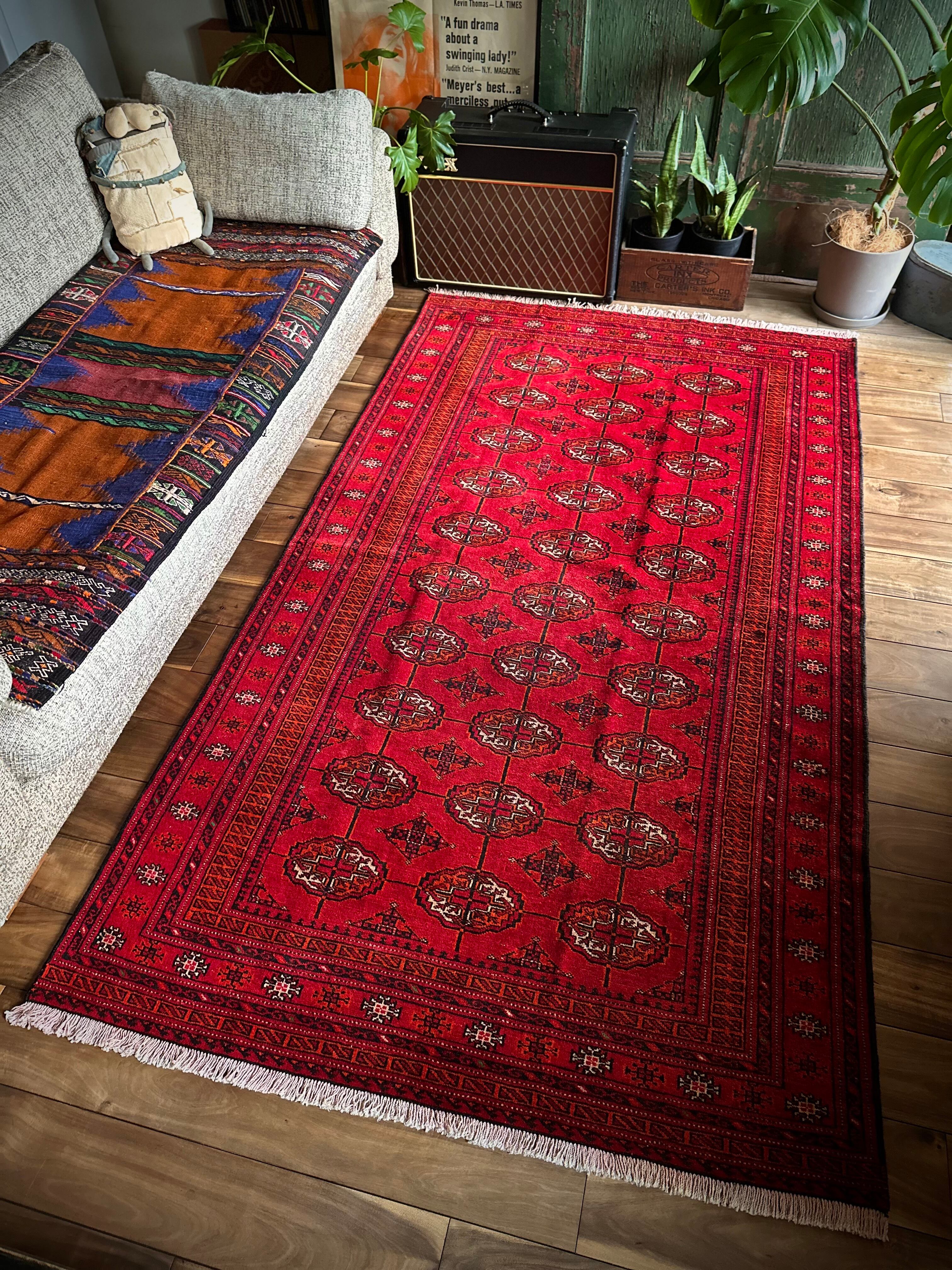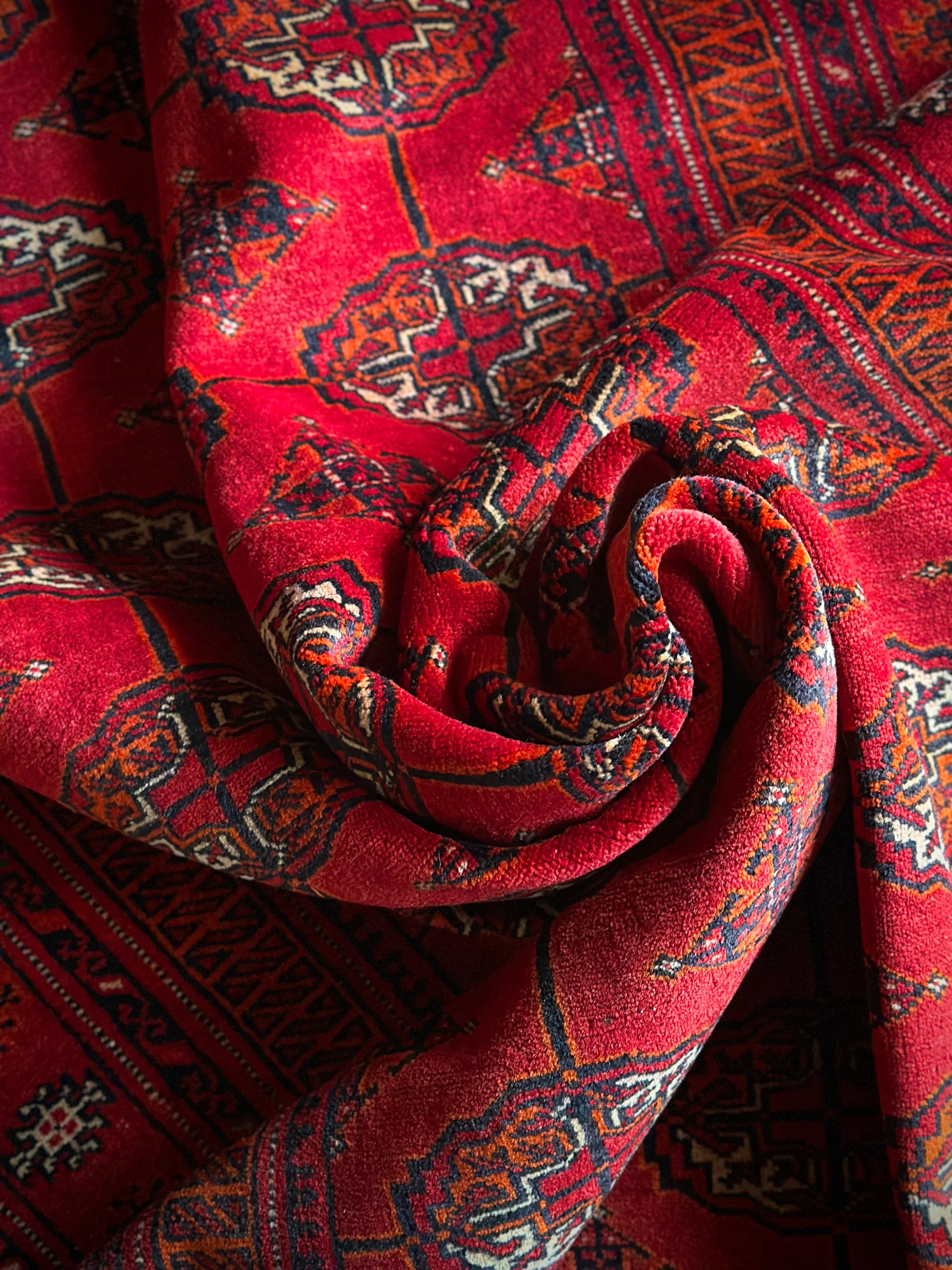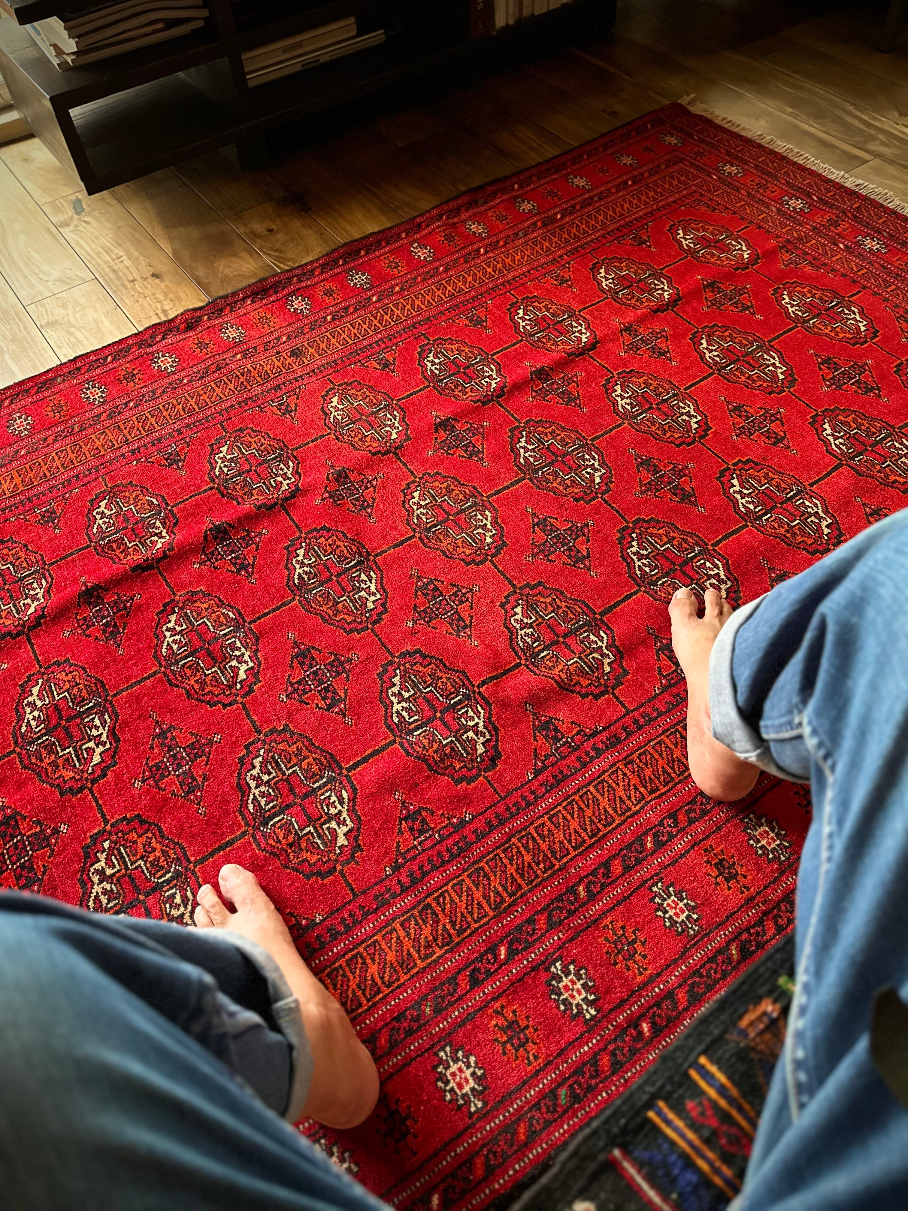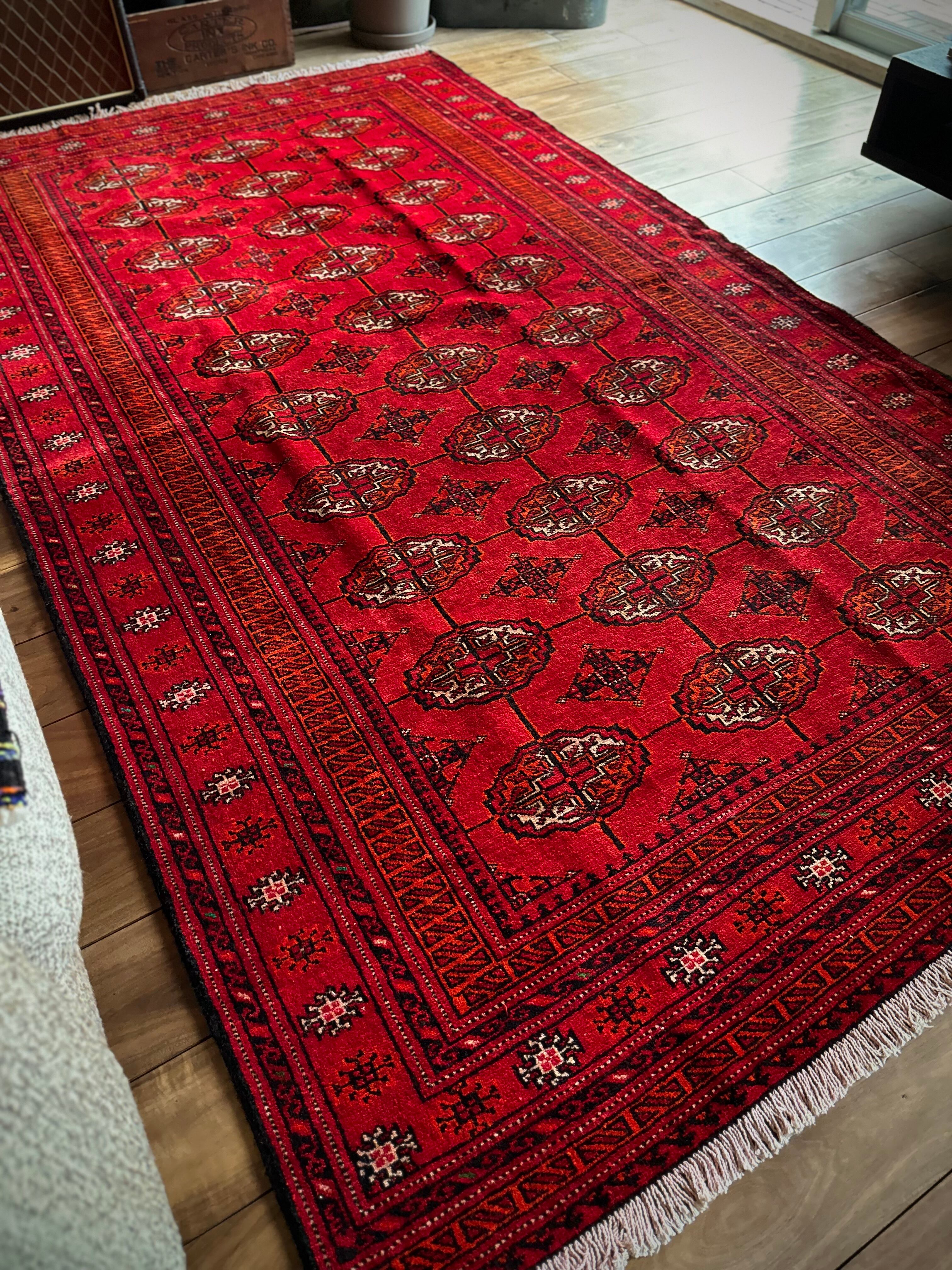 トルクメンのなかでも最大部族と言われるテッケ支族の紋章があしらわれたこちら、パキスタンではブハラ柄と呼ばれる紋様ですが、大判サイズで探すとなかなか手が出せないプライスで、絨毯の代名詞とも言える伝統的なデザインになります。