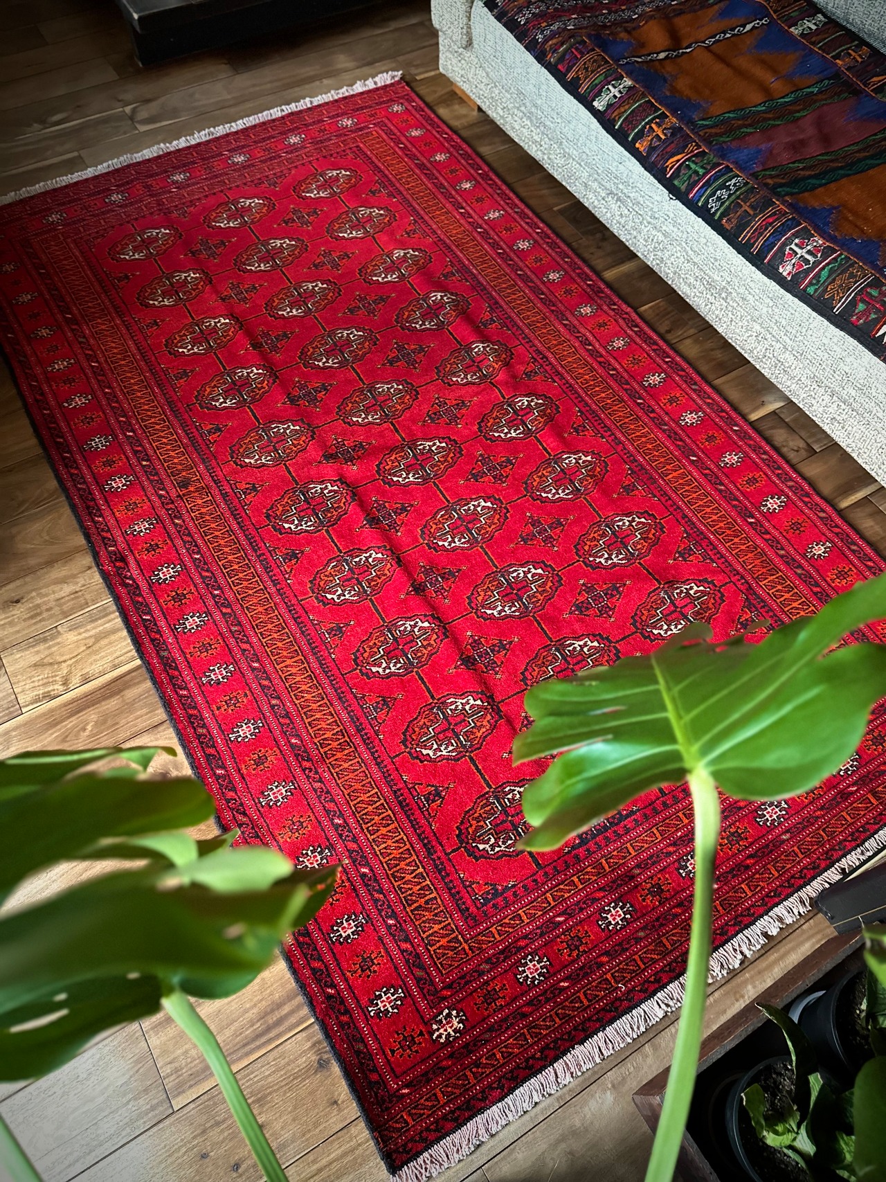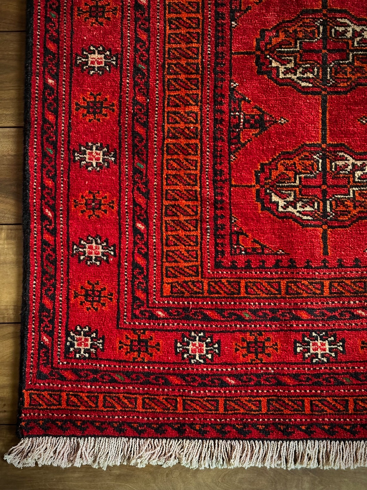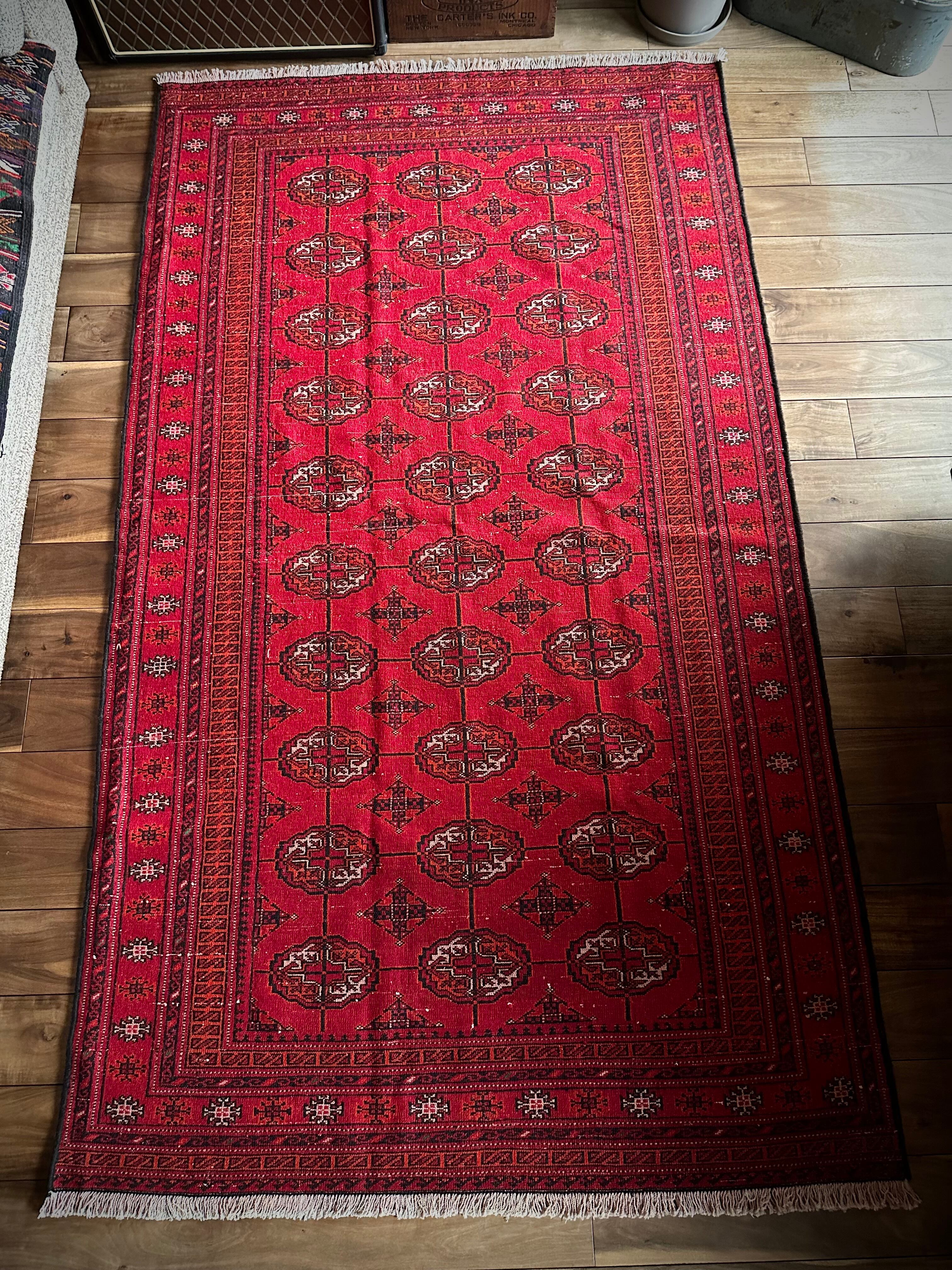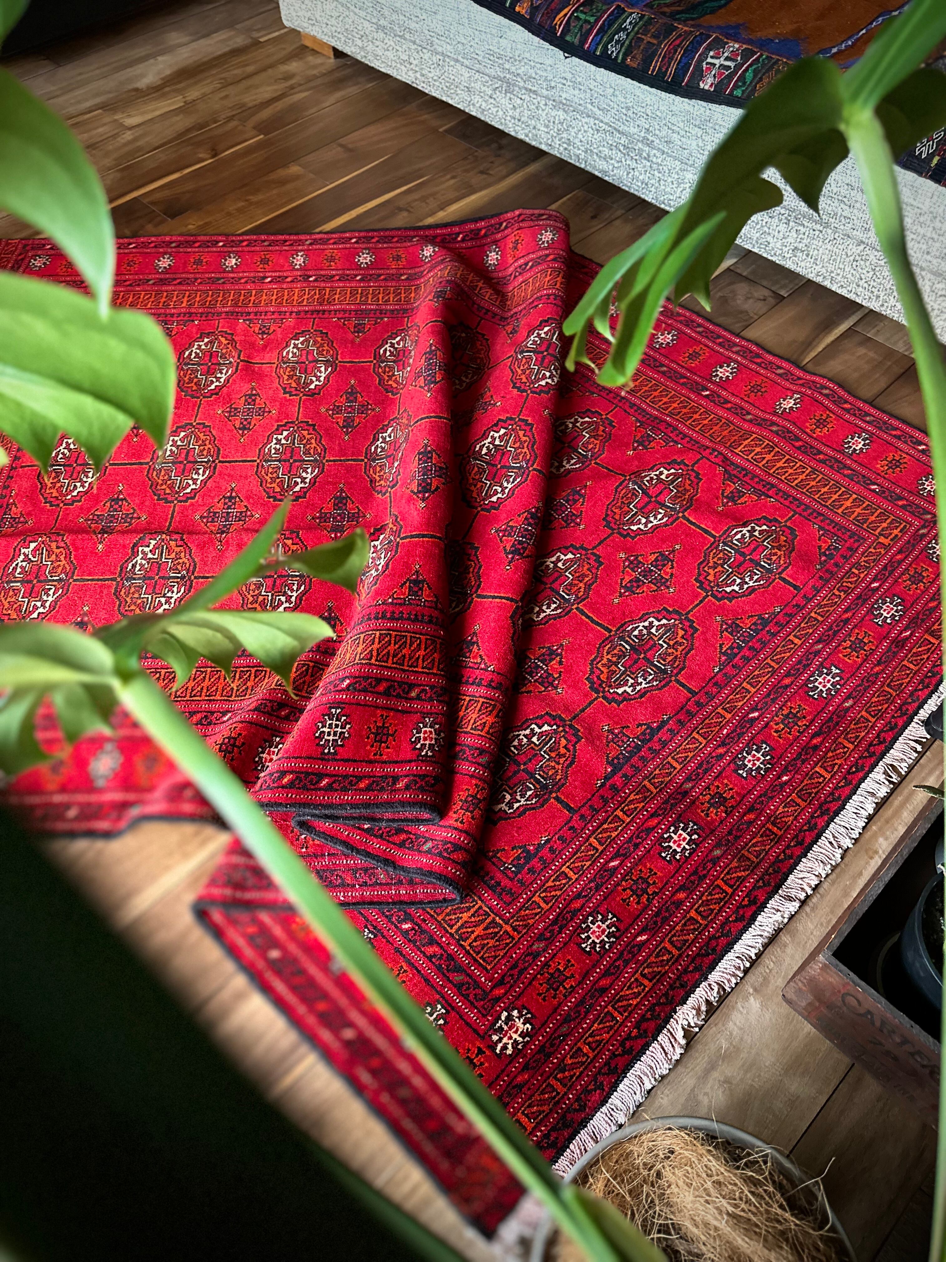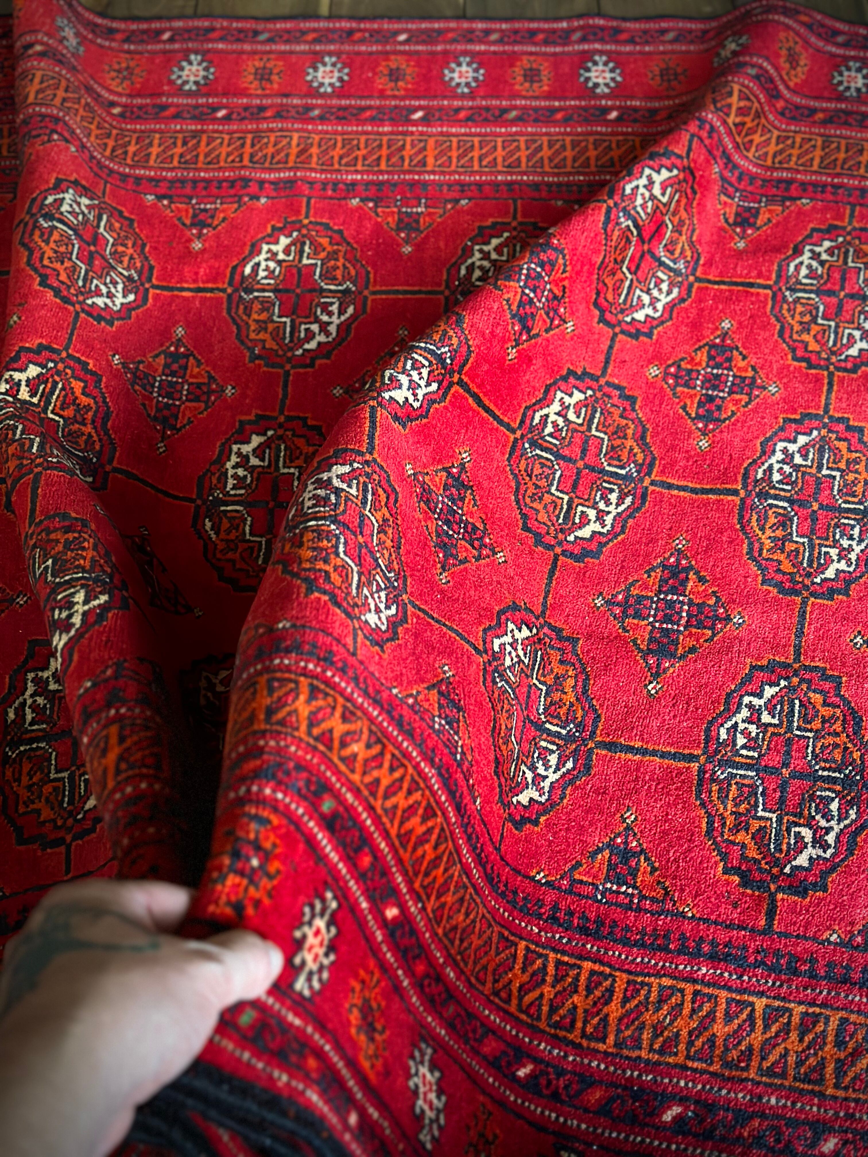 トルクメンのなかでも最大部族と言われるテッケ支族の紋章があしらわれたこちら、パキスタンではブハラ柄と呼ばれる紋様ですが、大判サイズで探すとなかなか手が出せないプライスで、絨毯の代名詞とも言える伝統的なデザインになります。