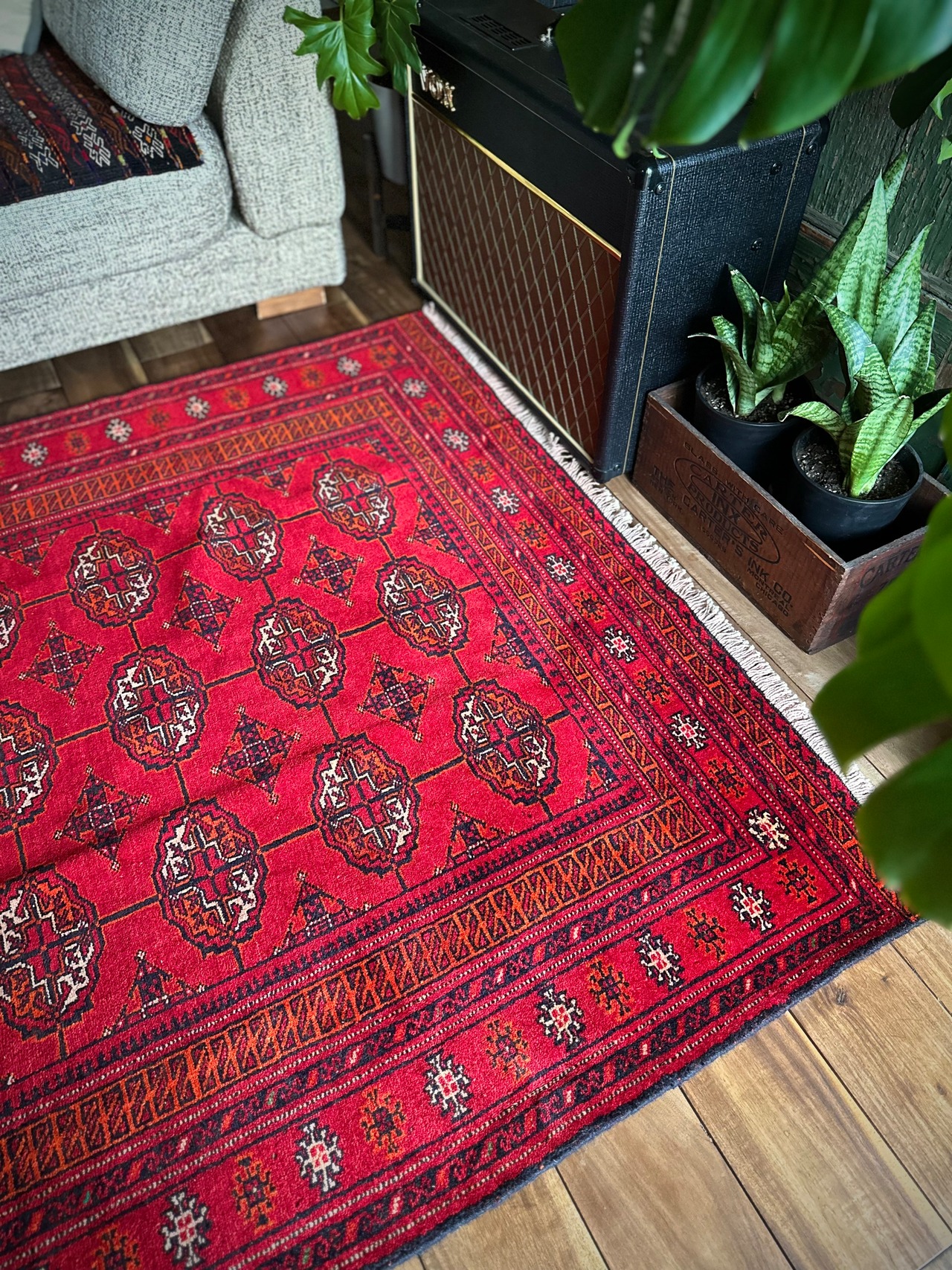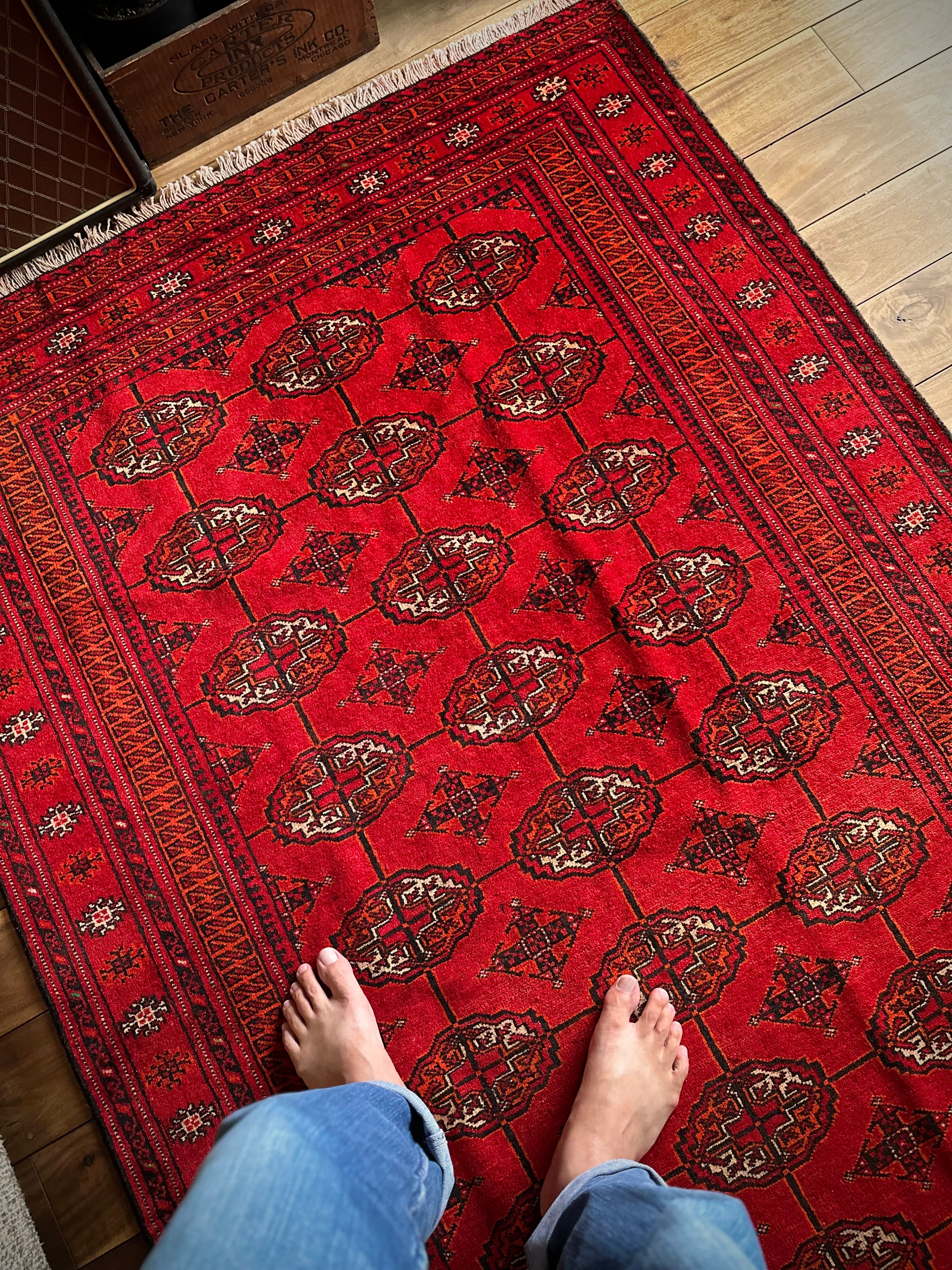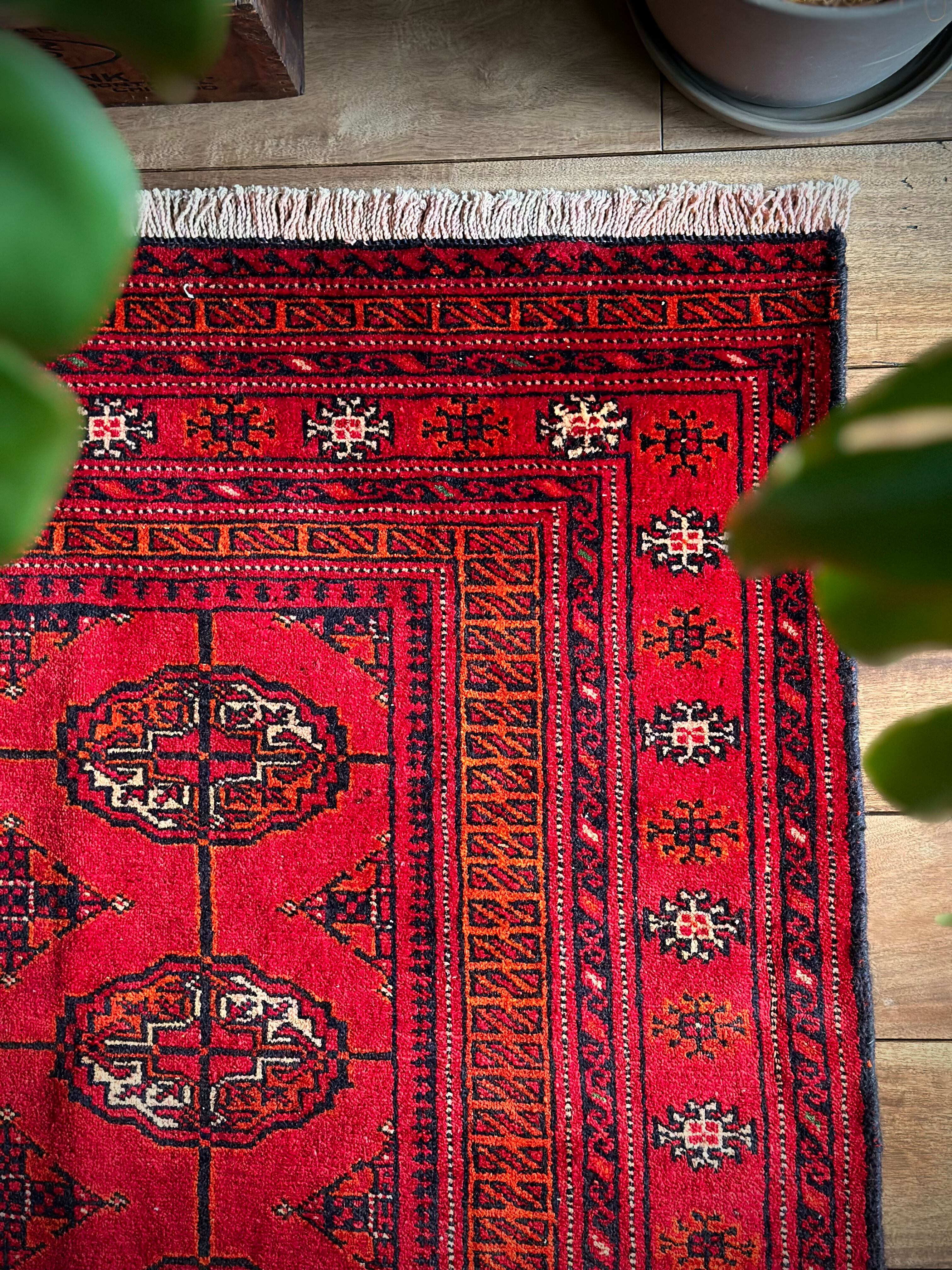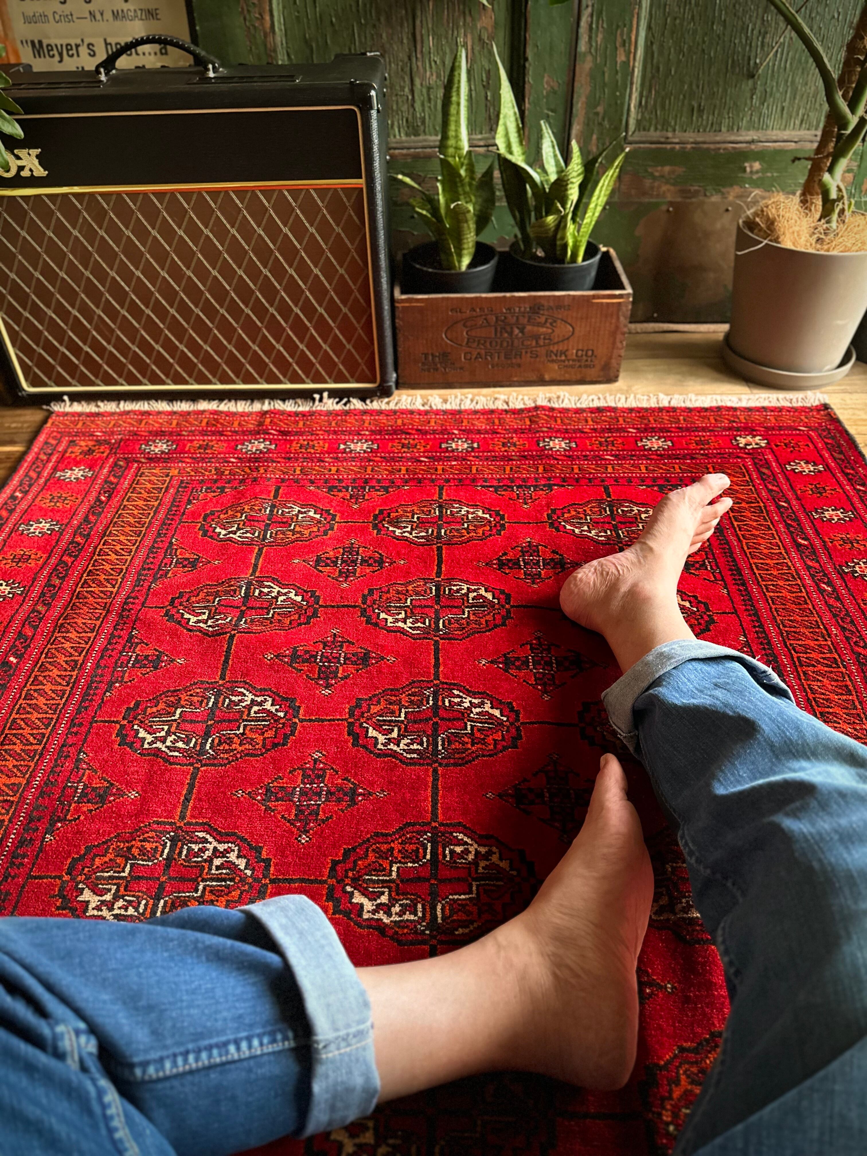 トルクメンのなかでも最大部族と言われるテッケ支族の紋章があしらわれたこちら、パキスタンではブハラ柄と呼ばれる紋様ですが、大判サイズで探すとなかなか手が出せないプライスで、絨毯の代名詞とも言える伝統的なデザインになります。