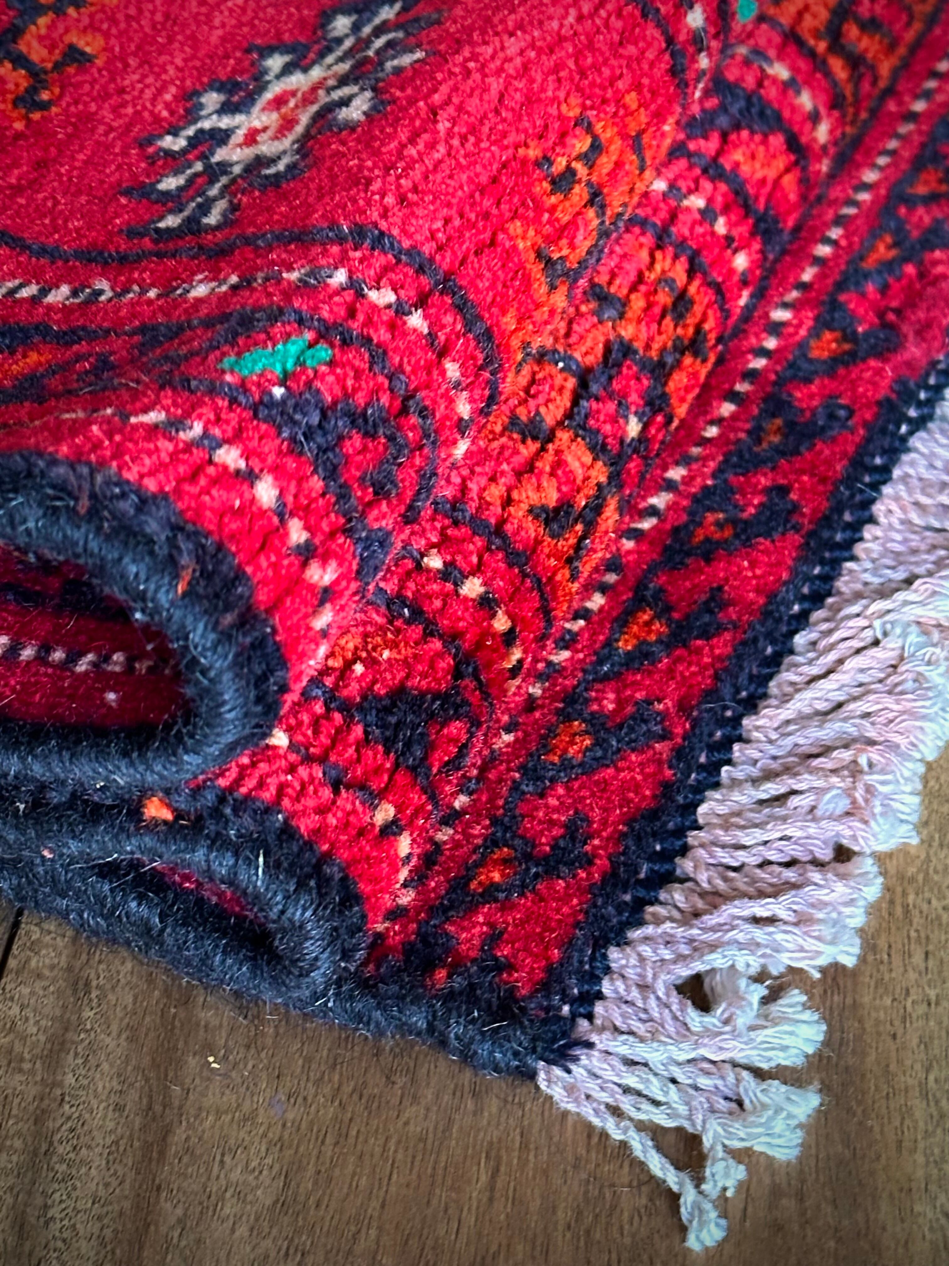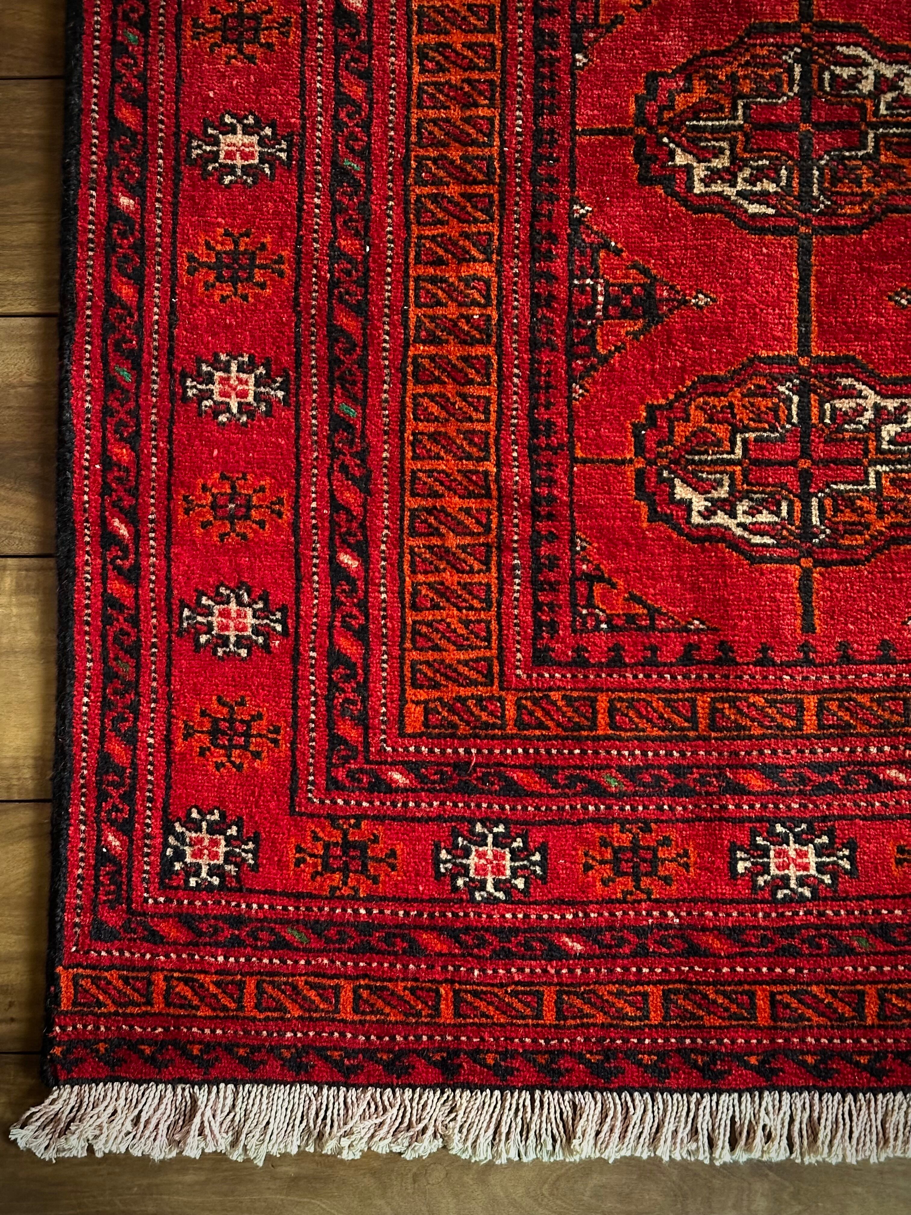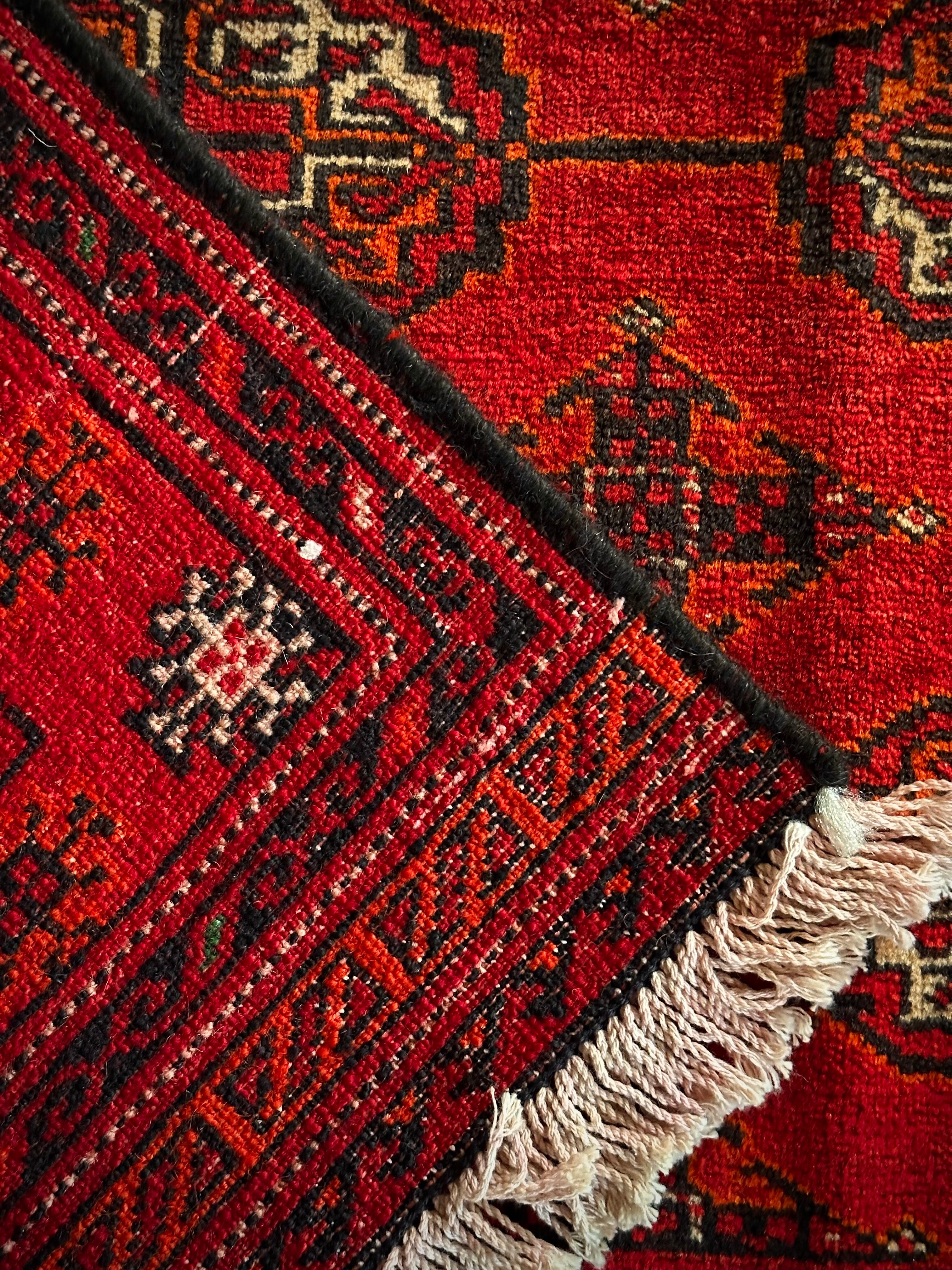 なんとも威厳のある真っ赤な色彩に誇らし気なテッケギュルの連続紋様がかっこいい、イラン北東部に居住するトルクメン族の大判サイズなトライバルラグになります。