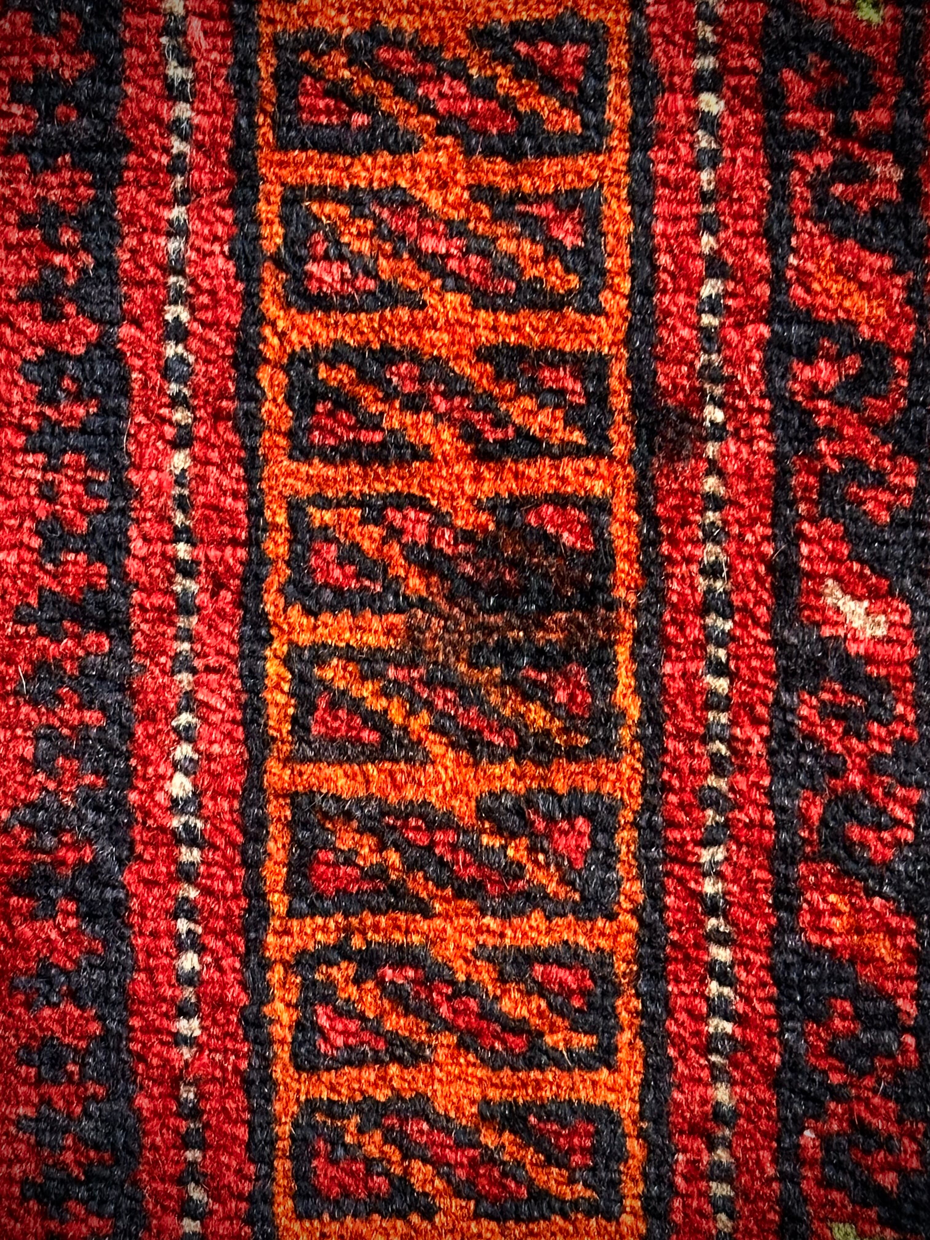 経年としては30年とヴィンテージに差し掛かった頃合いで、艶やかなパイルの手触りも心地よく、それほどの使用感に特に目立つダメージやリペア箇所は見当たらりませんが、ボーダーの一部に1cm大の焦げ跡?かインク汚れがありますので写真にてご確認ください。