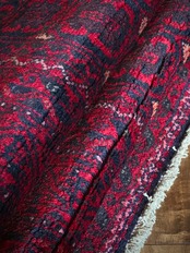 かなり厚手のダブルウェフトで織られた1枚で、パイルのツヤ感とも相まってより深みのある色合いに映るでしょうか。個人的には幅広いペタッとしたシラーゼがヴィンテージのバルーチならではで好きなスタイルです。