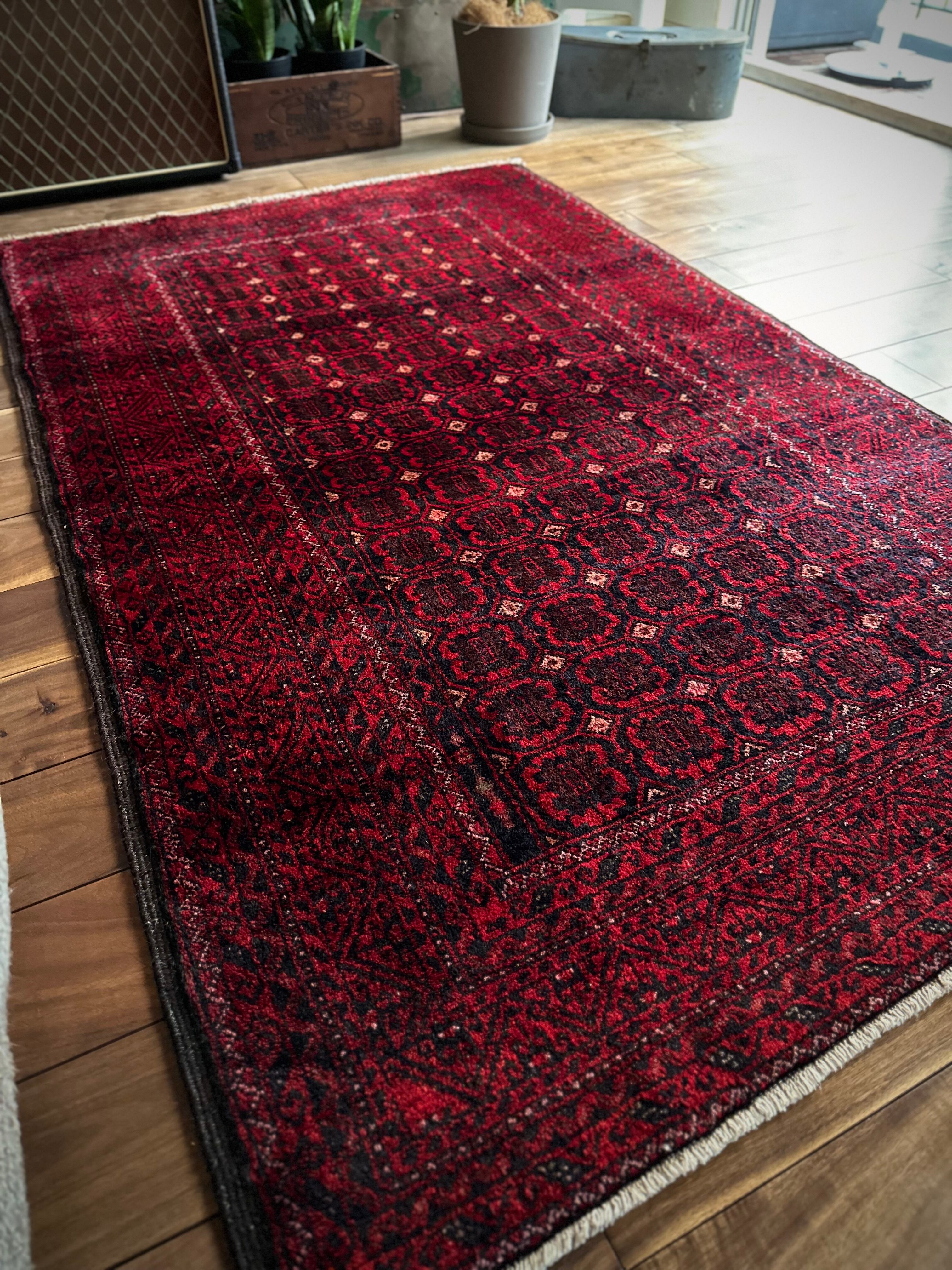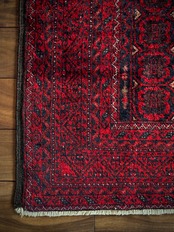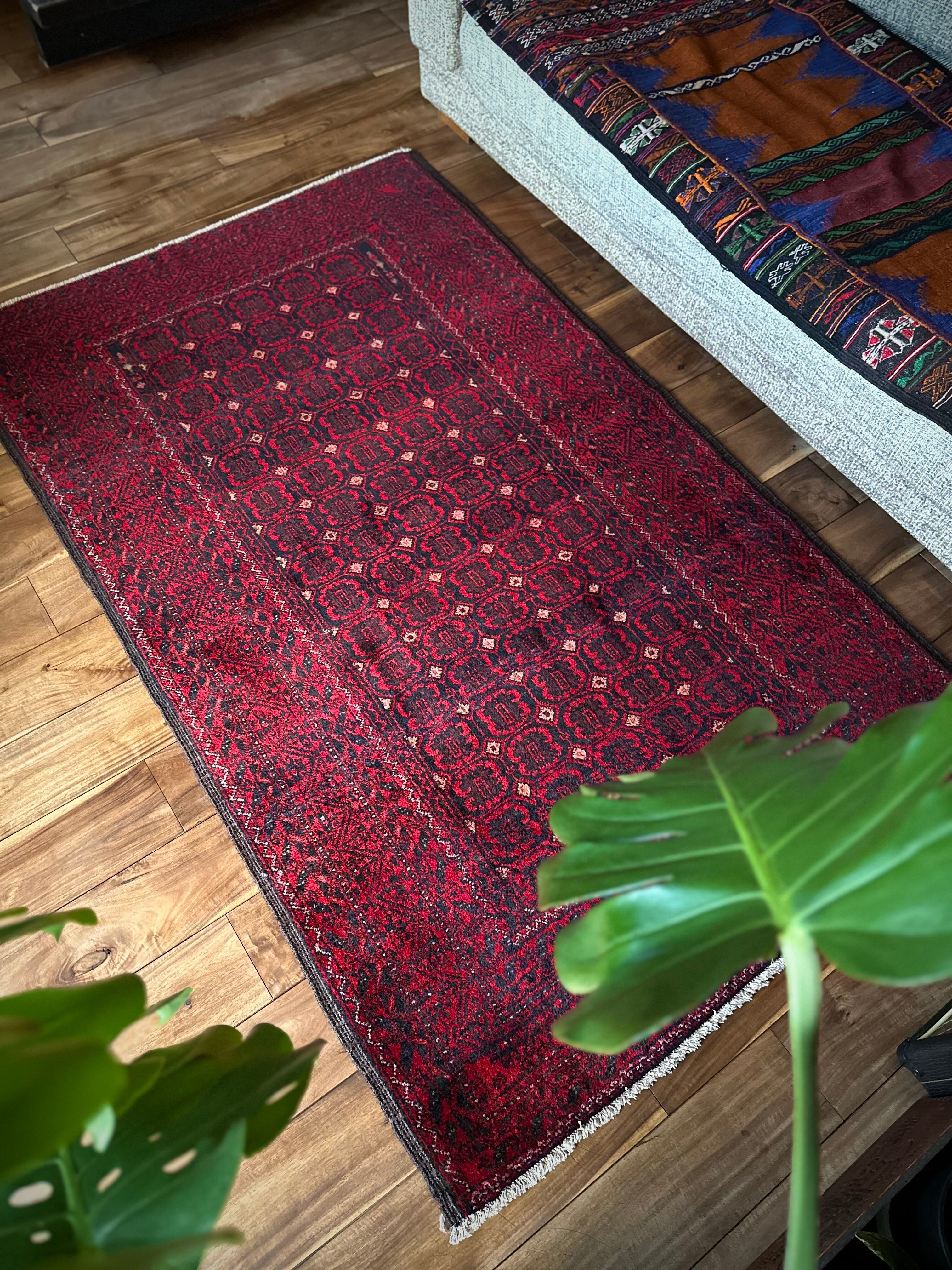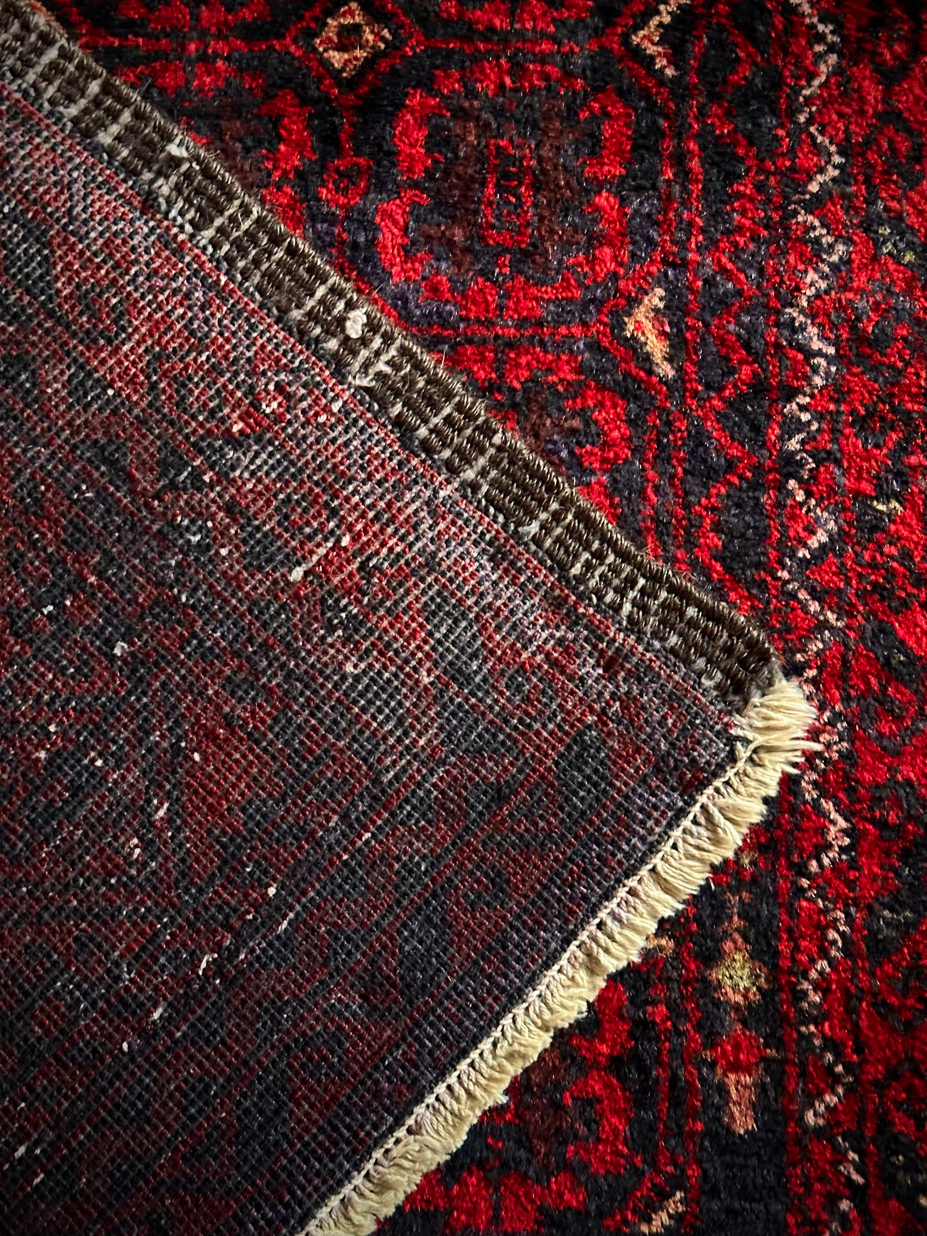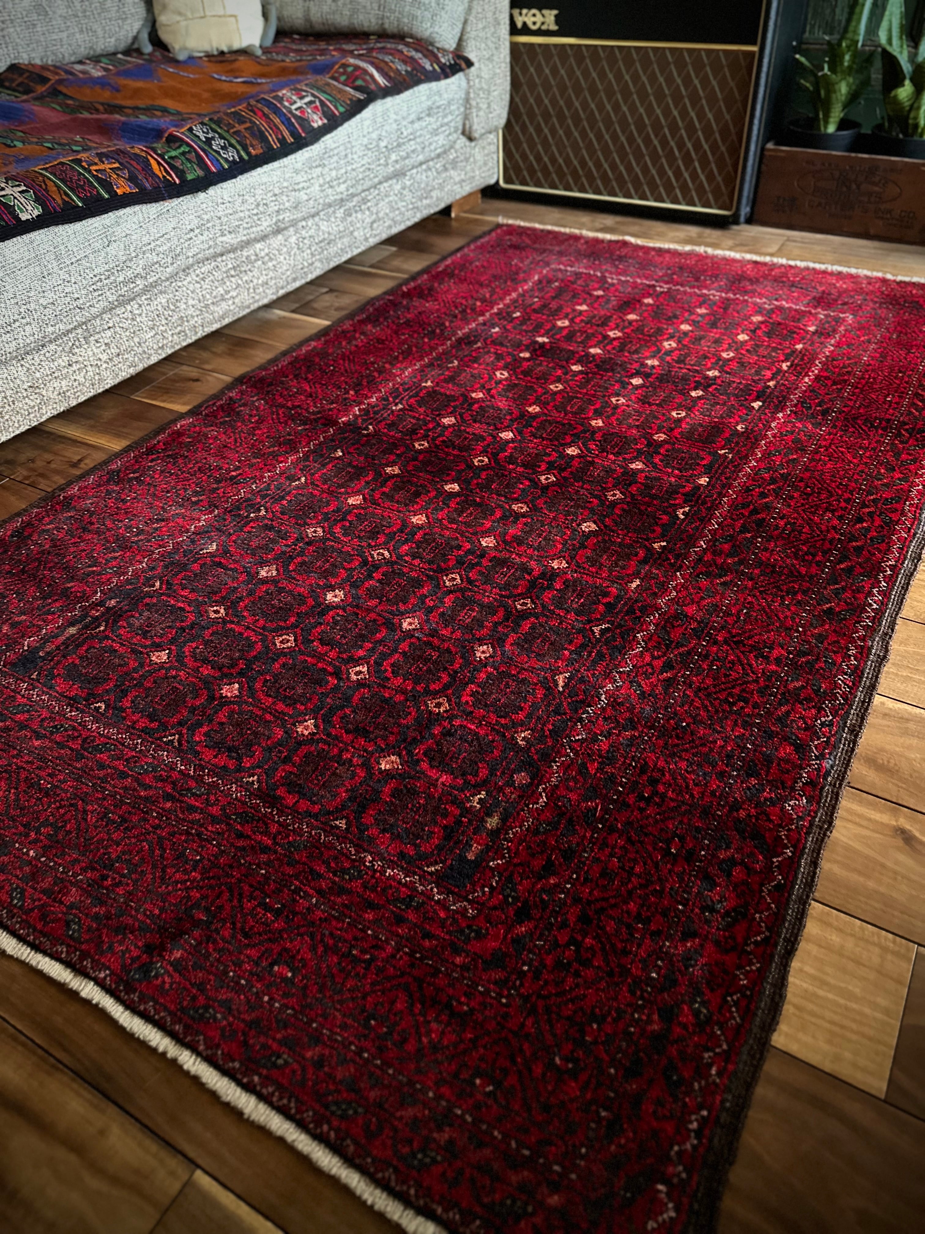 深みのあるブラック&レッドが合わさって全体的にワインレッドに見えるこちらは、イラン東部のマシュハド産バルーチならではのかっこいい雰囲気で、花のような連続紋様に細かなミルフィーユ状のボーダーが冴えるトライバルラグになります。