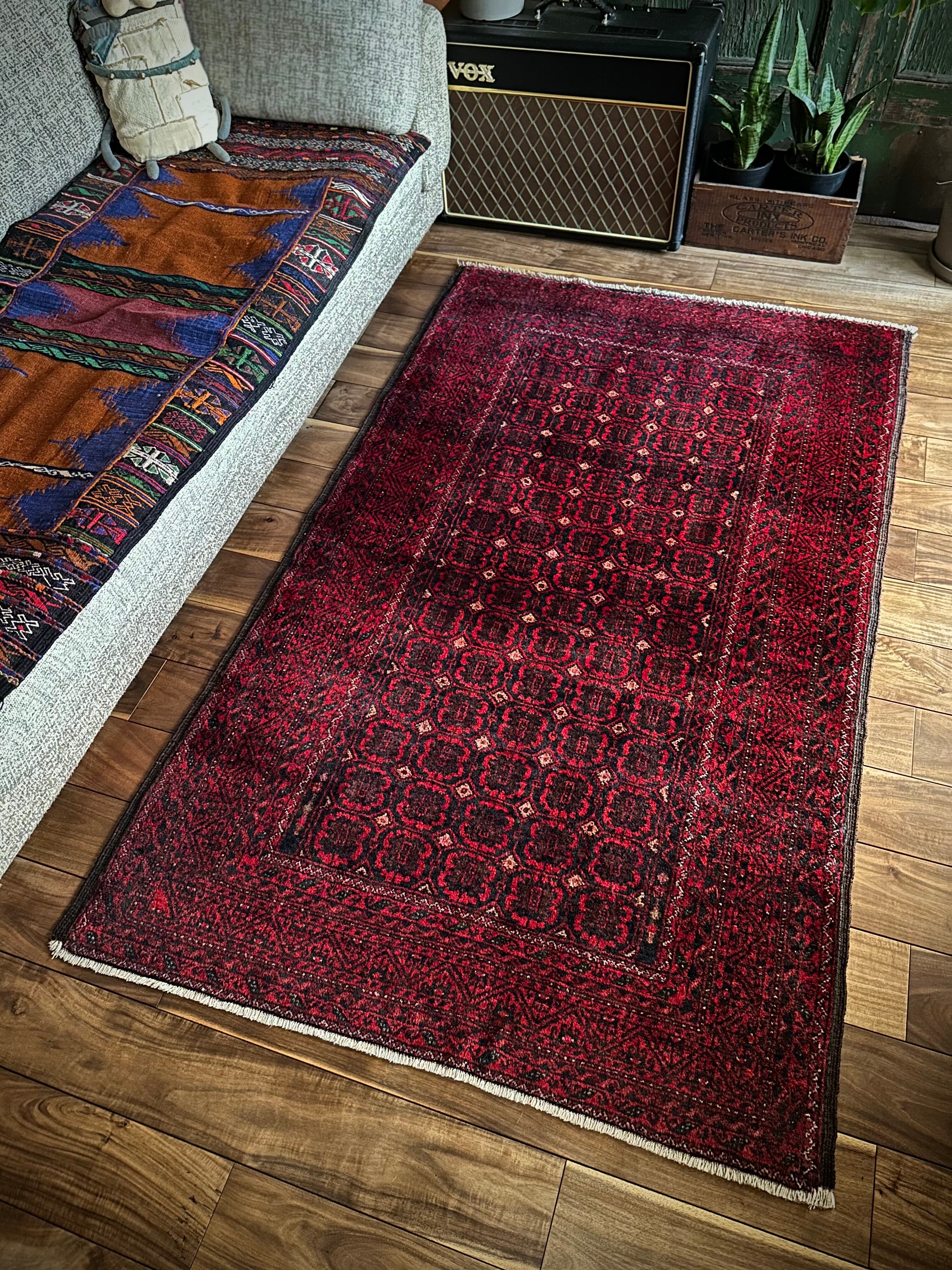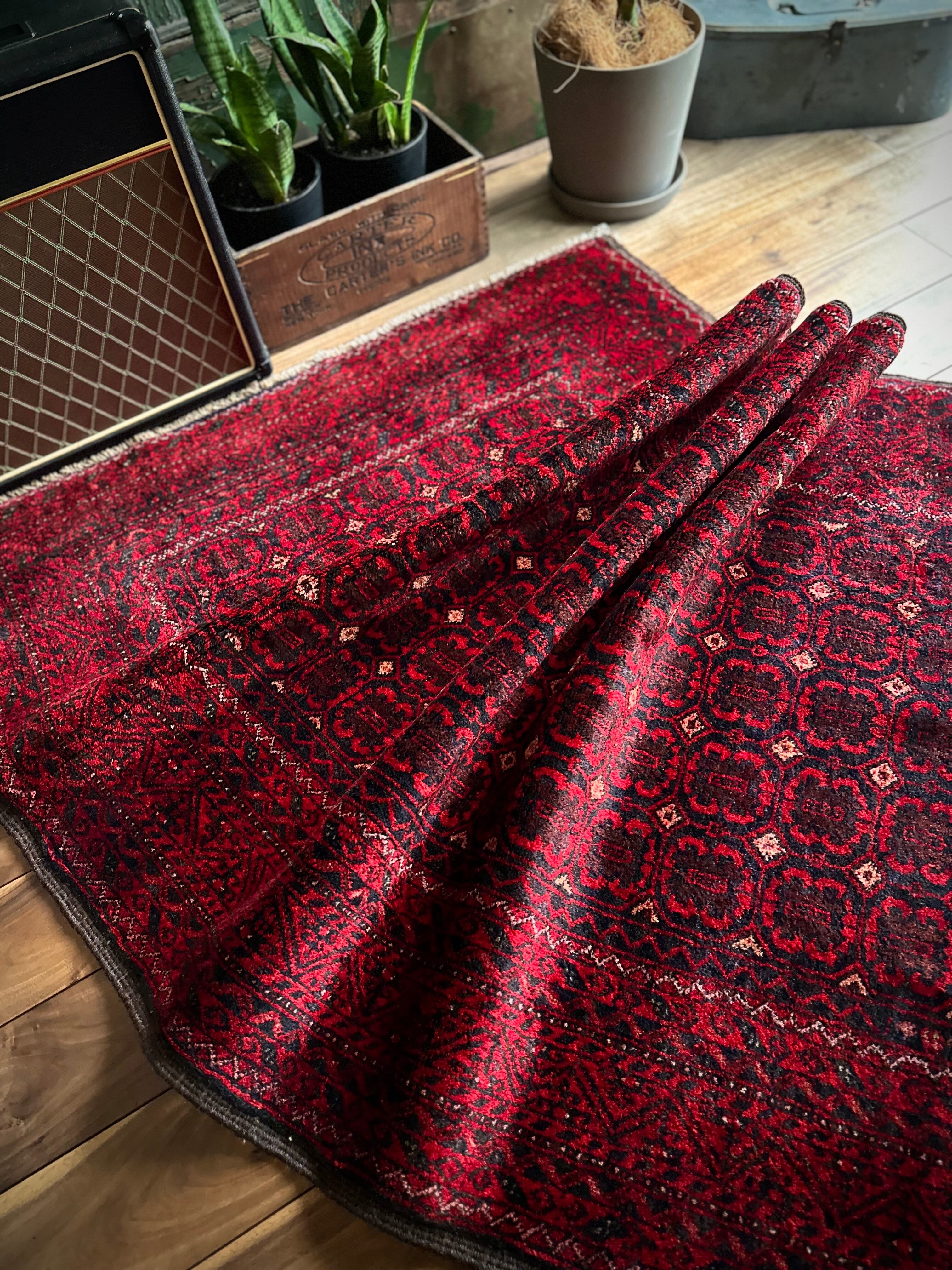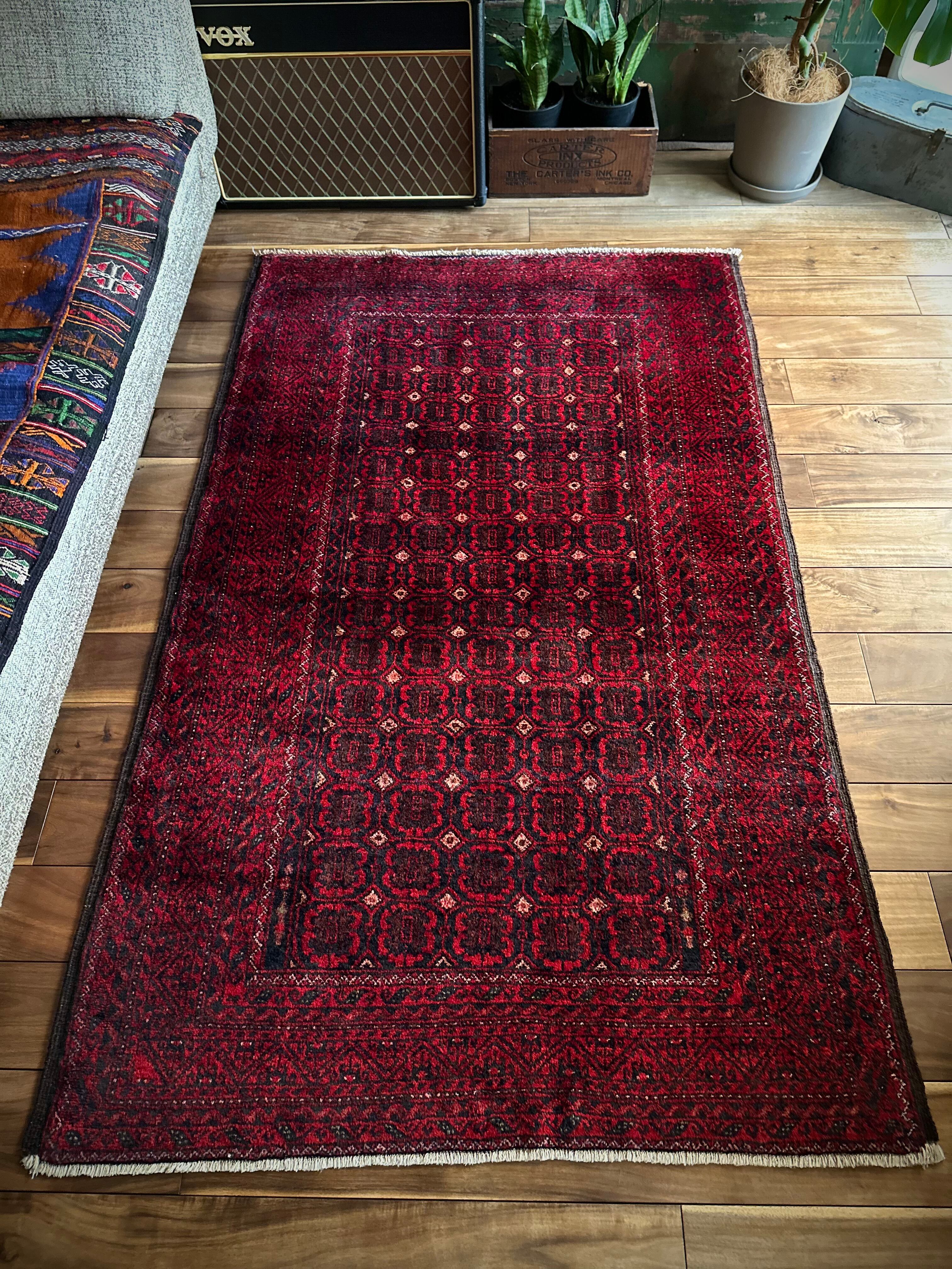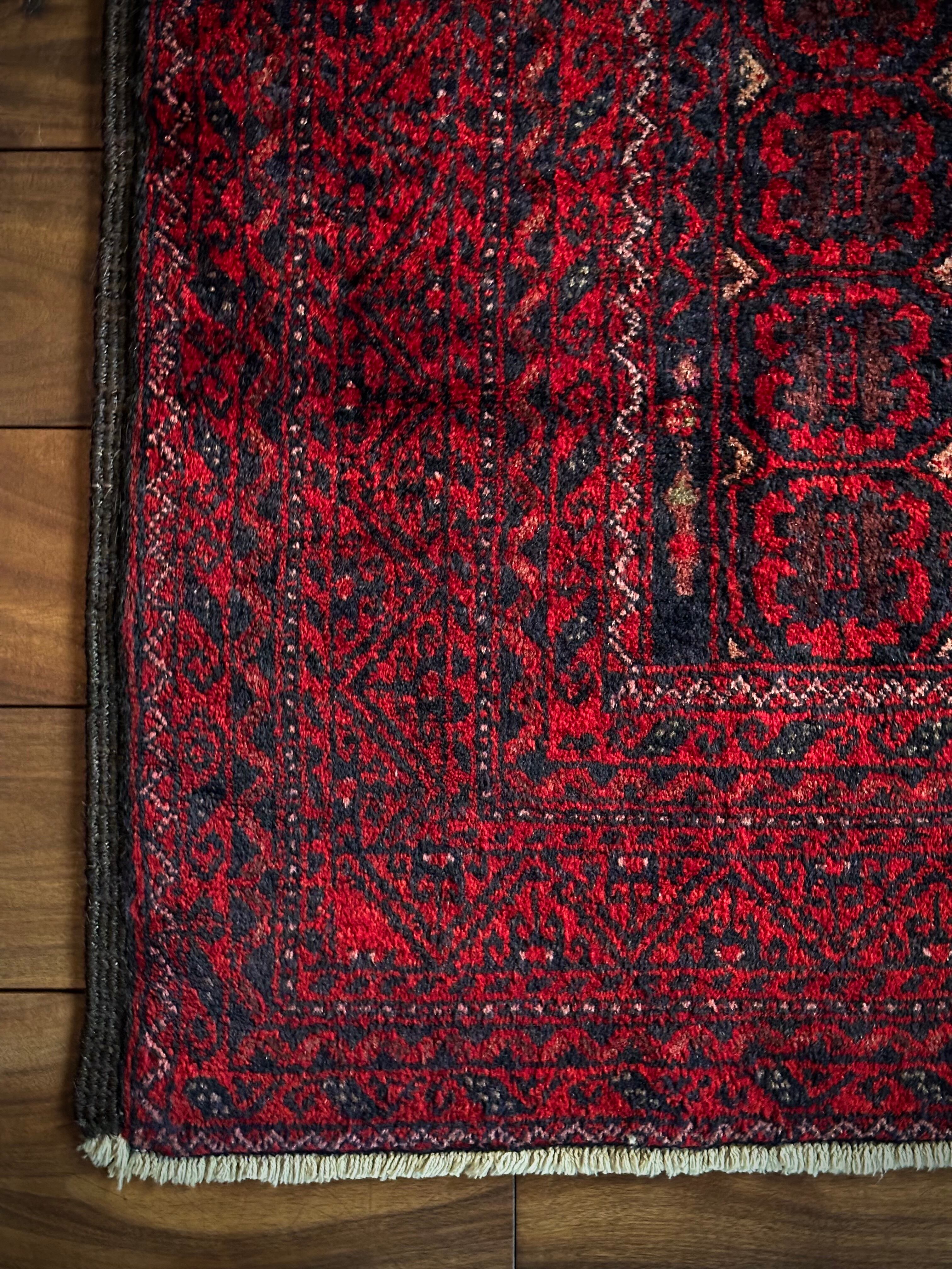 深みのあるブラック&レッドが合わさって全体的にワインレッドに見えるこちらは、イラン東部のマシュハド産バルーチならではのかっこいい雰囲気で、花のような連続紋様に細かなミルフィーユ状のボーダーが冴えるトライバルラグになります。