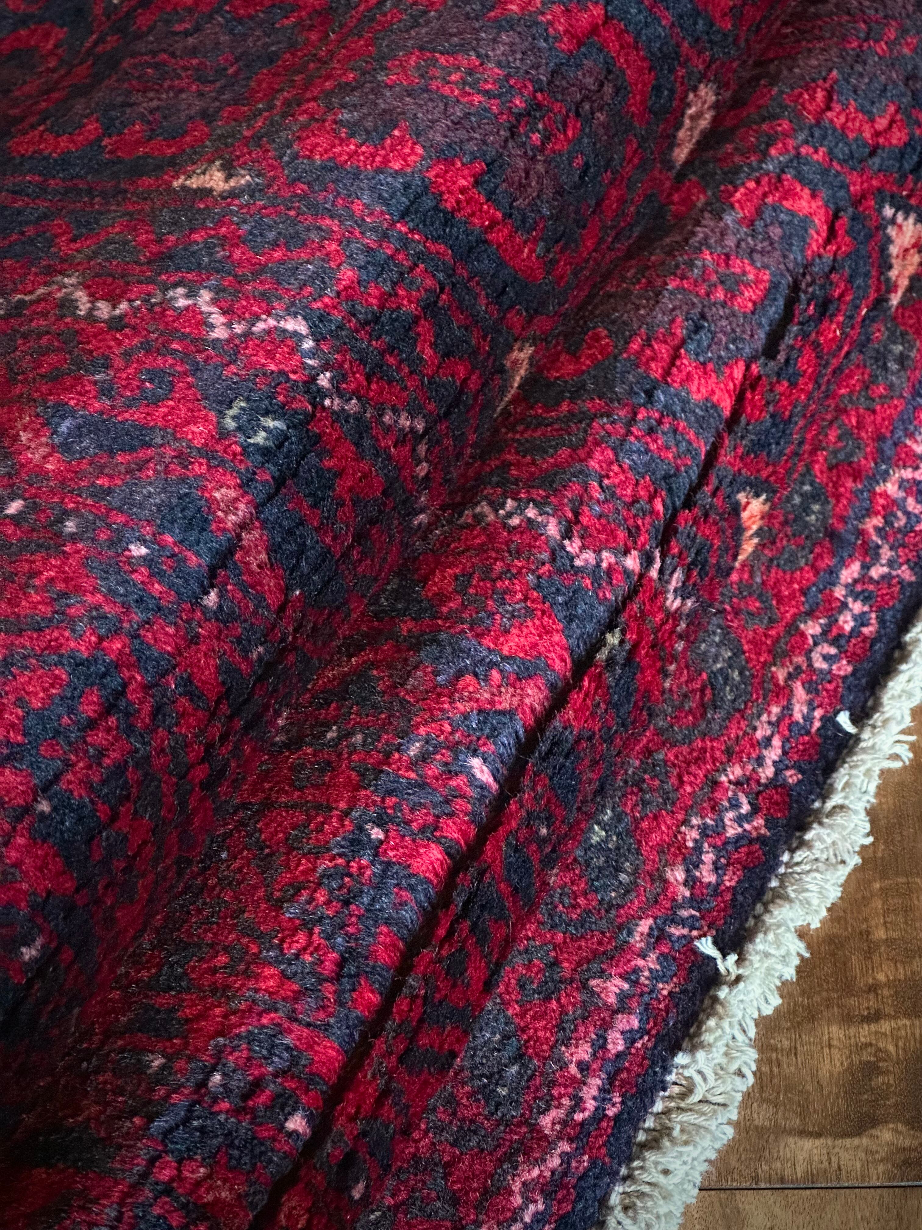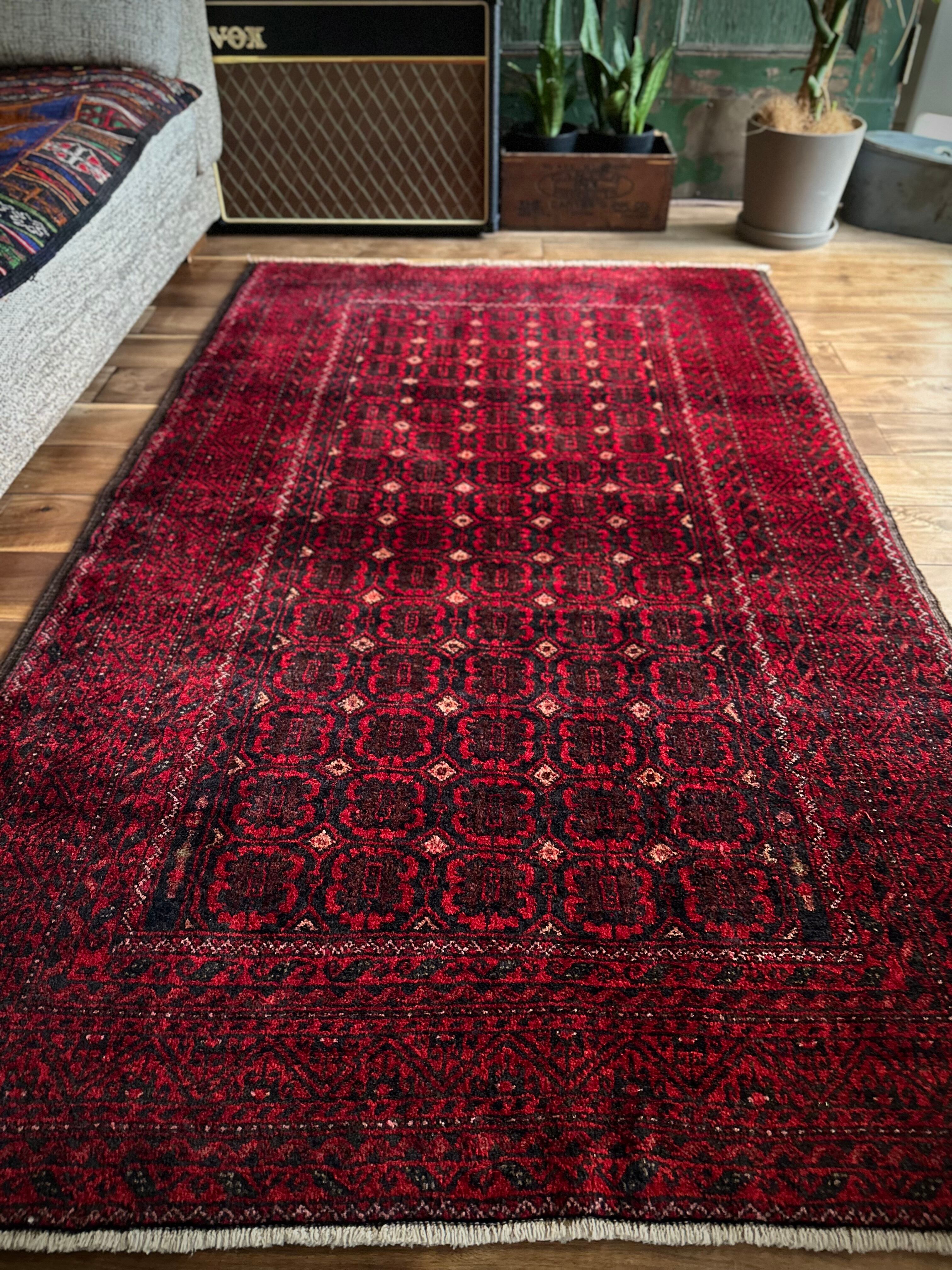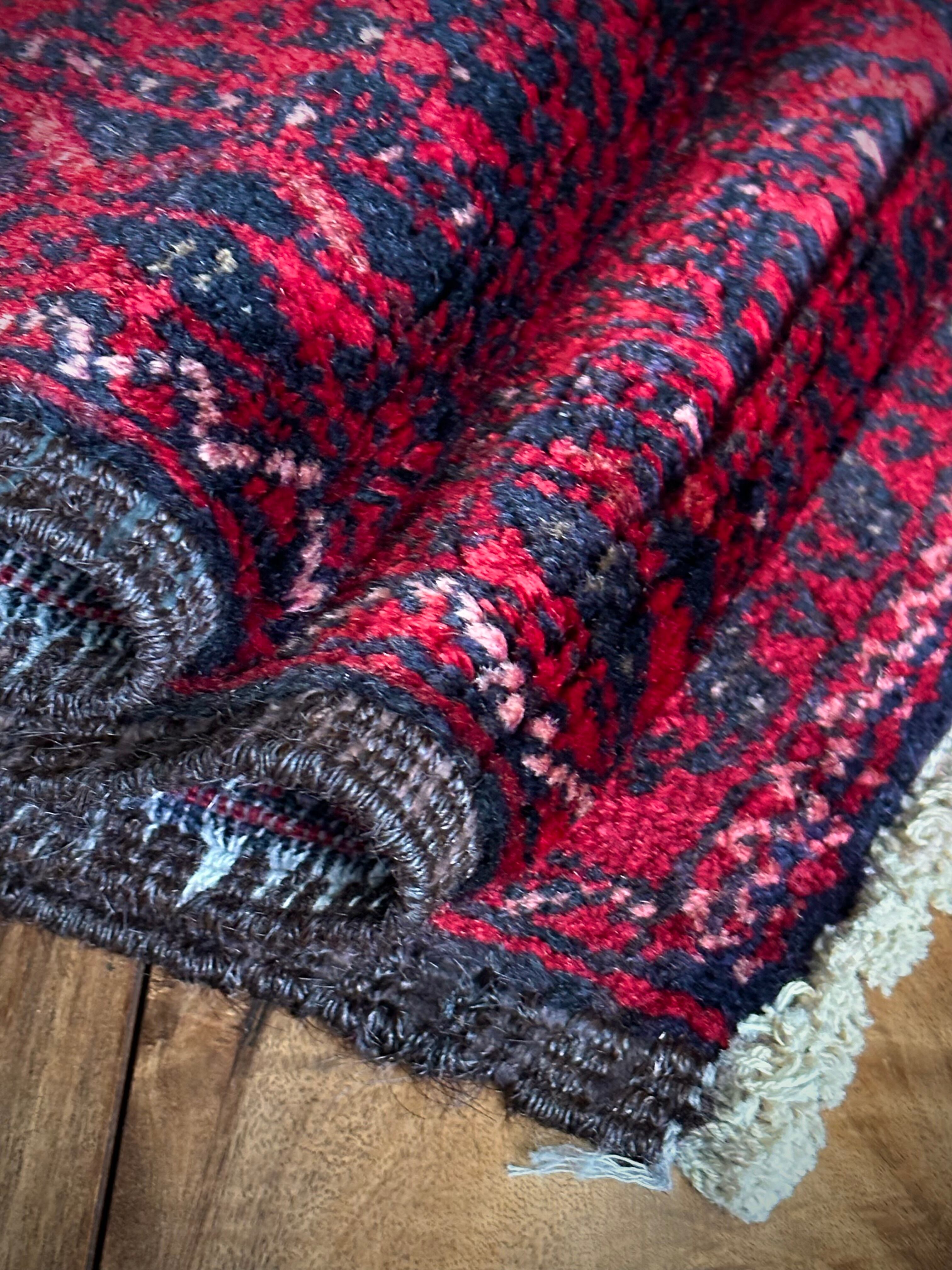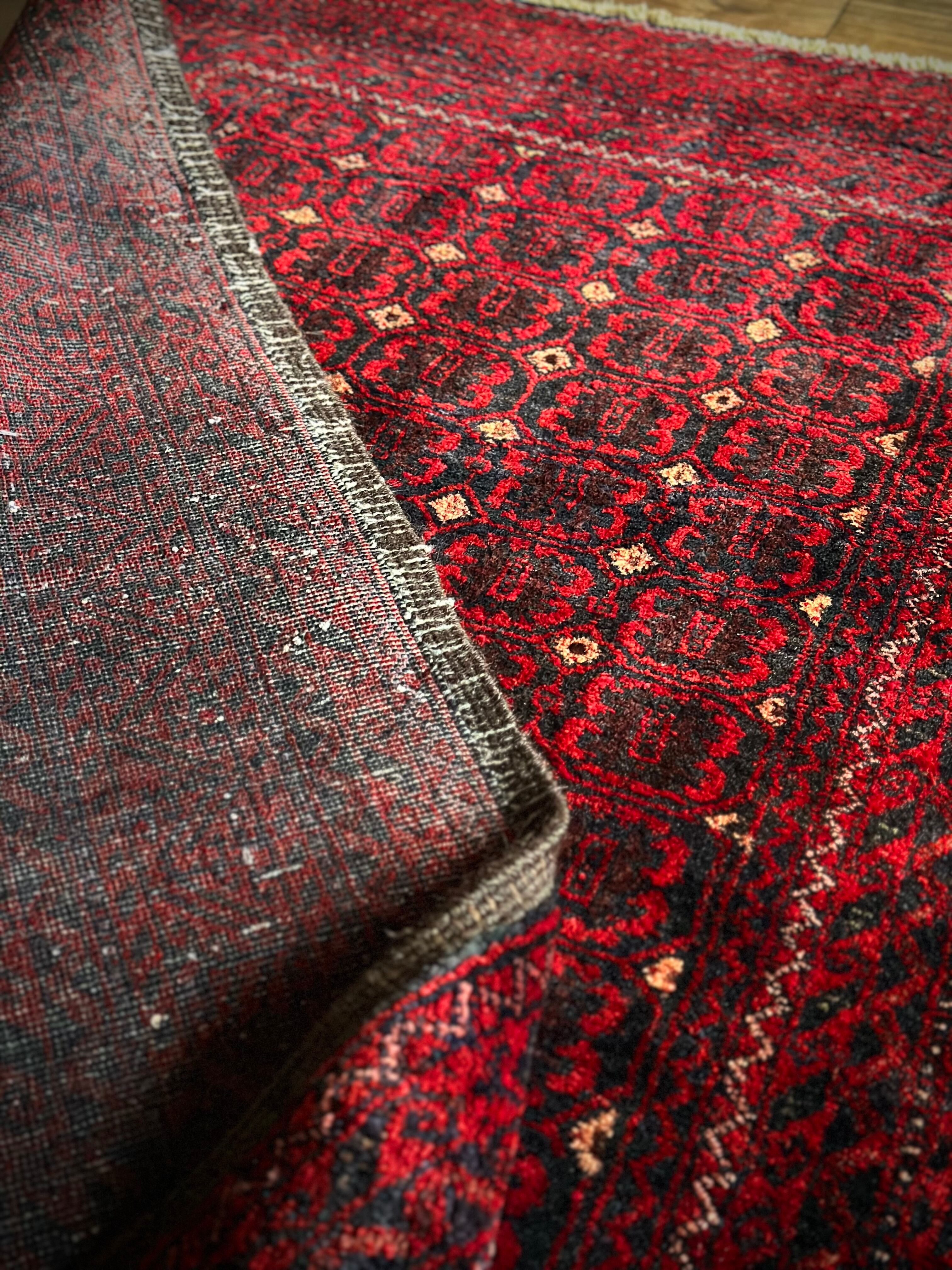 深みのあるブラック&レッドが合わさって全体的にワインレッドに見えるこちらは、イラン東部のマシュハド産バルーチならではのかっこいい雰囲気で、花のような連続紋様に細かなミルフィーユ状のボーダーが冴えるトライバルラグになります。