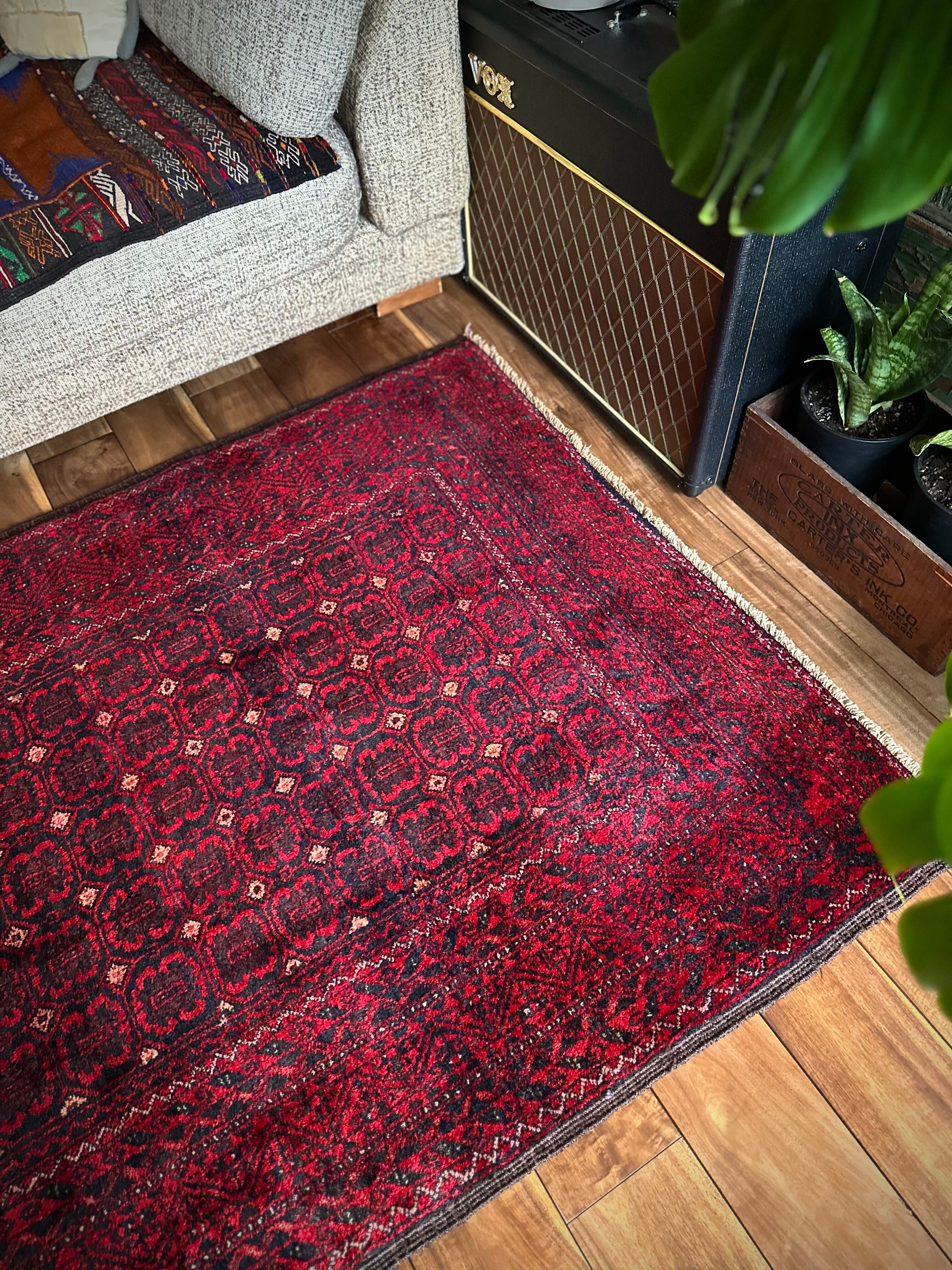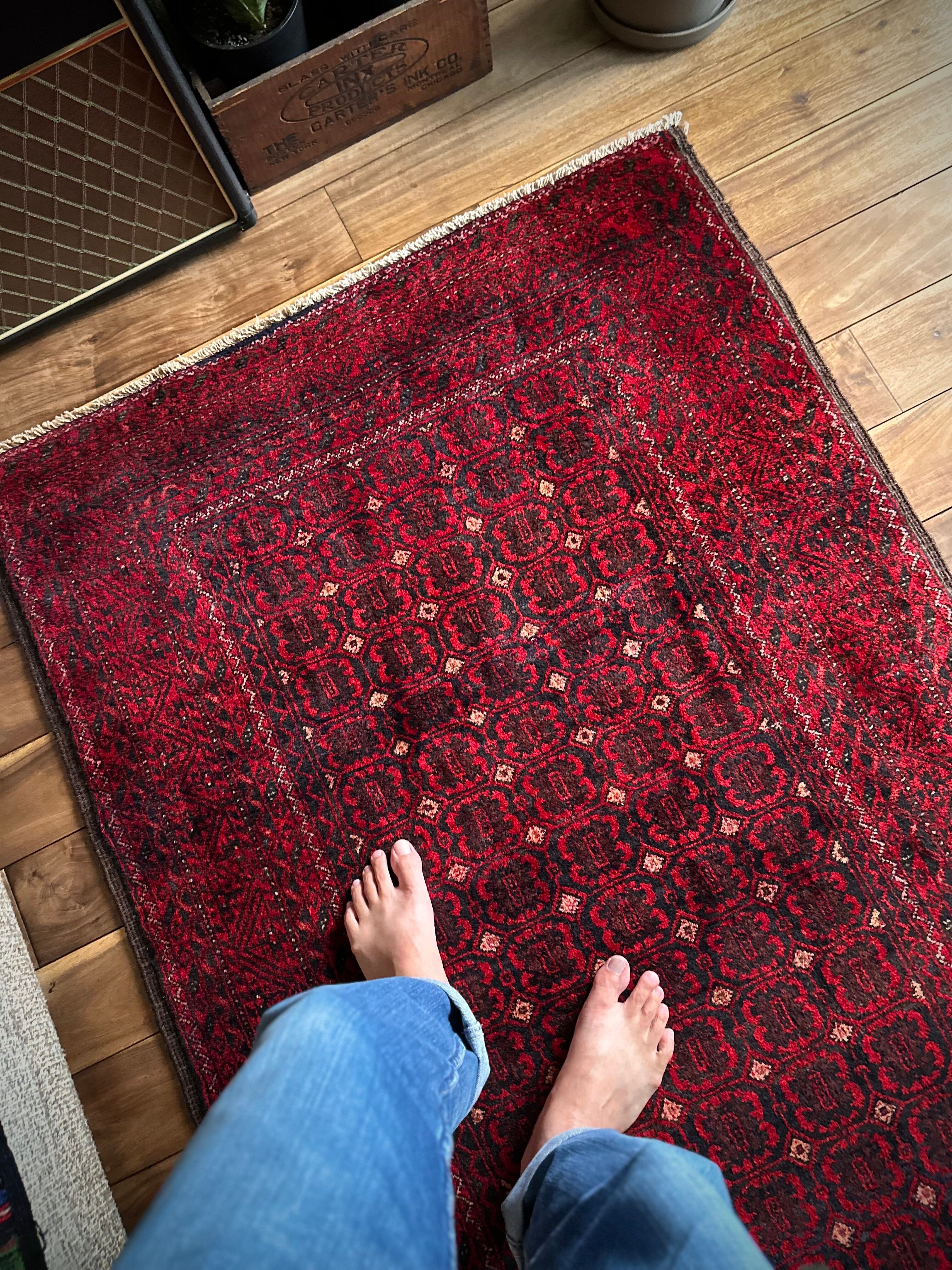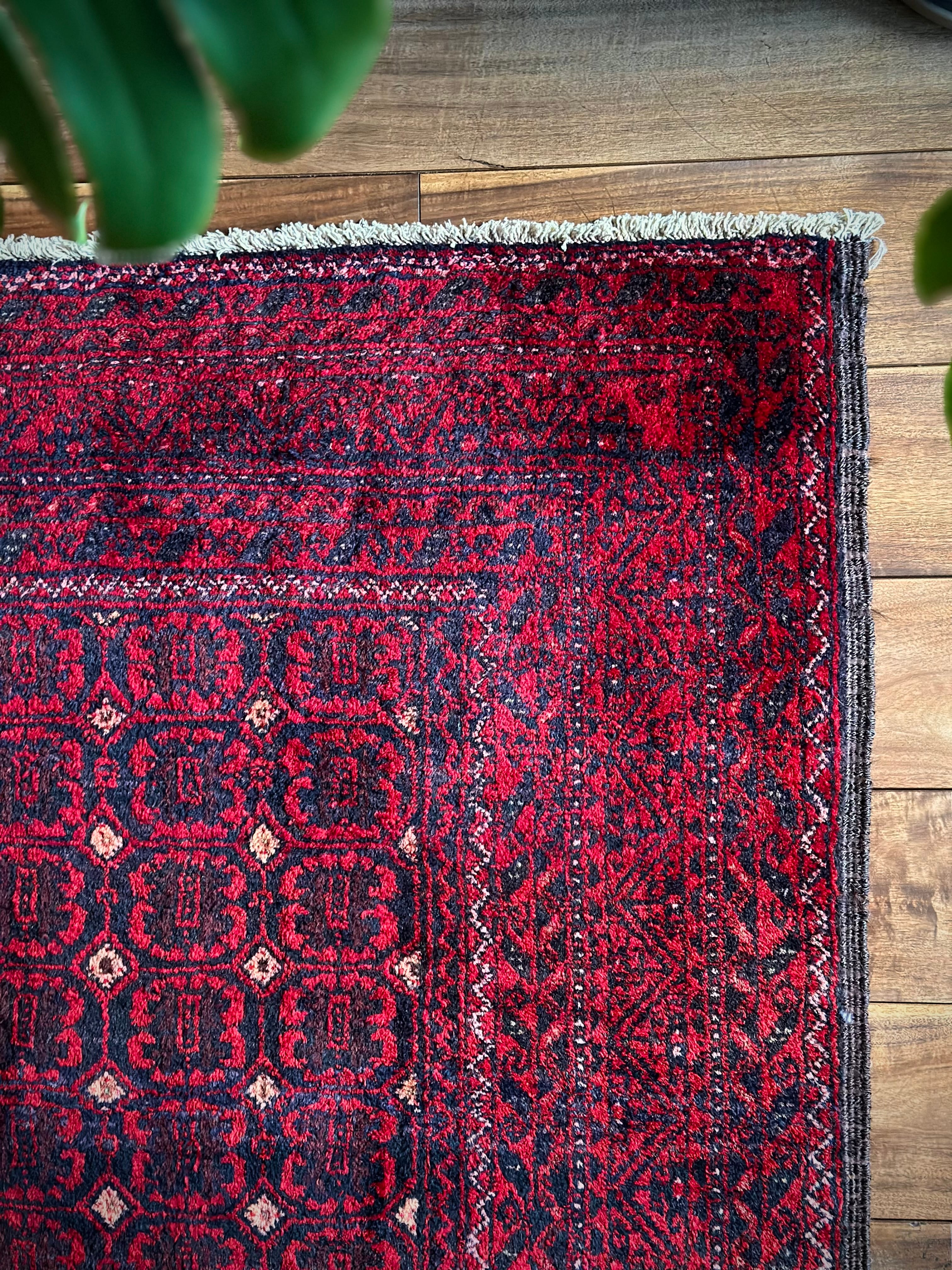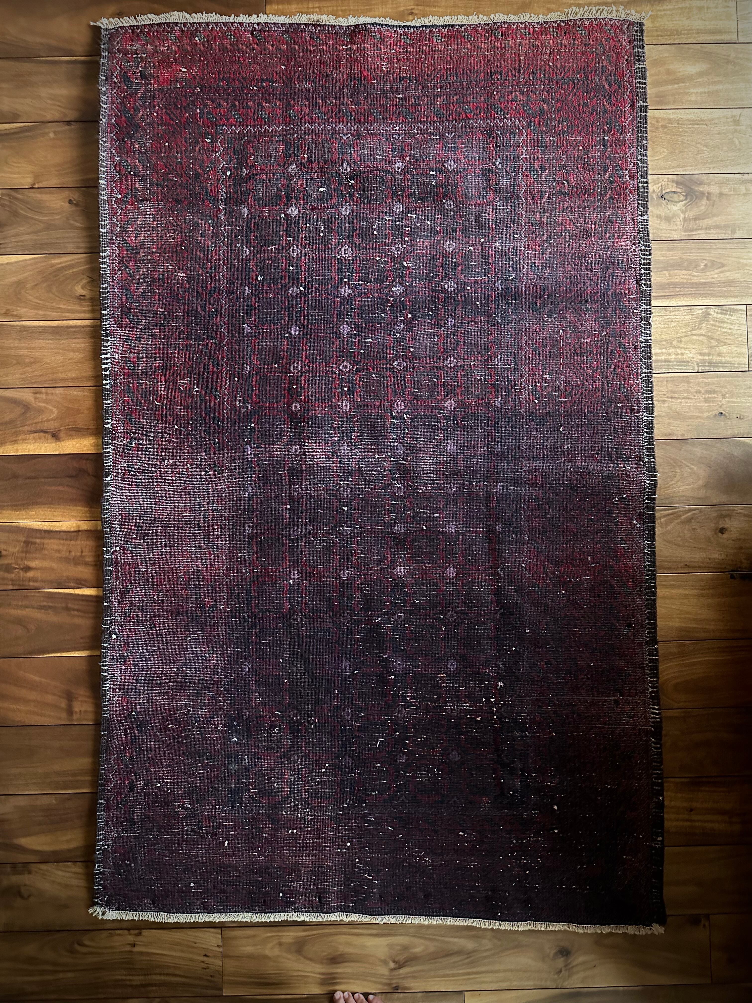 深みのあるブラック&レッドが合わさって全体的にワインレッドに見えるこちらは、イラン東部のマシュハド産バルーチならではのかっこいい雰囲気で、花のような連続紋様に細かなミルフィーユ状のボーダーが冴えるトライバルラグになります。