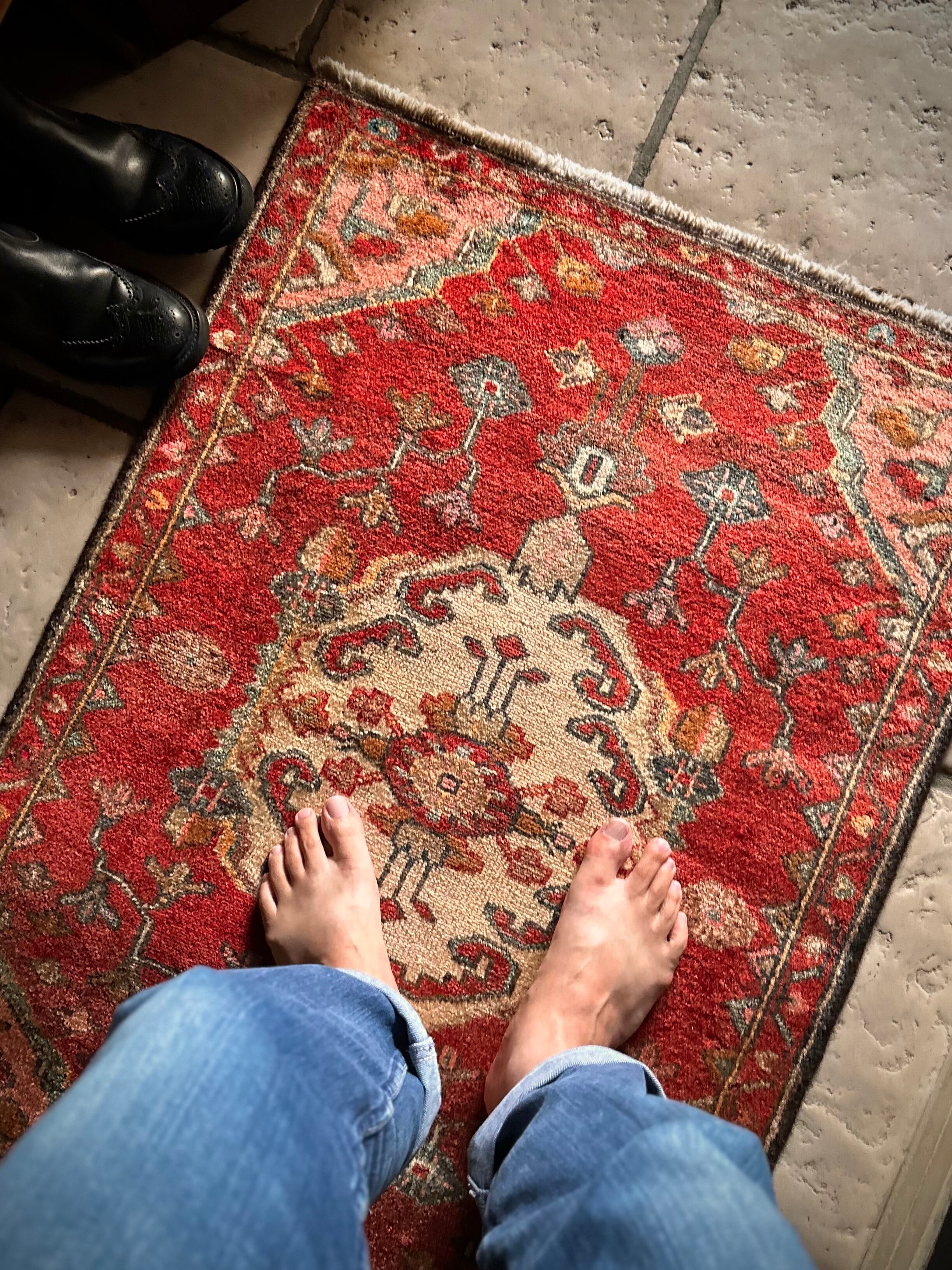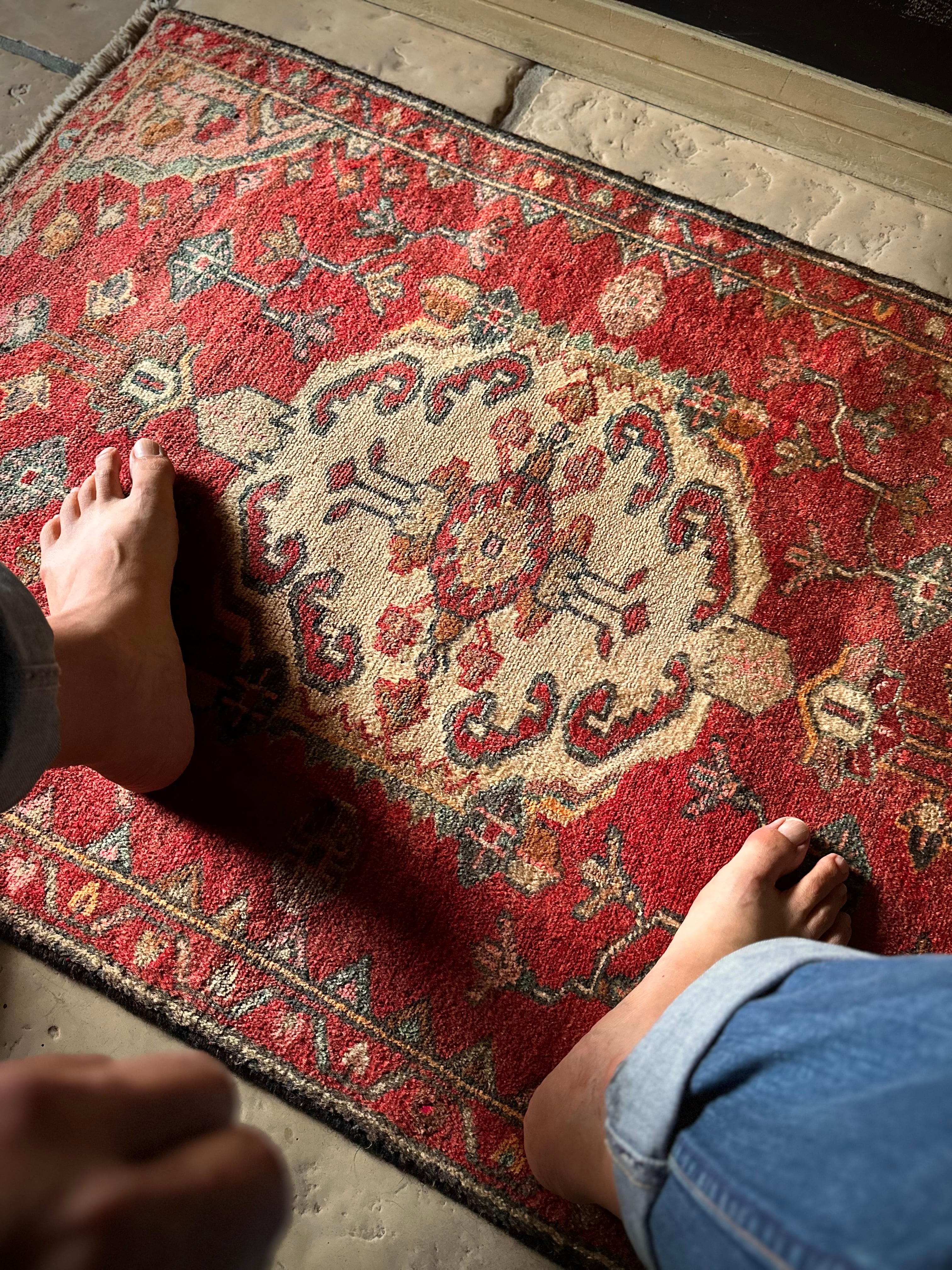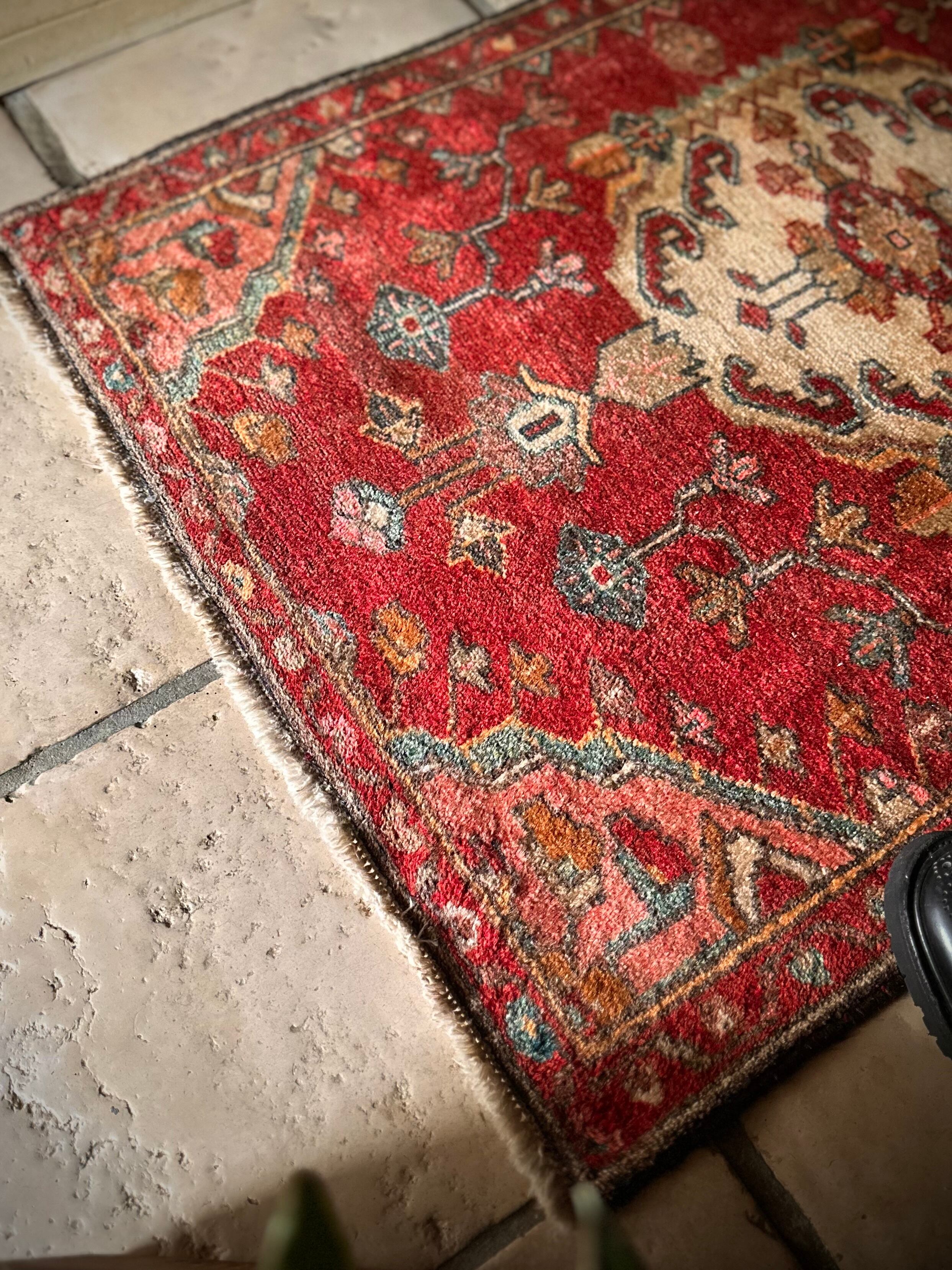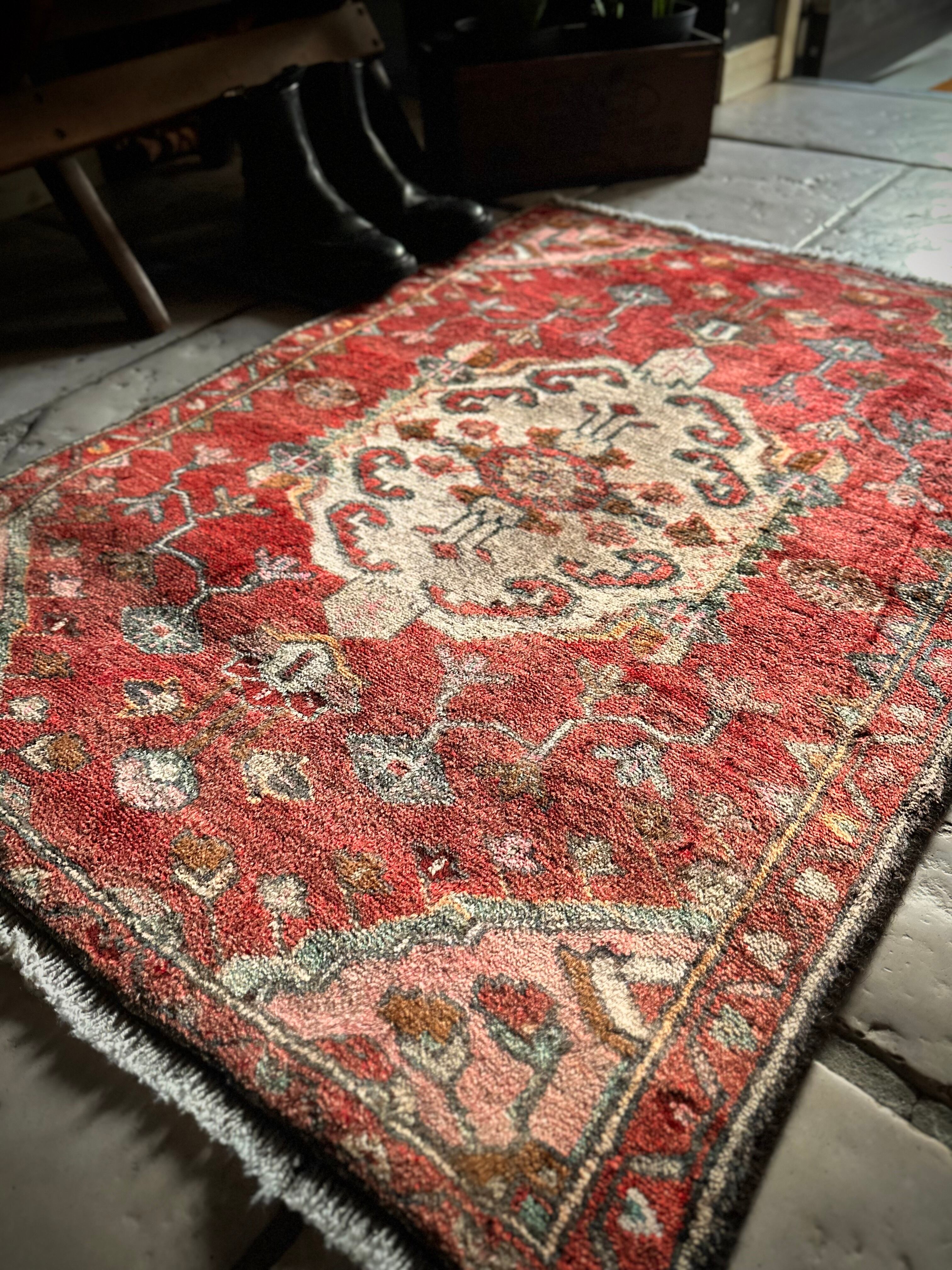 最後にラグそのものに関しては羊毛特有の匂いがあり、採寸は中央付近で計測していますが、手織りならではの歪みによる誤差や水洗いクリーニングによる縮み、また草木染めによる経年劣化の色ムラなどがありますが、それもまたヴィンテージラグの魅力かとご理解ください。