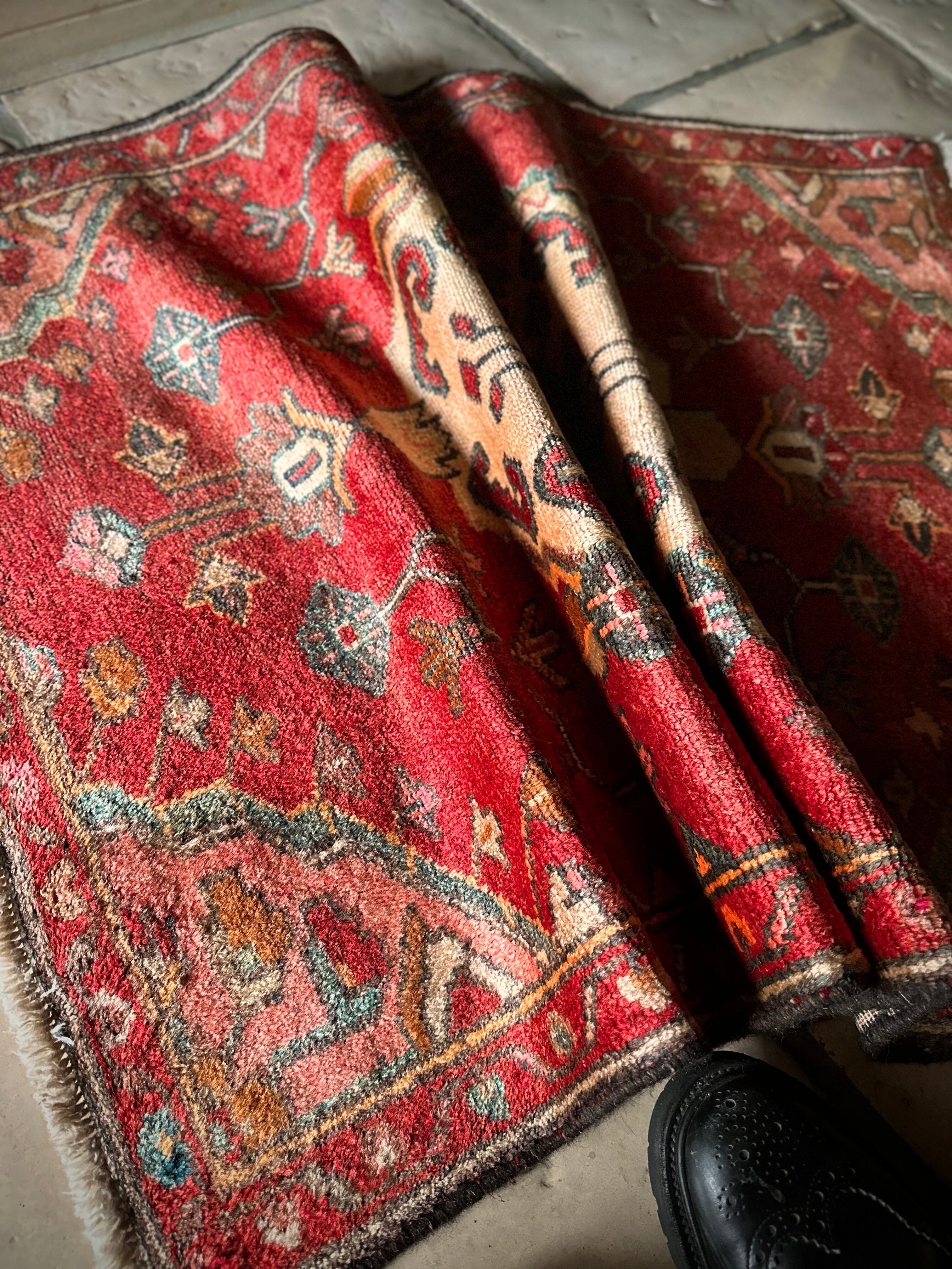 なんとも輝かしいシャイニーピンクの表情が堪らなくガーリーな、ハマダン近郊で手織りされたかなり古めのヴィレッジラグになります。