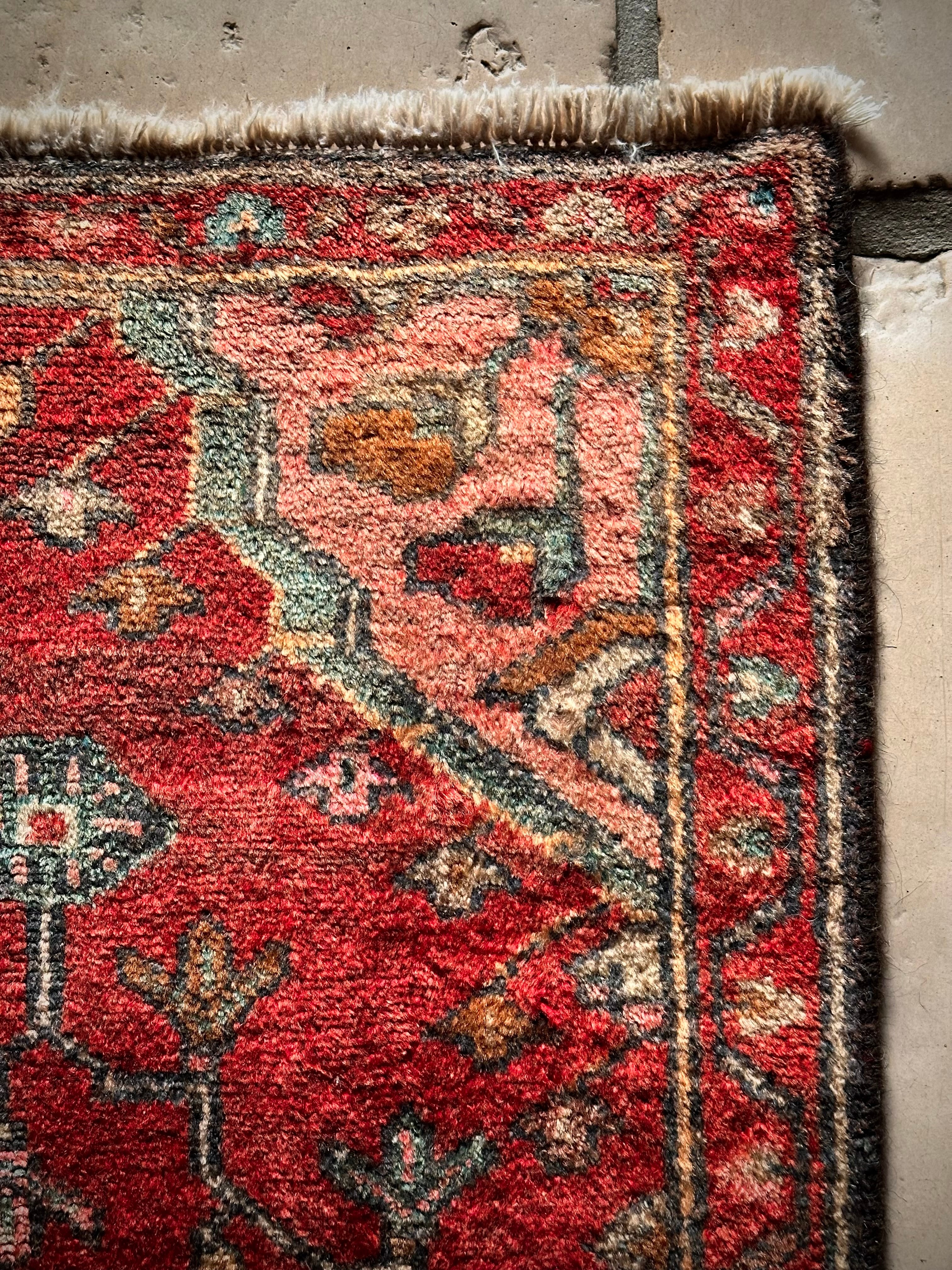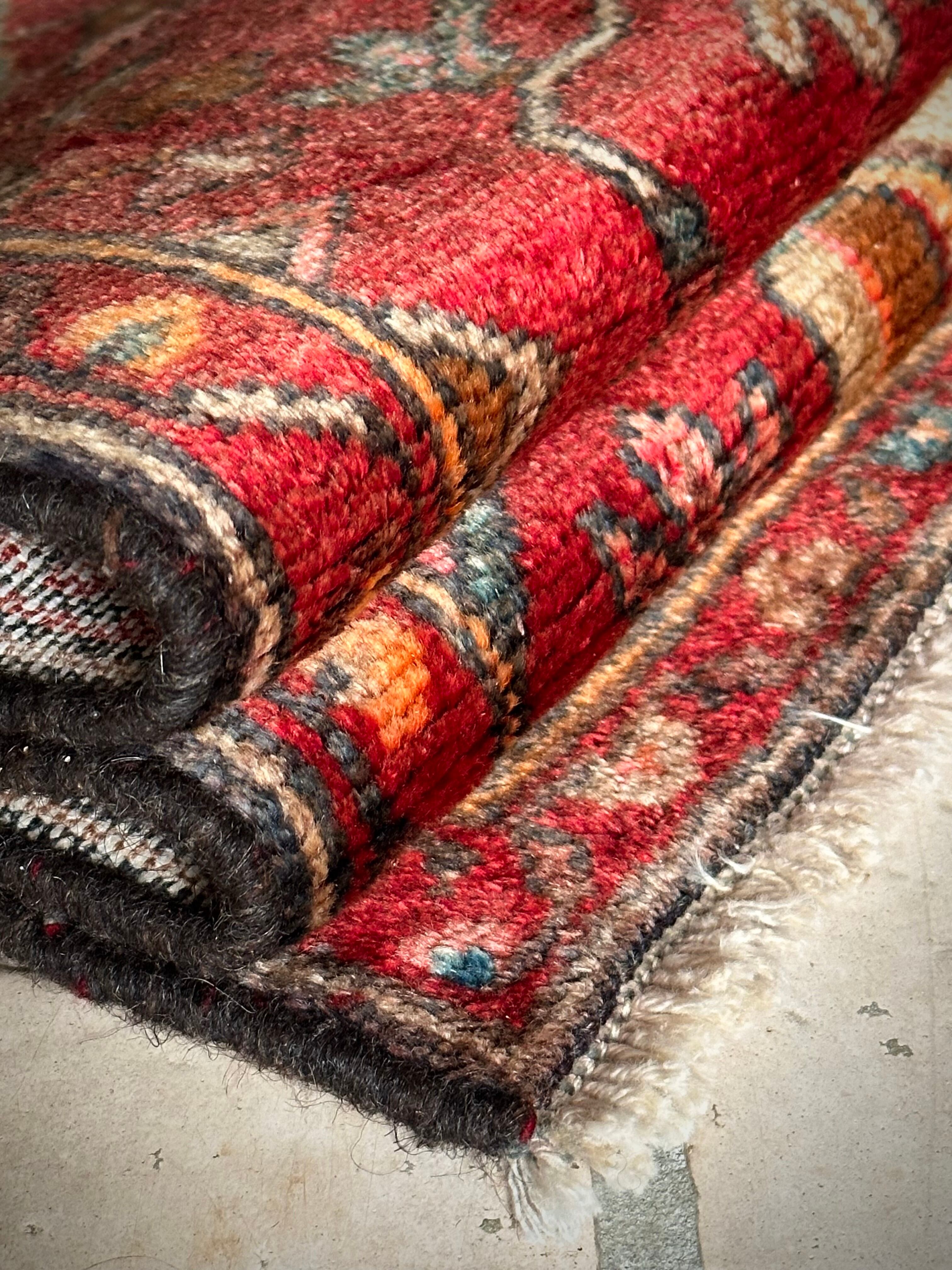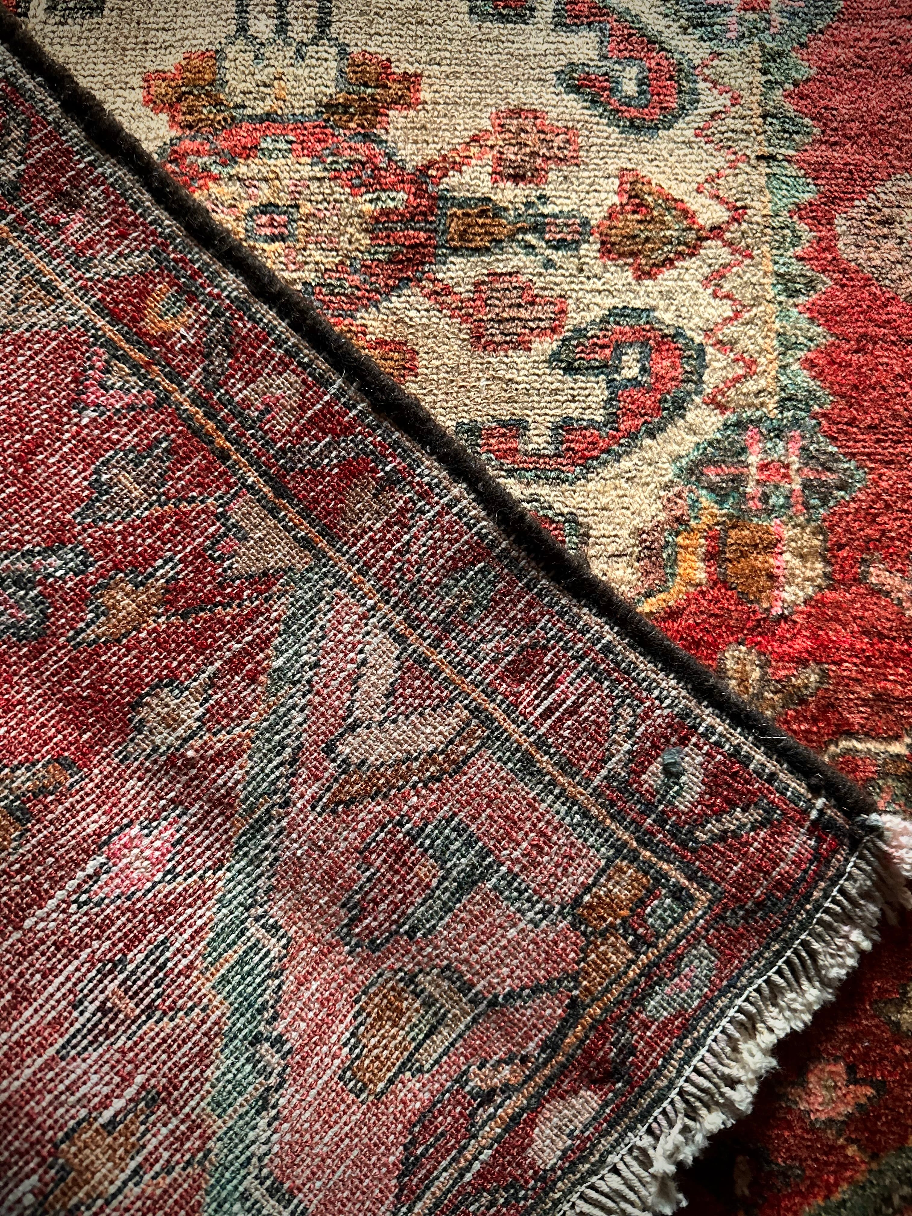 経年としてはかなり古い50年前と、ヴィンテージラグならではのツヤ感とピンクの色味が合わさってよりゴージャスな見映えに。それなりの使用感はありますが、特に目立つ汚れやダメージにリペア箇所が見当たらないグッドなコンディションで、ハマダンらしい短めのパイルでガシっとした織りになります。