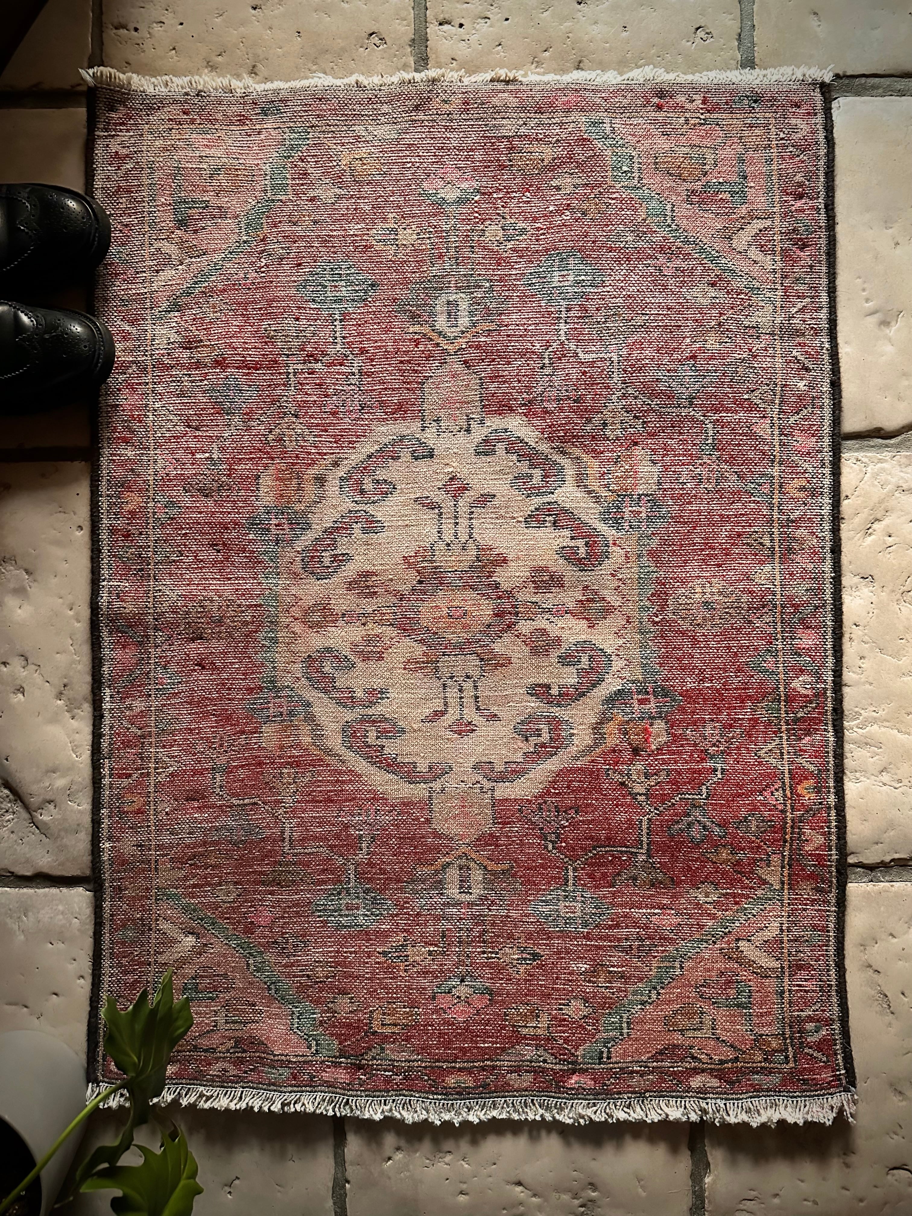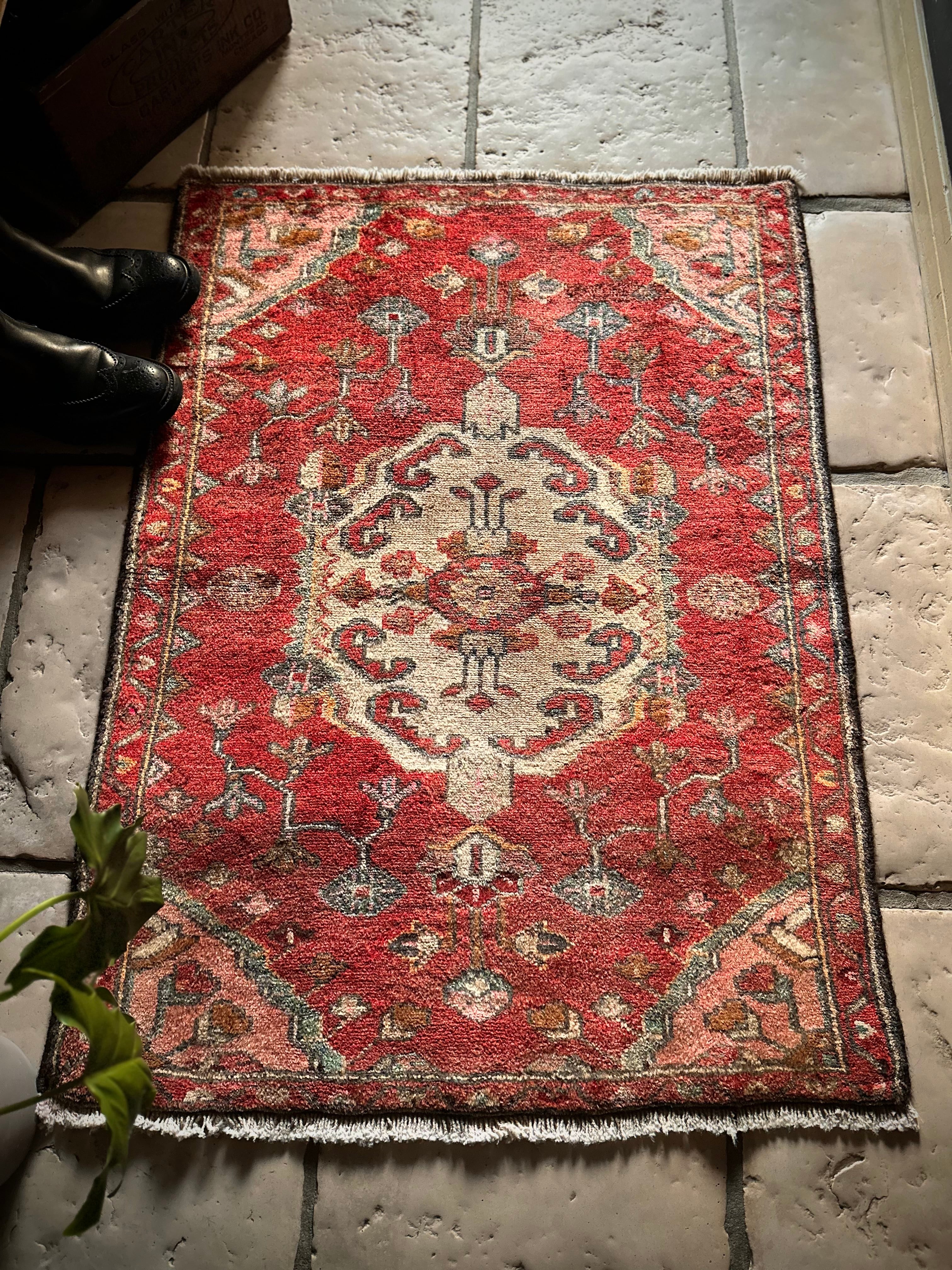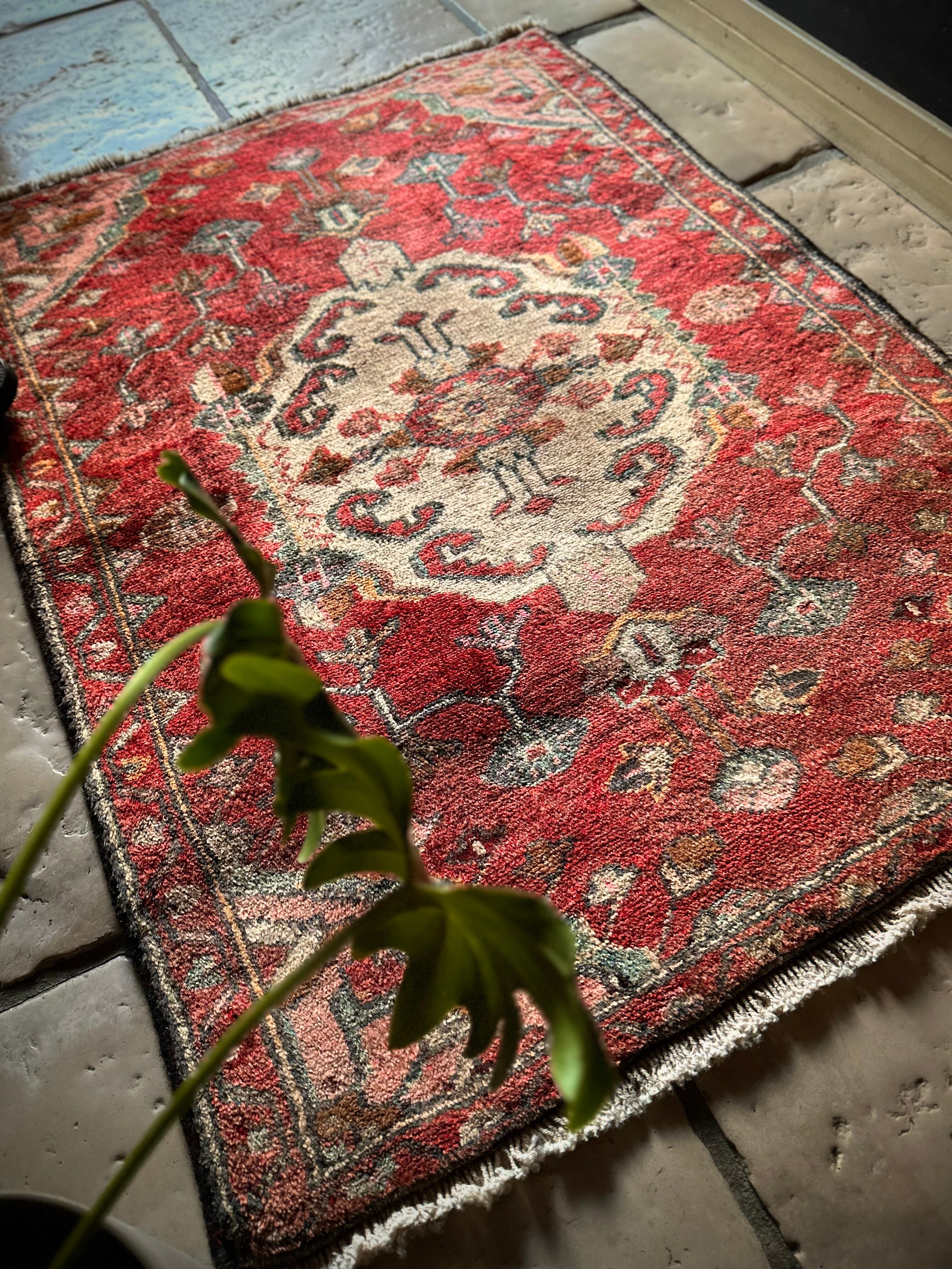 経年としてはかなり古い50年前と、ヴィンテージラグならではのツヤ感とピンクの色味が合わさってよりゴージャスな見映えに。それなりの使用感はありますが、特に目立つ汚れやダメージにリペア箇所が見当たらないグッドなコンディションで、ハマダンらしい短めのパイルでガシっとした織りになります。