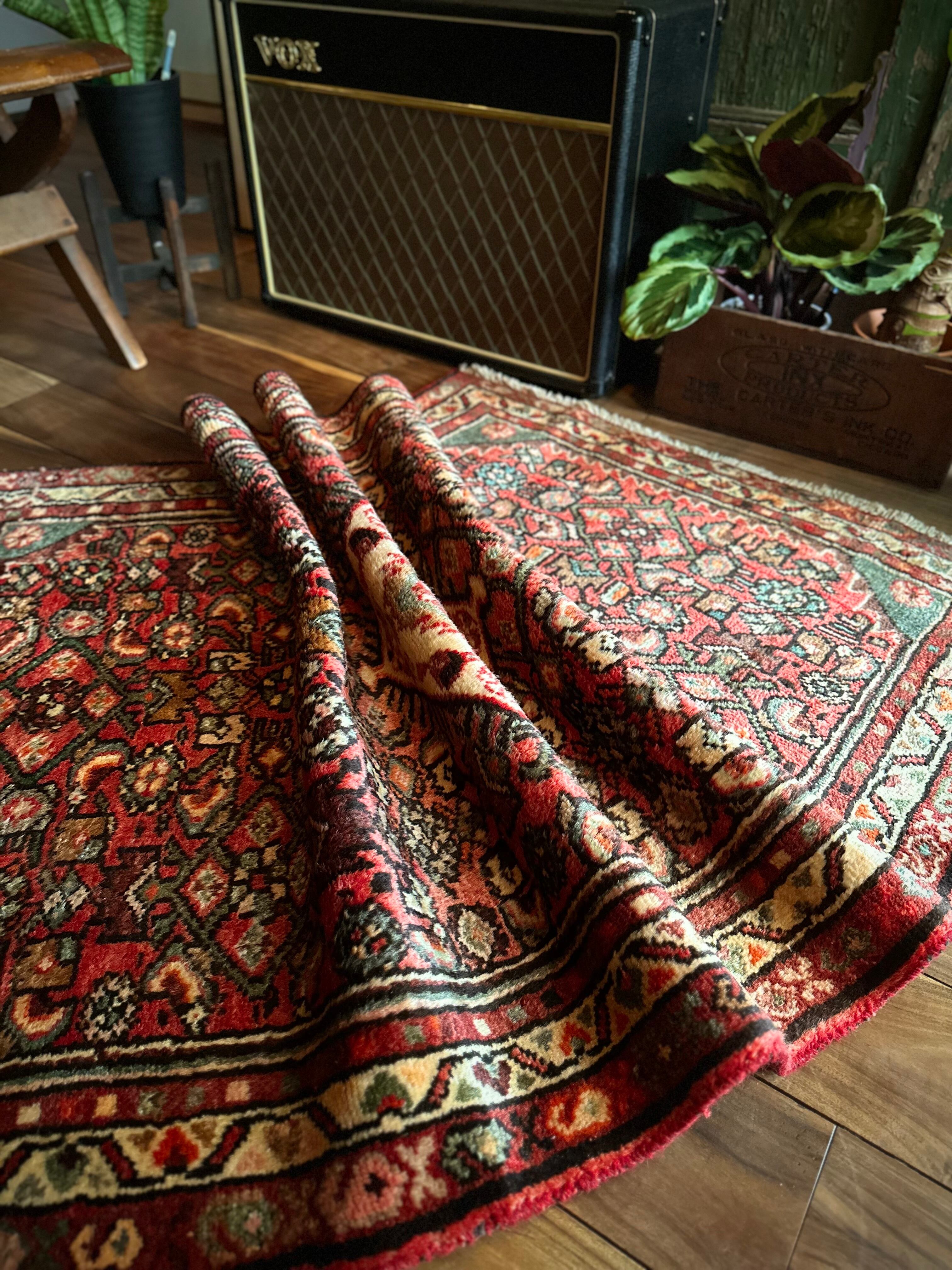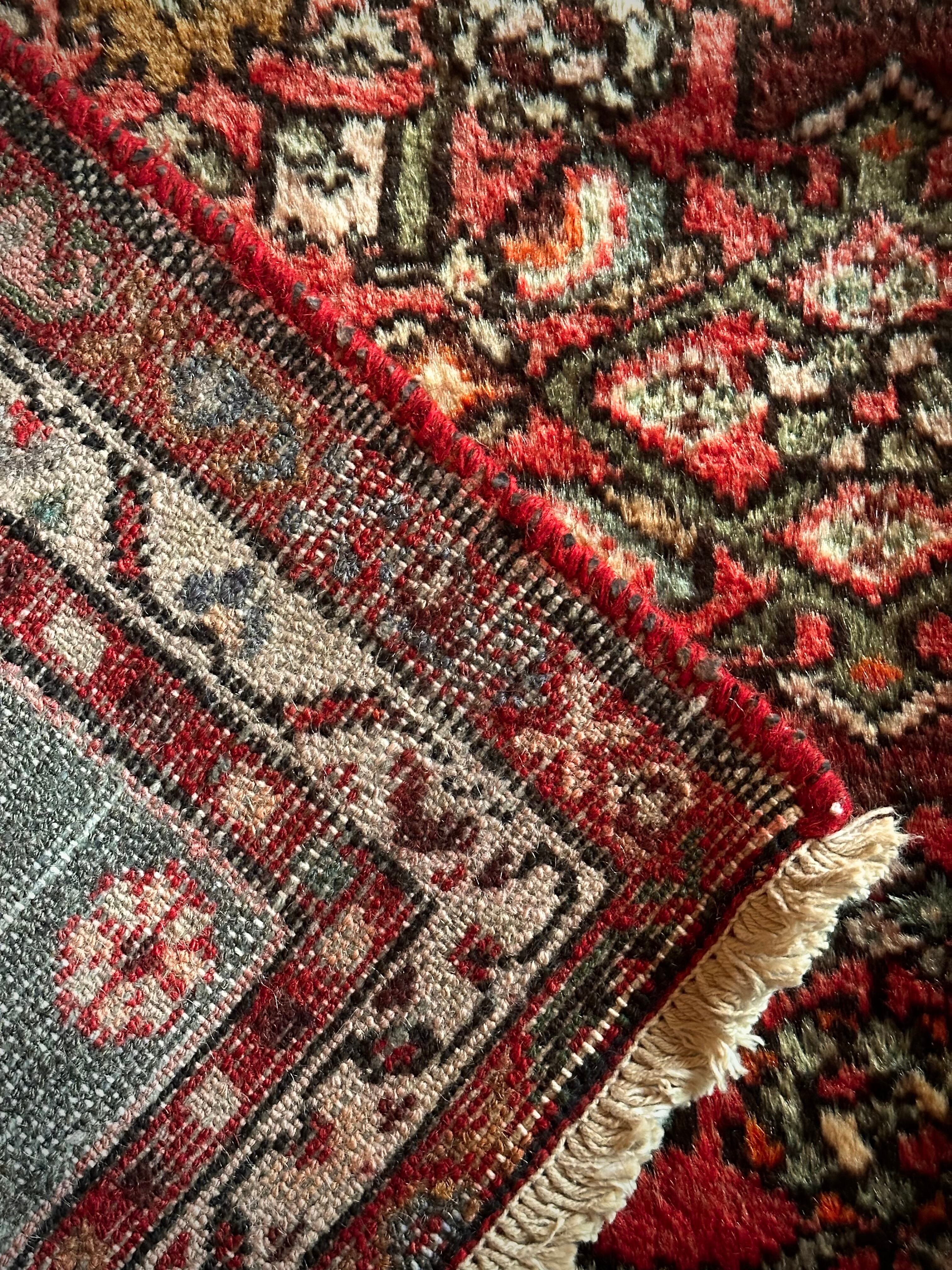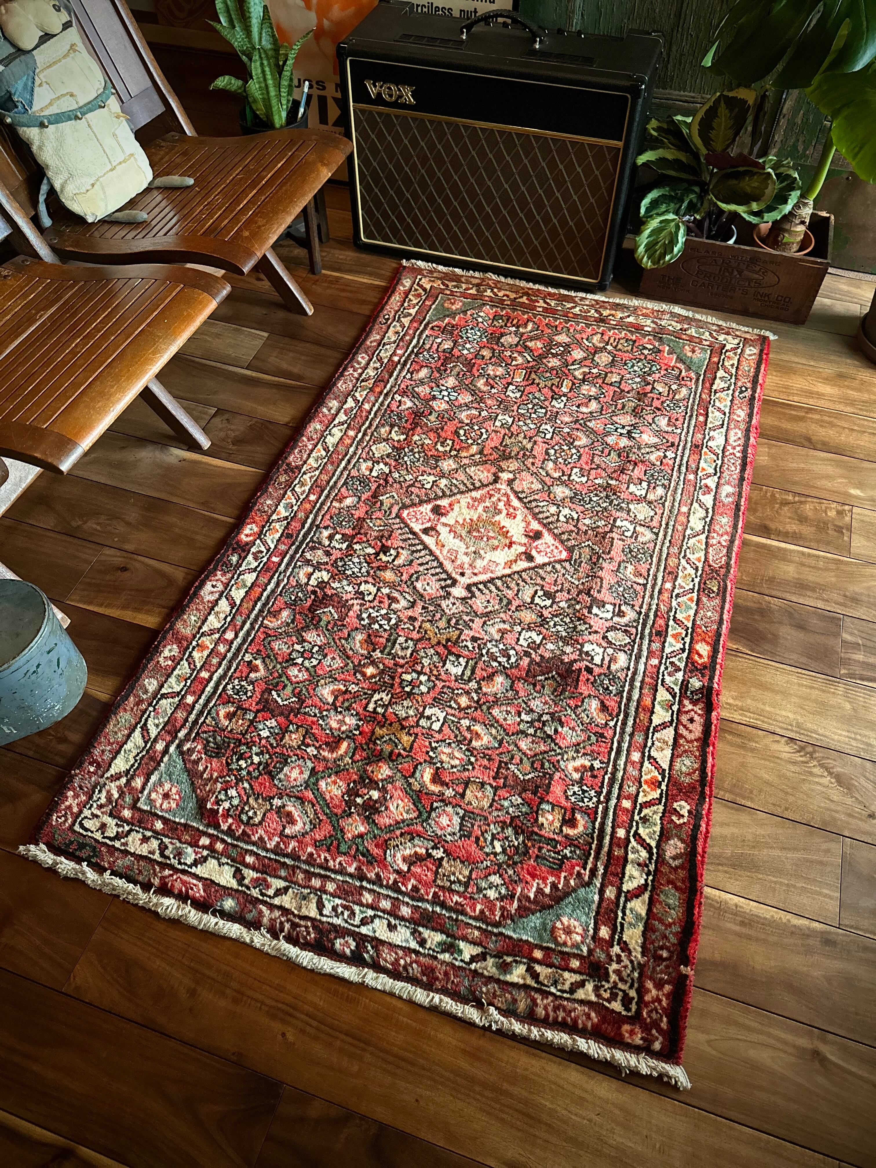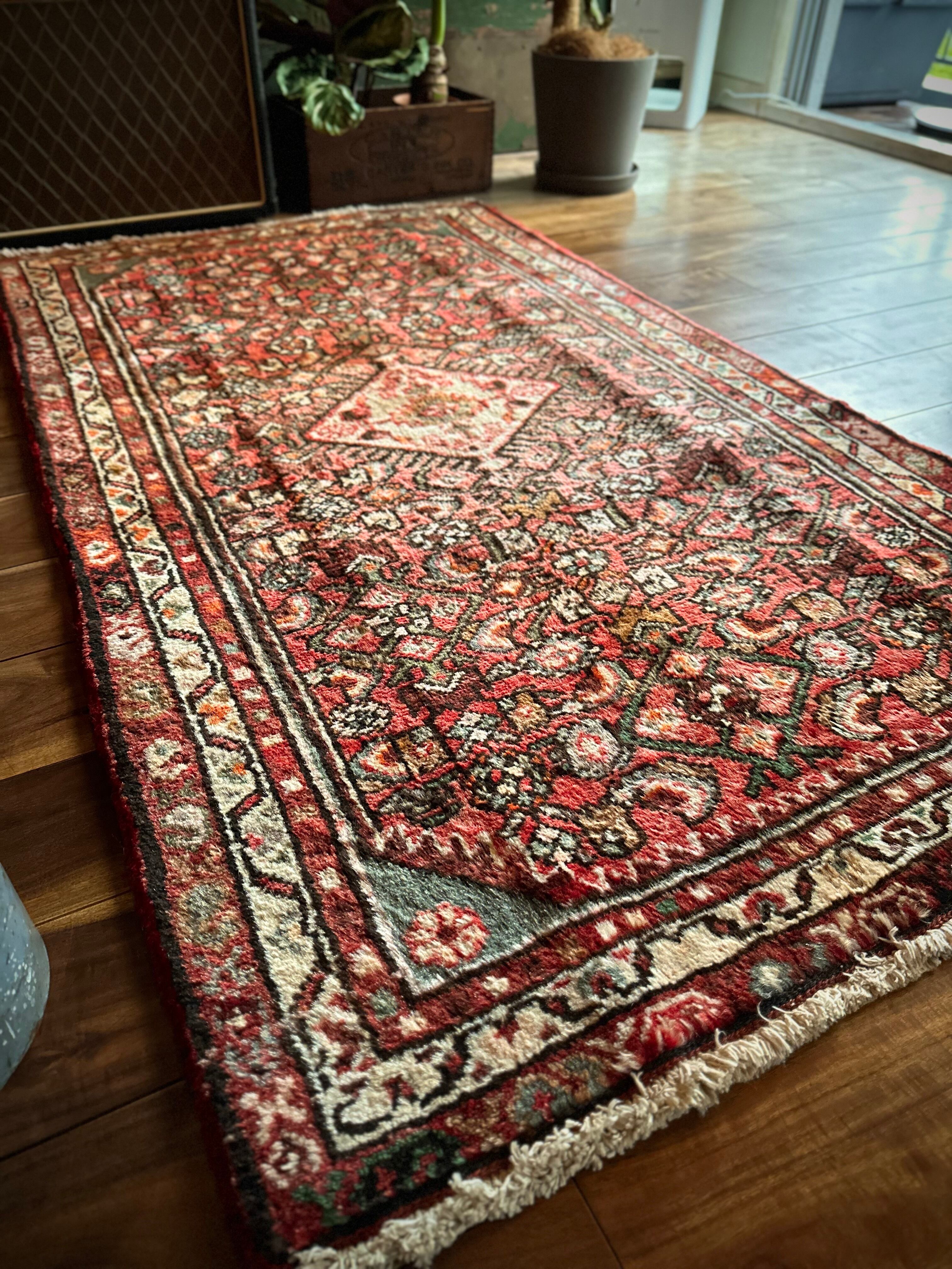ガシっとしたハマダン産らしいシングルウェフトの織りに、所狭しと埋め尽くされた花柄がガーリーでしょうか。コーラルピンクの艶やかなパイルは見て触ってうっとりと、毛足の長さもそこそこにしっとりとした肌触りに男の自分でも癒されてしまいます。