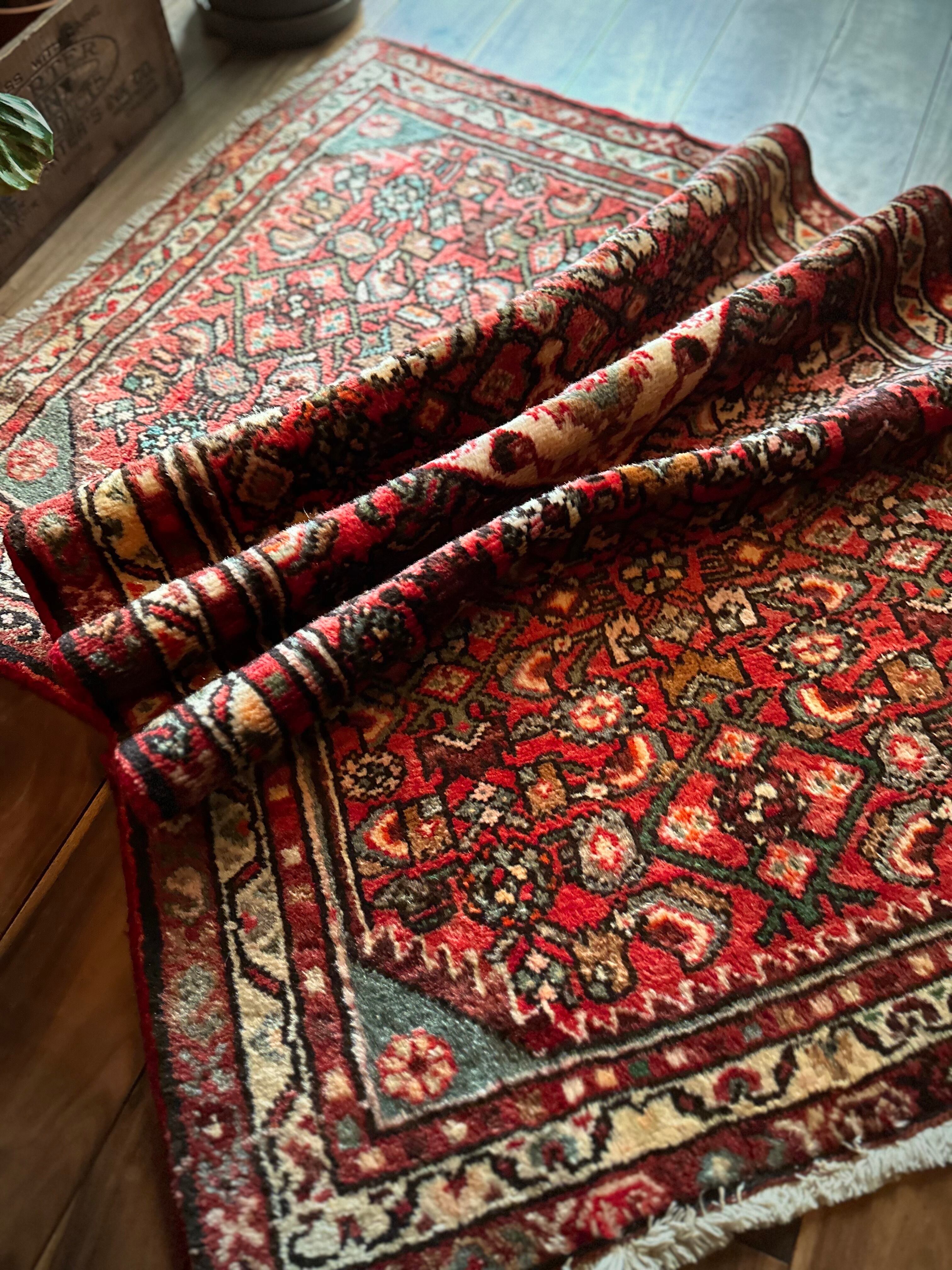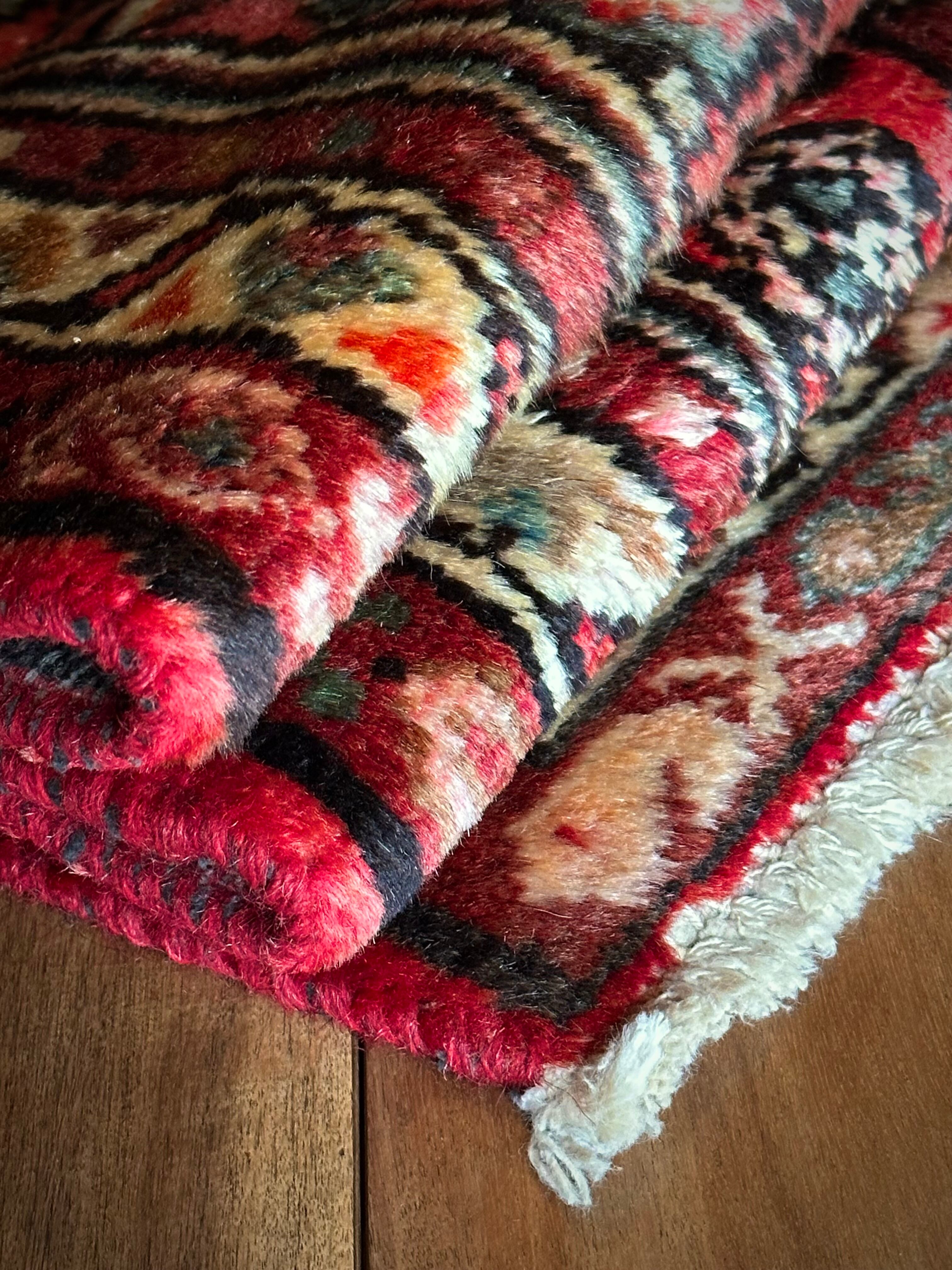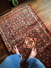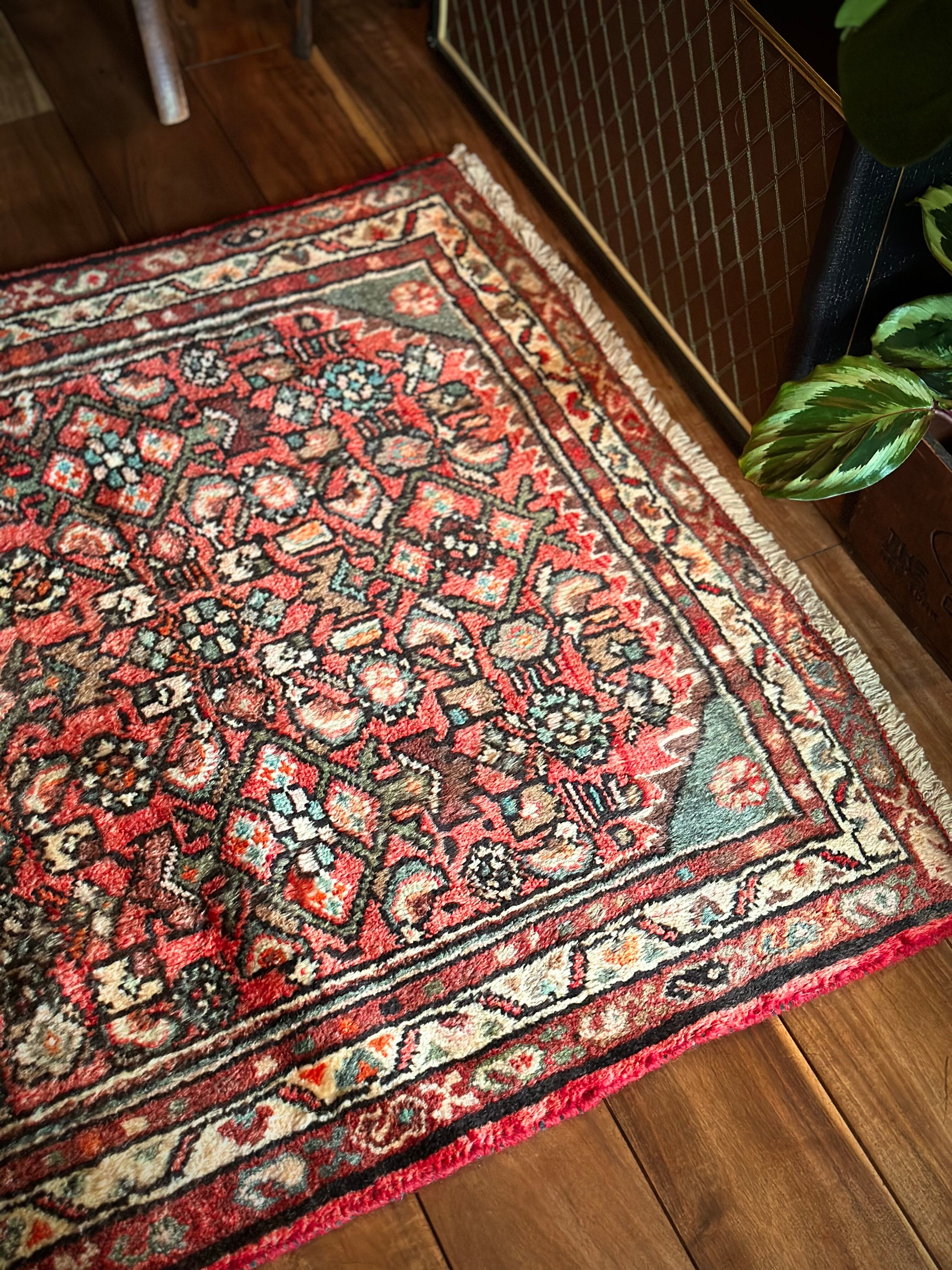 ガシっとしたハマダン産らしいシングルウェフトの織りに、所狭しと埋め尽くされた花柄がガーリーでしょうか。コーラルピンクの艶やかなパイルは見て触ってうっとりと、毛足の長さもそこそこにしっとりとした肌触りに男の自分でも癒されてしまいます。