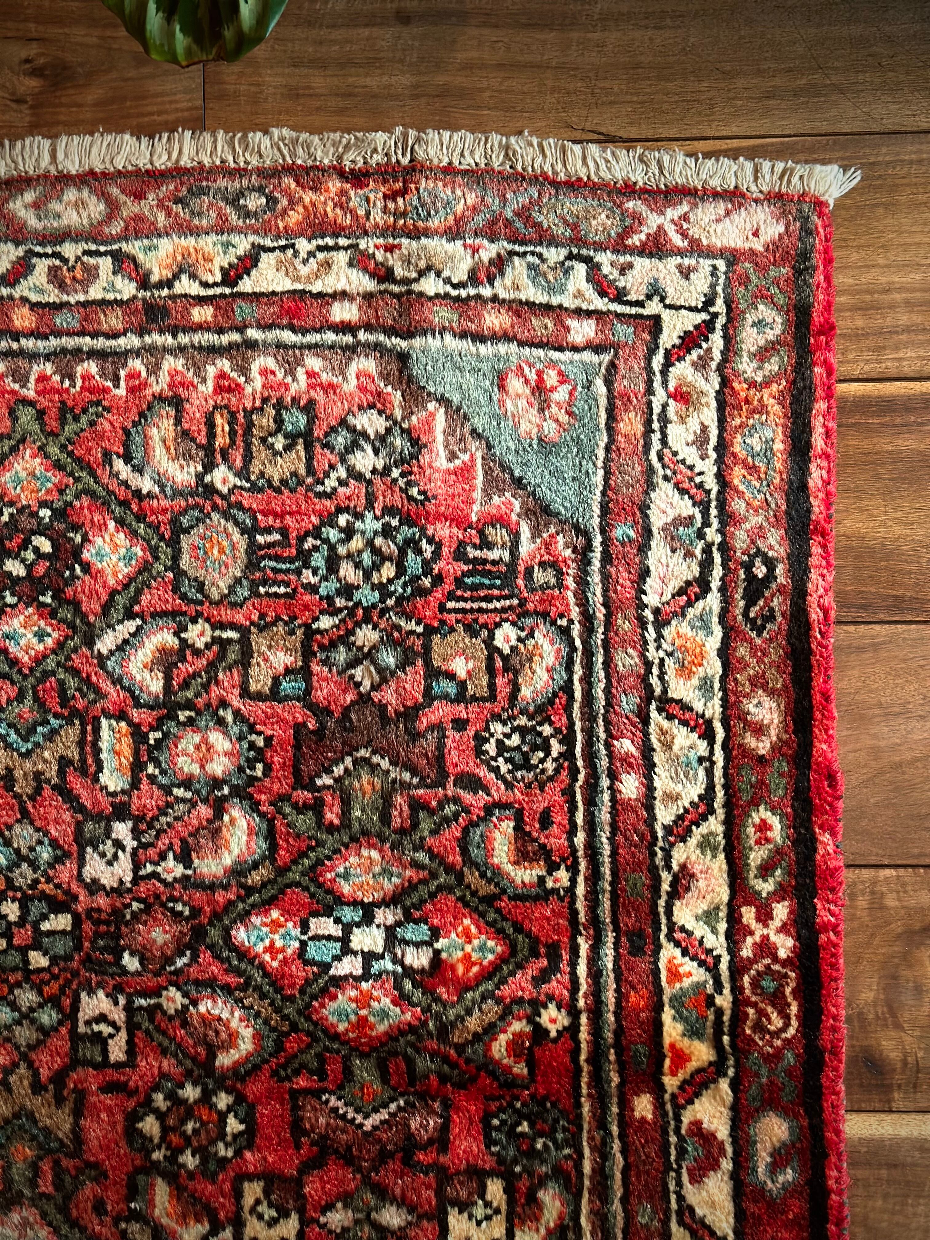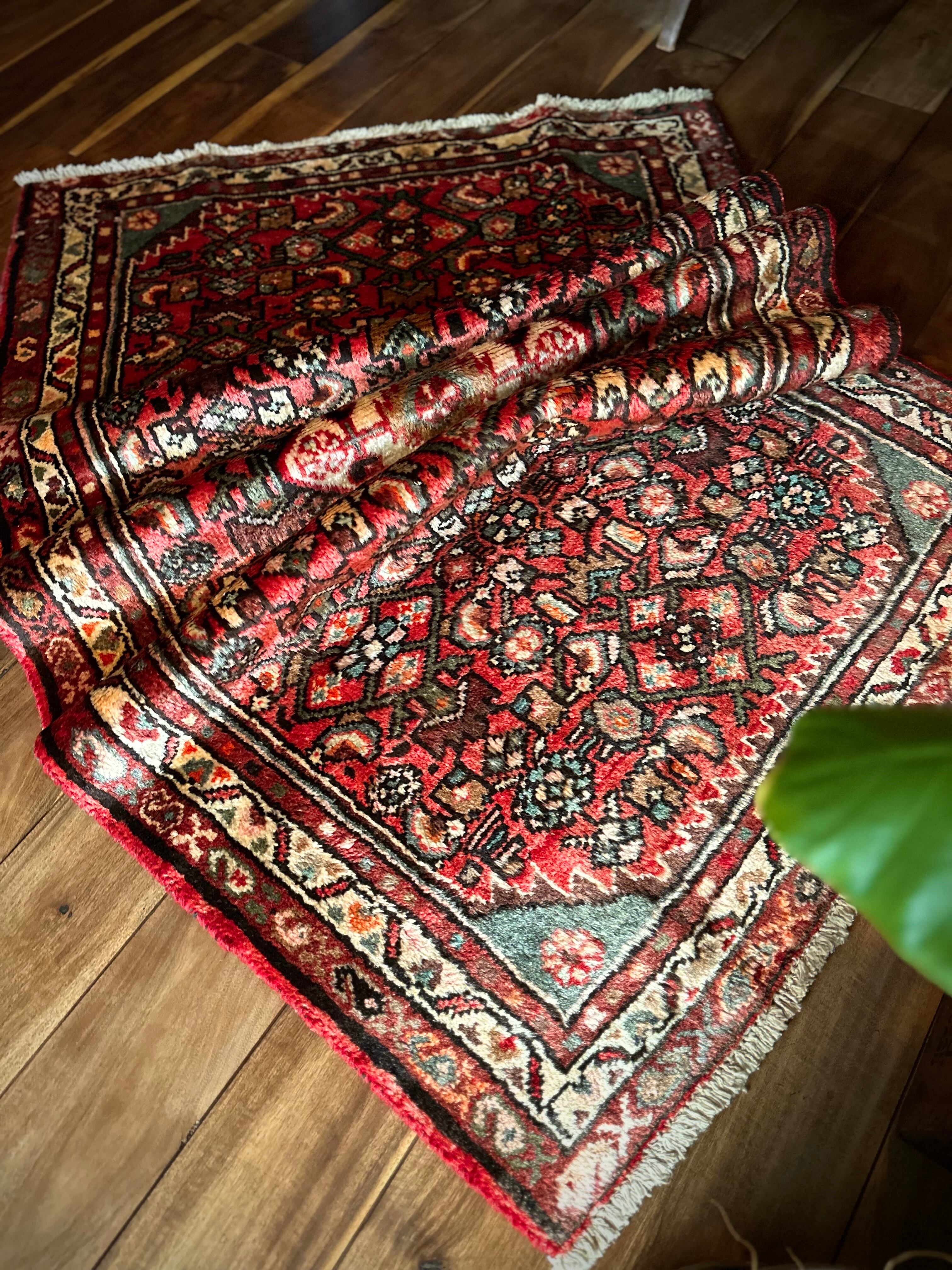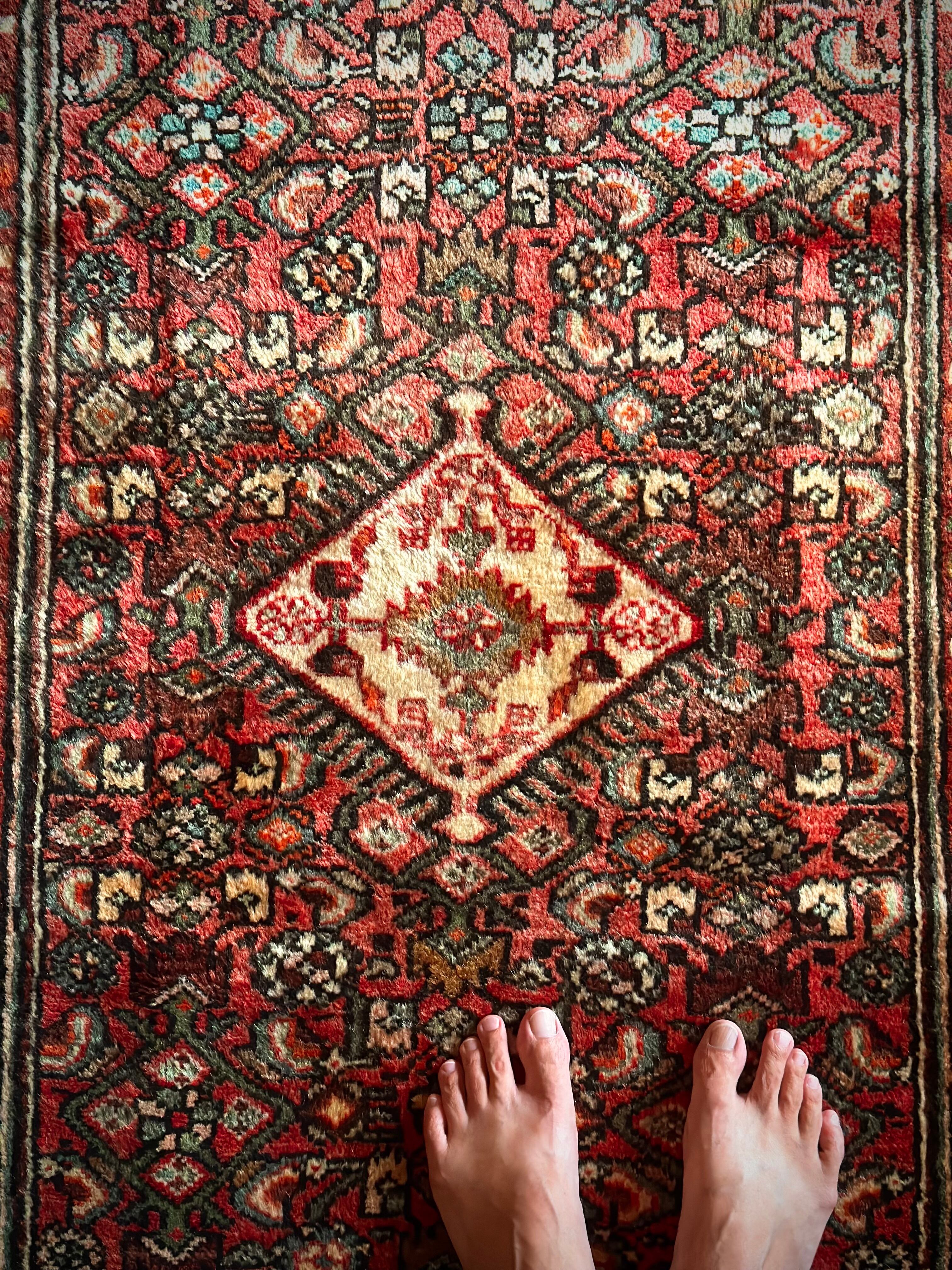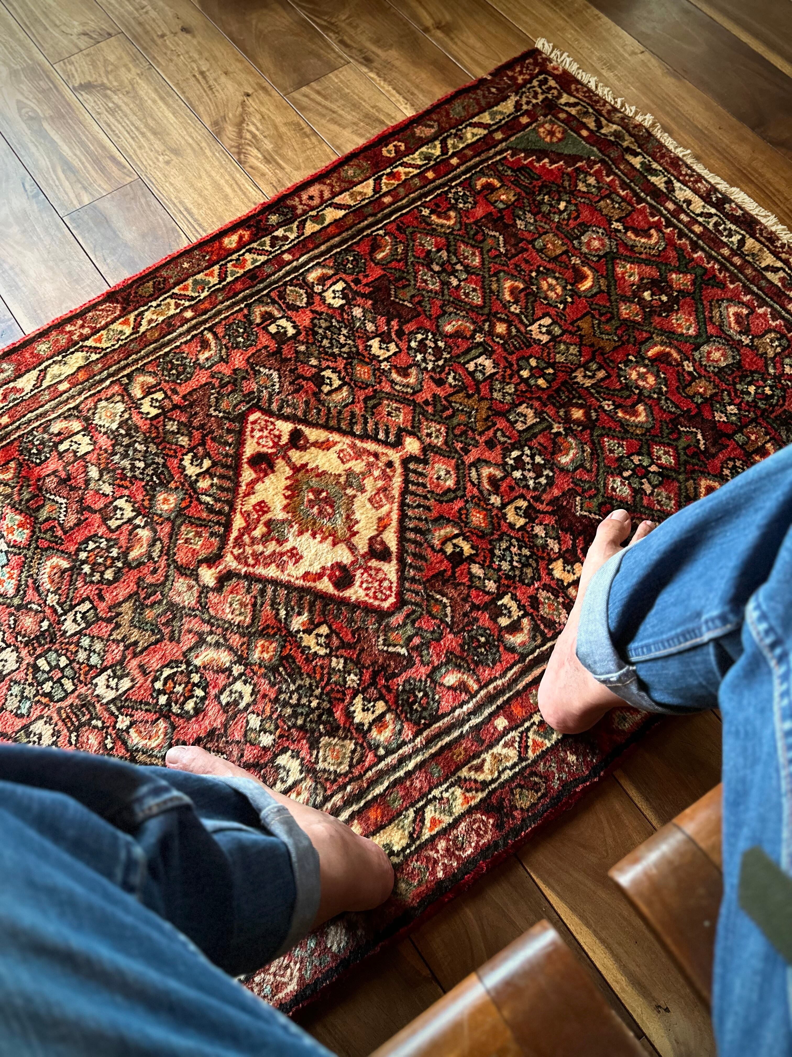 ガシっとしたハマダン産らしいシングルウェフトの織りに、所狭しと埋め尽くされた花柄がガーリーでしょうか。コーラルピンクの艶やかなパイルは見て触ってうっとりと、毛足の長さもそこそこにしっとりとした肌触りに男の自分でも癒されてしまいます。