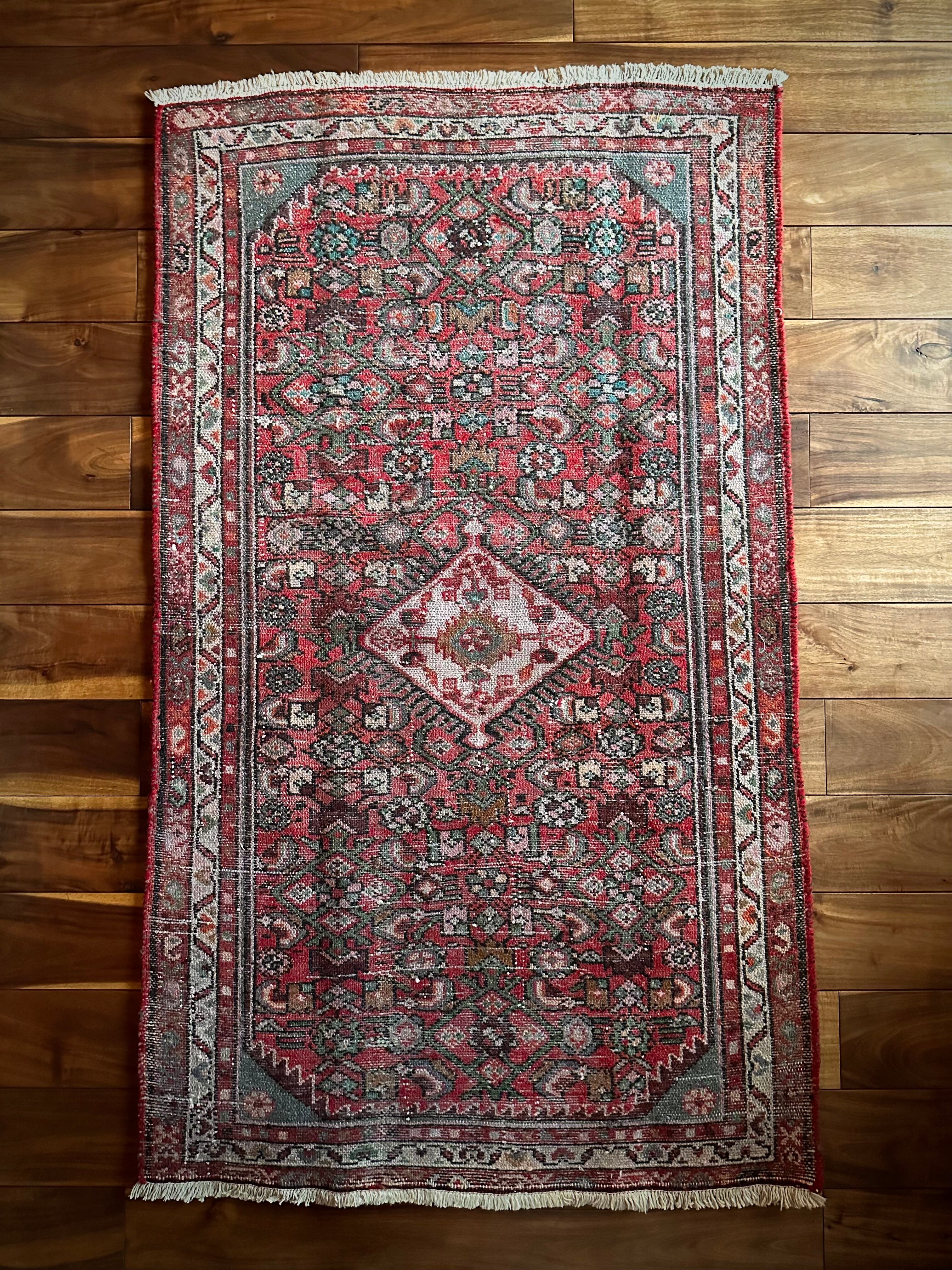 なんとも眩し気なシャイニーピンクに輝くお花畑という印象が乙女心をくすぐる、ペルシャ絨毯の集積地であるハマダン近郊で手織りされたミディアムサイズのヴィレッジラグになります。