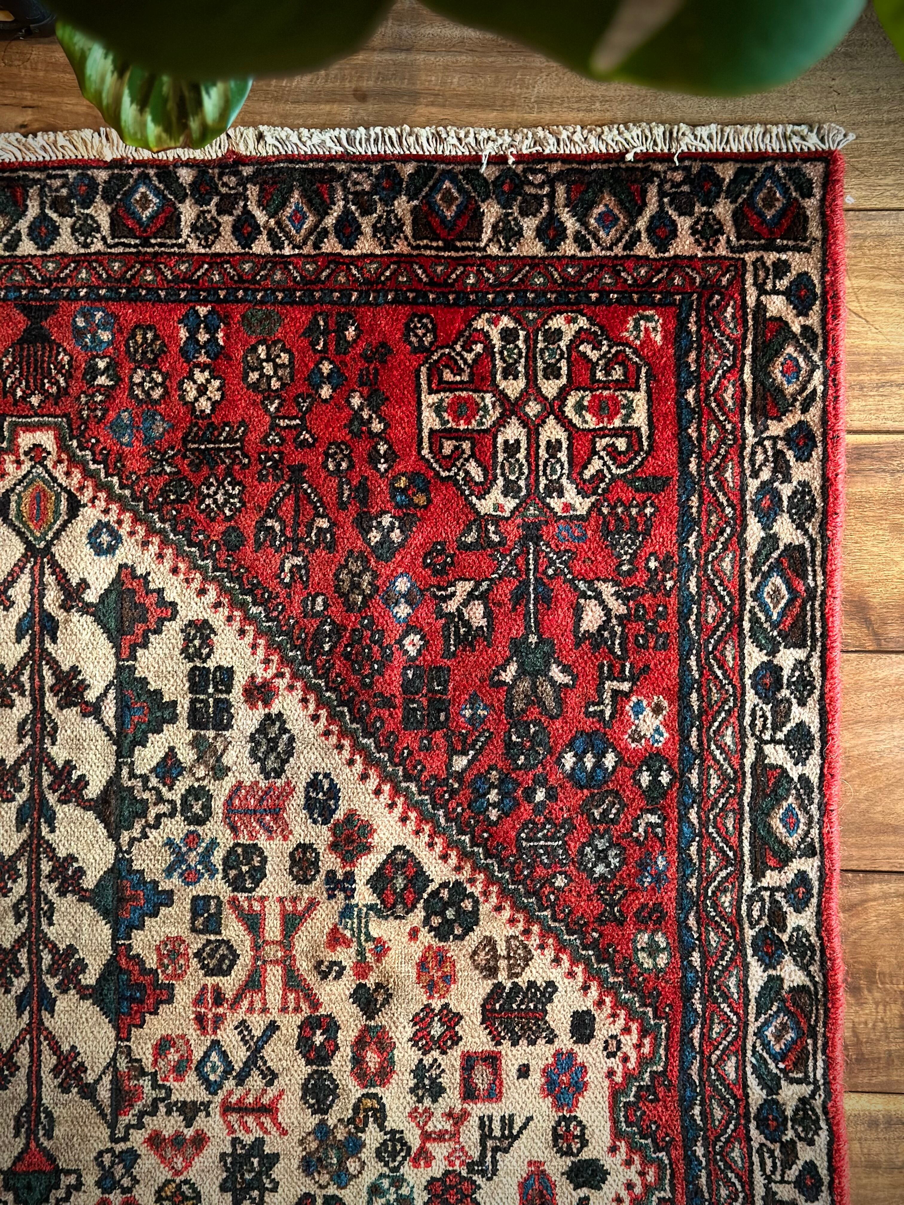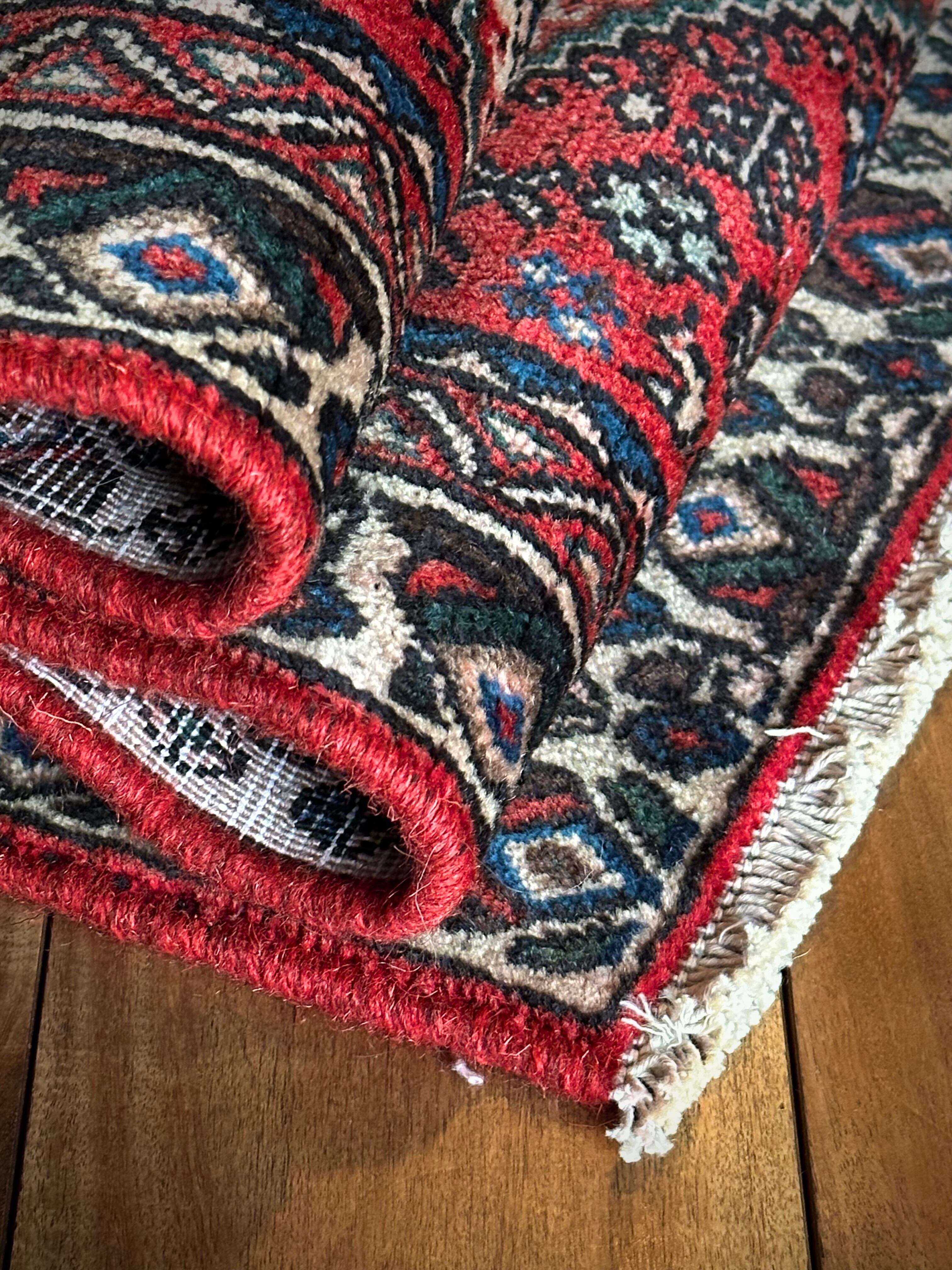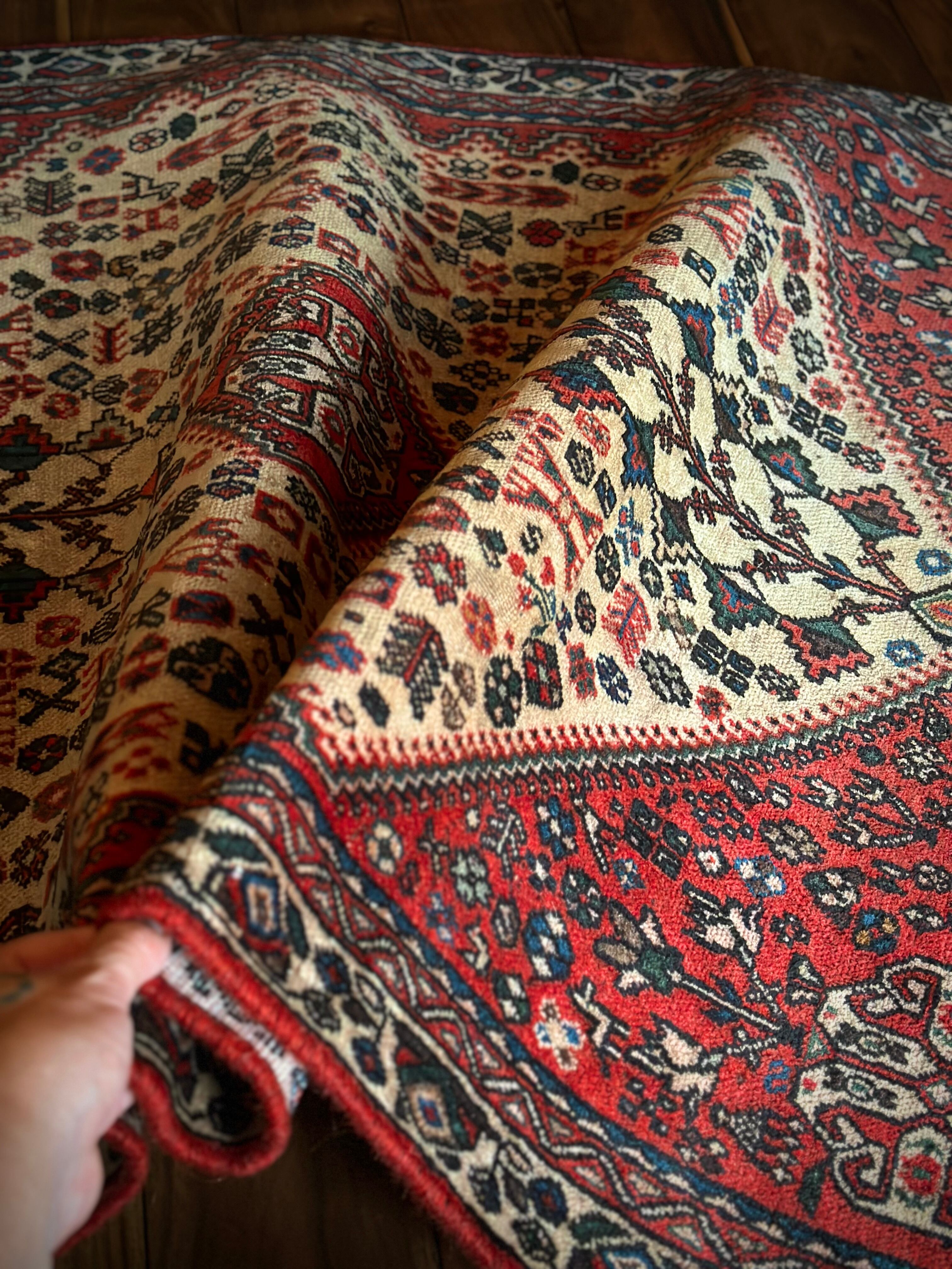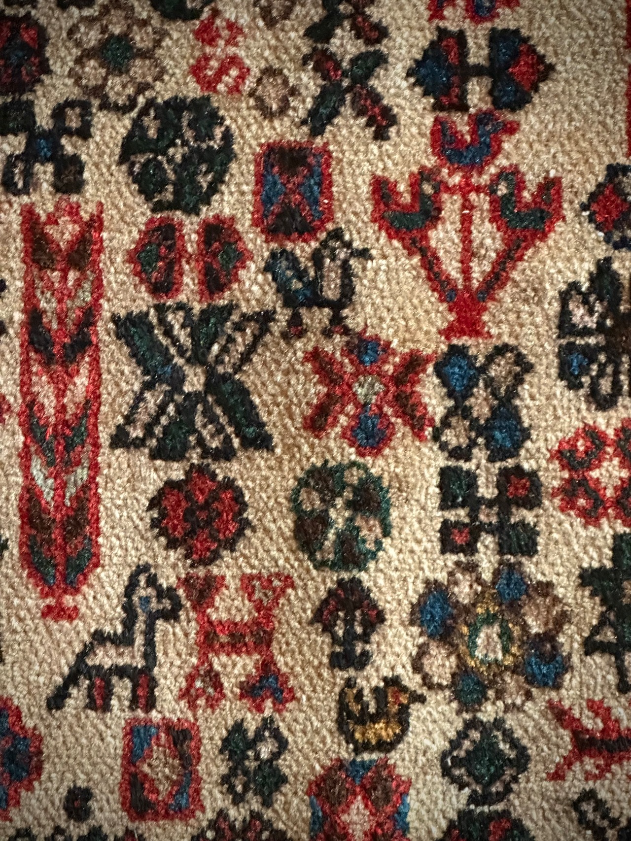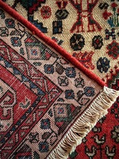 そんな1枚でもあるこちらは鳥や花や木などでびっしりと埋め尽くされたカシュガイっぽいヴィレッジラグで、経糸にコットンを使用した実用的で丈夫な織りが人気でしょうか。色合いもブルー&レッドが主流ななか、シンプルながらもバランスの取れたデザインが良いです。
