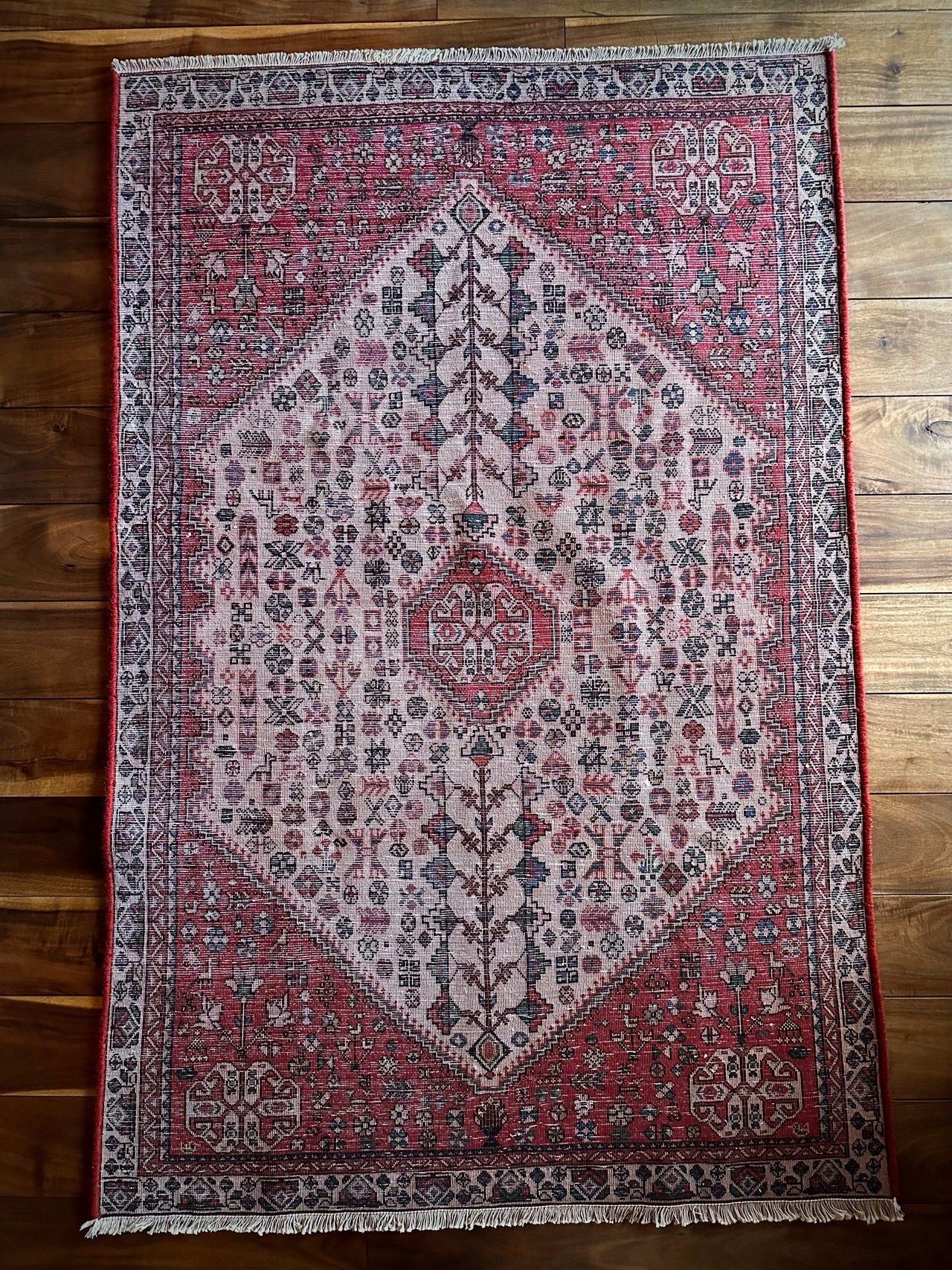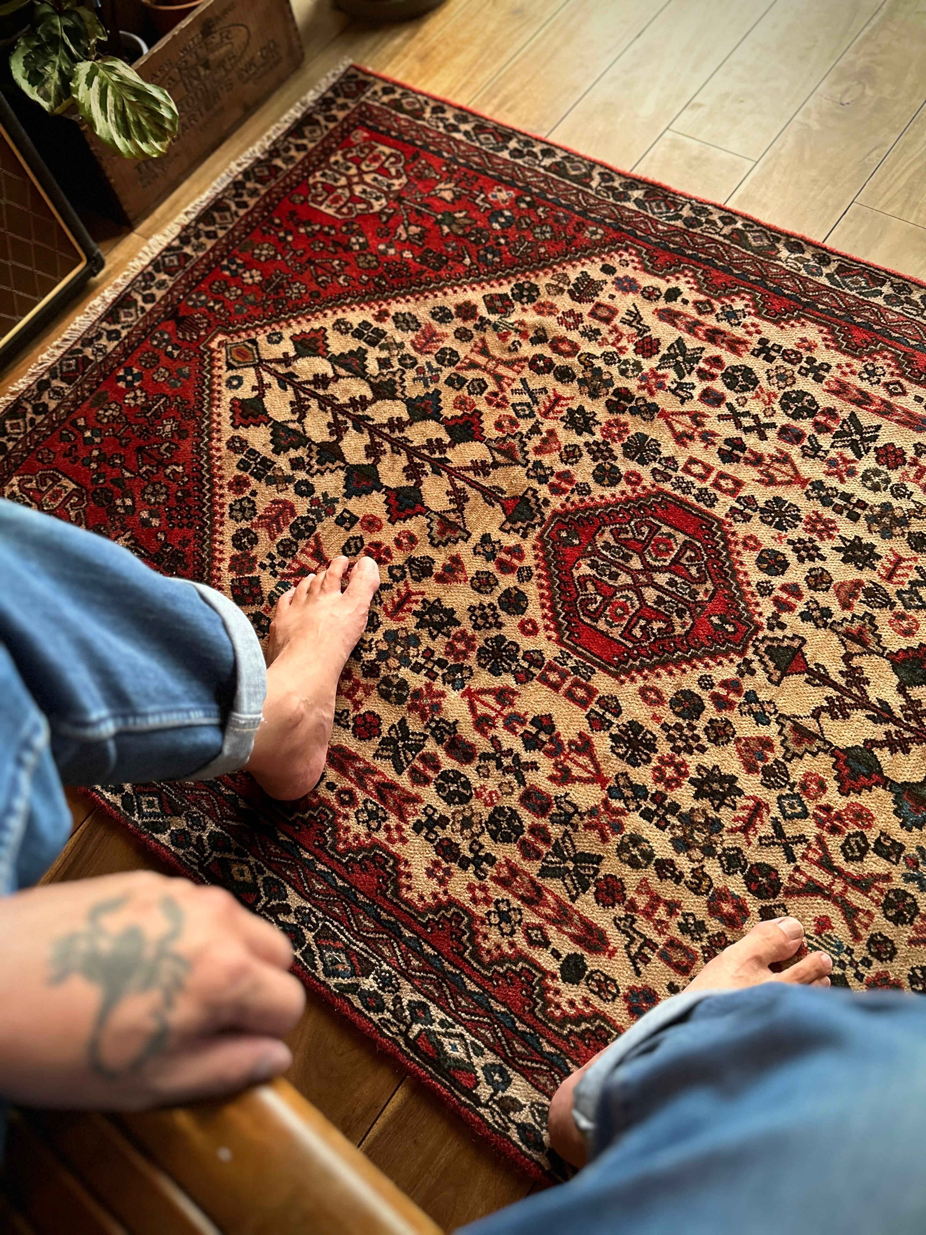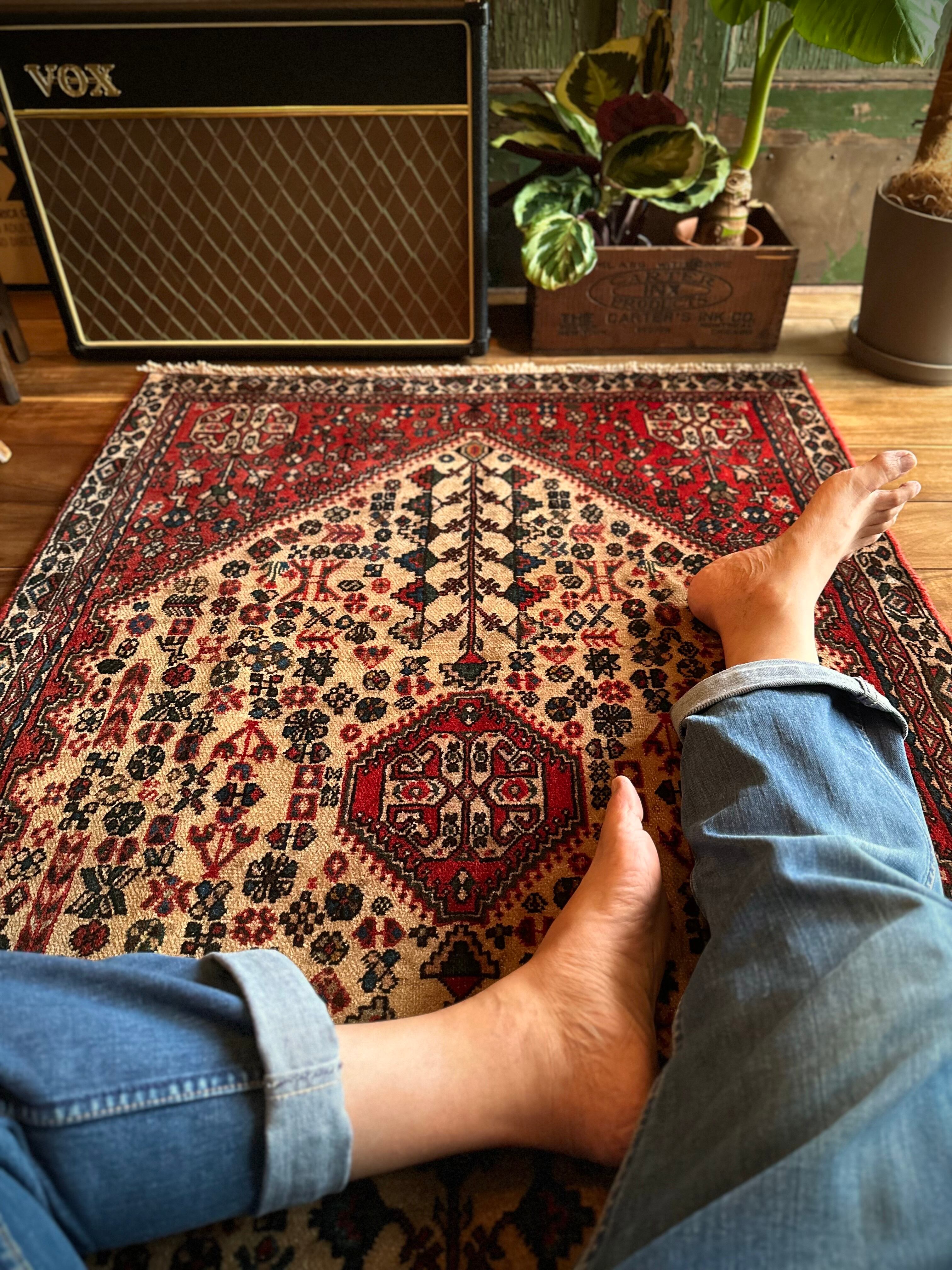 最後にラグそのものに関しては羊毛特有の匂いがあり、採寸は中央付近で計測していますが、手織りならではの歪みによる誤差や水洗いクリーニングによる縮み、また草木染めによる経年劣化の色ムラなどがありますが、それもまたヴィンテージラグの魅力かとご理解ください。