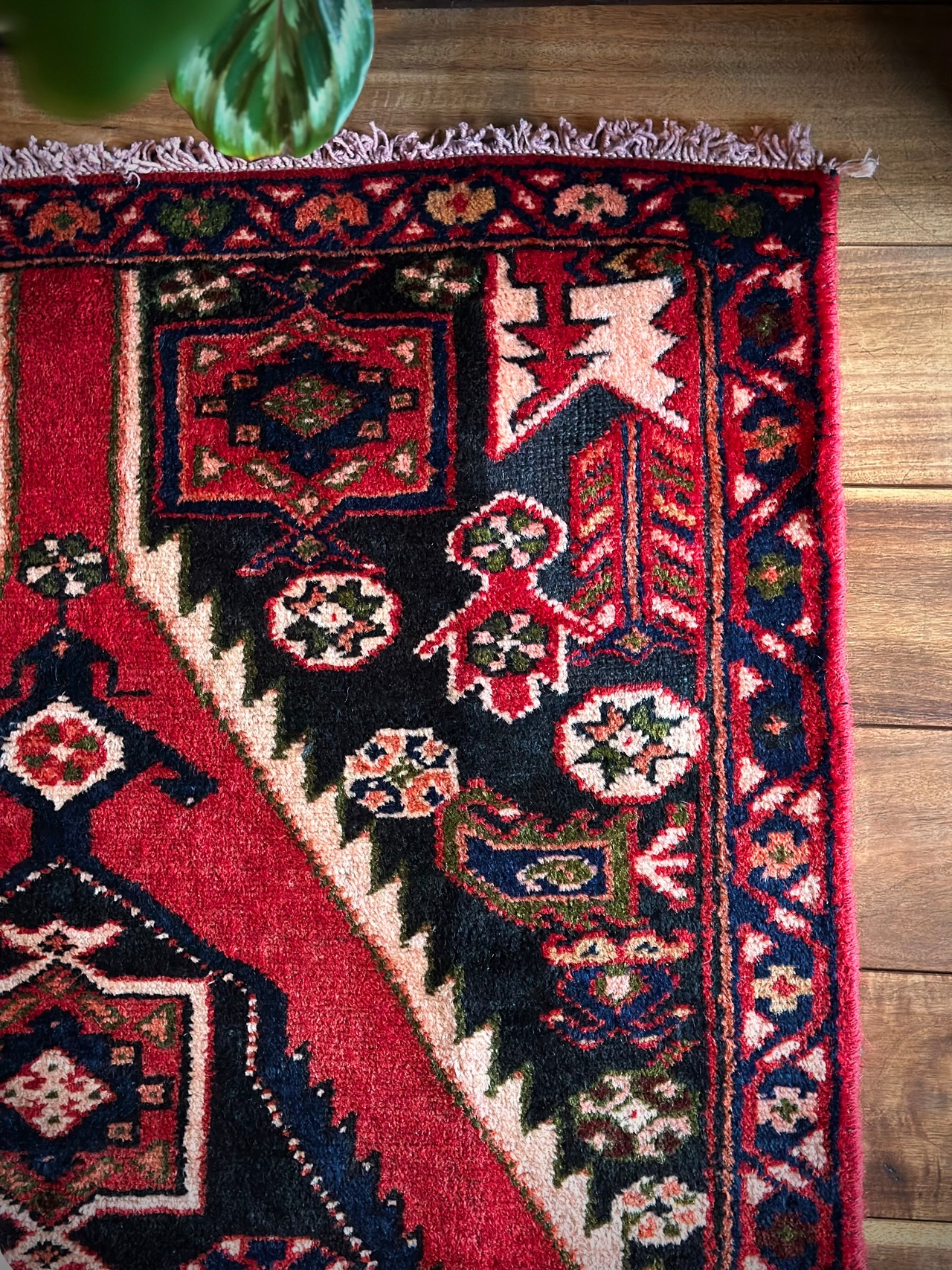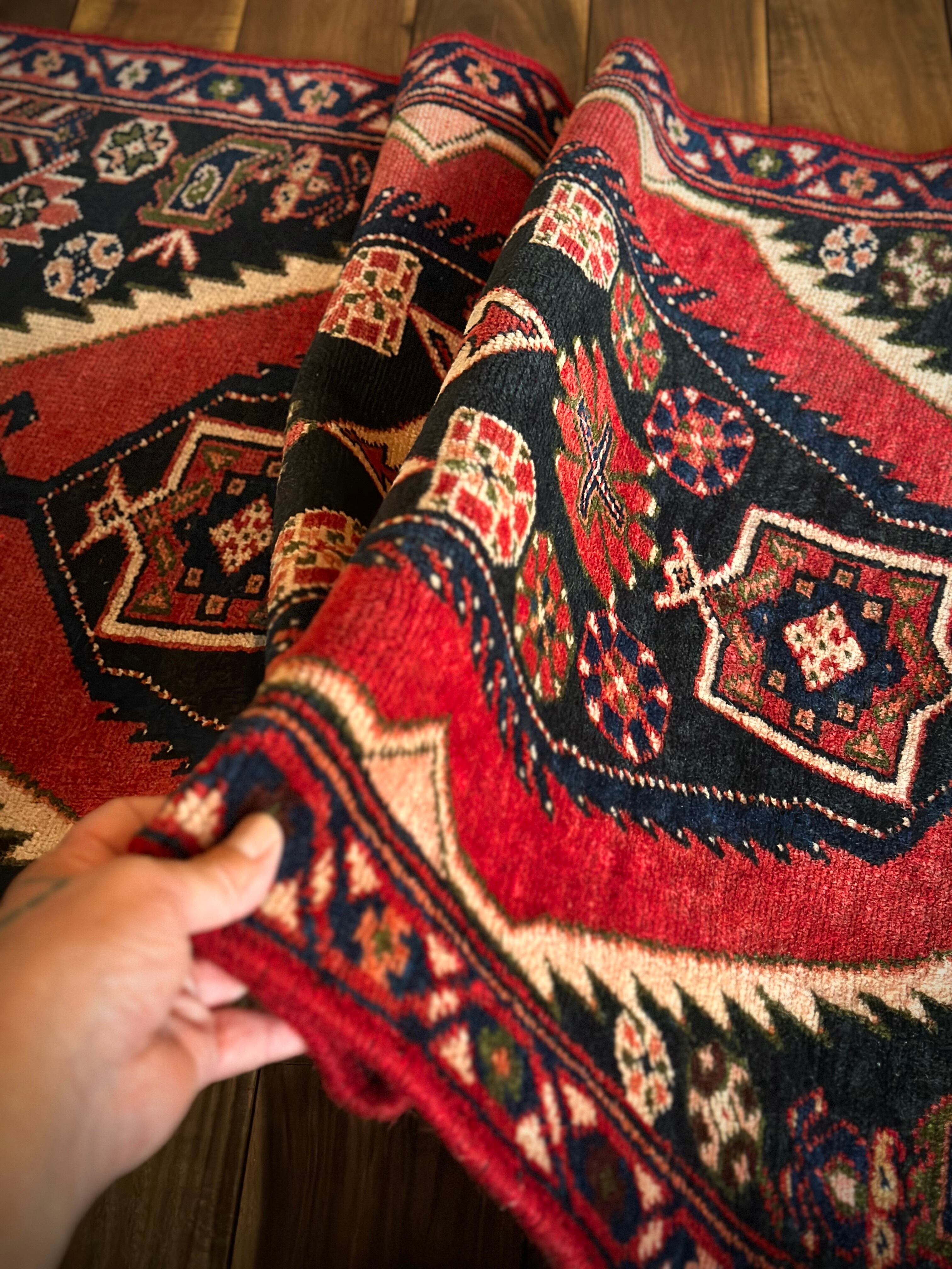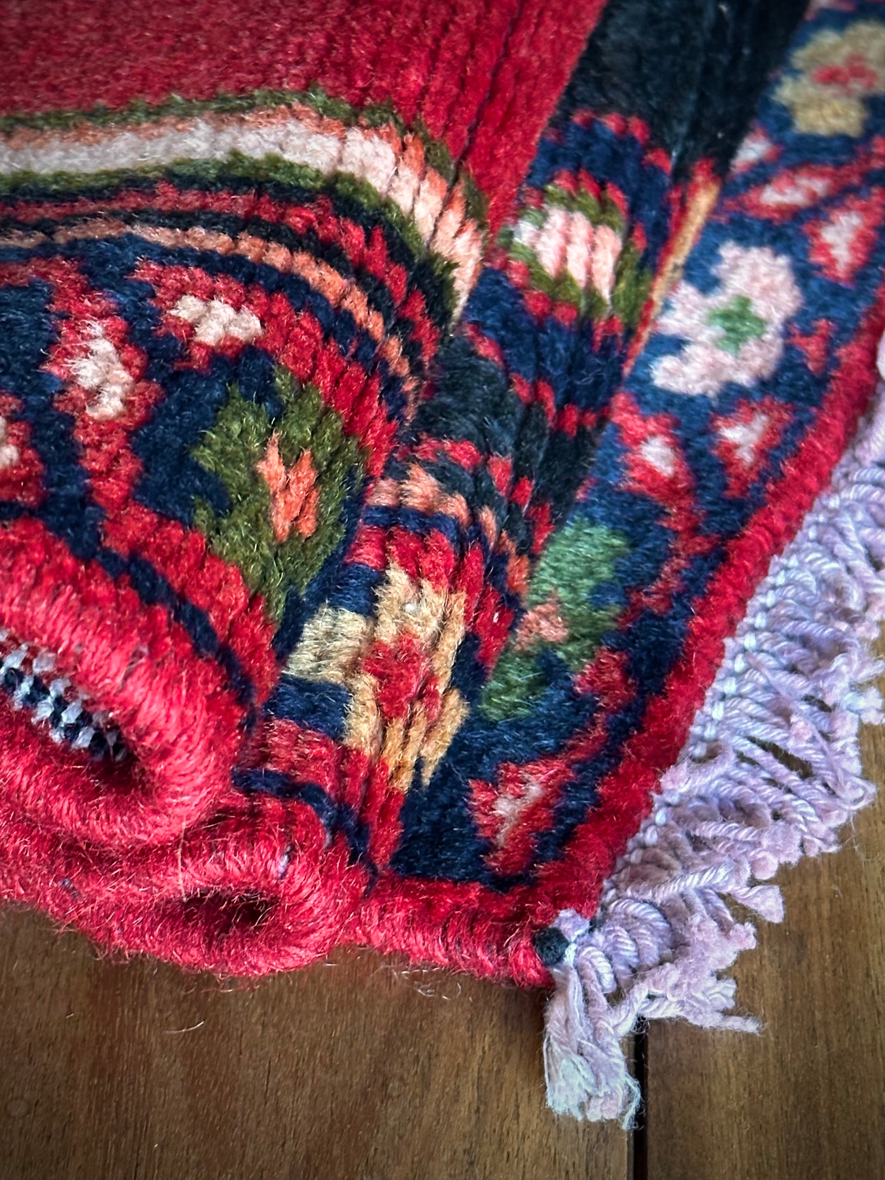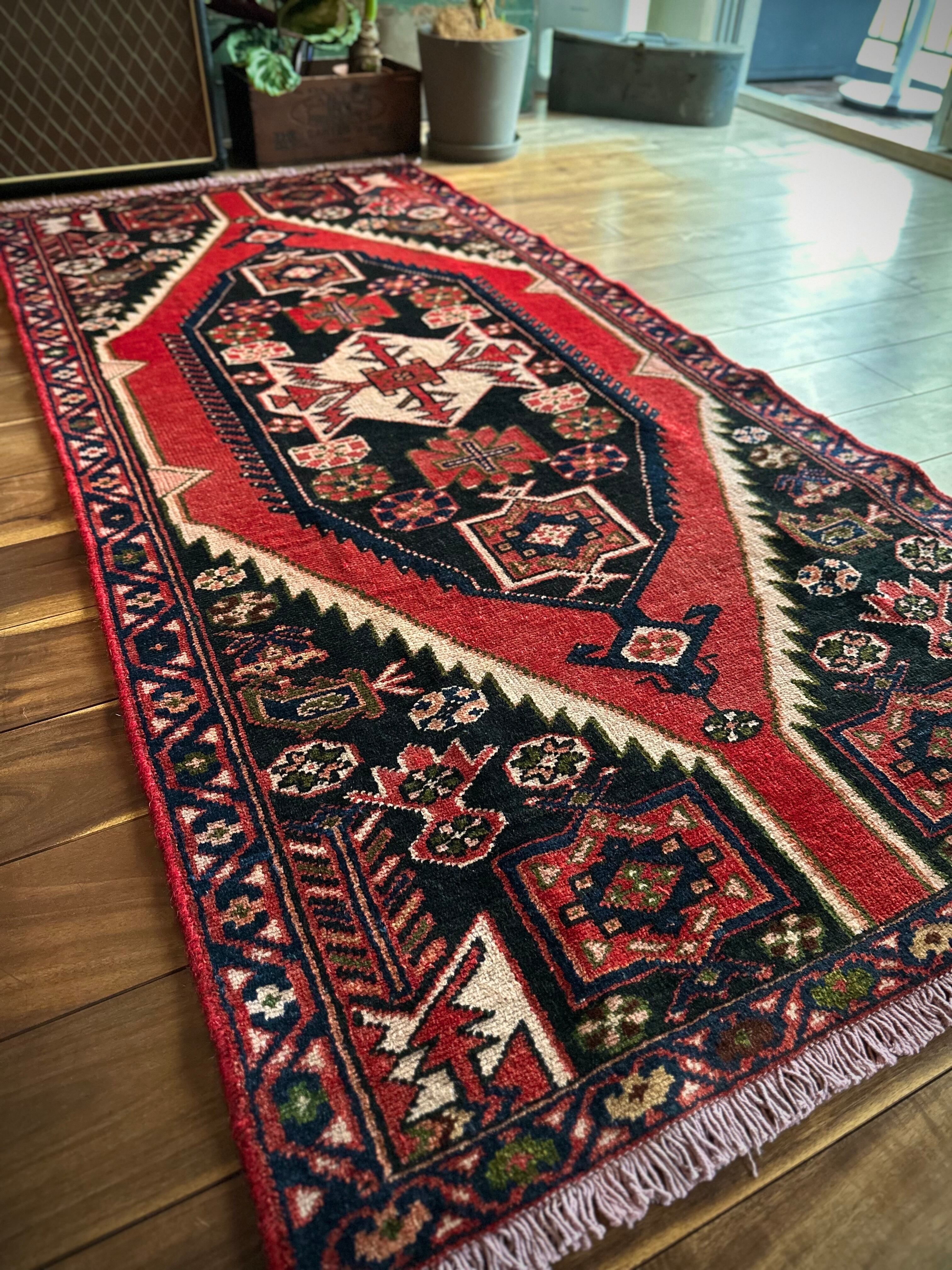 古来よりペルシャ絨毯の集積地として栄えたハマダン近郊の村々で手織りされたヴィレッジラグで、濃いめなネイビーと紅色のコントラストが見事なミディアムサイズのアクセントラグになります。