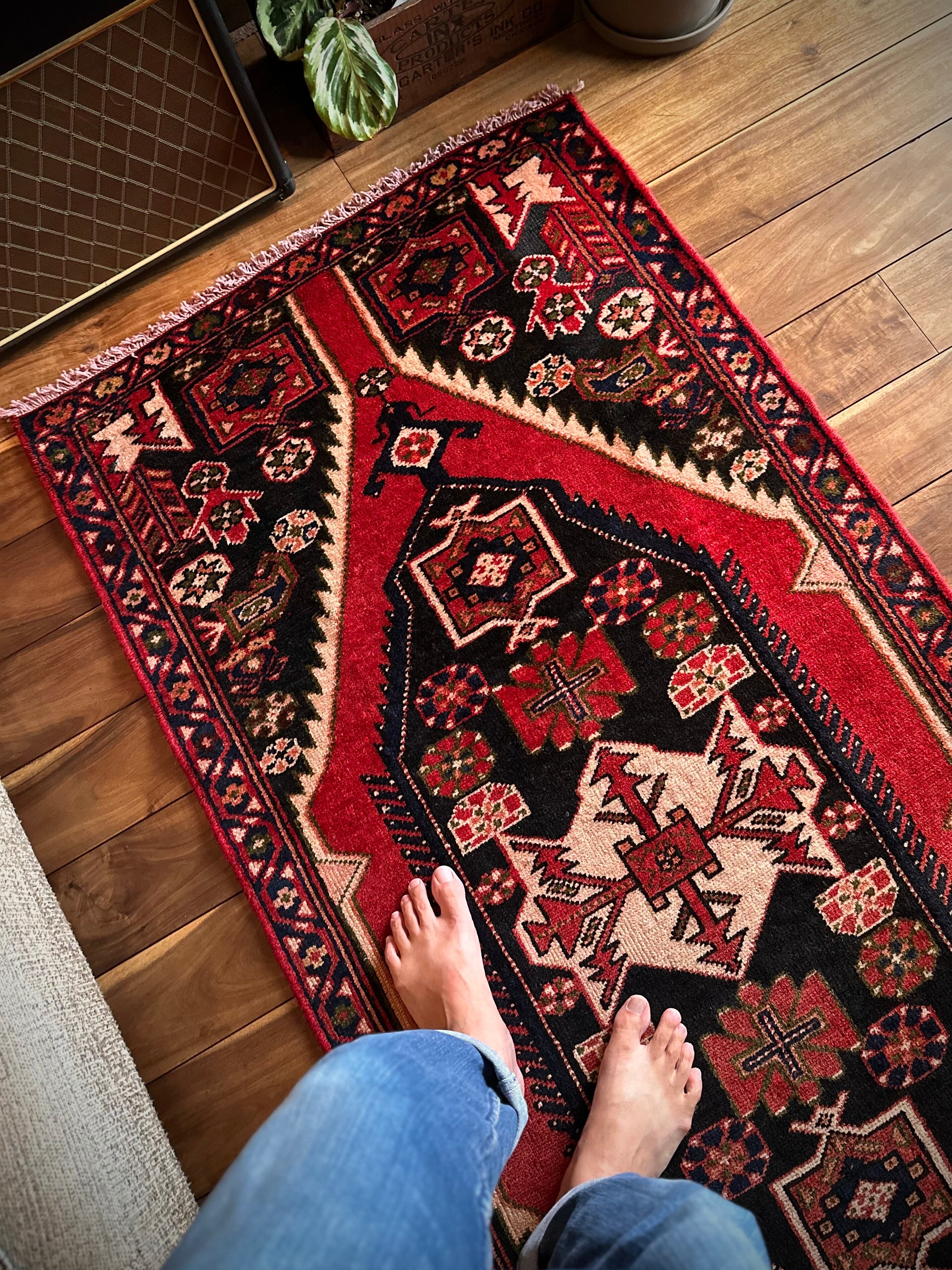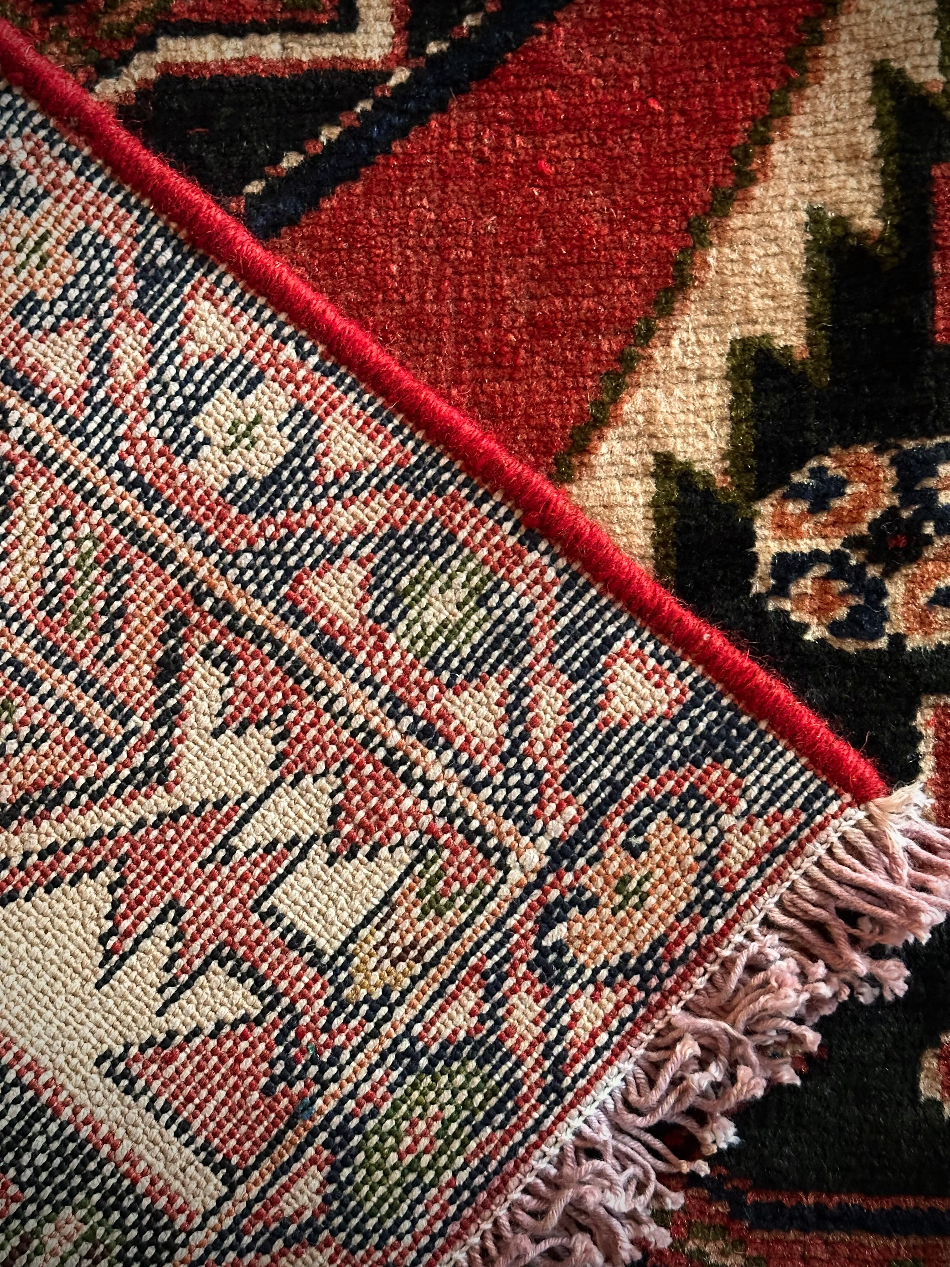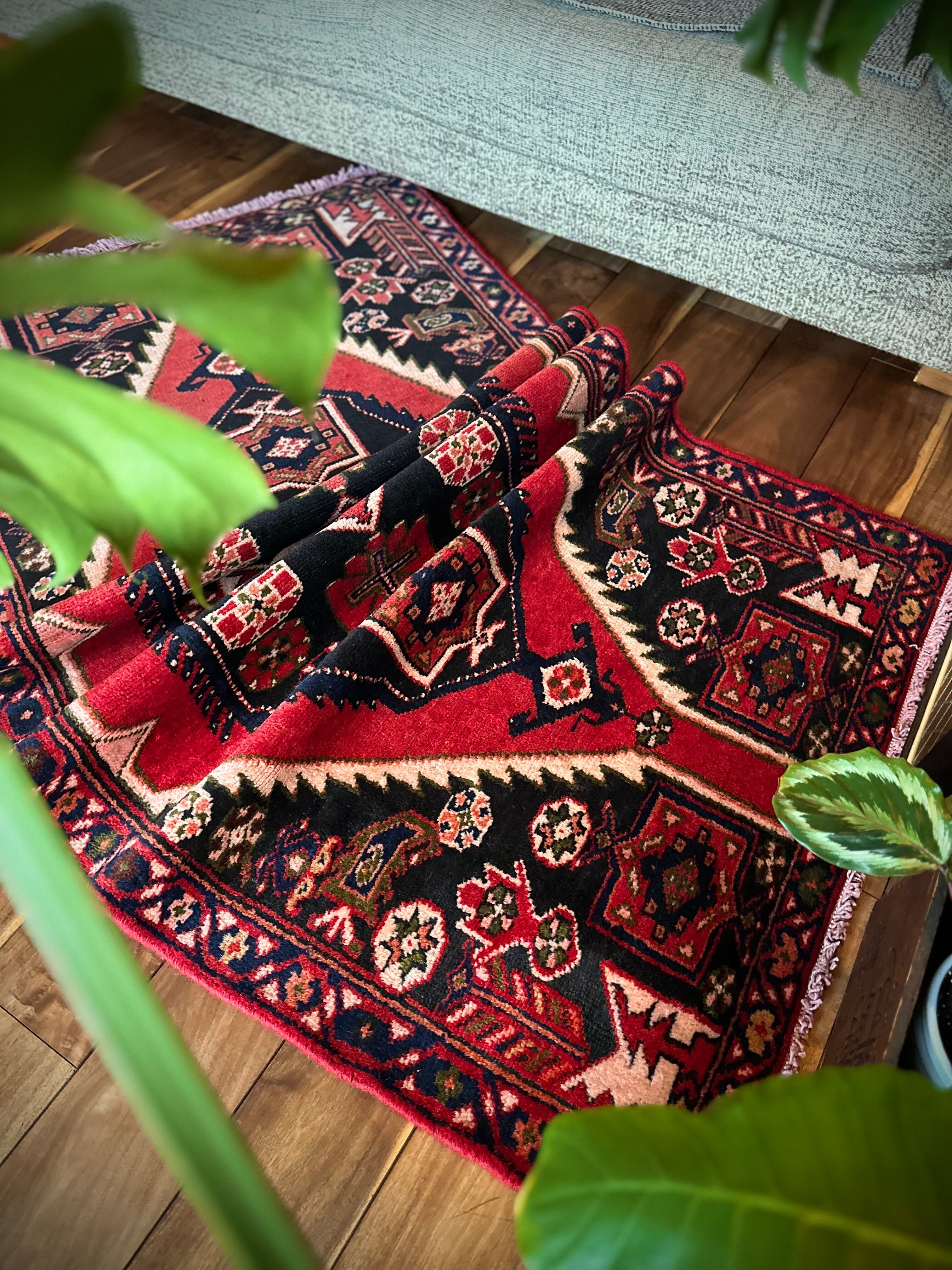 古来よりペルシャ絨毯の集積地として栄えたハマダン近郊の村々で手織りされたヴィレッジラグで、濃いめなネイビーと紅色のコントラストが見事なミディアムサイズのアクセントラグになります。