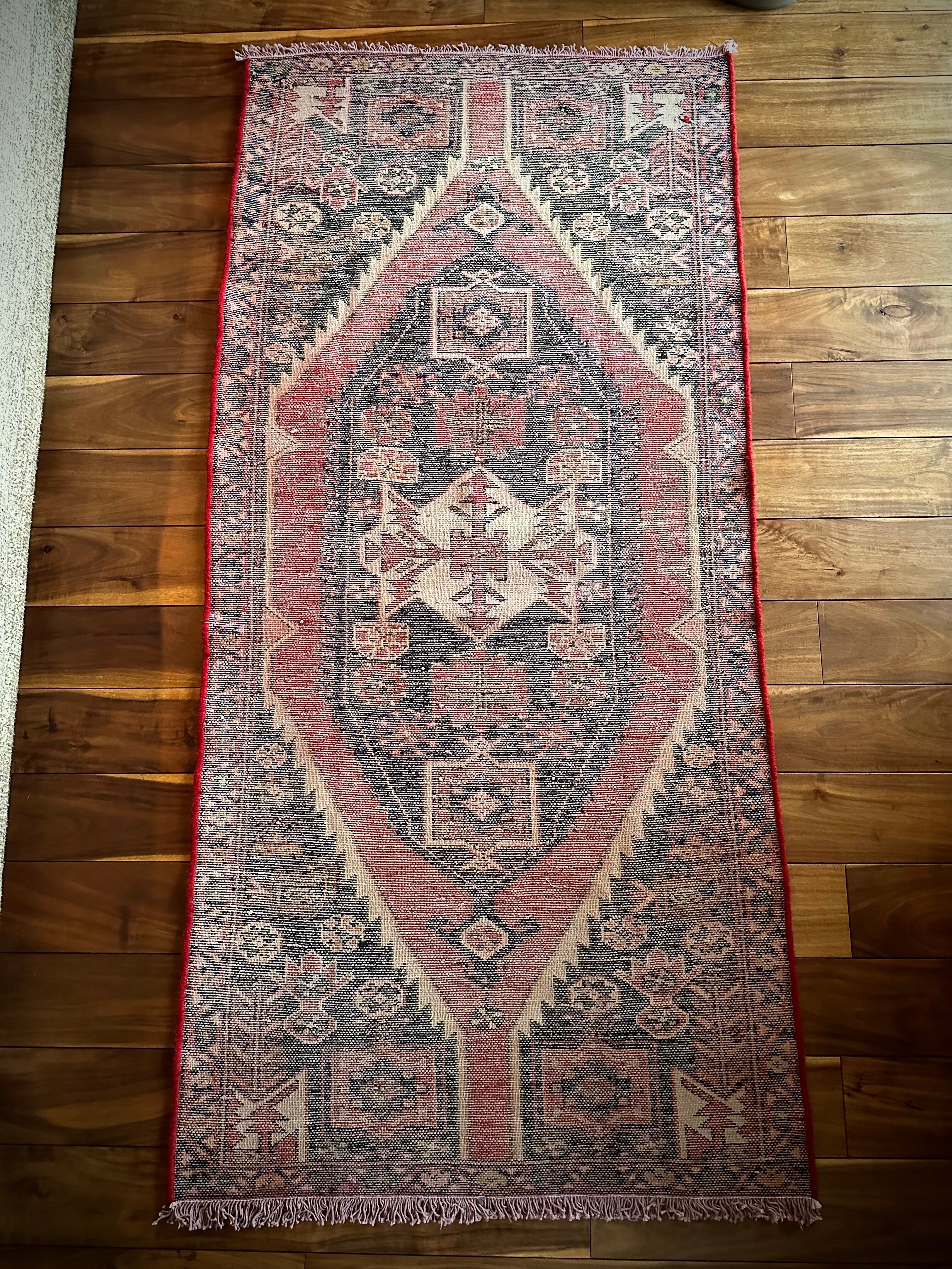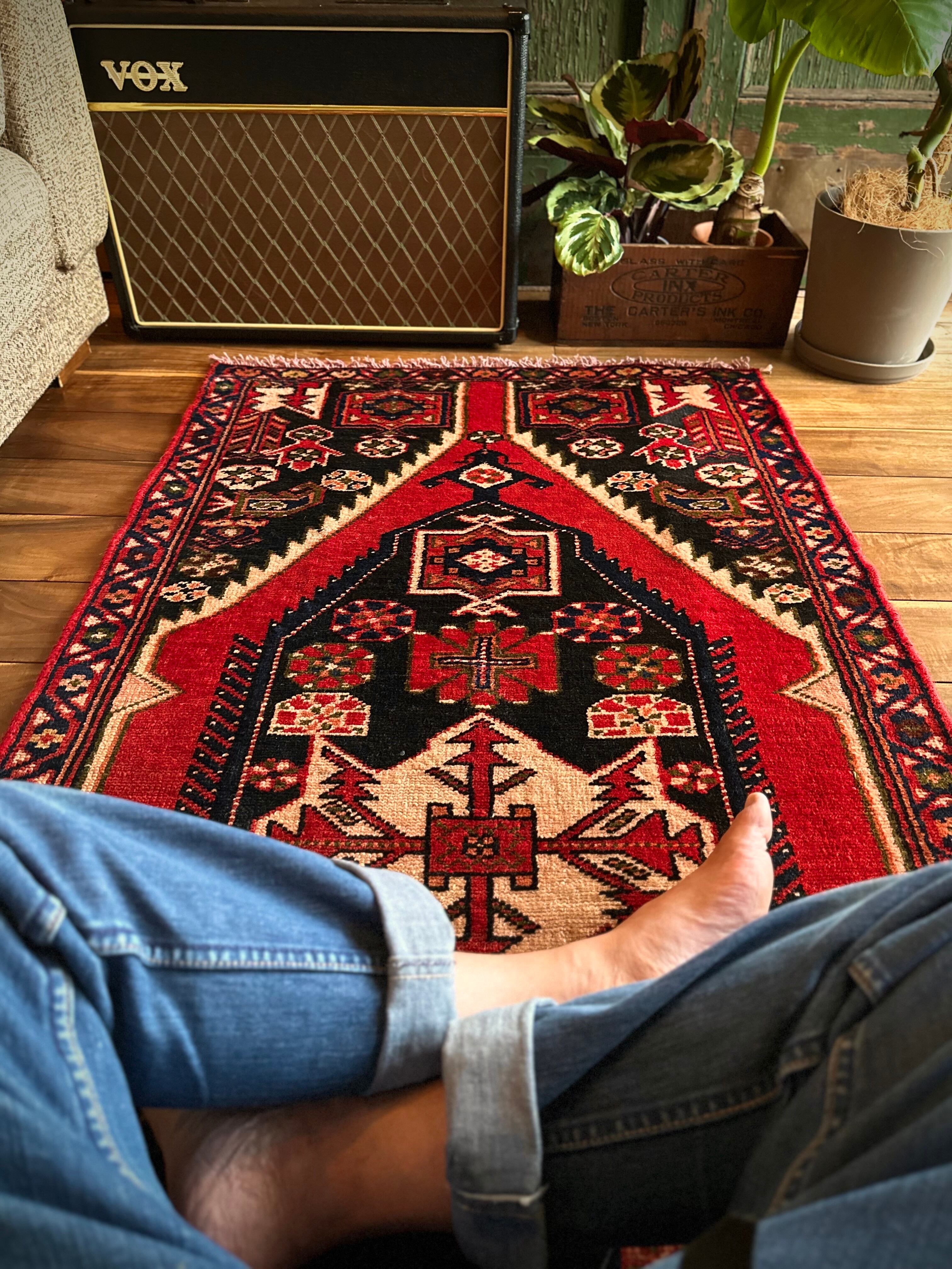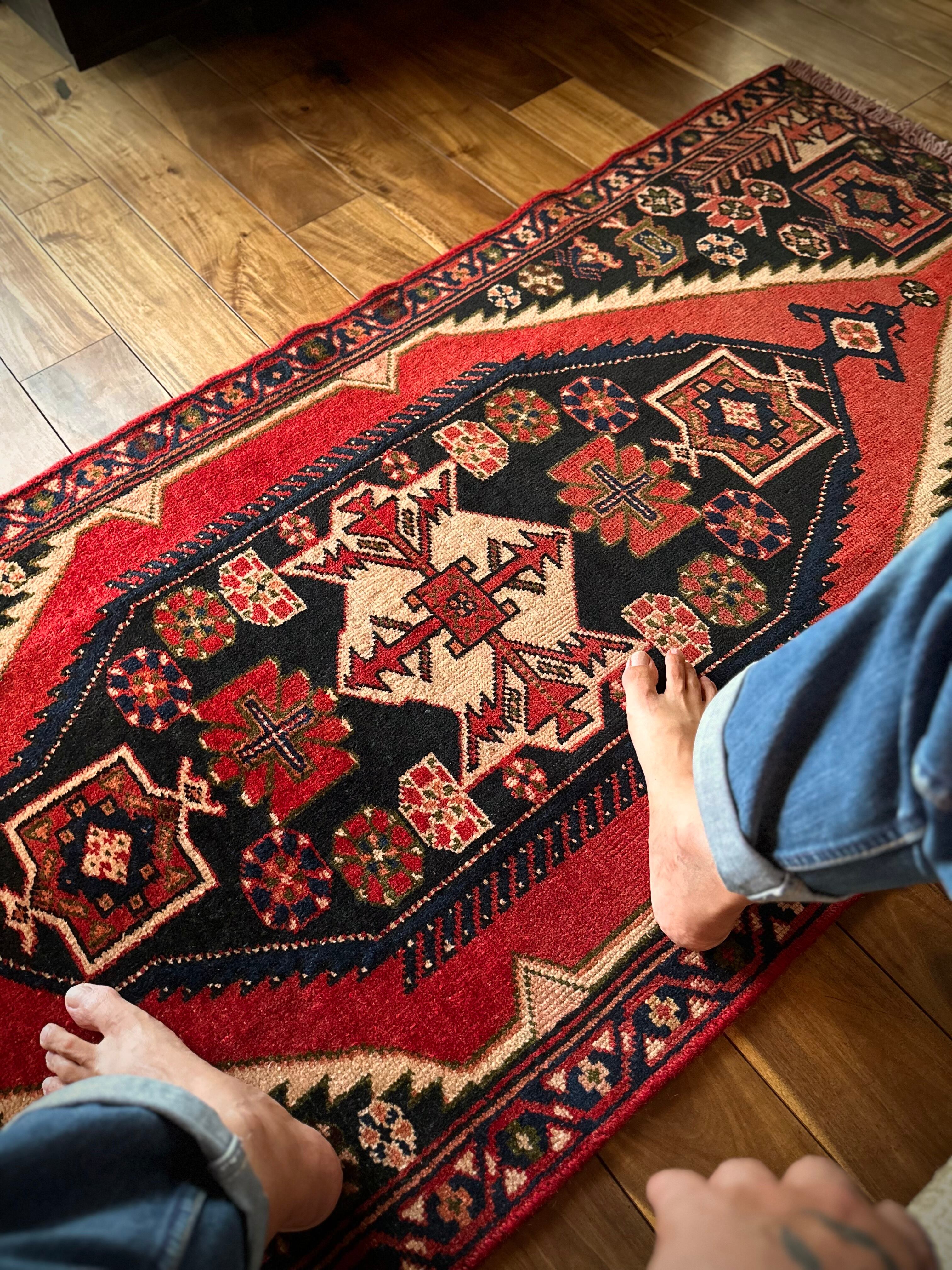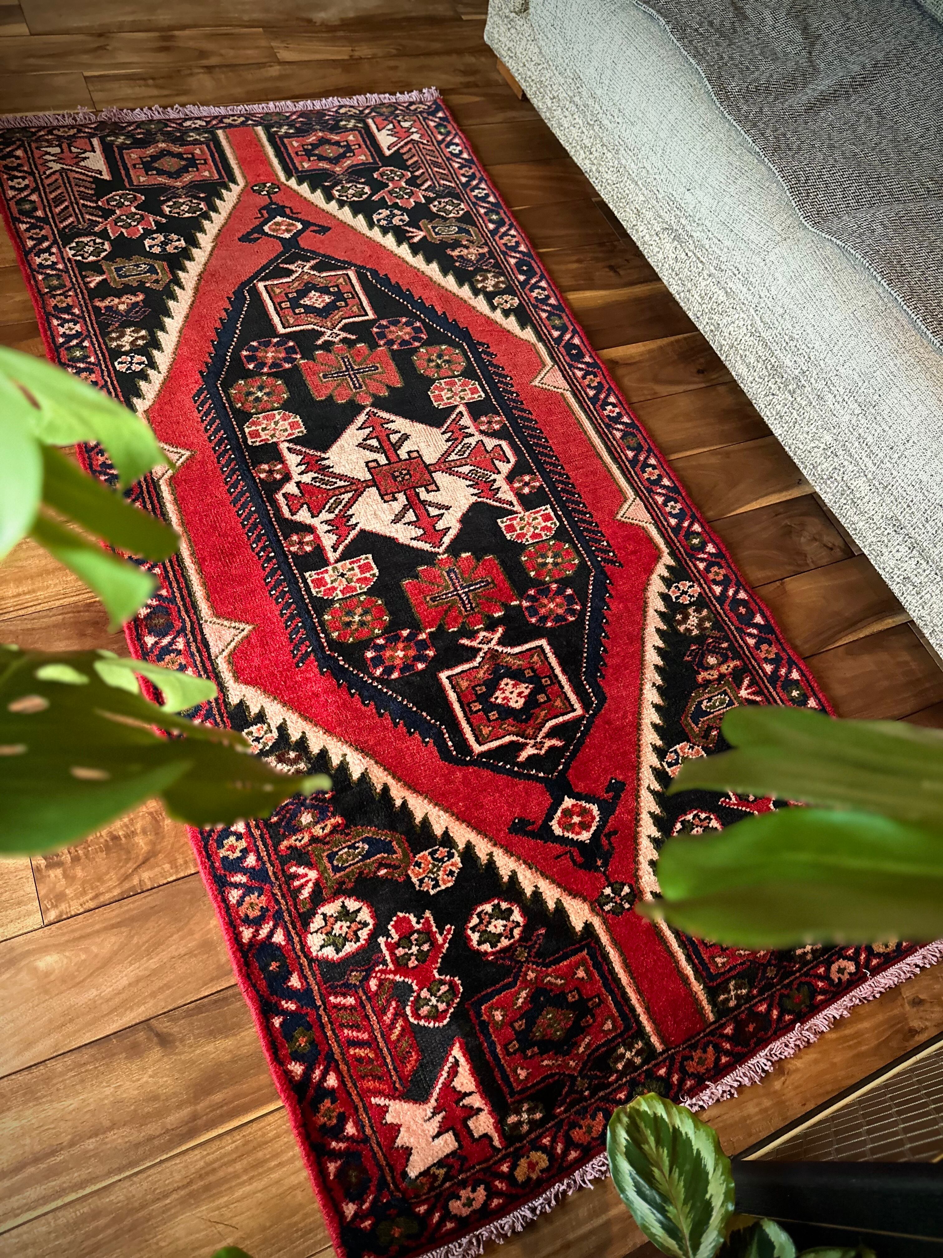 古来よりペルシャ絨毯の集積地として栄えたハマダン近郊の村々で手織りされたヴィレッジラグで、濃いめなネイビーと紅色のコントラストが見事なミディアムサイズのアクセントラグになります。