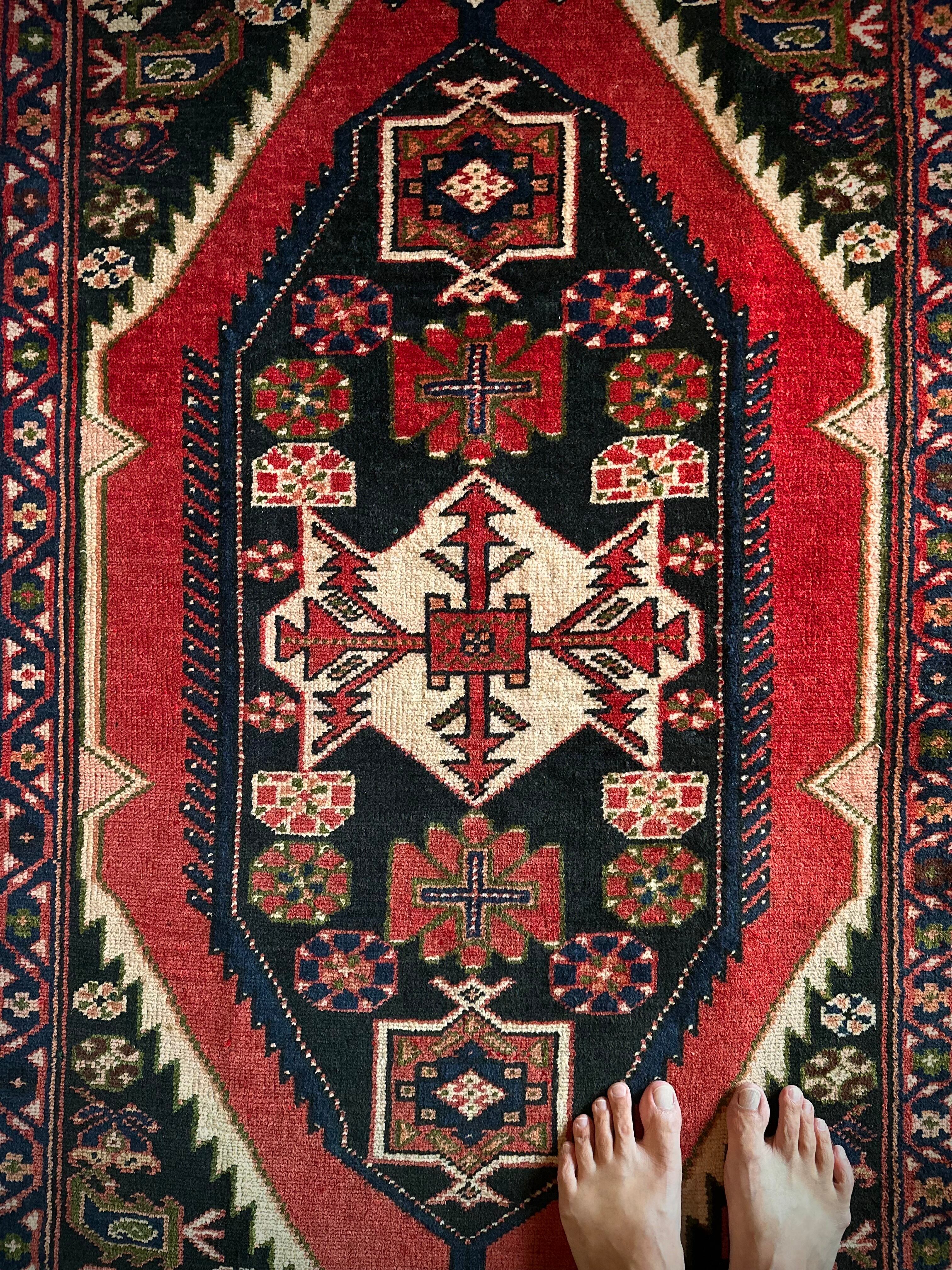最後にラグそのものに関しては羊毛特有の匂いがあり、採寸は中央付近で計測していますが、手織りならではの歪みによる誤差や水洗いクリーニングによる縮み、また草木染めによる経年劣化の色ムラなどがありますが、それもまたヴィンテージラグの魅力かとご理解ください。