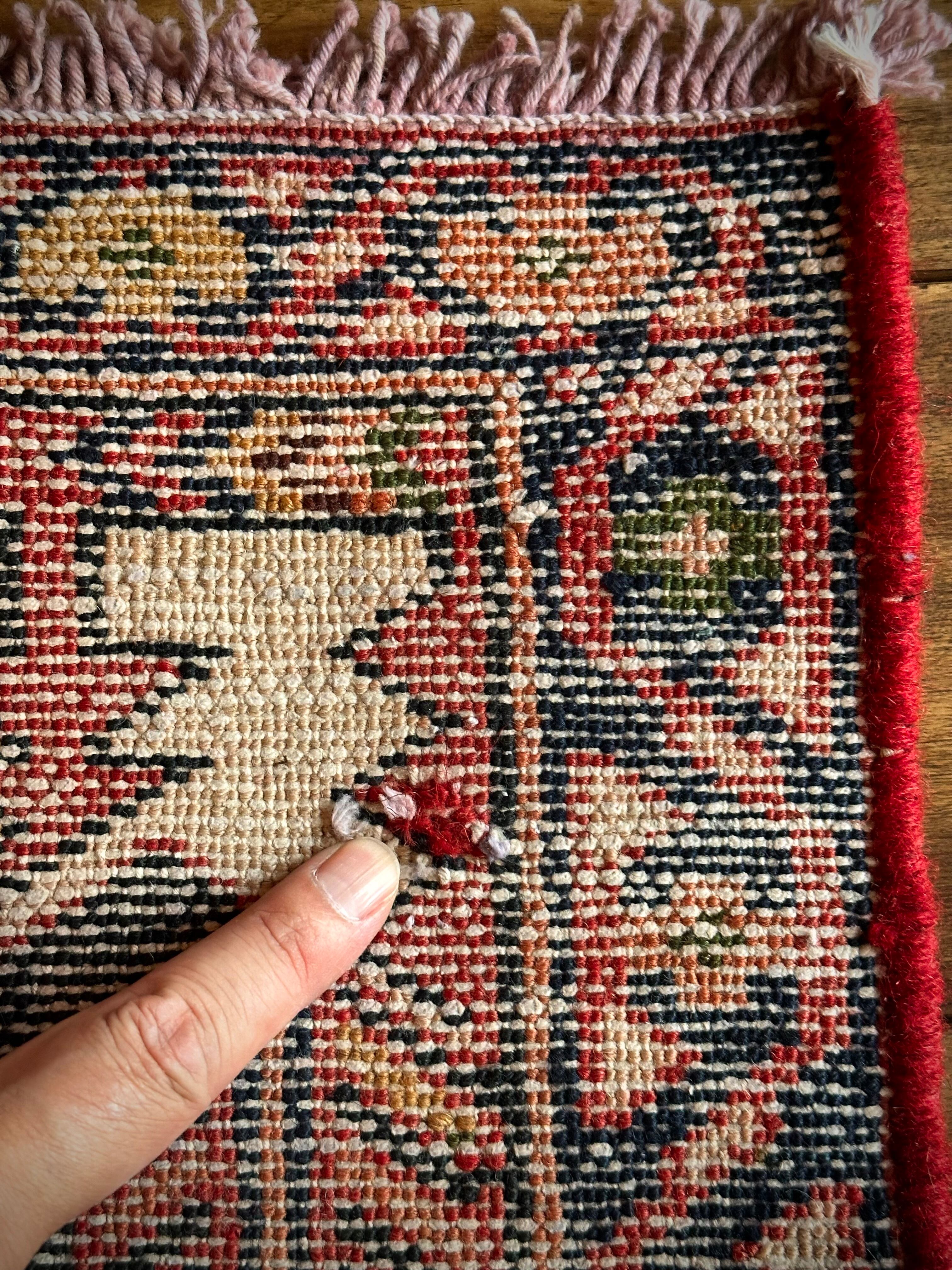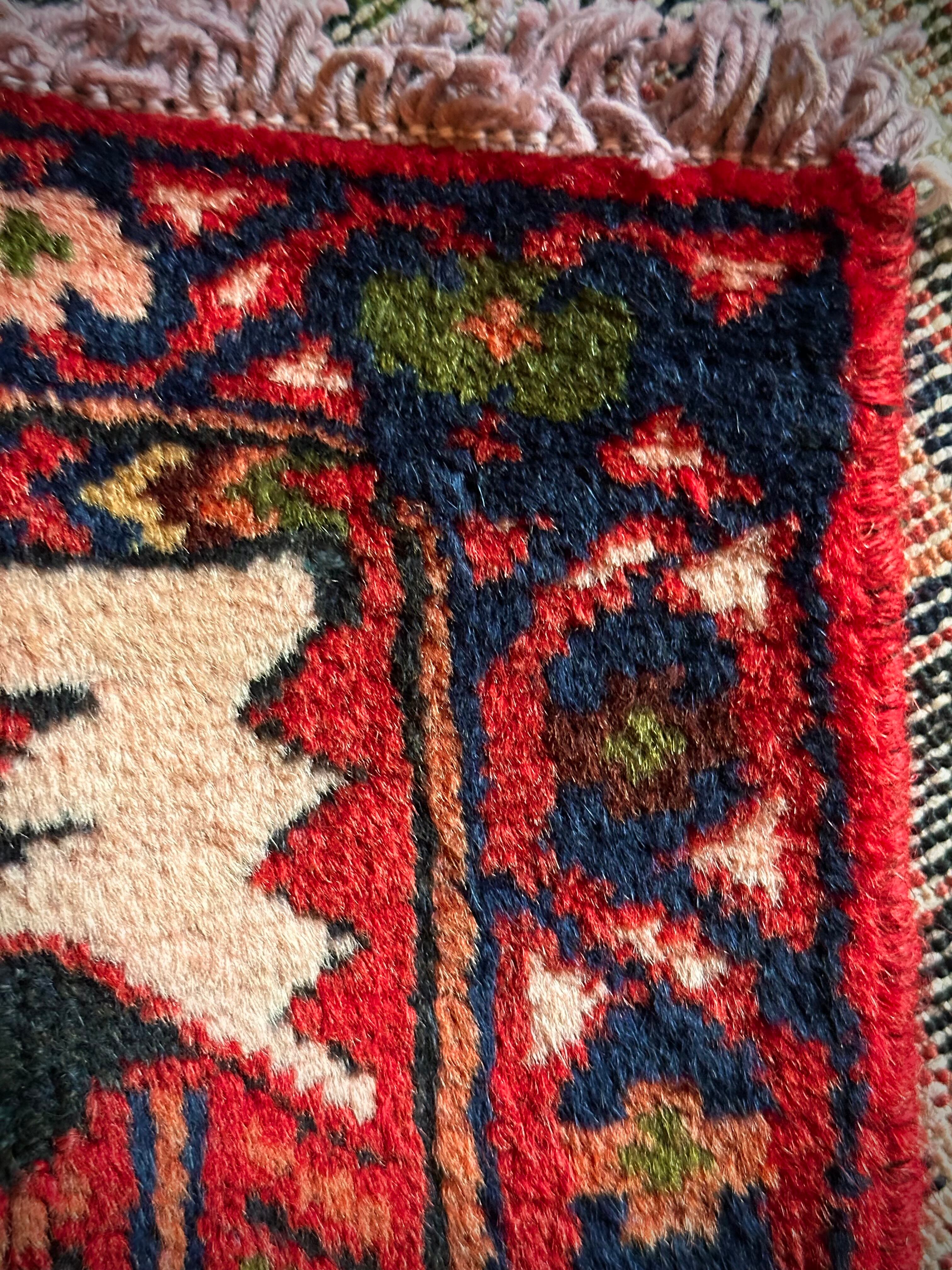 経年としては40年の熟成加減でそれなりの使用感があり、パイル自体もハマダン産らしい短めのサラッとした肌触りになります。特に目立つ汚れやダメージはありませんが、リペア箇所として端の裂け目を補修した箇所と小さな穴の補修があり、表側からは分からない程度になりますので写真にてご確認ください。