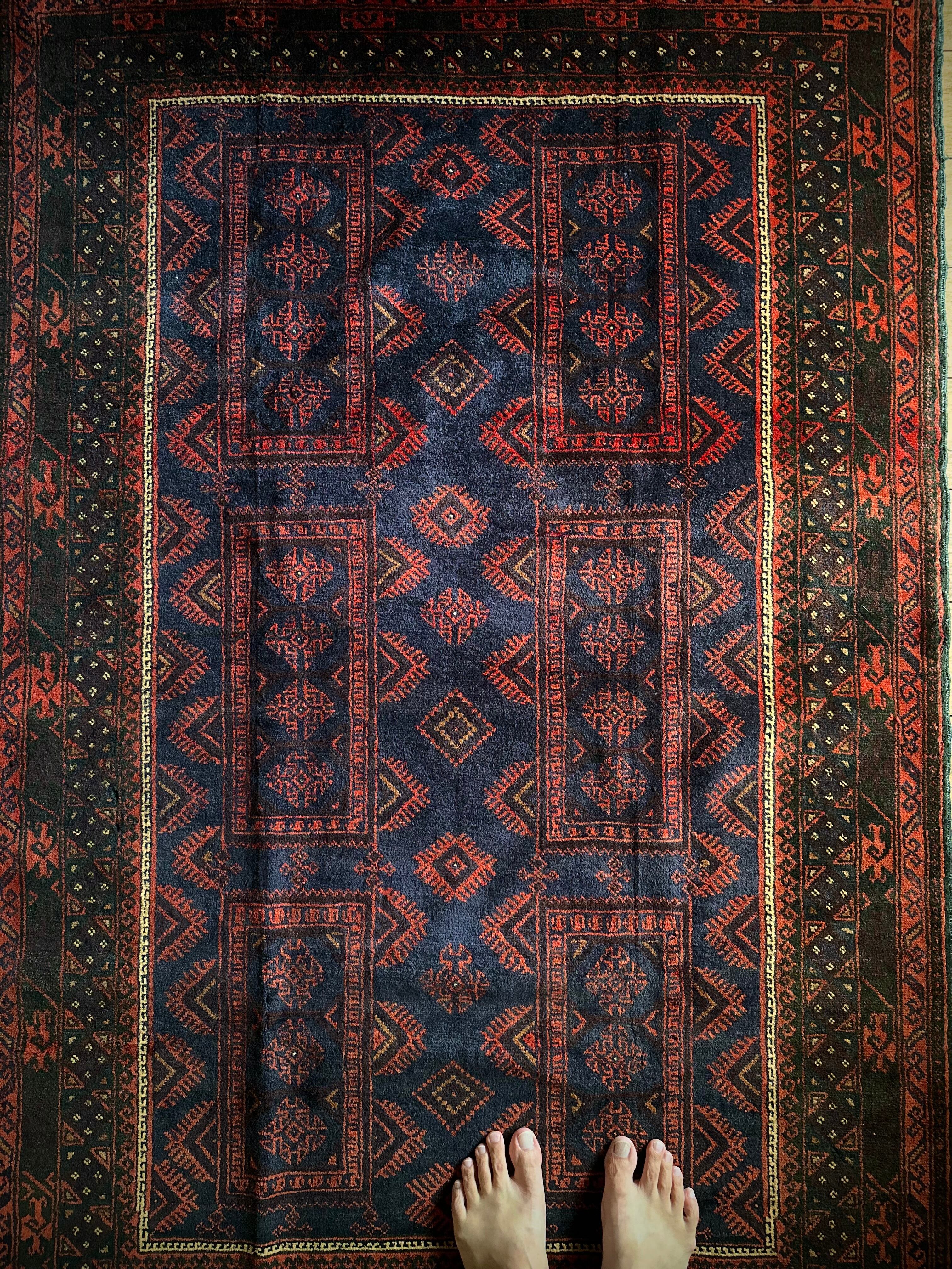 最後にラグそのものに関しては羊毛特有の匂いがあり、採寸は中央付近で計測していますが、手織りならではの歪みによる誤差や水洗いクリーニングによる縮み、また草木染めによる経年劣化の色ムラなどがありますが、それもまたヴィンテージラグの魅力かとご理解ください。