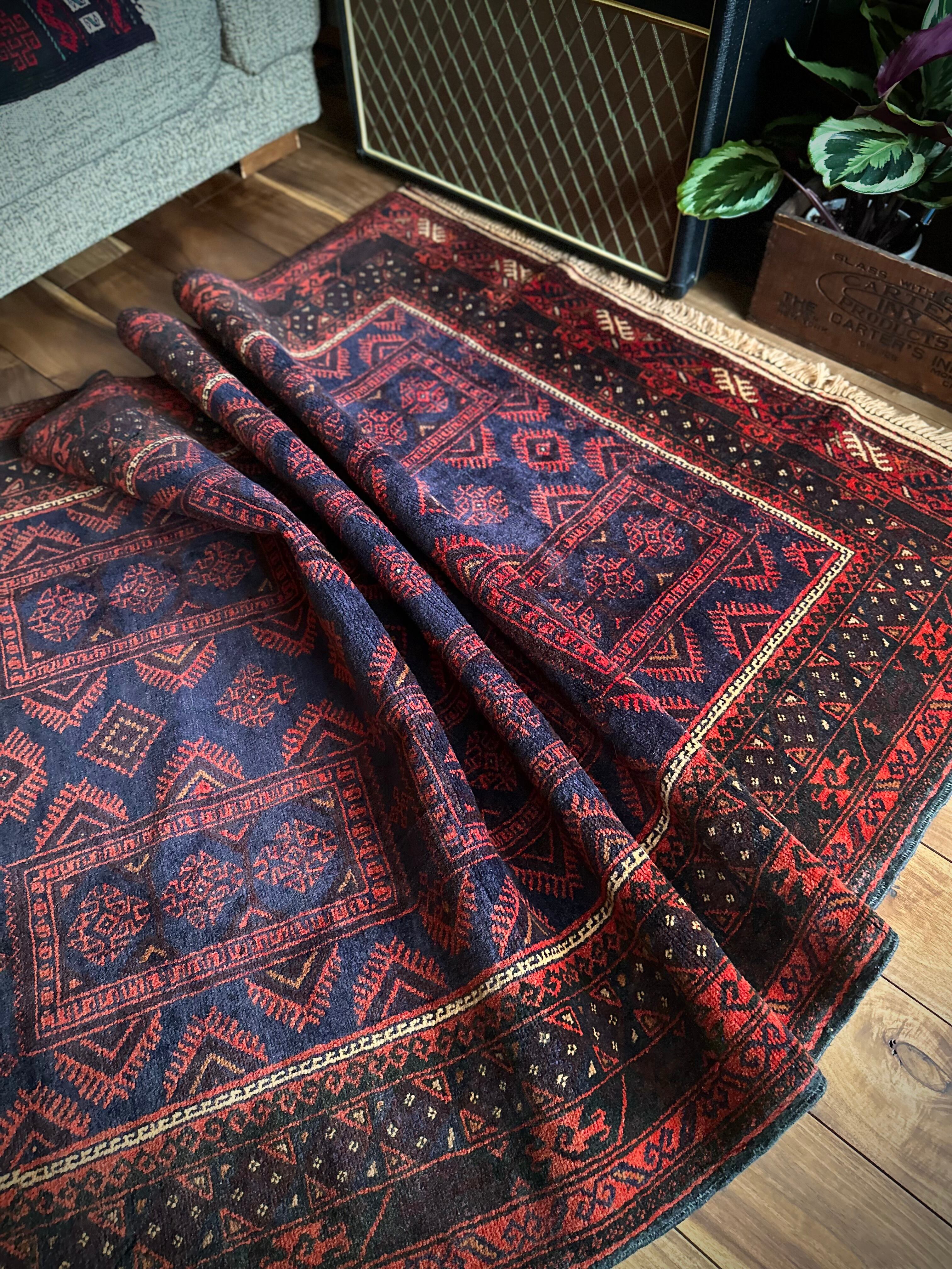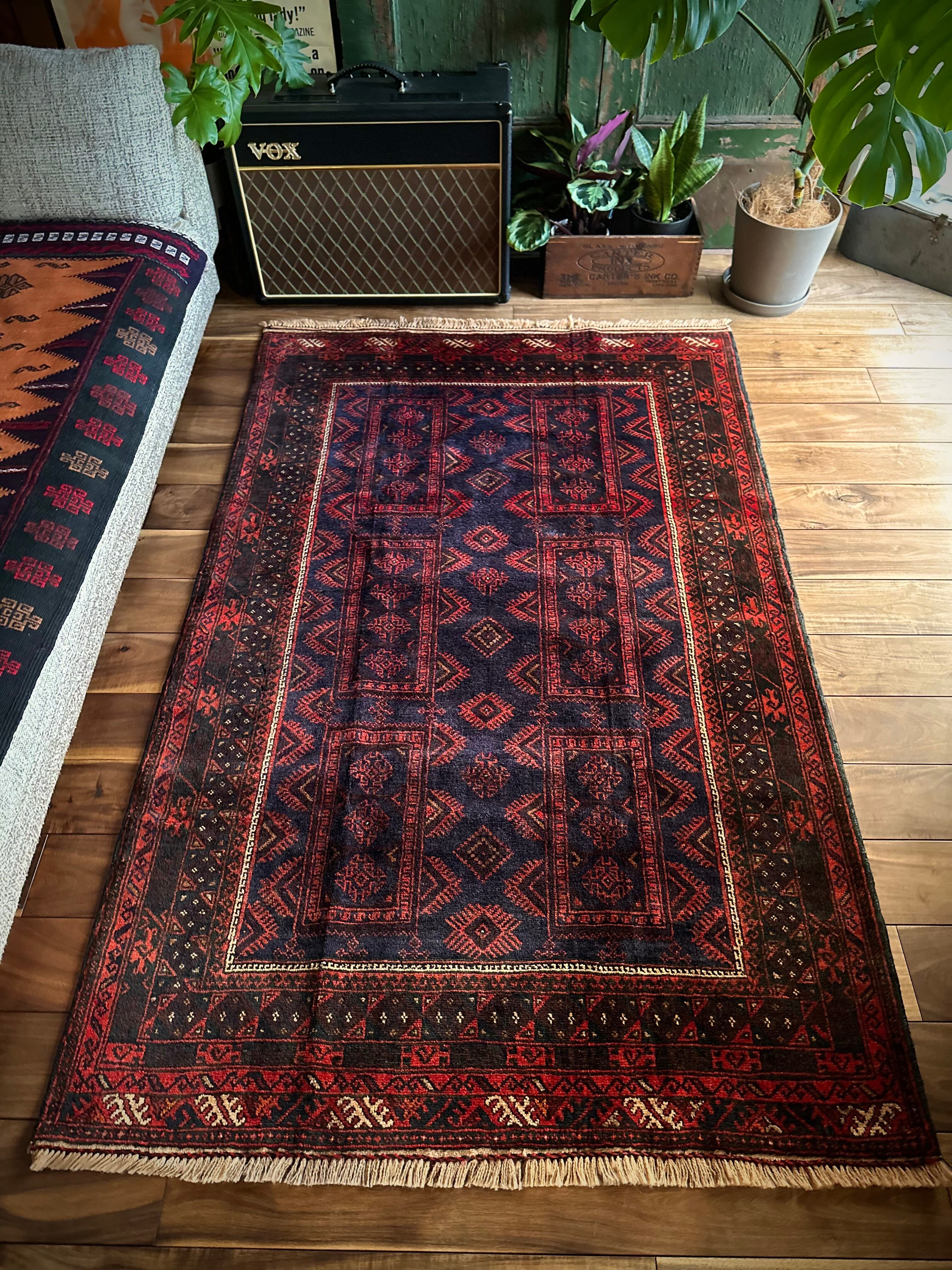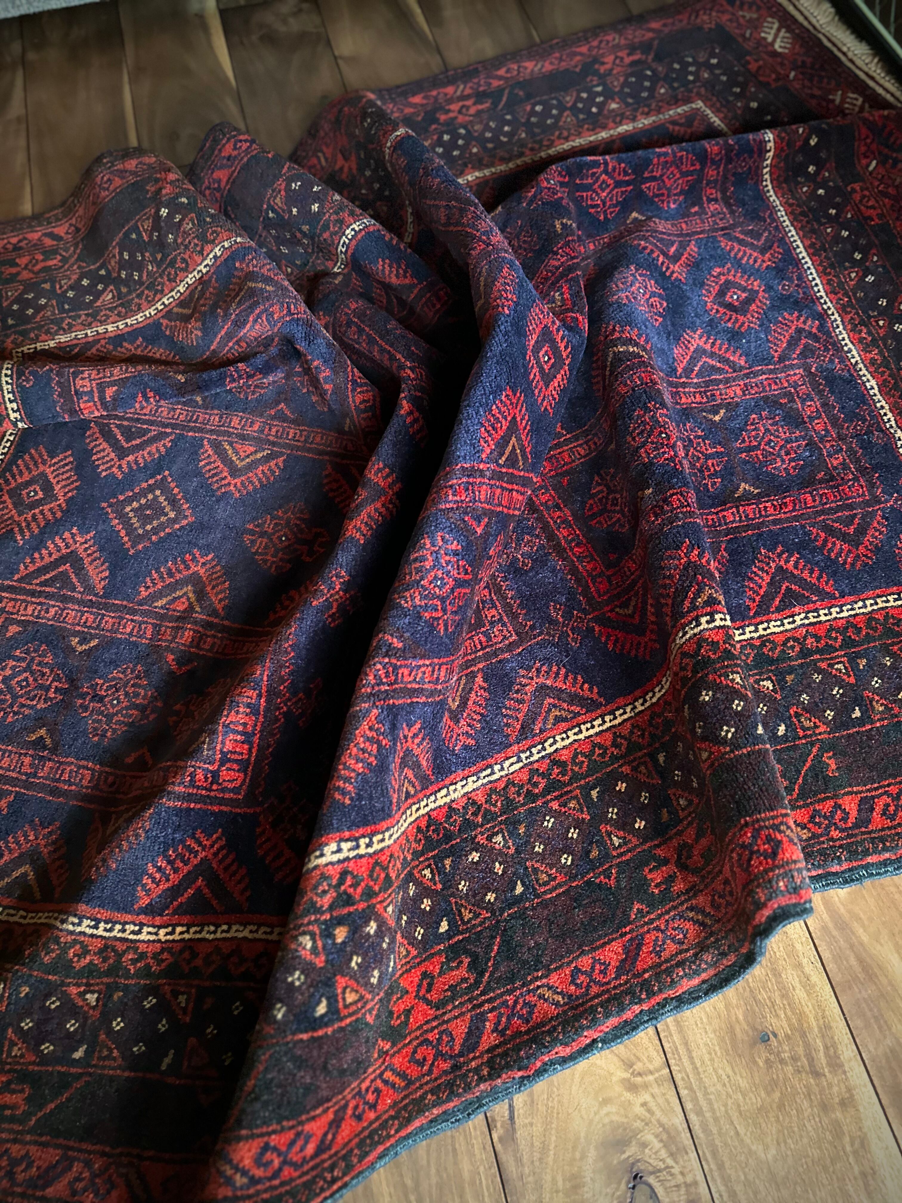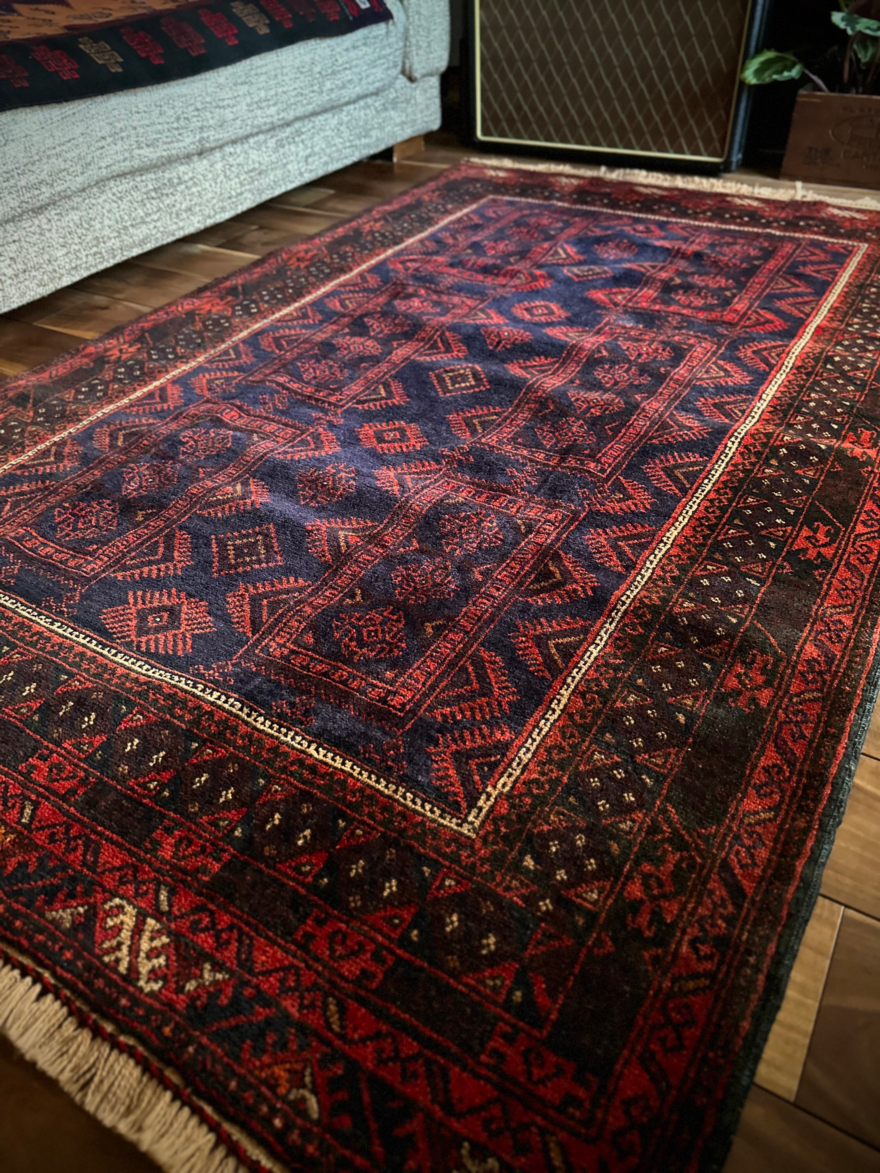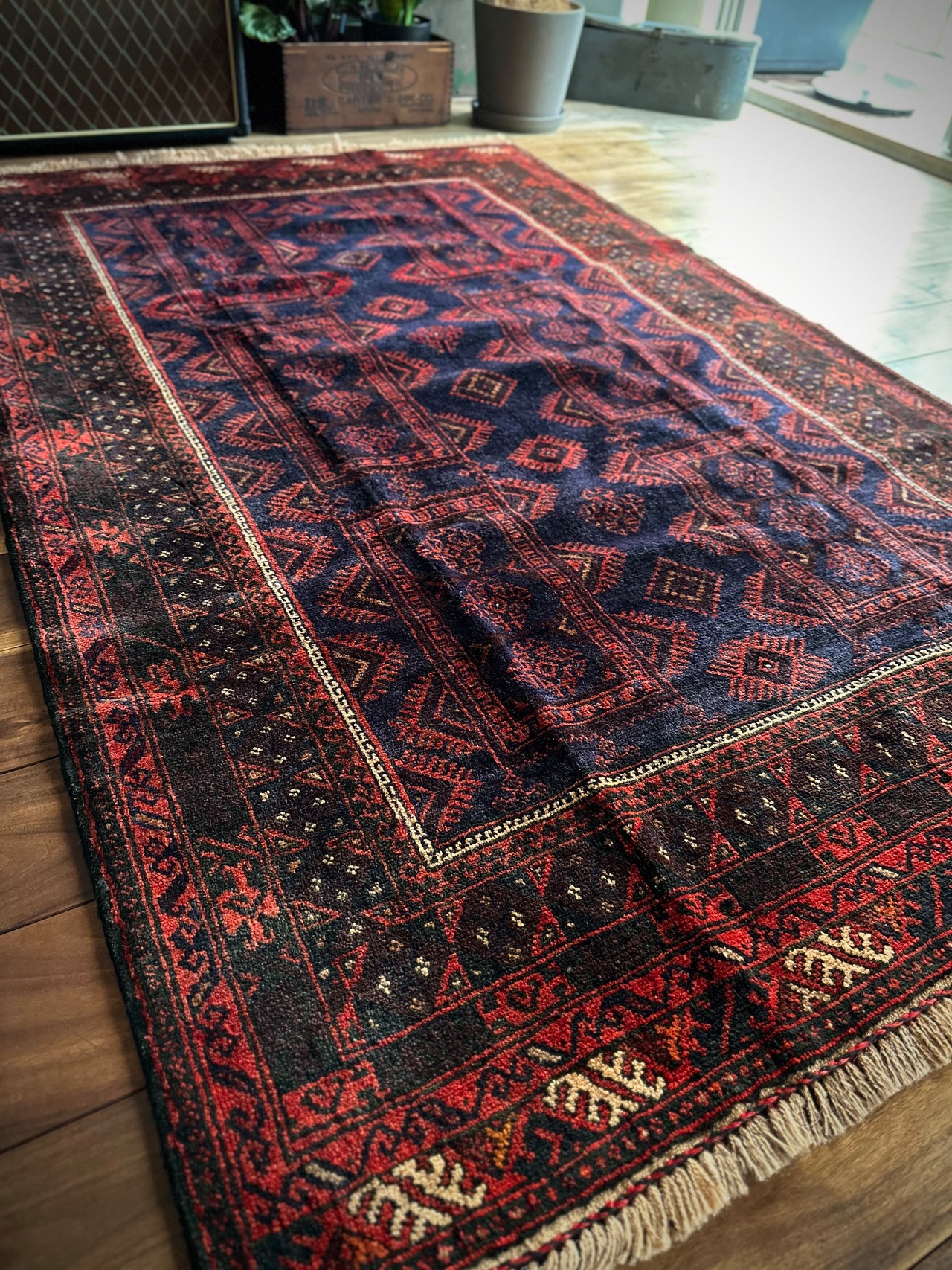 深みのあるネイビーとレッドが織りなす渋い風合いに、バランスの取れた細かなギュルの配列がなんともかっこいい、アフガニスタンはヘラート州に居住するバルーチ族のトライバルラグで"Yaqub Khani"というデザインの1枚になります。