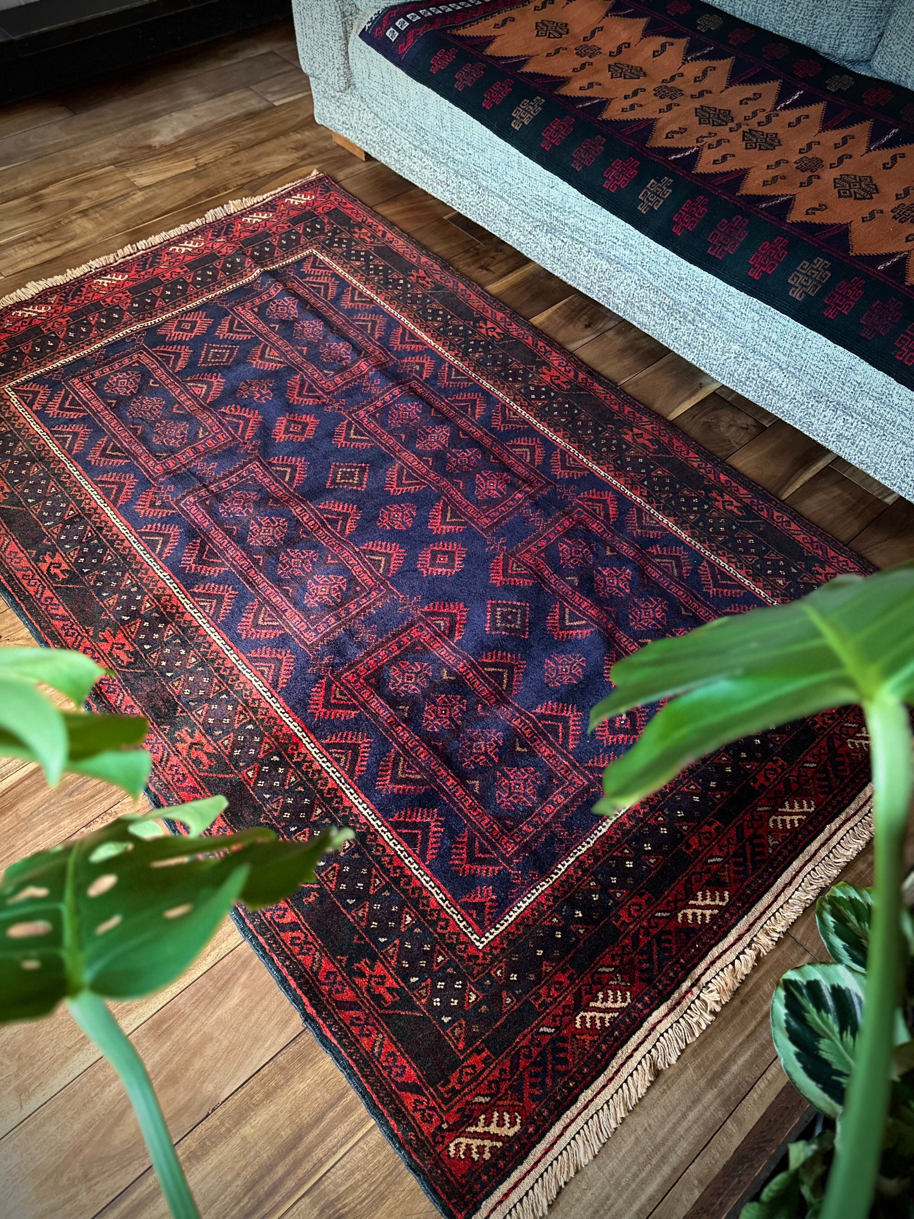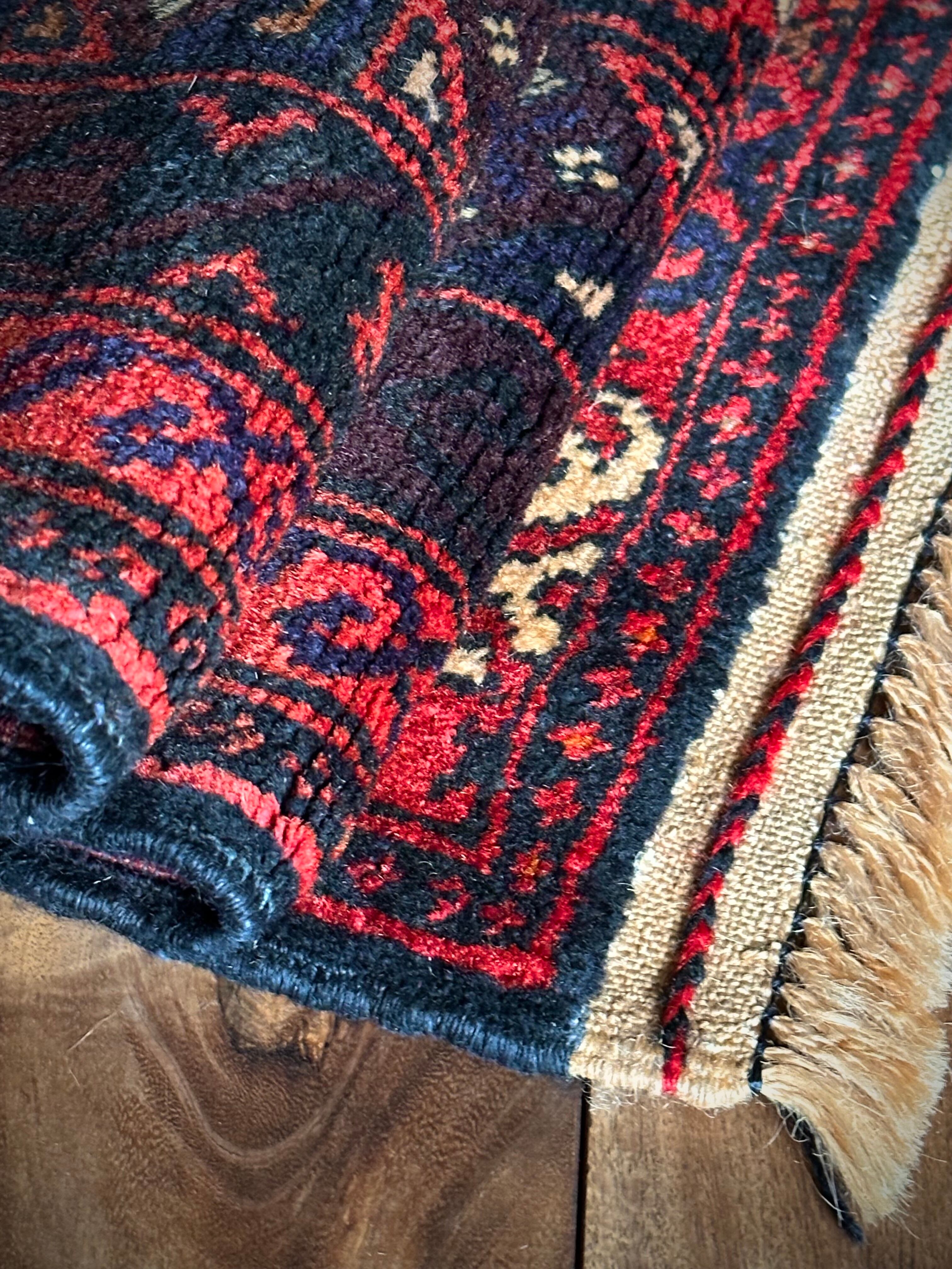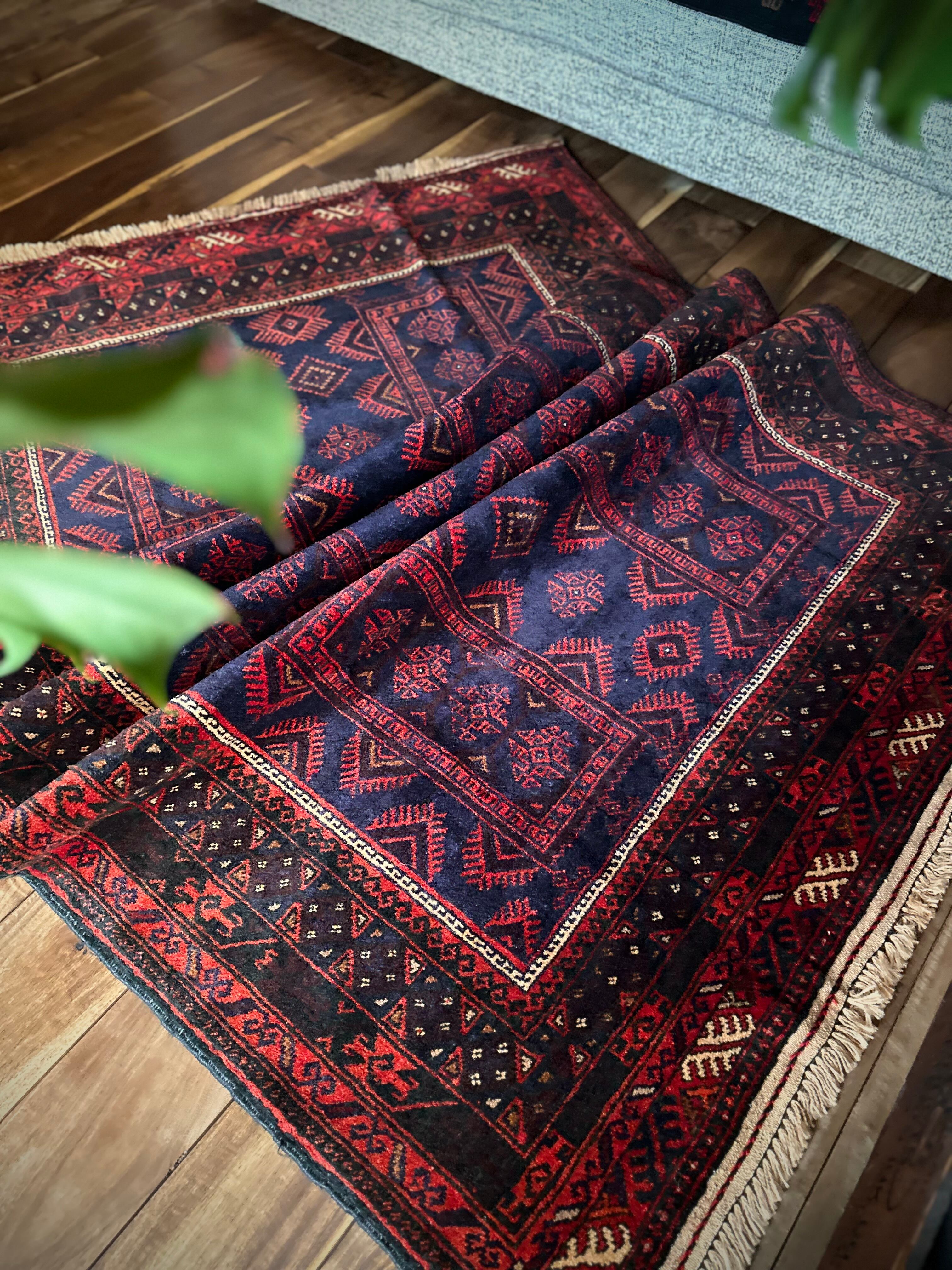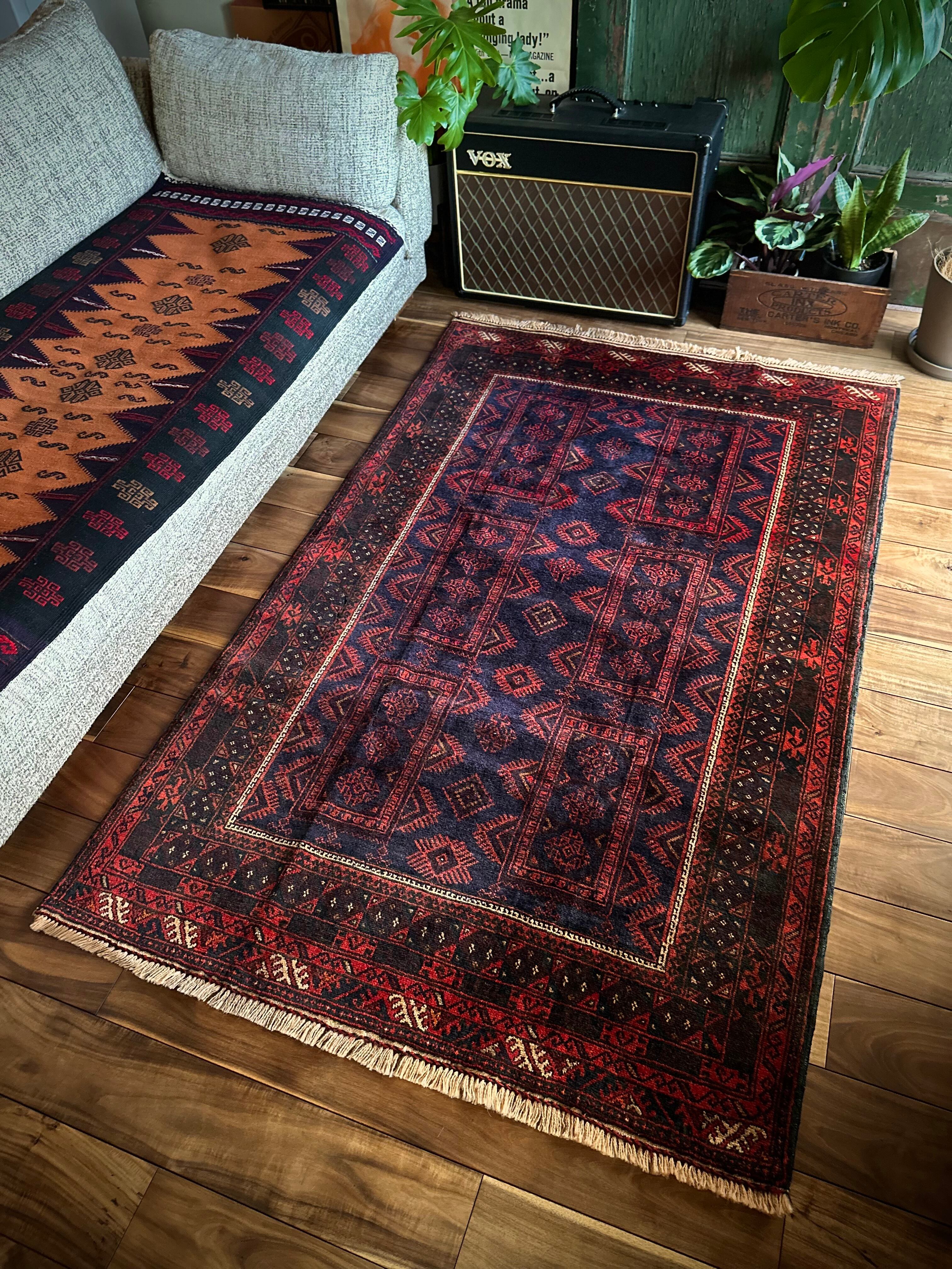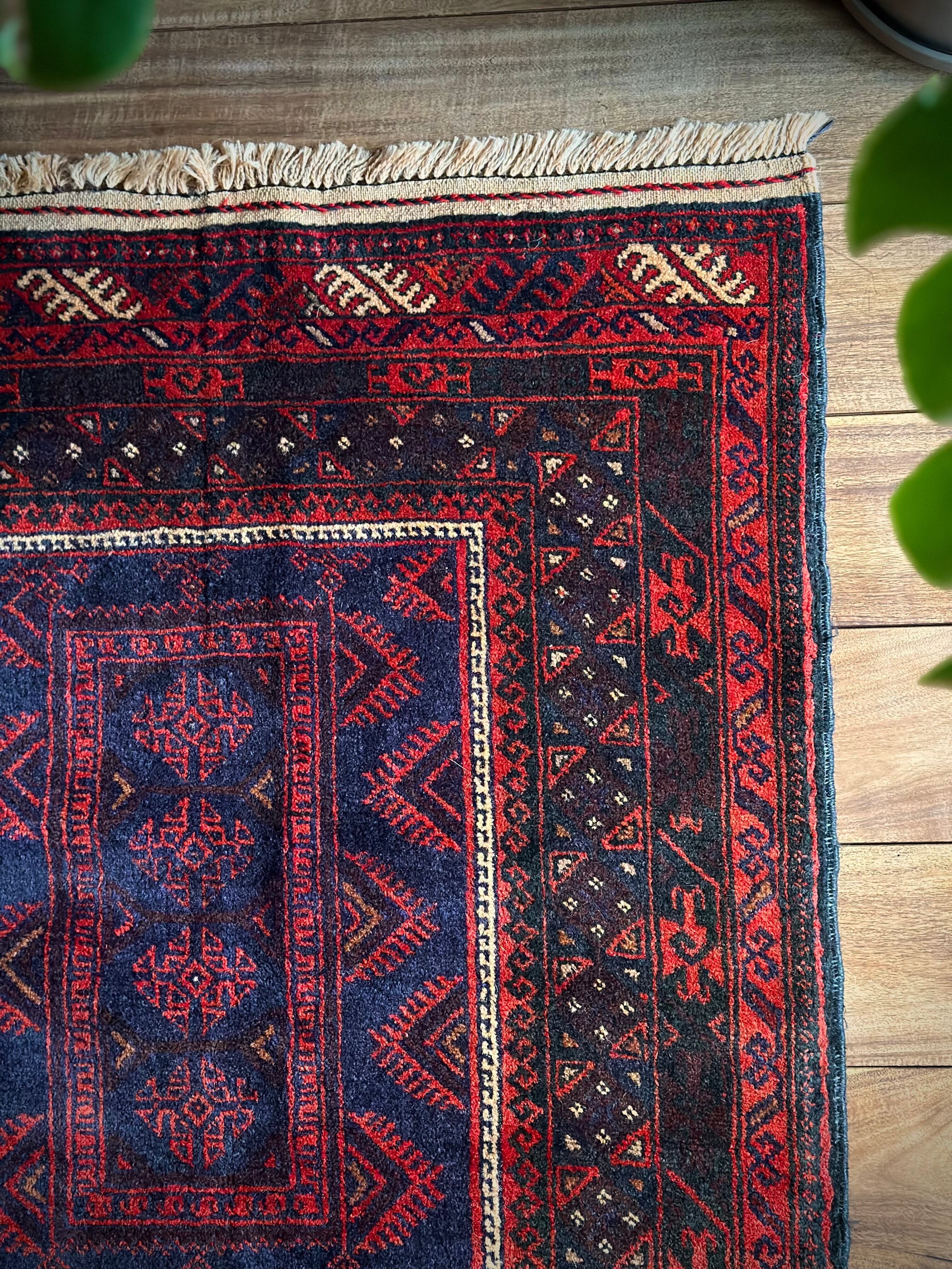 深みのあるネイビーとレッドが織りなす渋い風合いに、バランスの取れた細かなギュルの配列がなんともかっこいい、アフガニスタンはヘラート州に居住するバルーチ族のトライバルラグで"Yaqub Khani"というデザインの1枚になります。