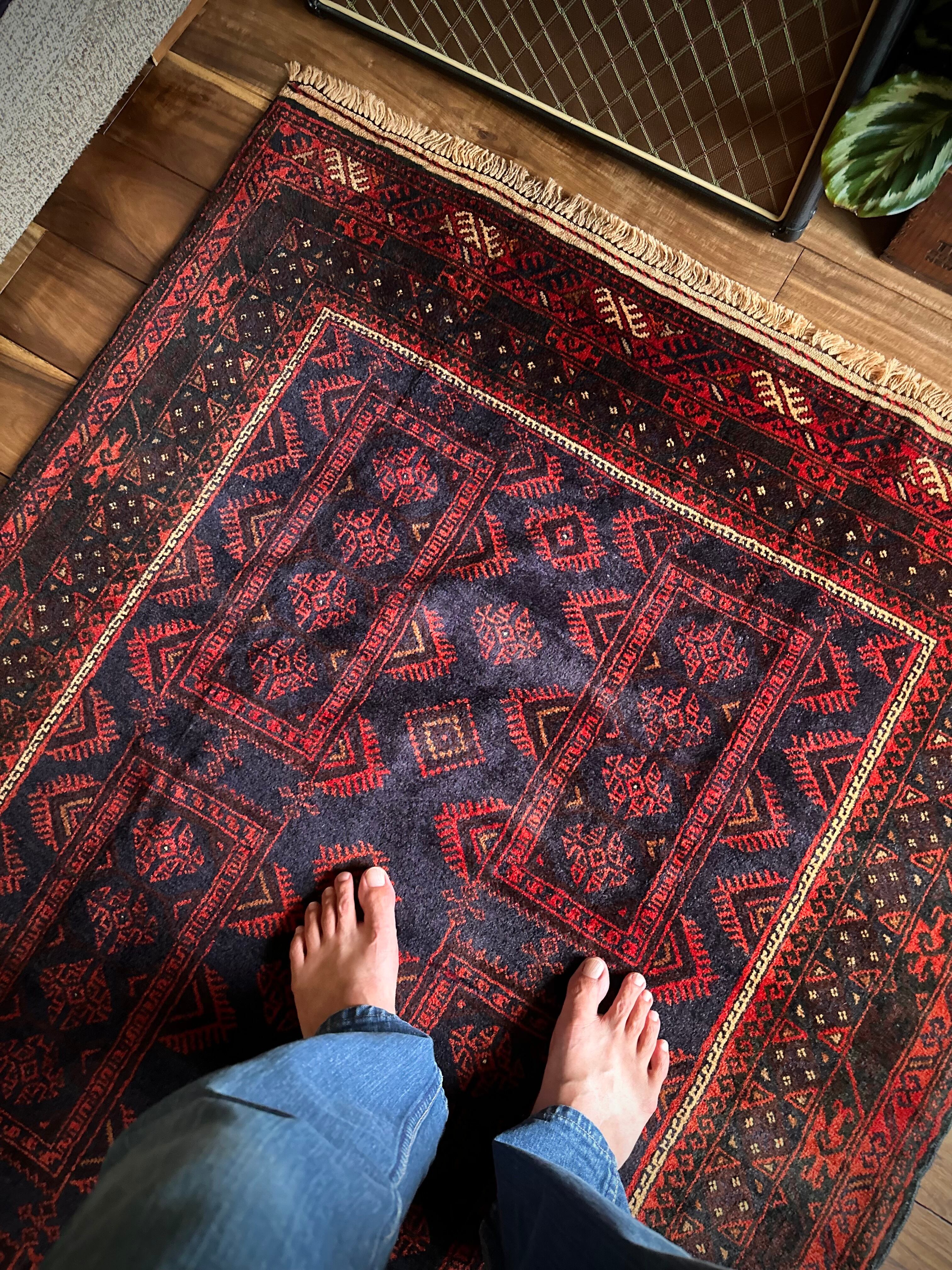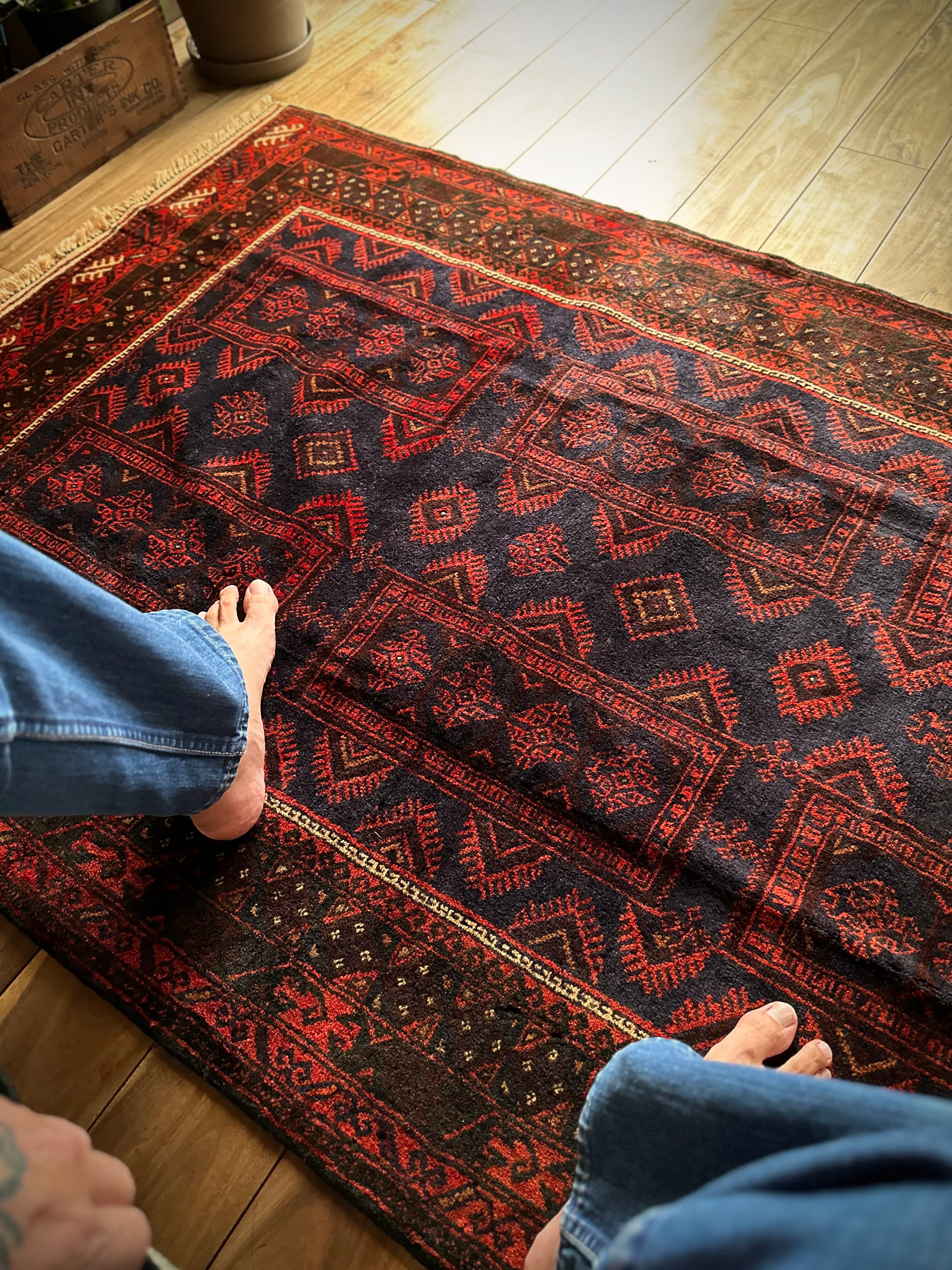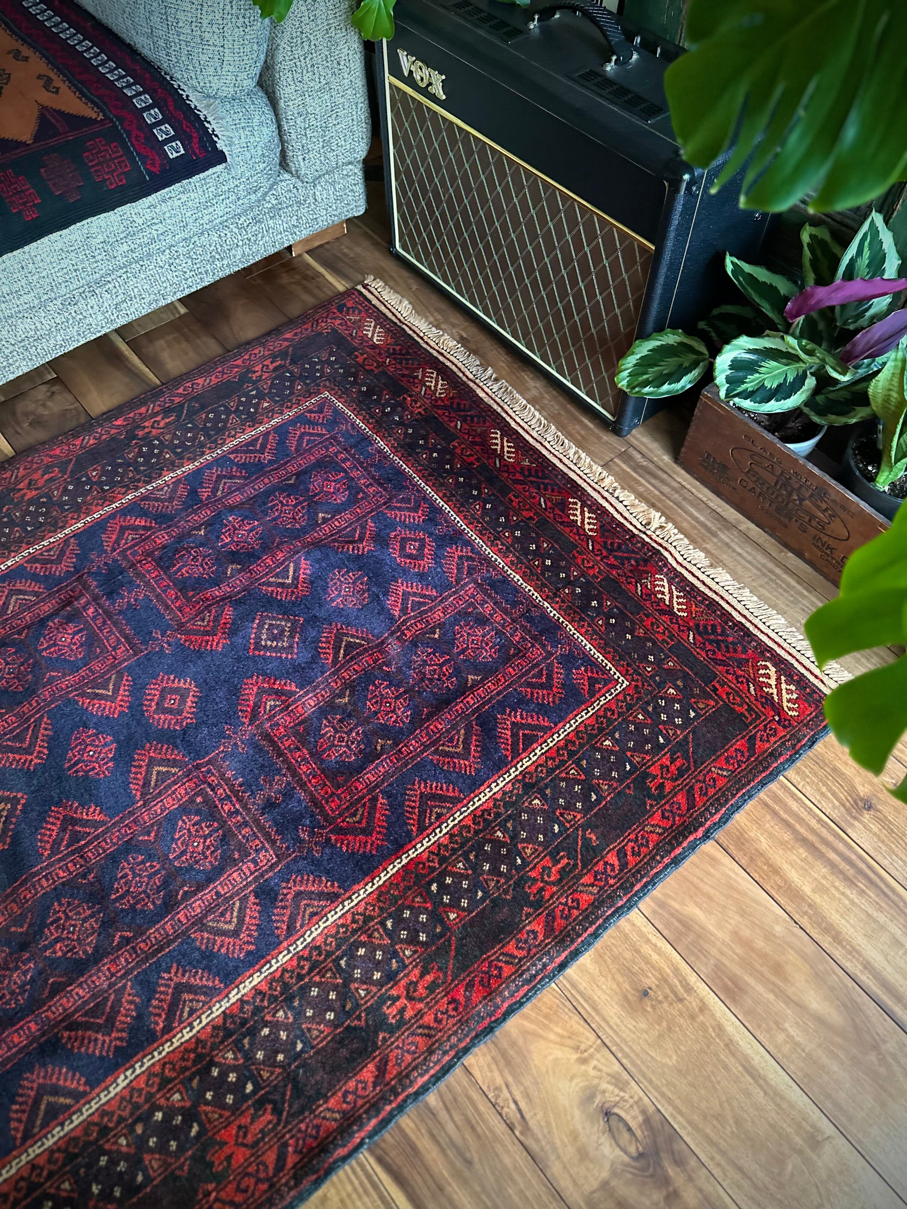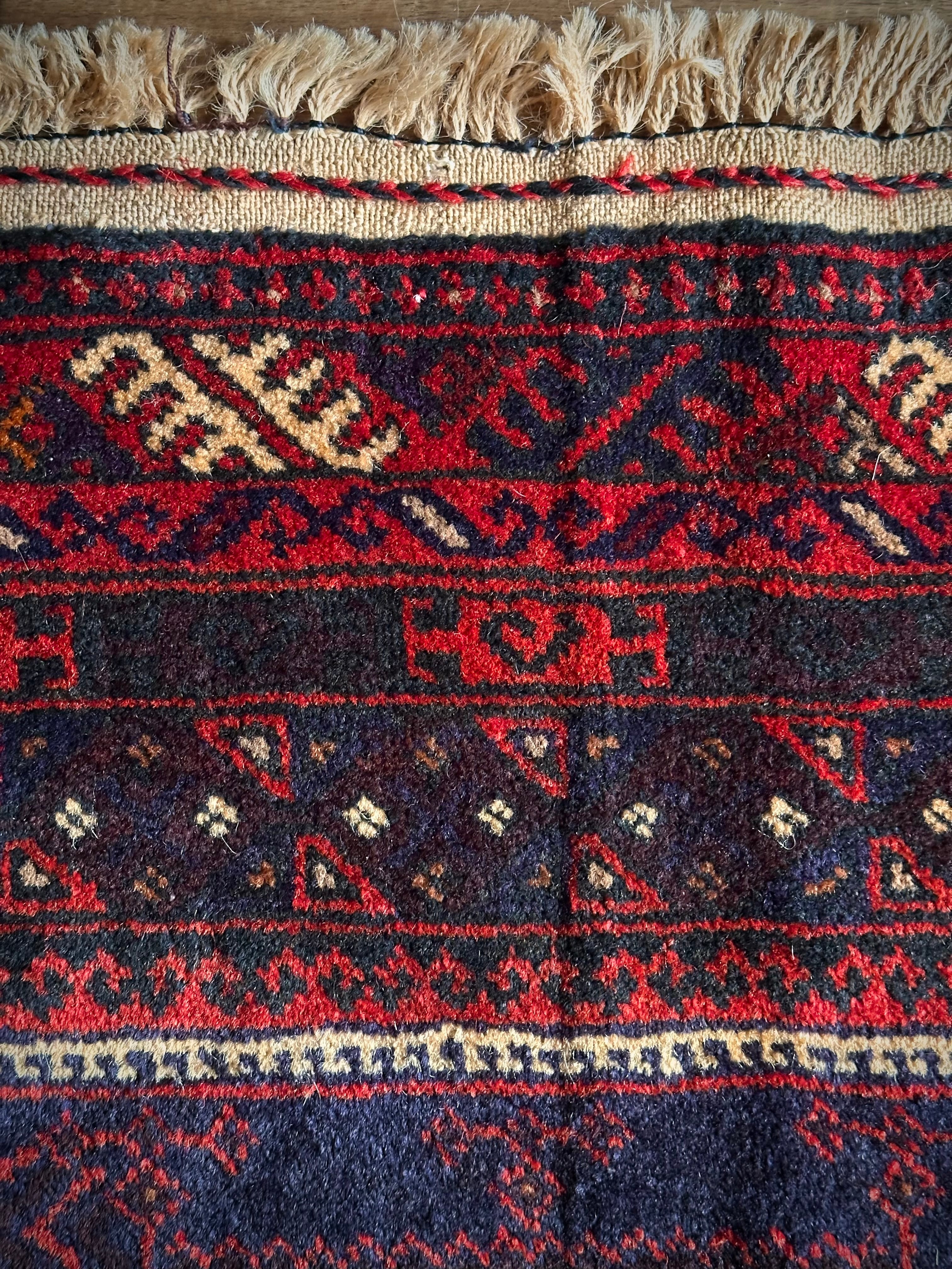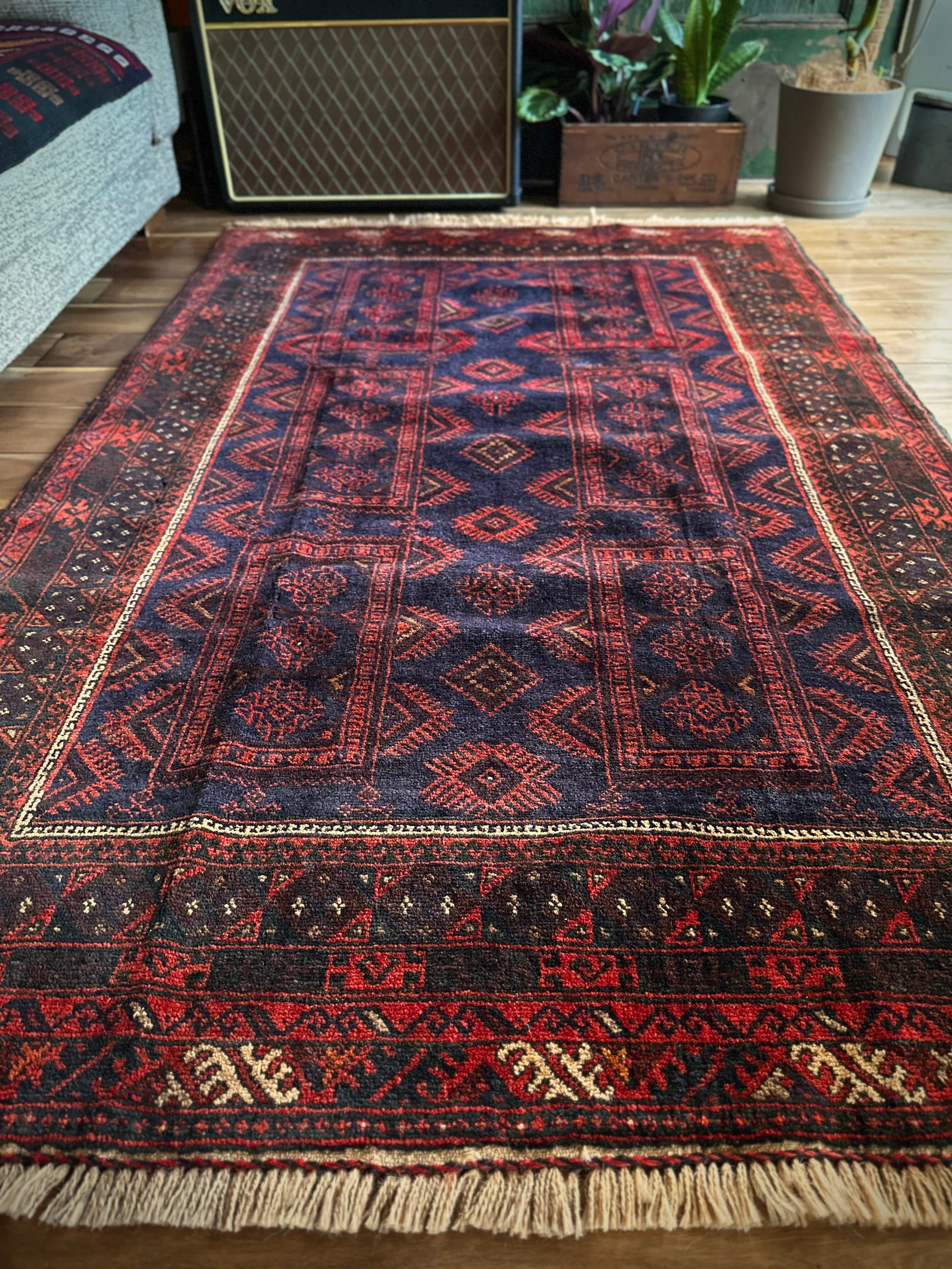 深みのあるネイビーとレッドが織りなす渋い風合いに、バランスの取れた細かなギュルの配列がなんともかっこいい、アフガニスタンはヘラート州に居住するバルーチ族のトライバルラグで"Yaqub Khani"というデザインの1枚になります。