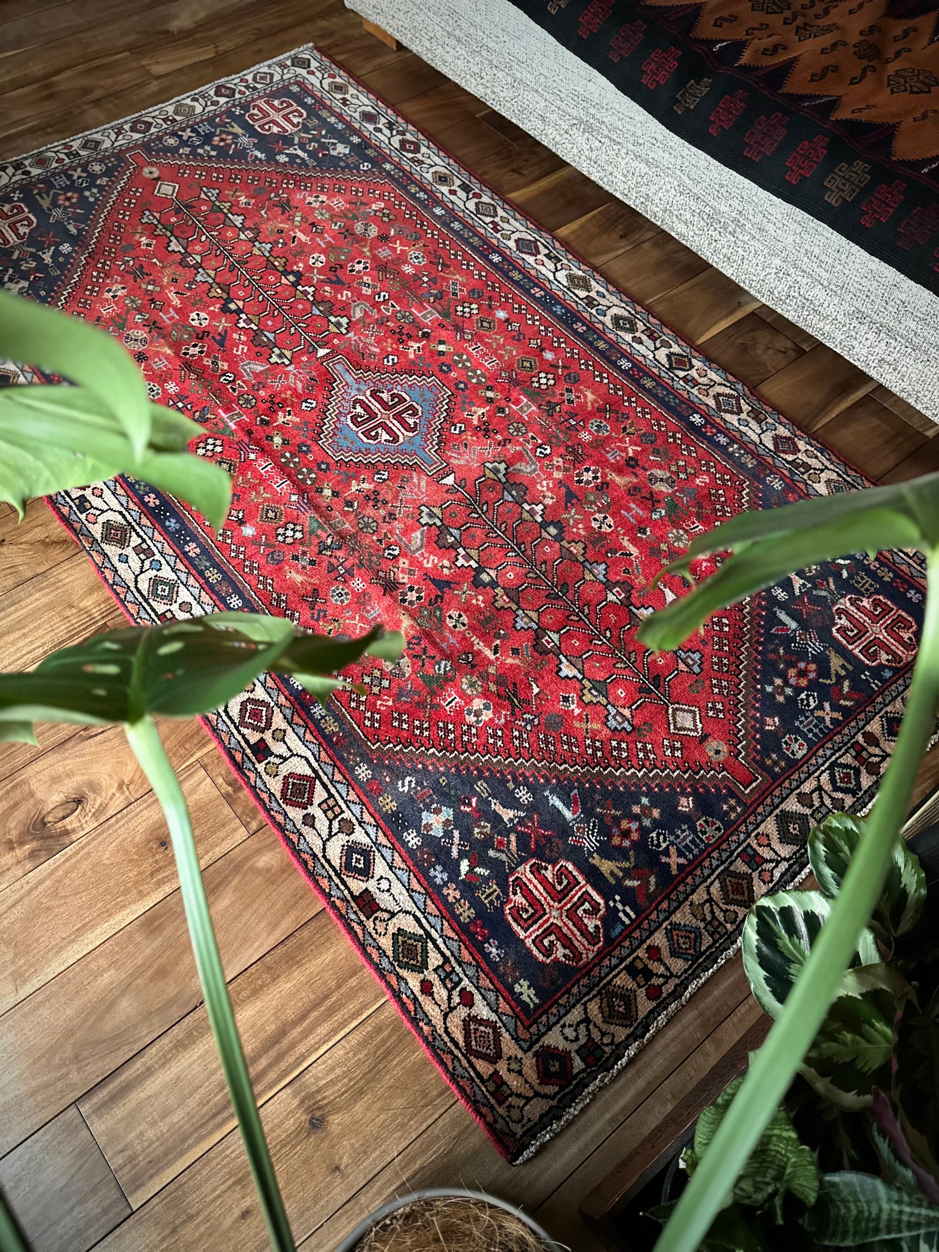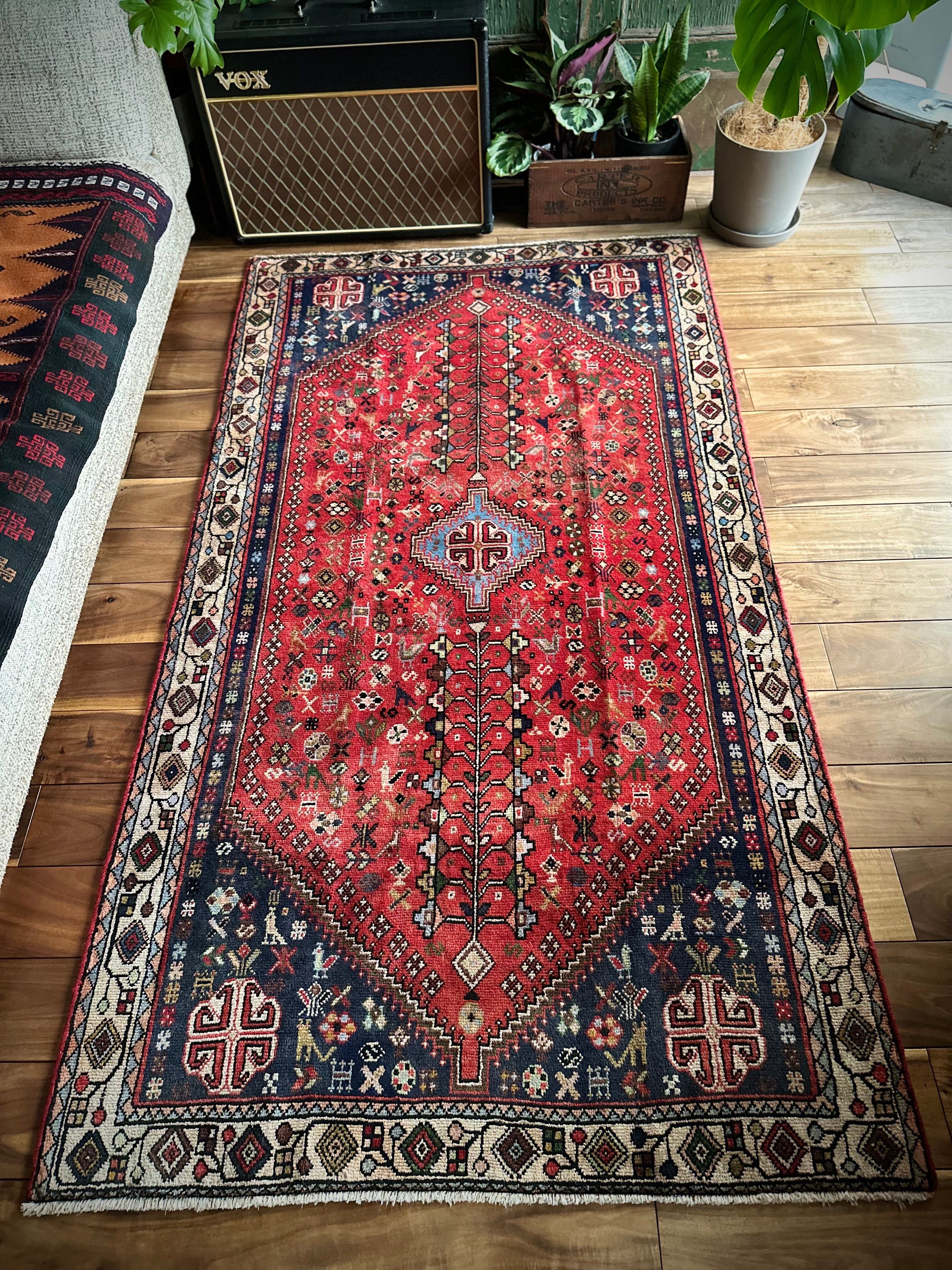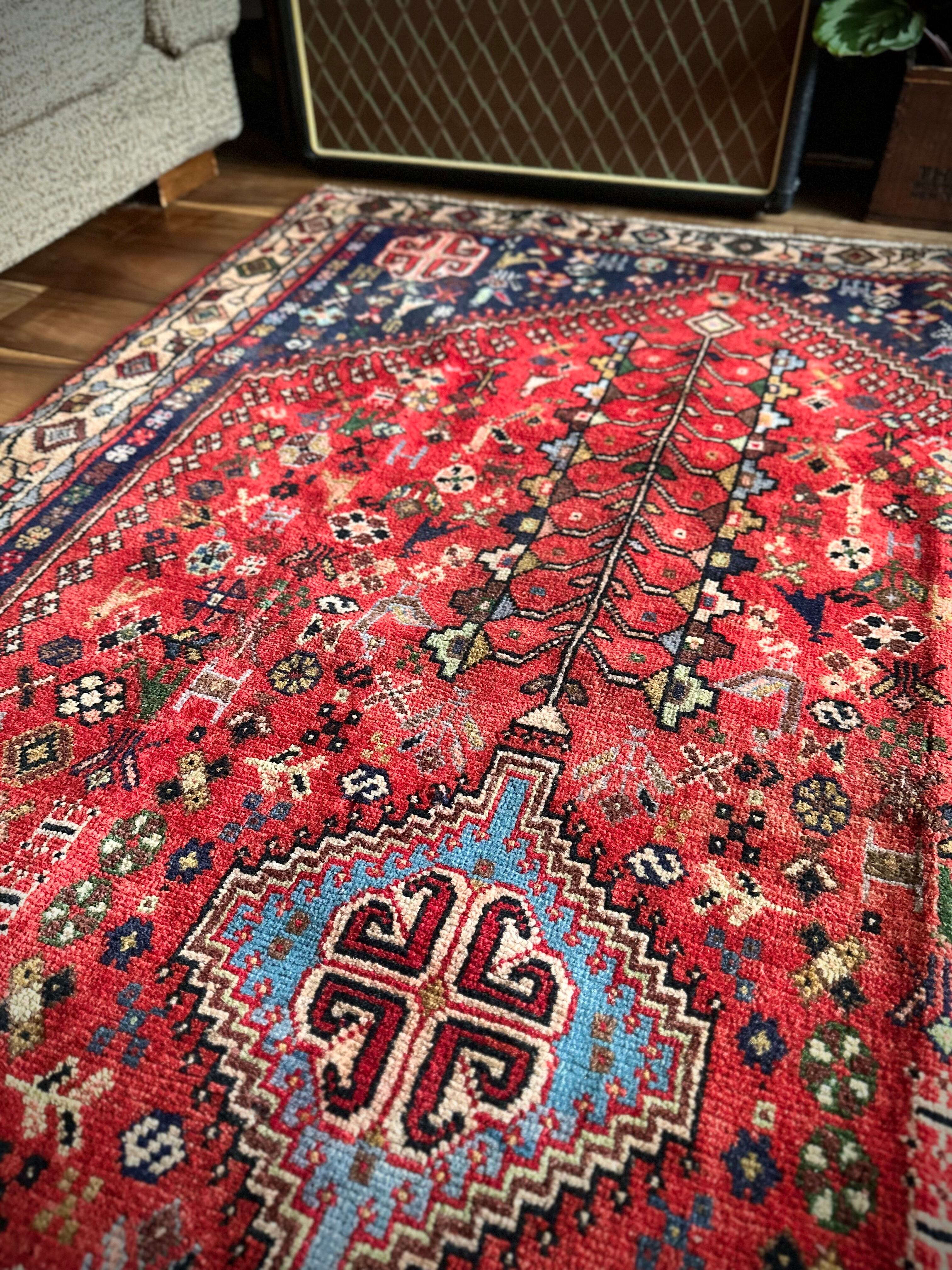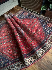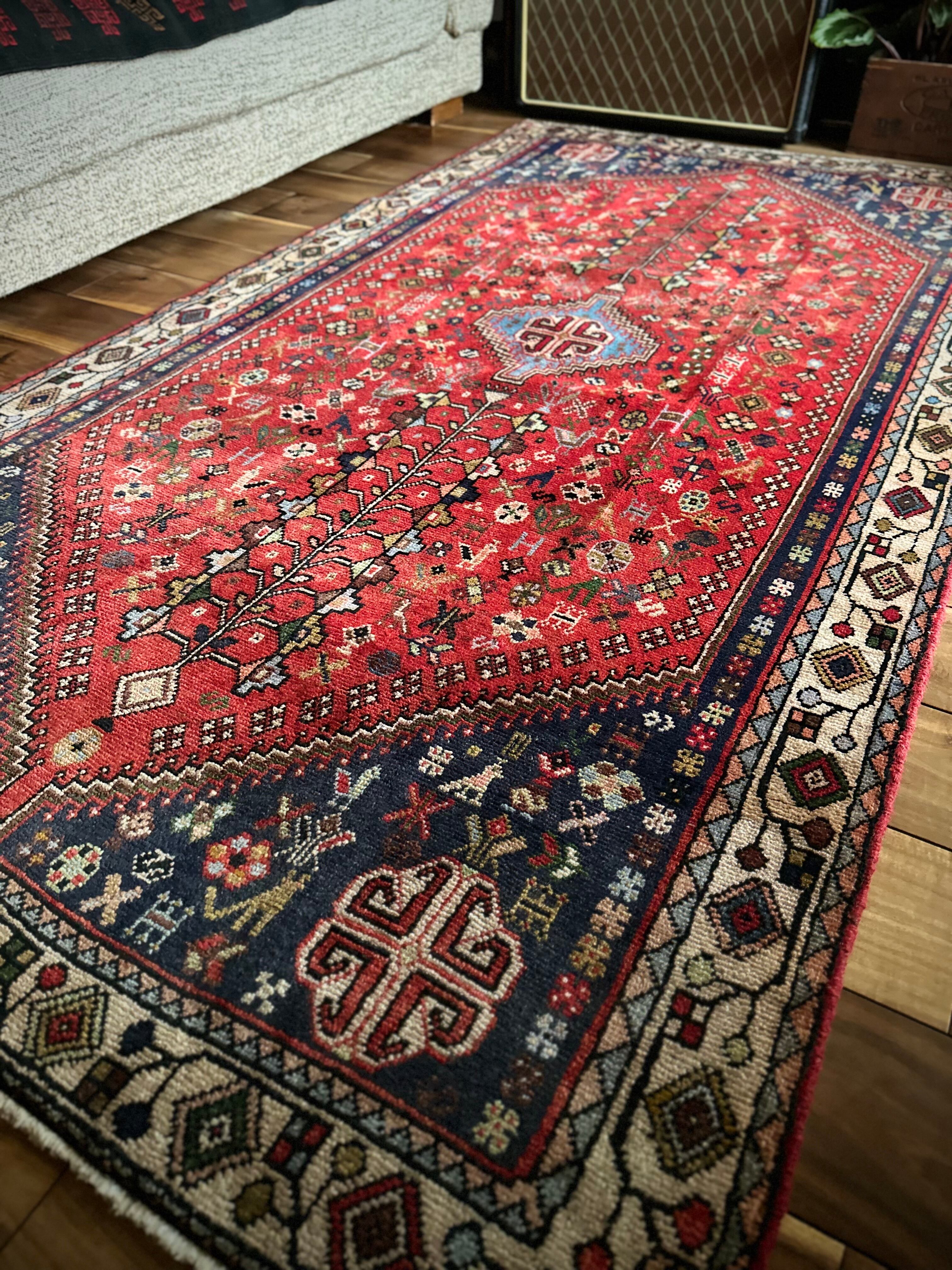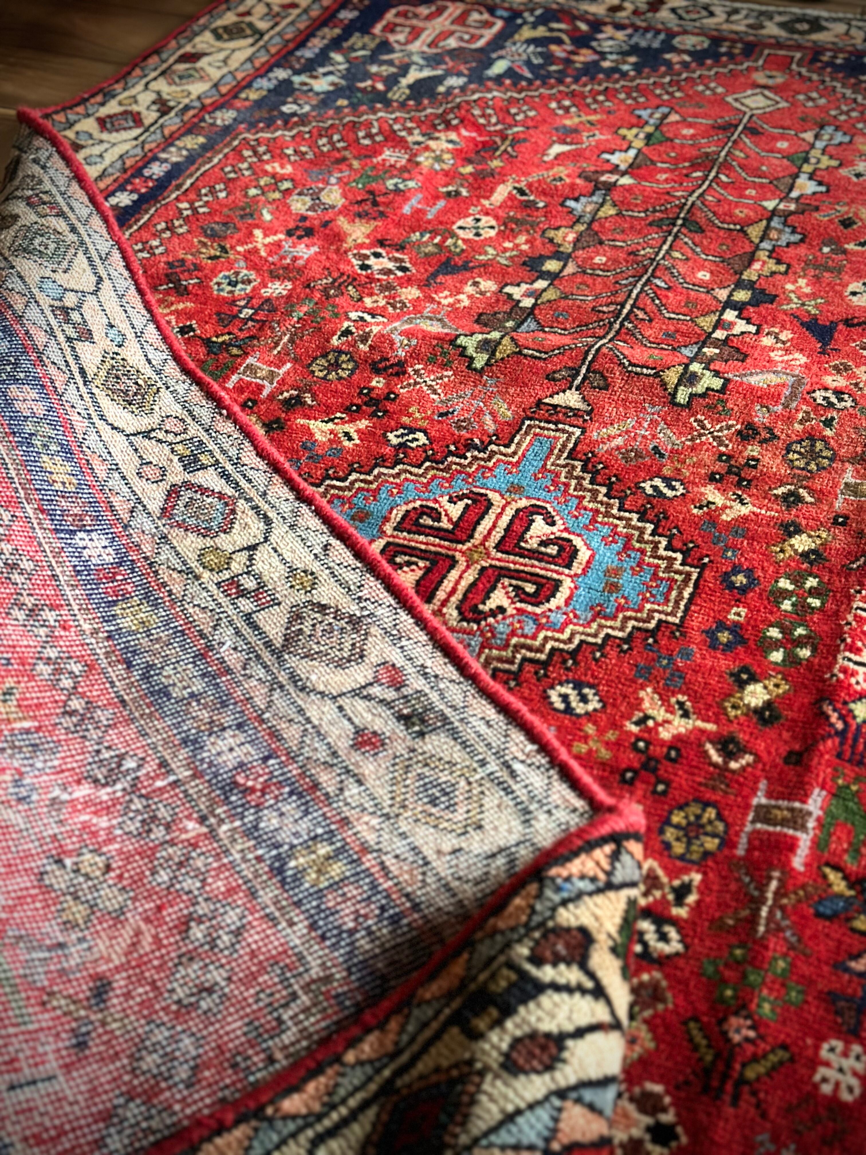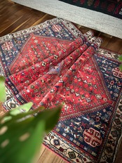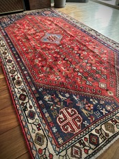 イラン南部の街シラーズから東に位置するアバデらしい色合いで、カシュガイ族の支族であるカシュクリ族が手掛けた細やかな織りのトライバルラグになります。
