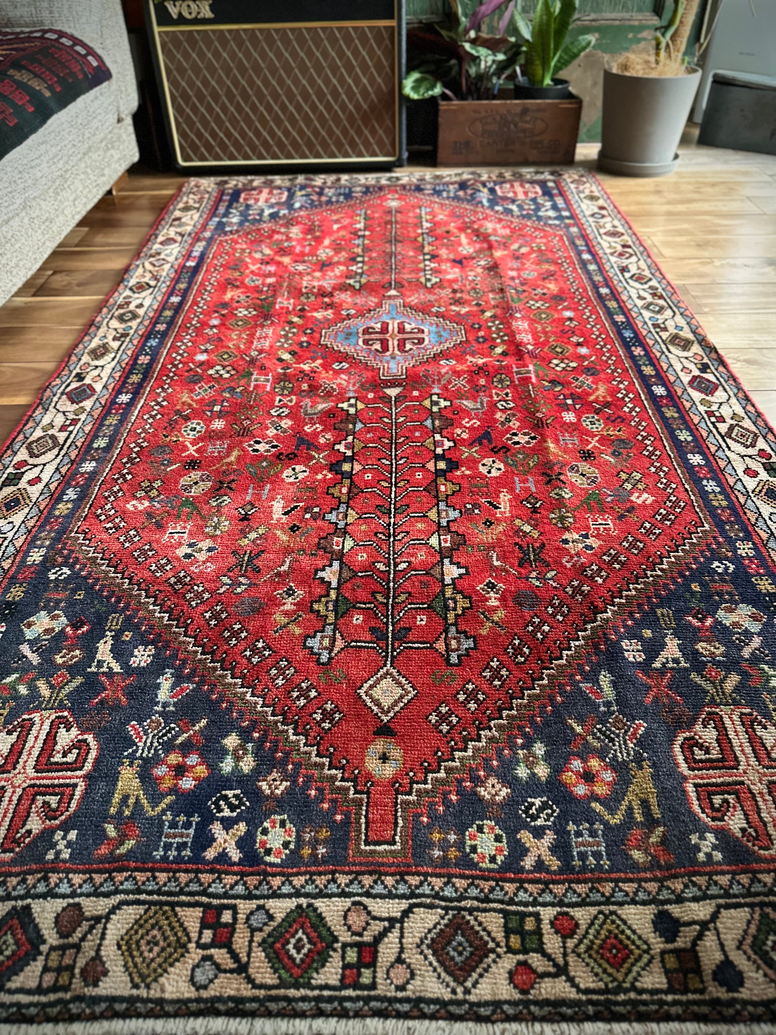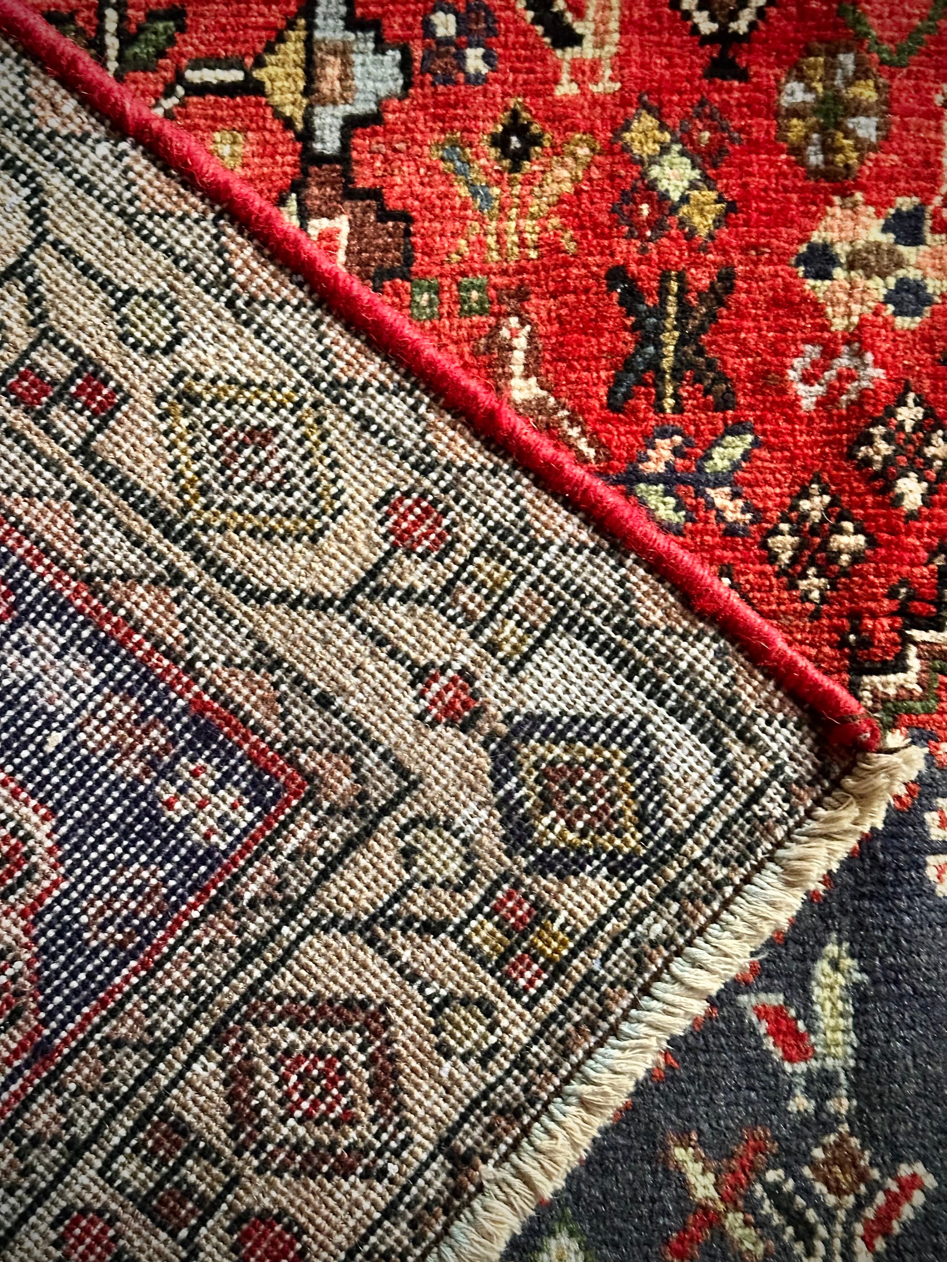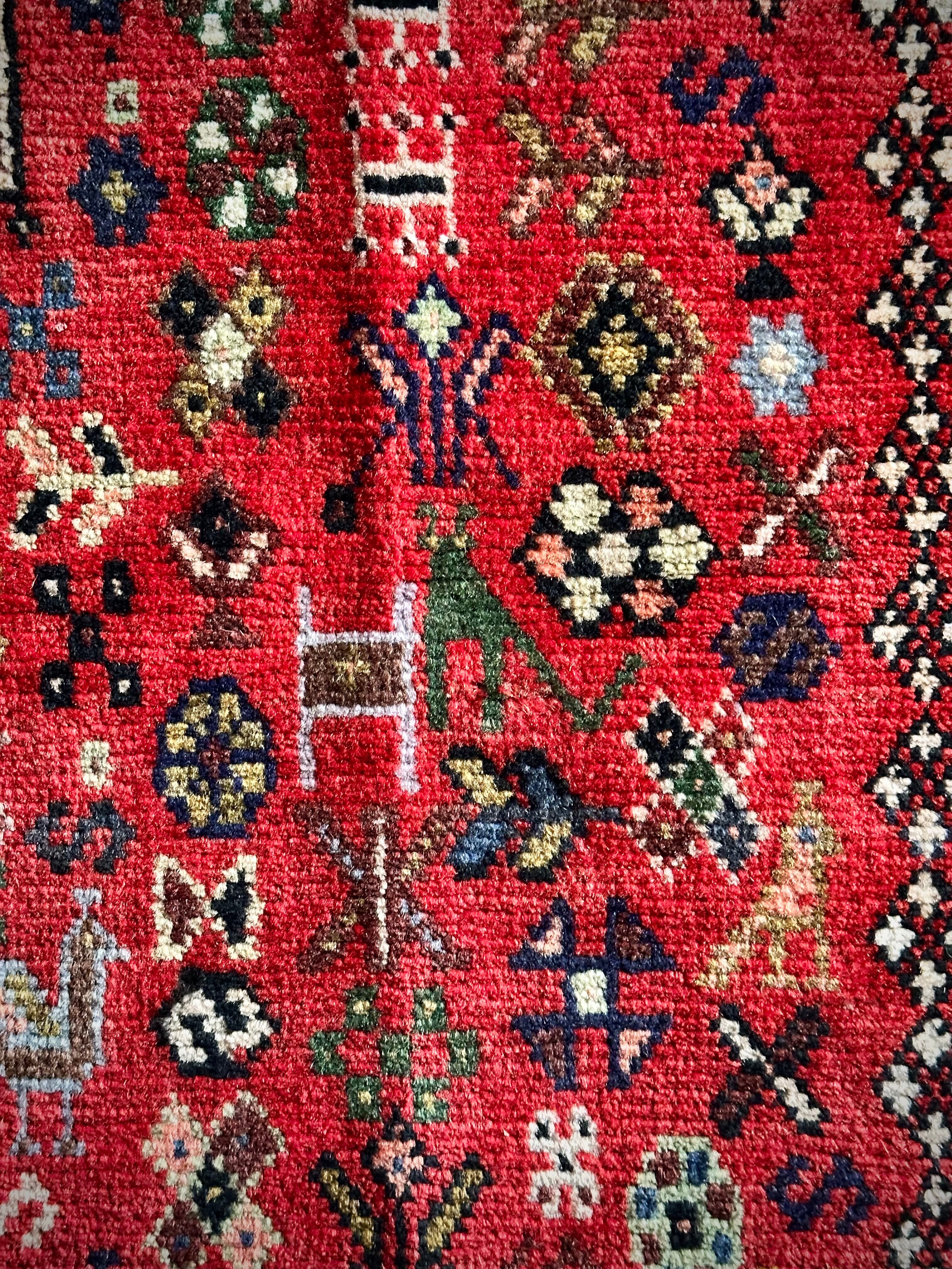 アバデ産によく見られるネイビー&レッドのカラーリングが美しく、カシュクリならではの密度の高い織りに丈夫なコットンの経糸を使用した実用的な1枚で、猫に孔雀に鳥や花などなんとも賑やかな構図が見ていて飽きません。