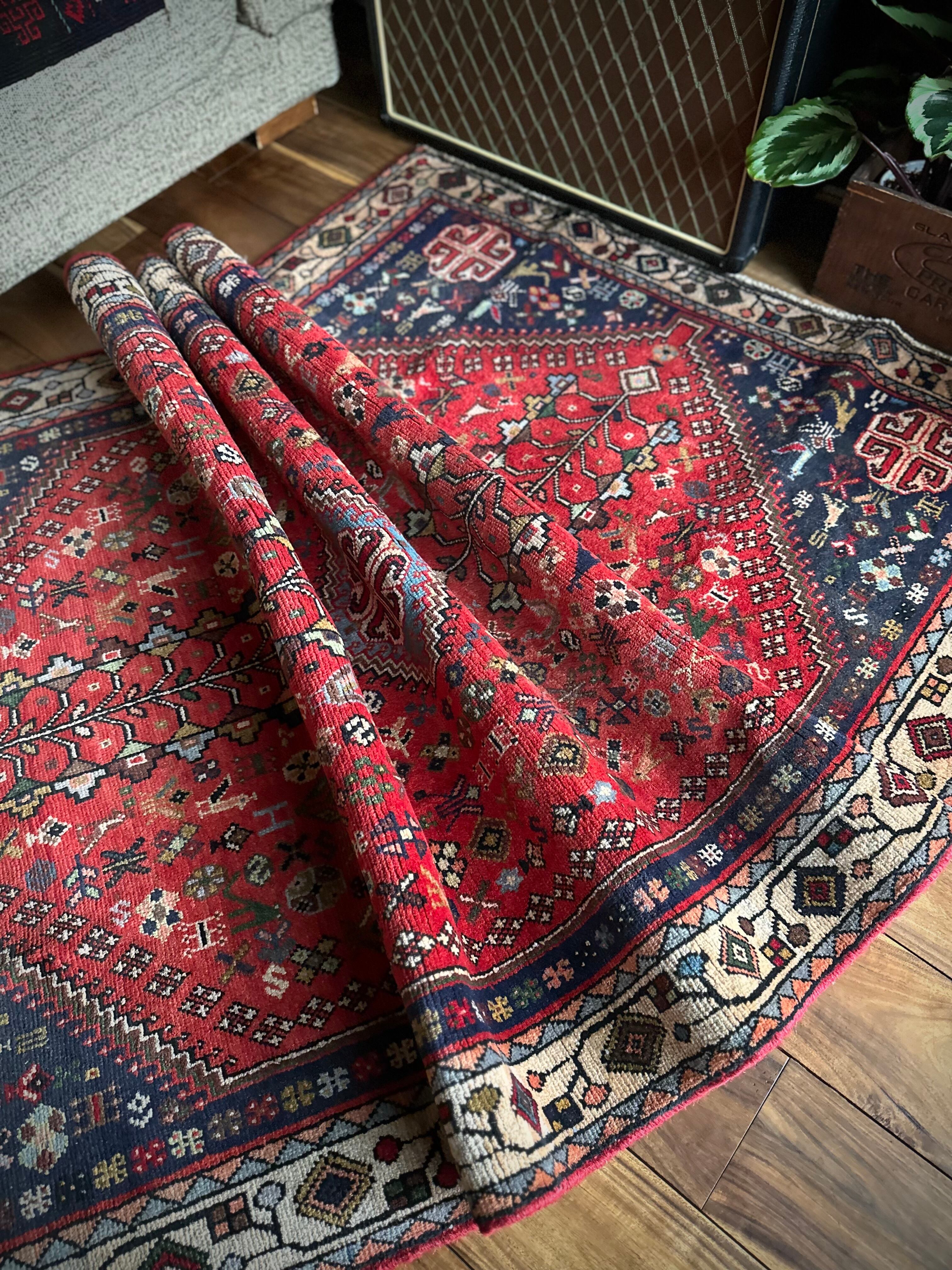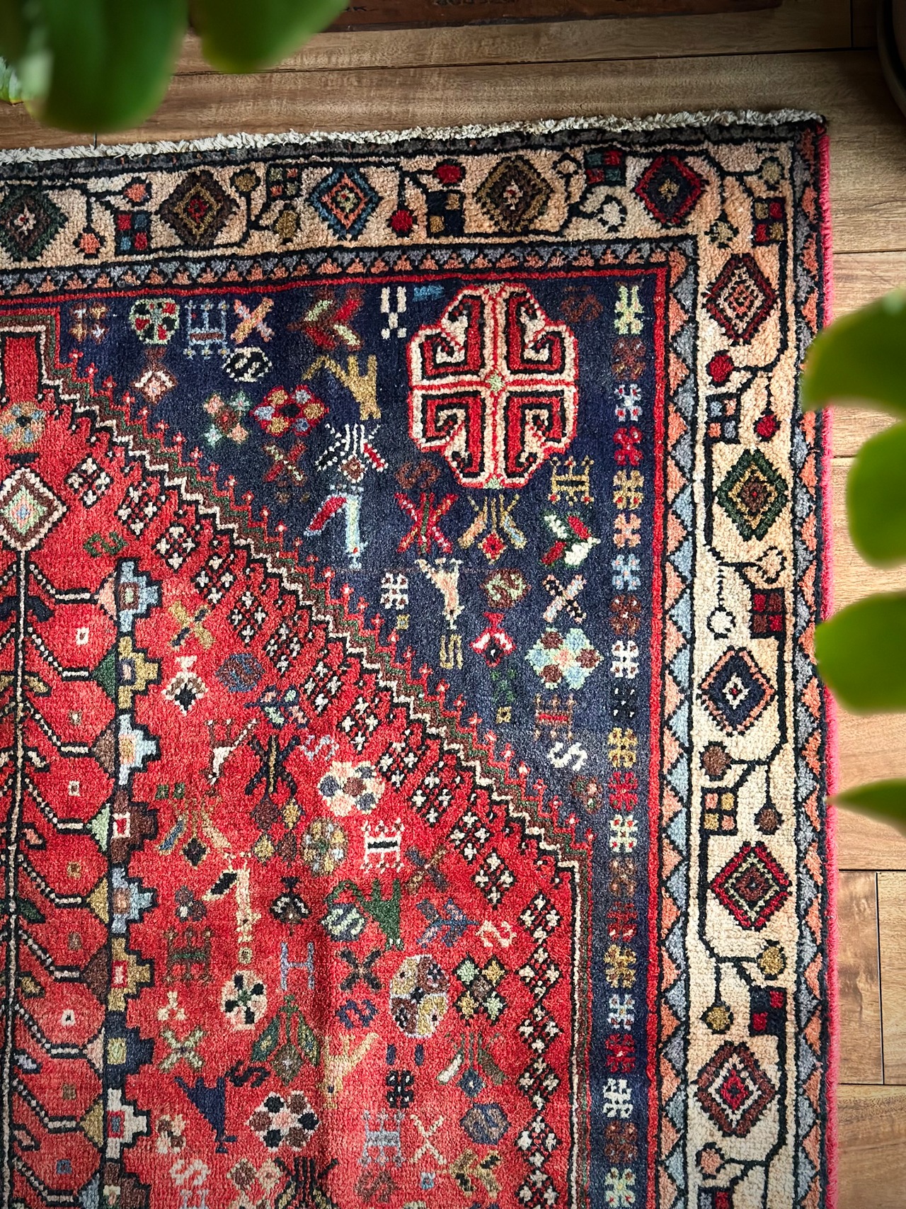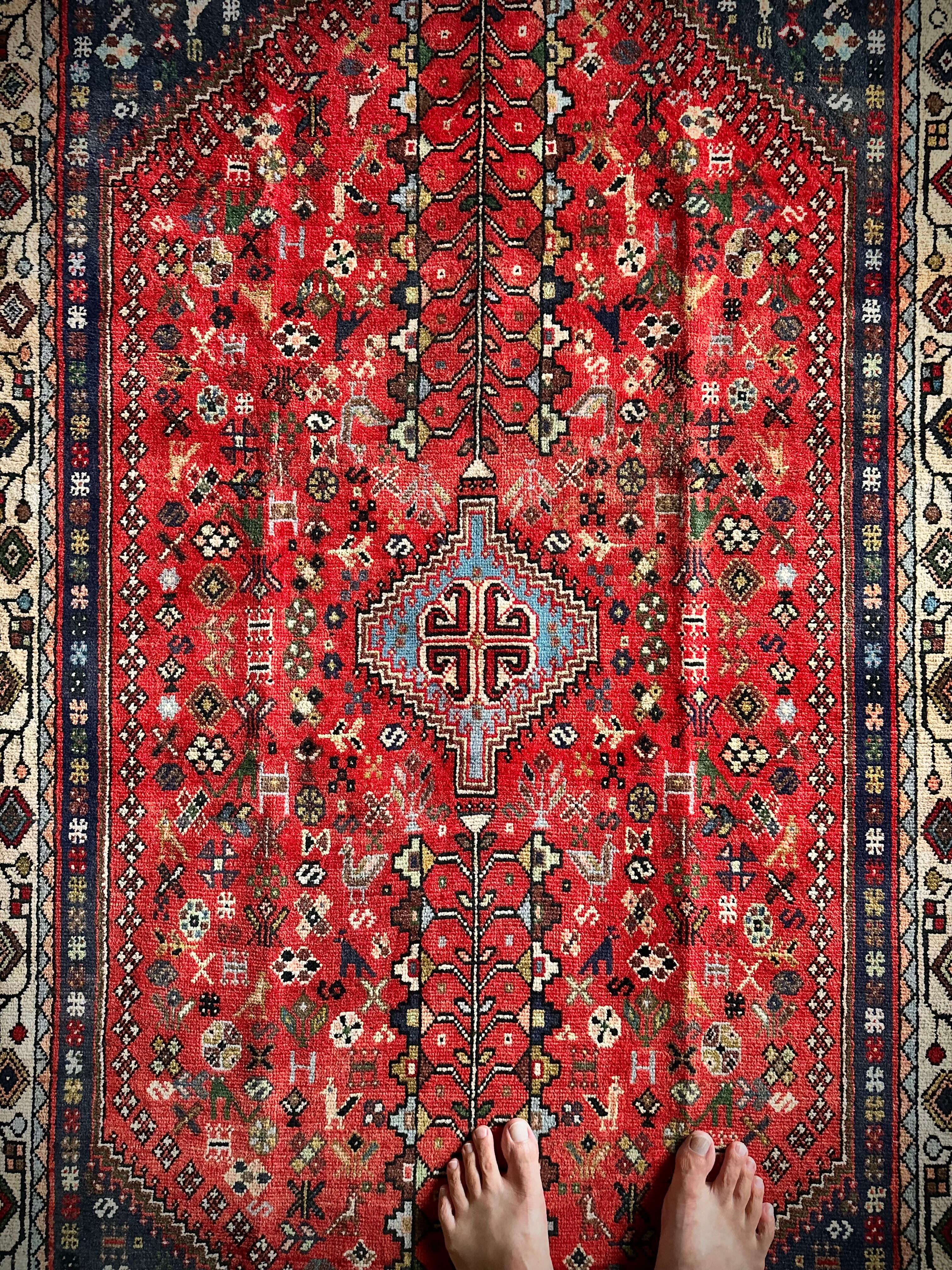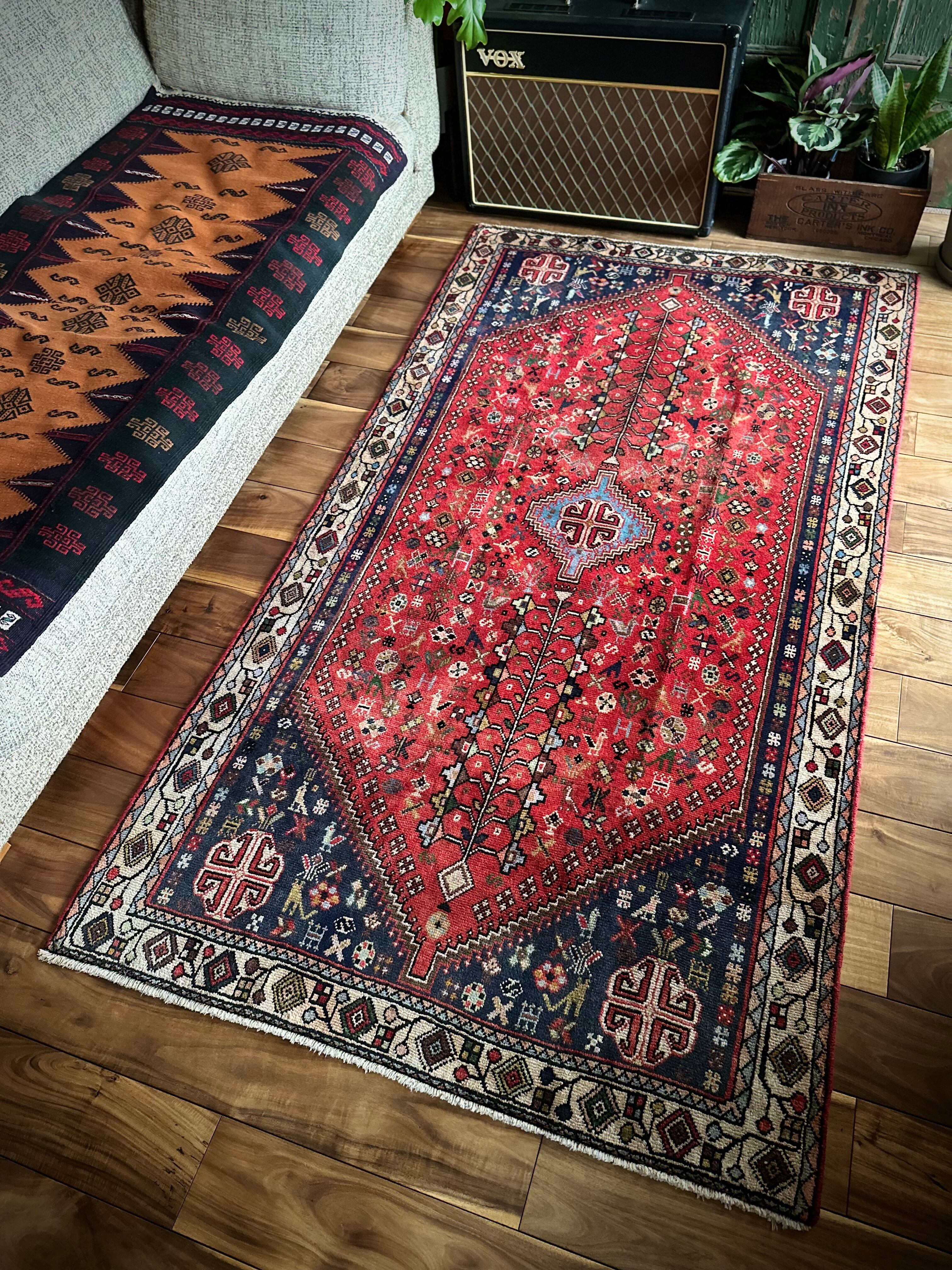 アバデ産によく見られるネイビー&レッドのカラーリングが美しく、カシュクリならではの密度の高い織りに丈夫なコットンの経糸を使用した実用的な1枚で、猫に孔雀に鳥や花などなんとも賑やかな構図が見ていて飽きません。