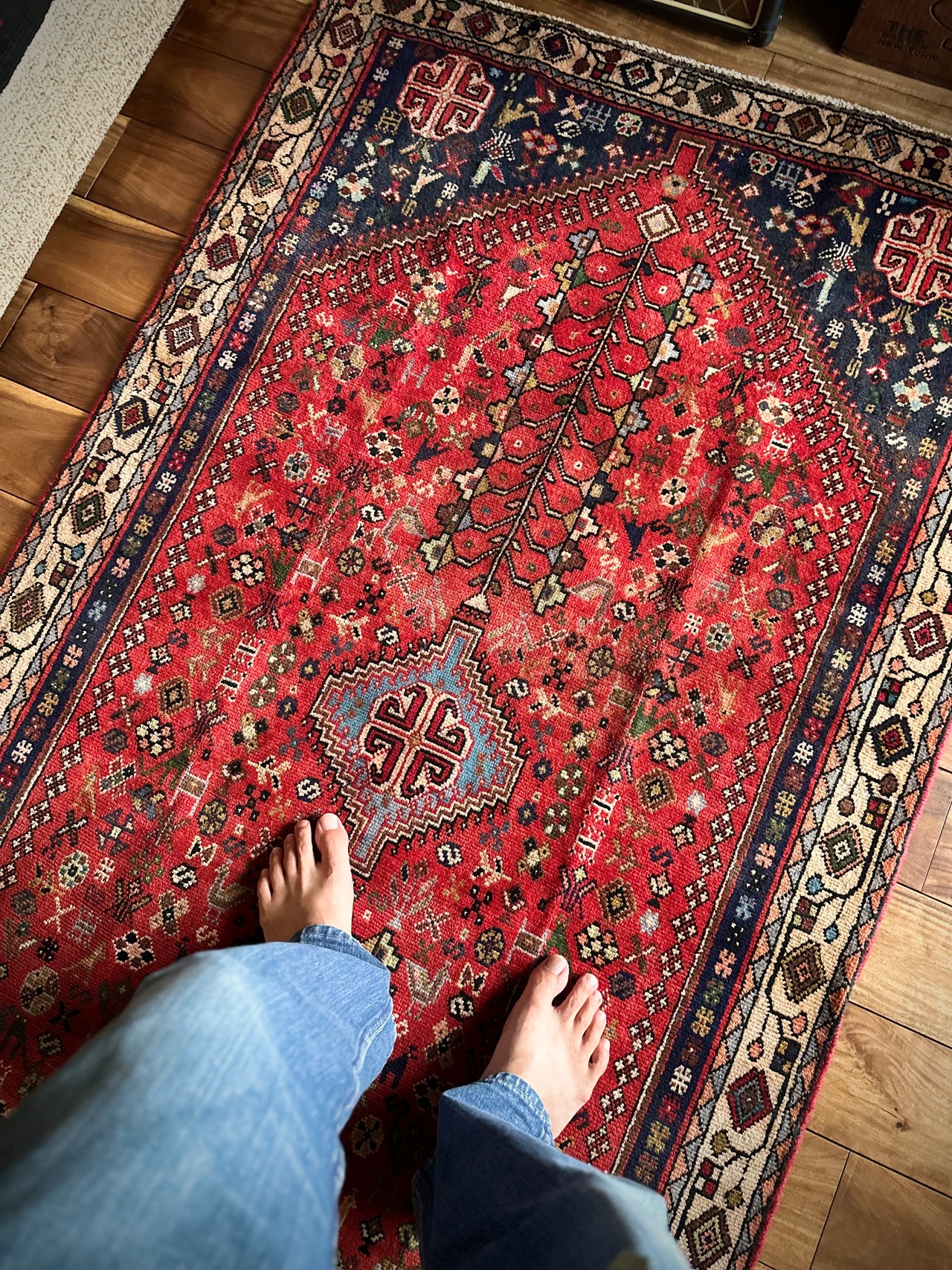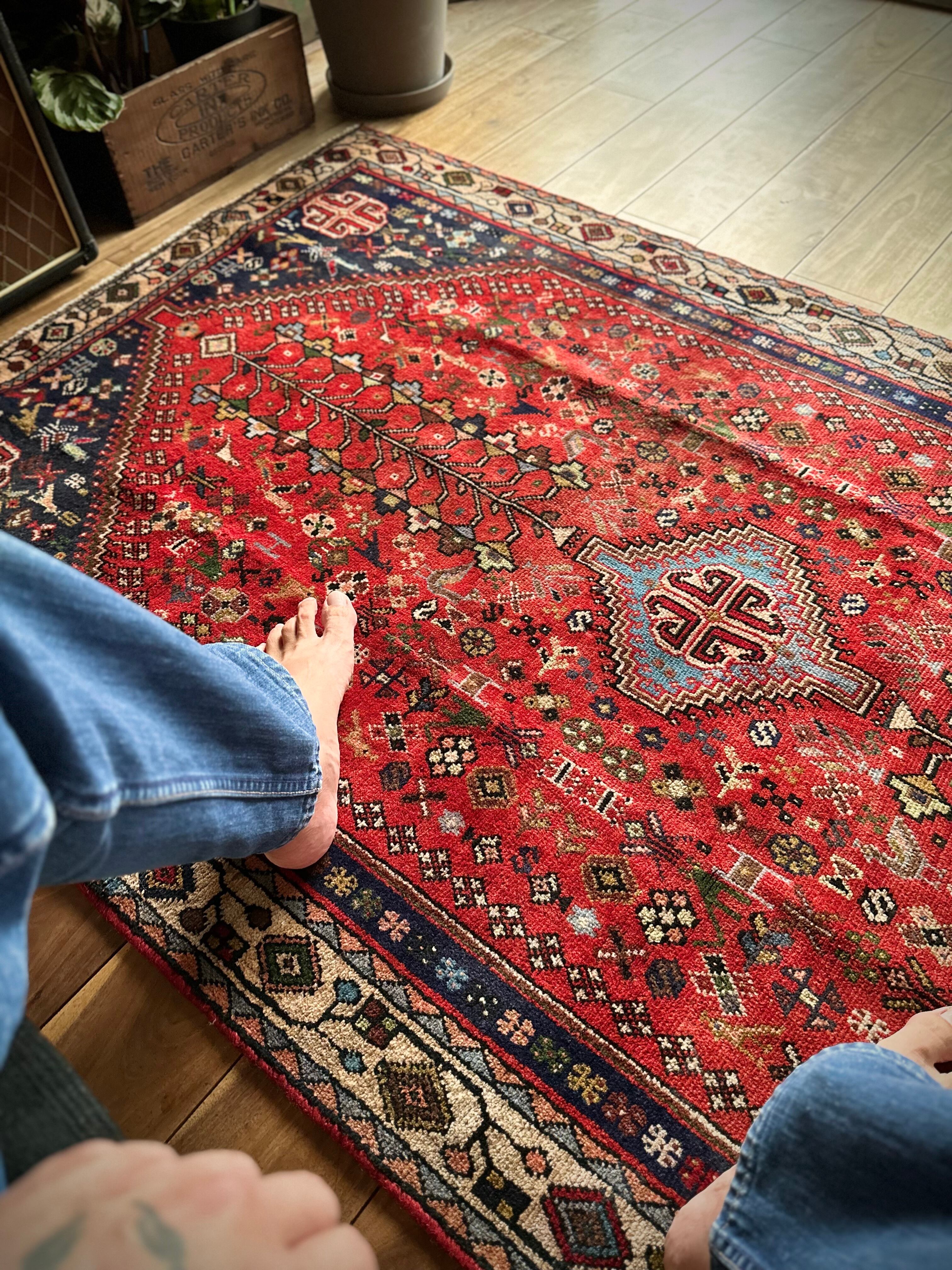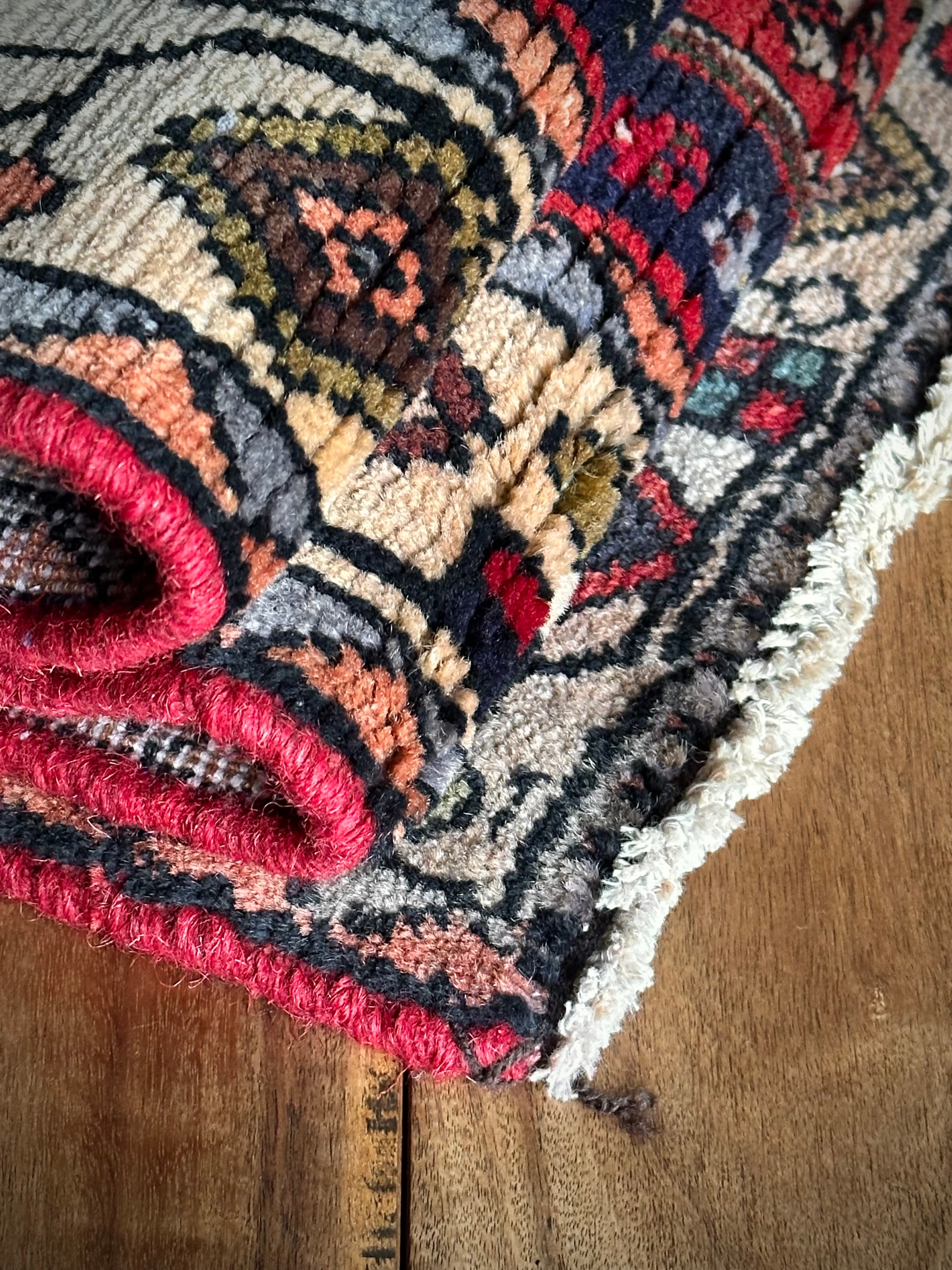 最後にラグそのものに関しては羊毛特有の匂いがあり、採寸は中央付近で計測していますが、手織りならではの歪みによる誤差や水洗いクリーニングによる縮み、また草木染めによる経年劣化の色ムラなどがありますが、それもまたヴィンテージラグの魅力かとご理解ください。
