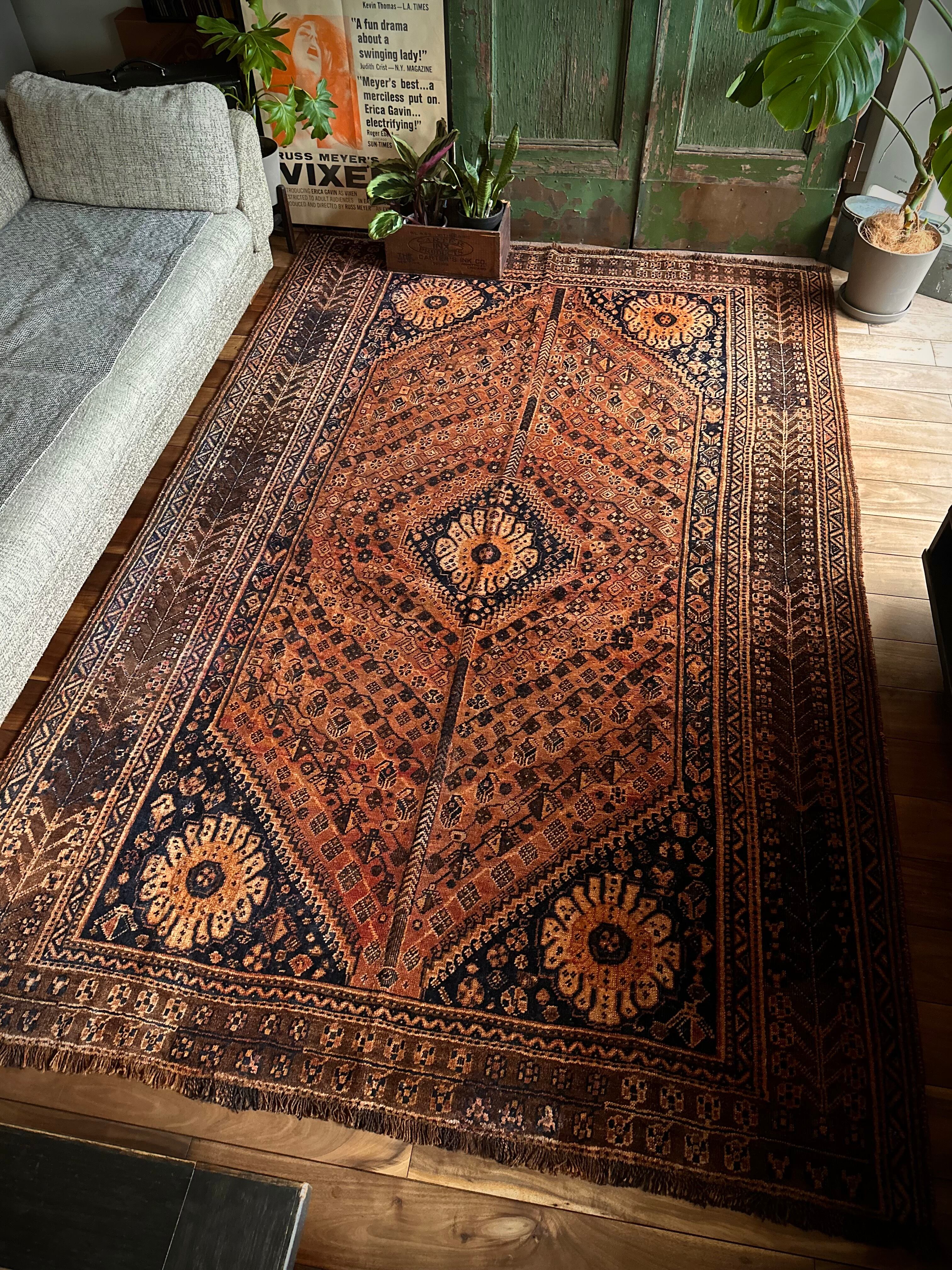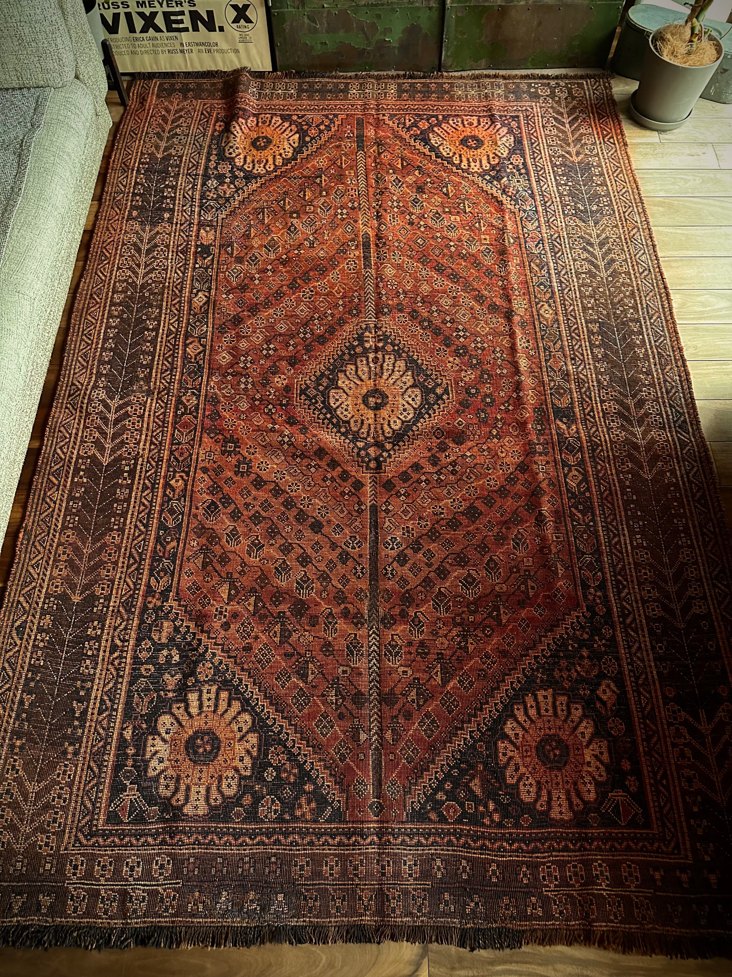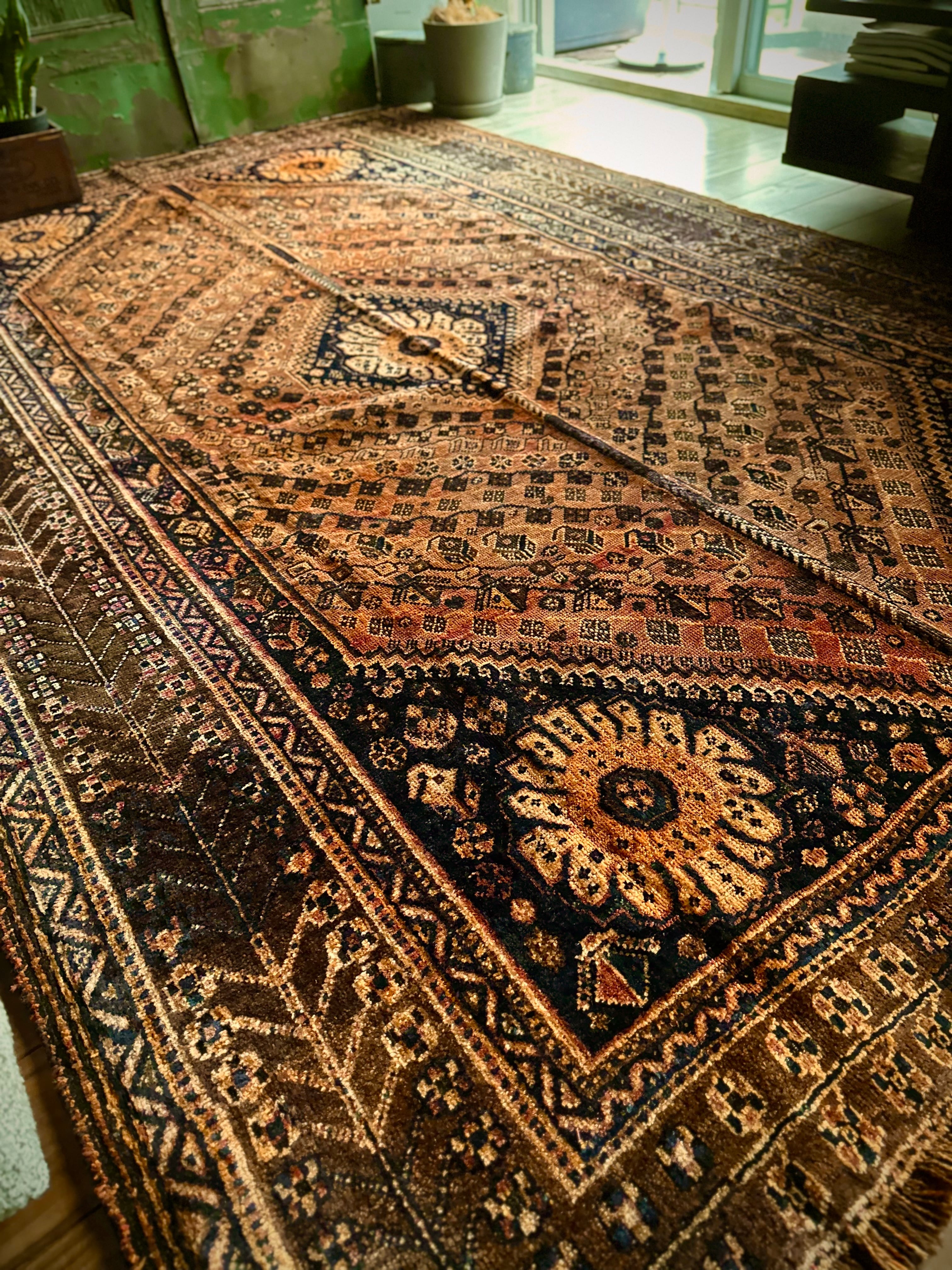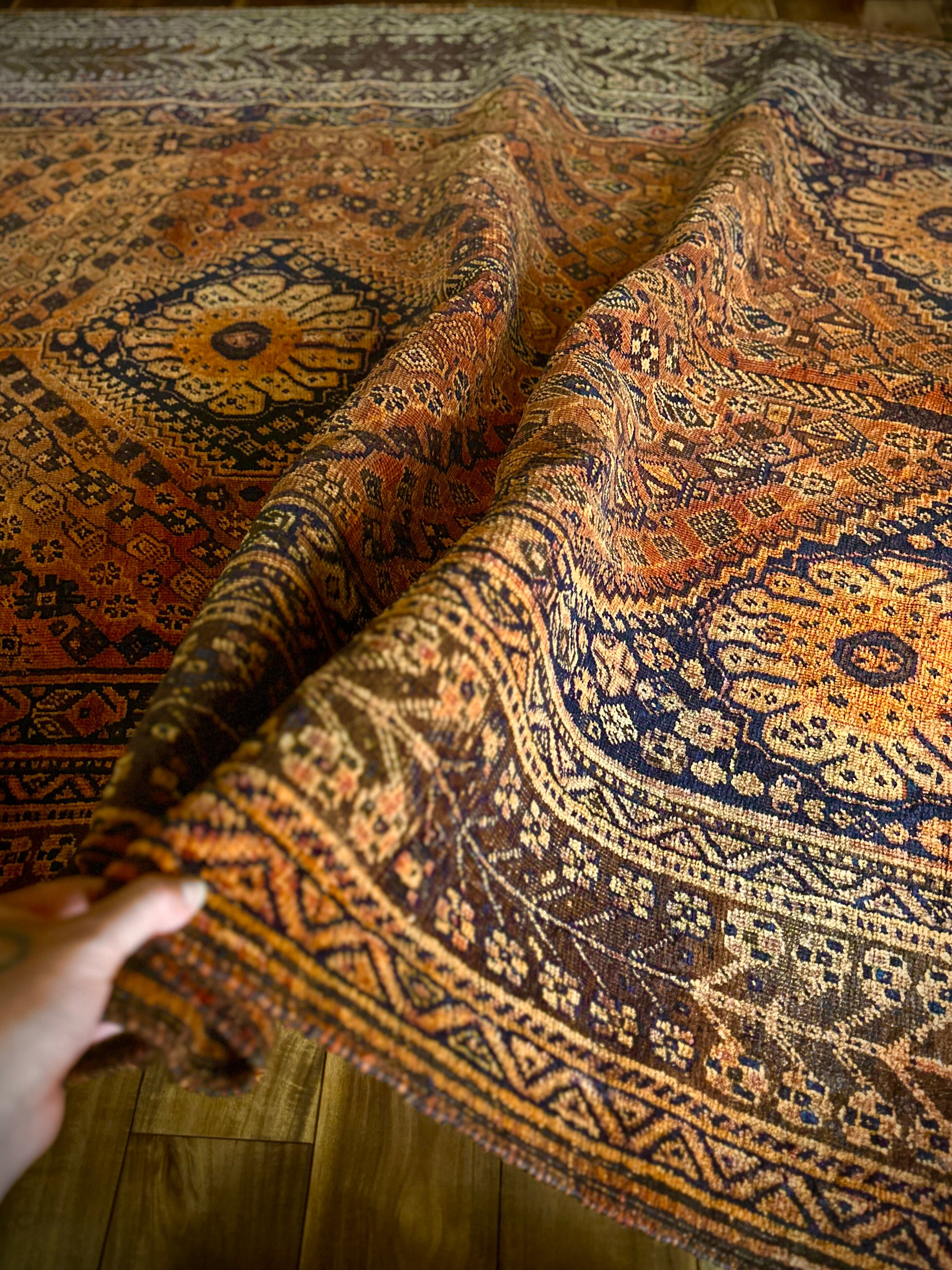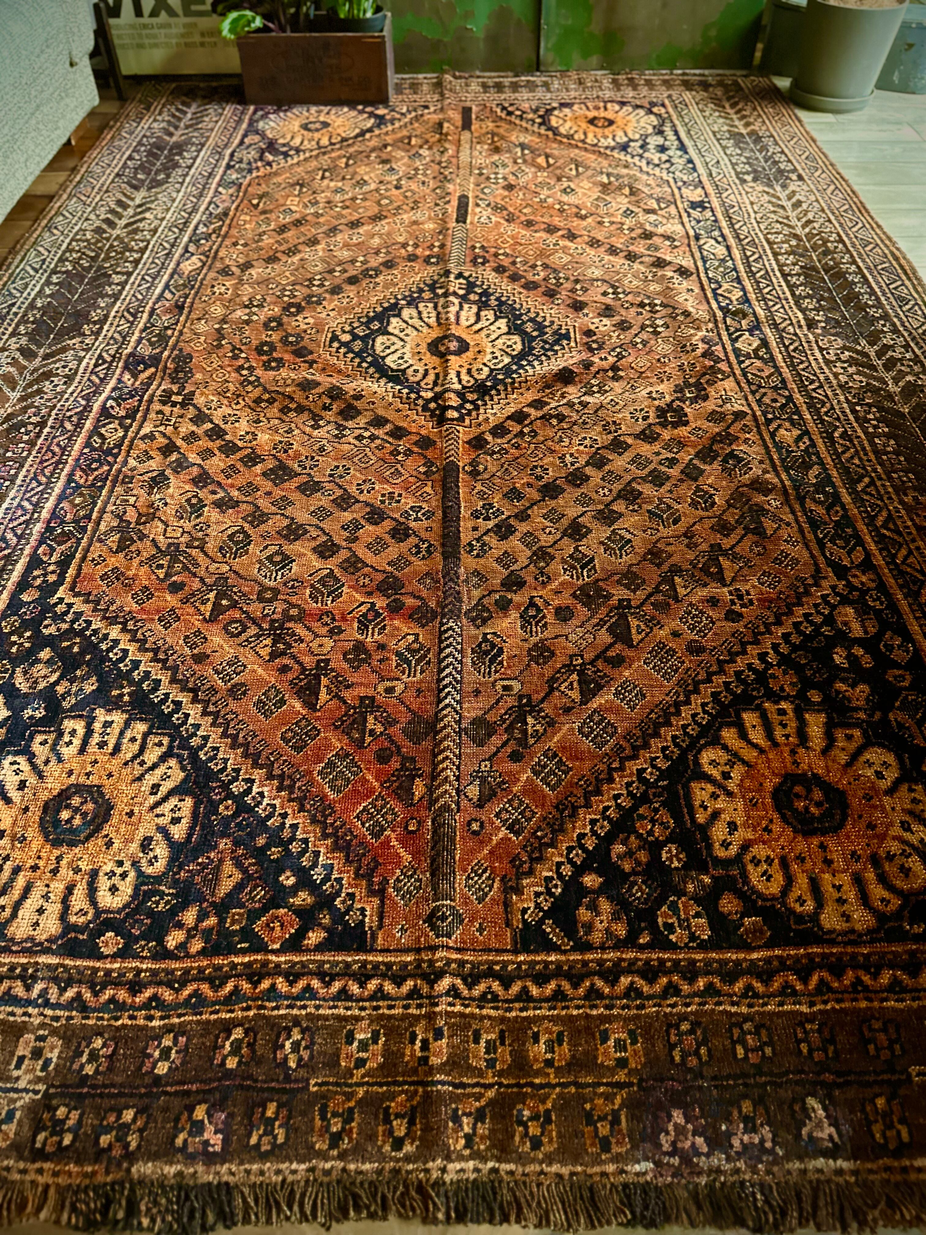 見るからの大判サイズで自宅での撮影に限界を感じるこちらは、オールドならではの色褪せ感がオレンジ・ゴールドに輝く、イラン南部のシラーズ周辺に居住するカシュガイ族の支族であるカシュクリ族のトライバルラグになります。