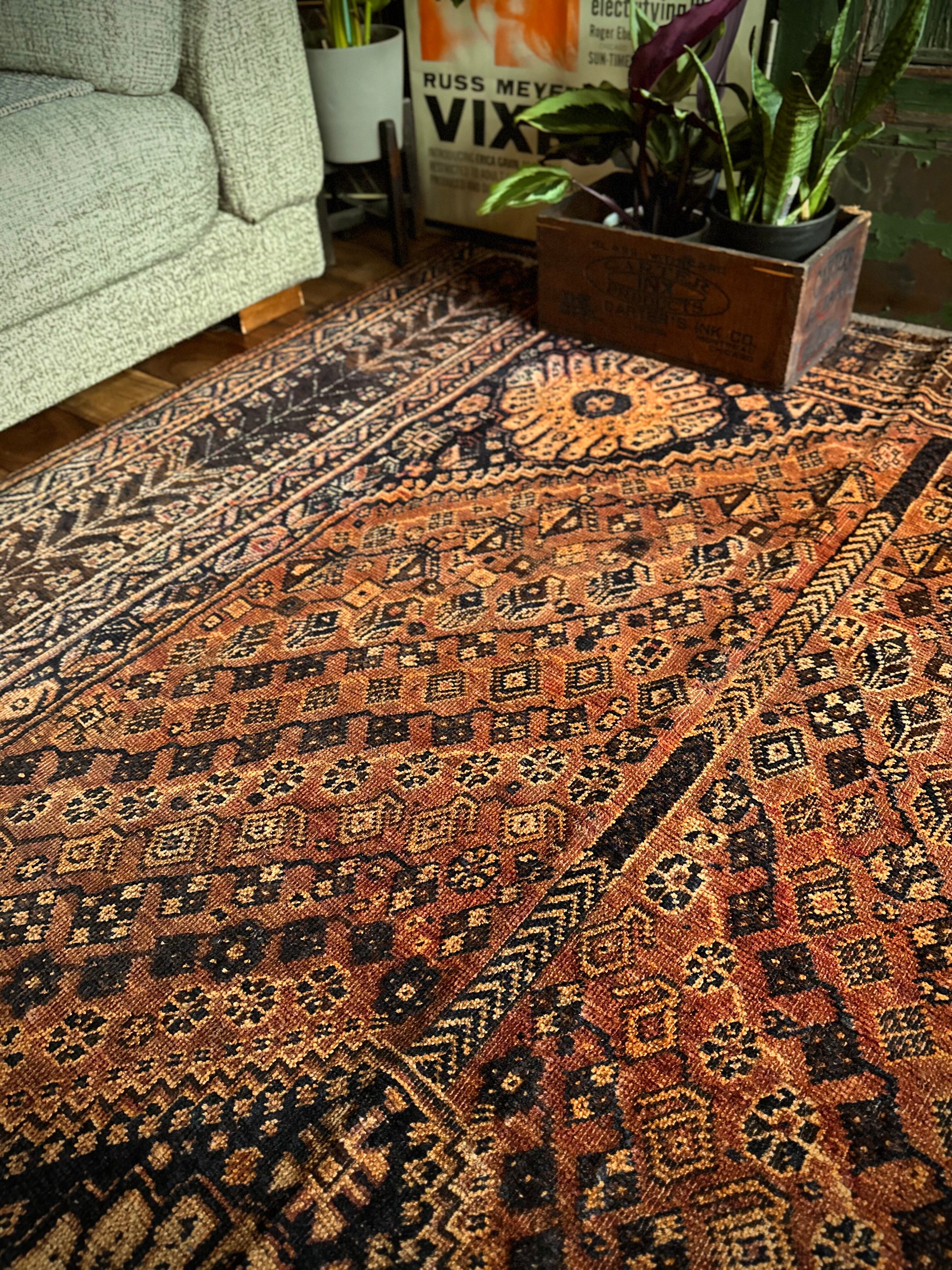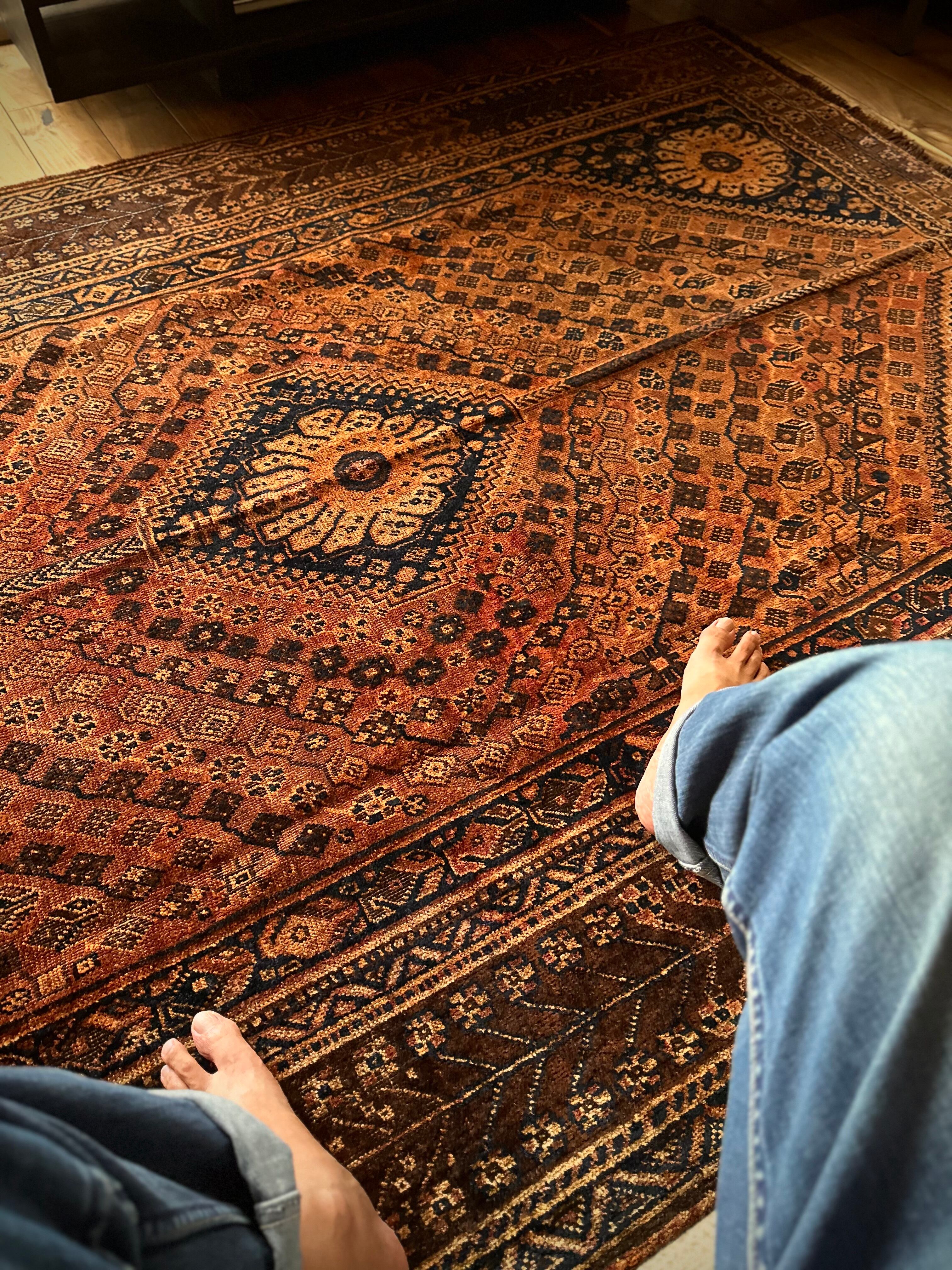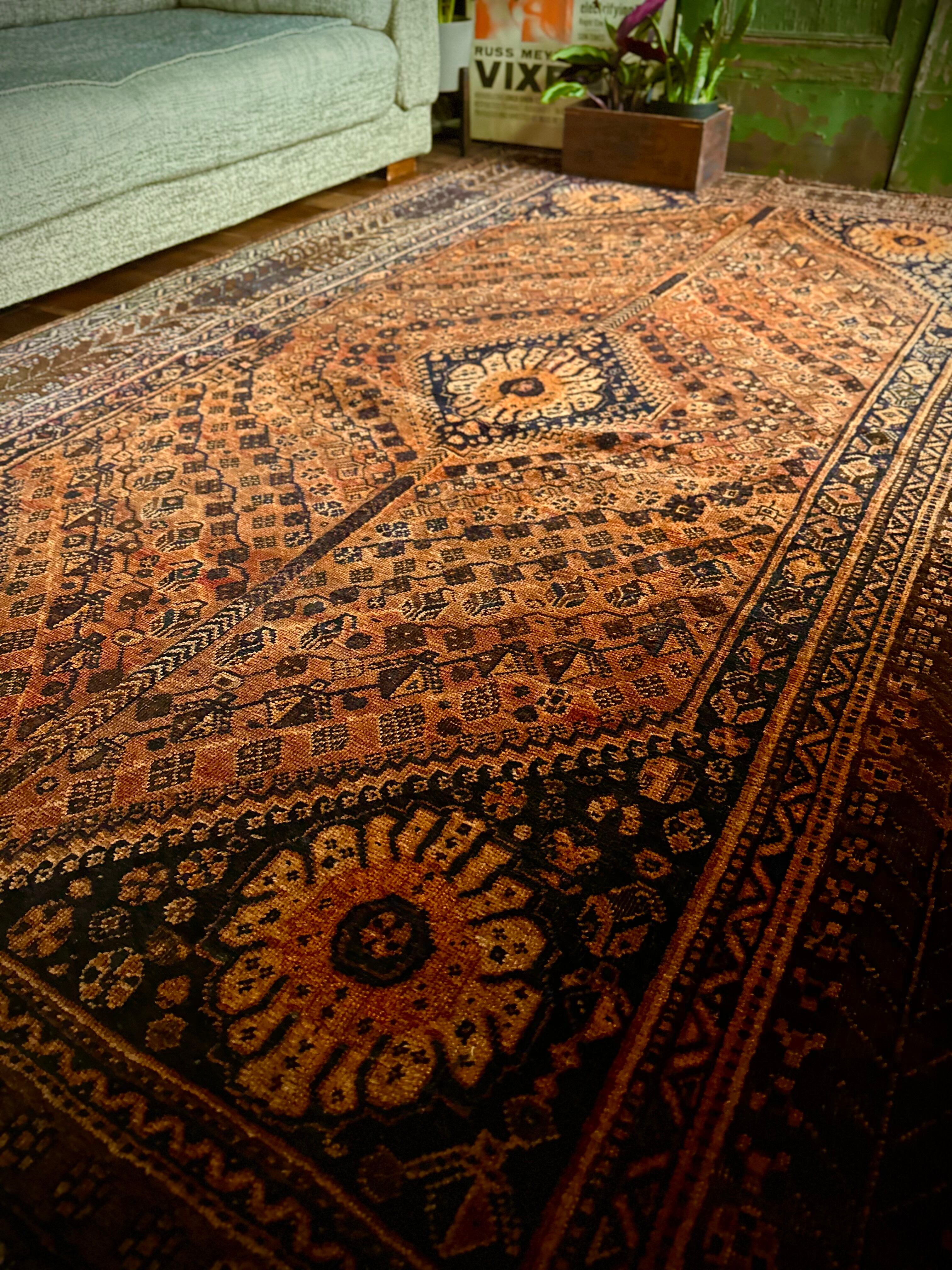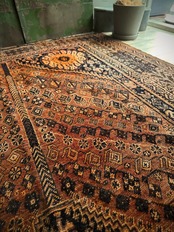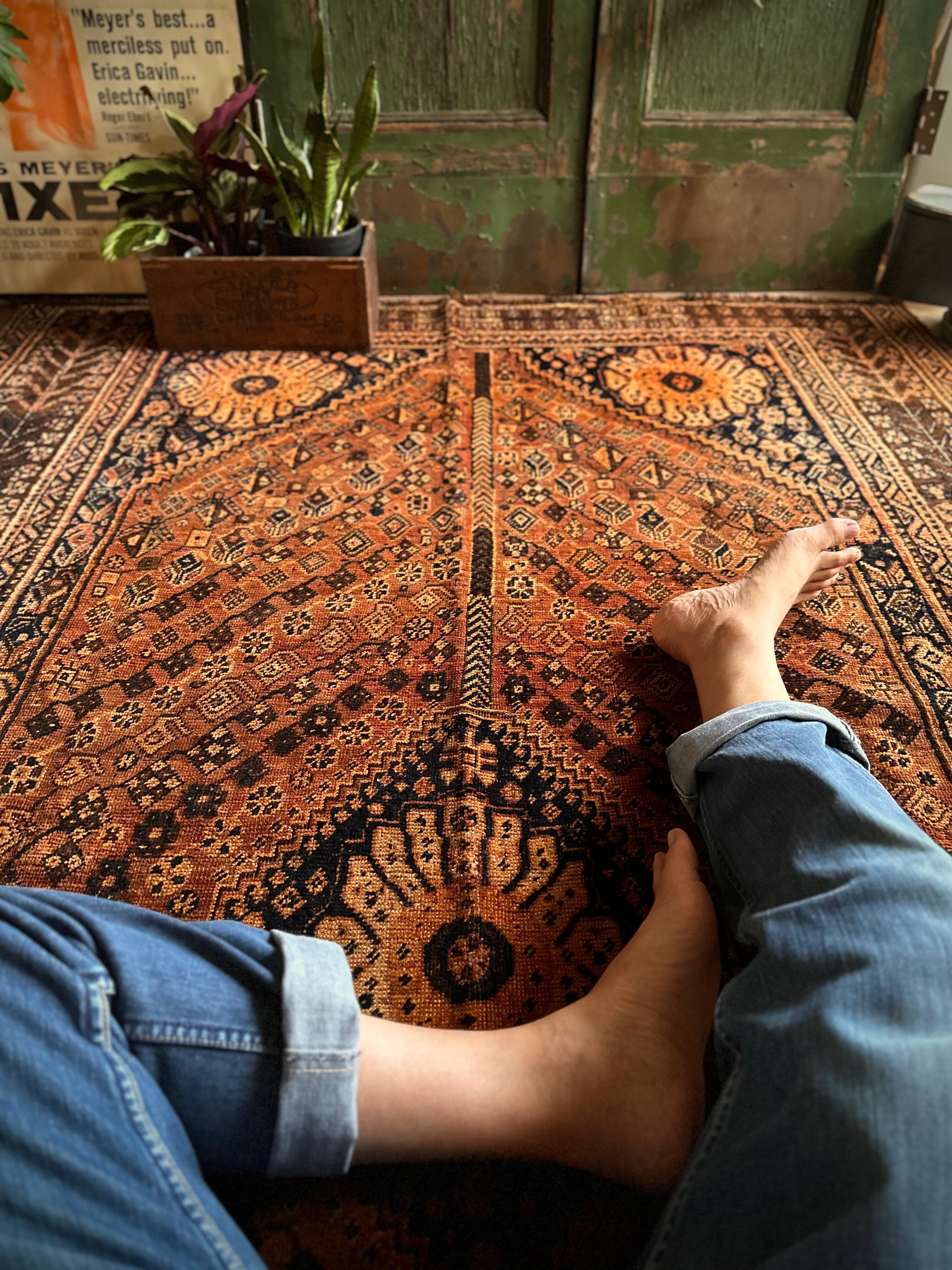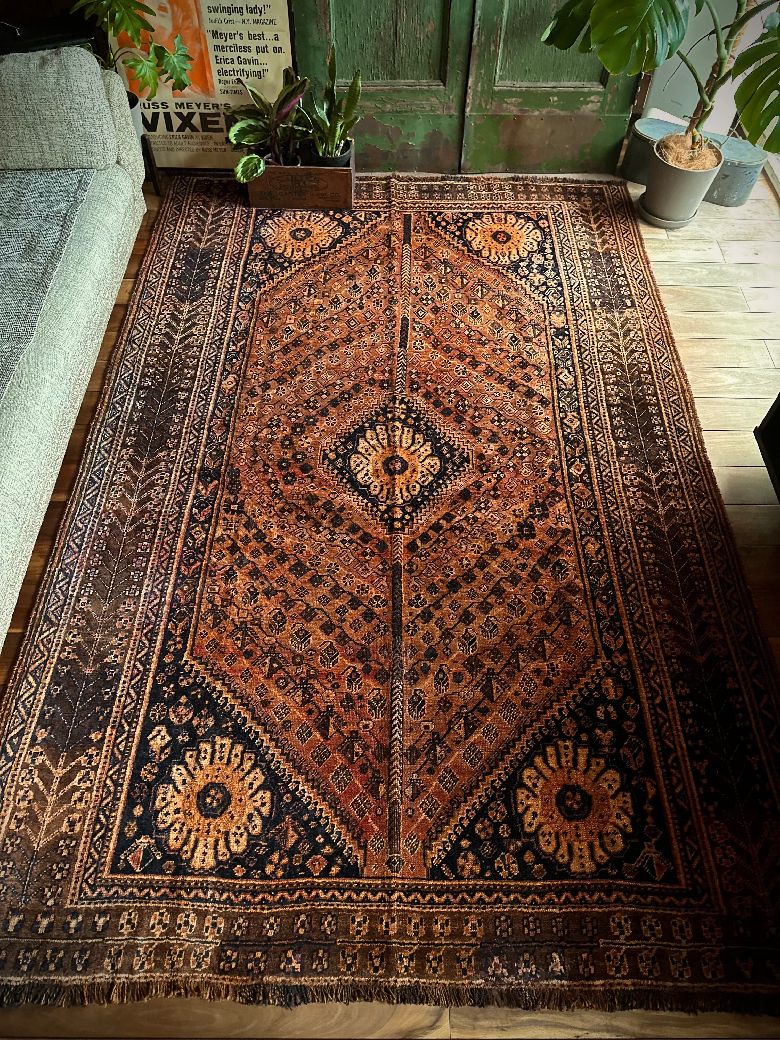 見るからの大判サイズで自宅での撮影に限界を感じるこちらは、オールドならではの色褪せ感がオレンジ・ゴールドに輝く、イラン南部のシラーズ周辺に居住するカシュガイ族の支族であるカシュクリ族のトライバルラグになります。