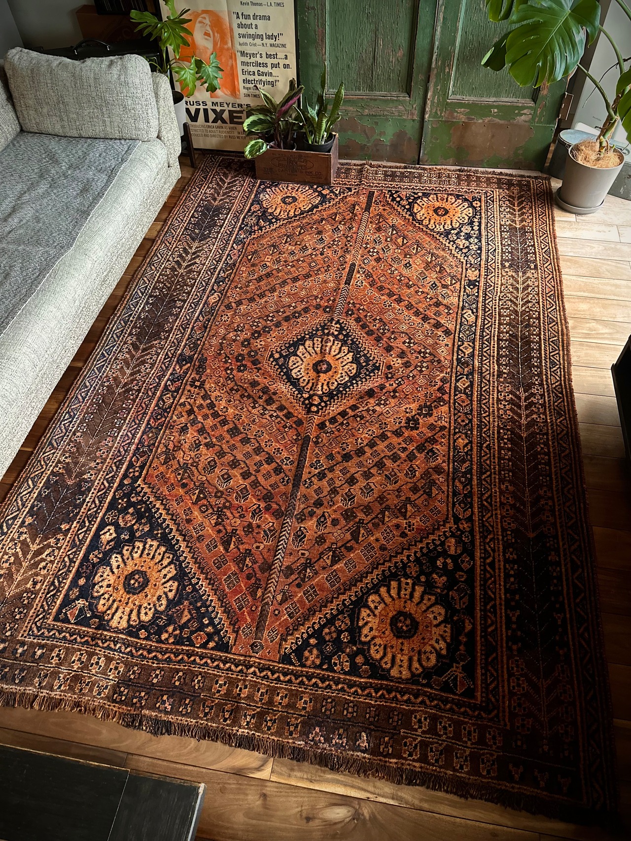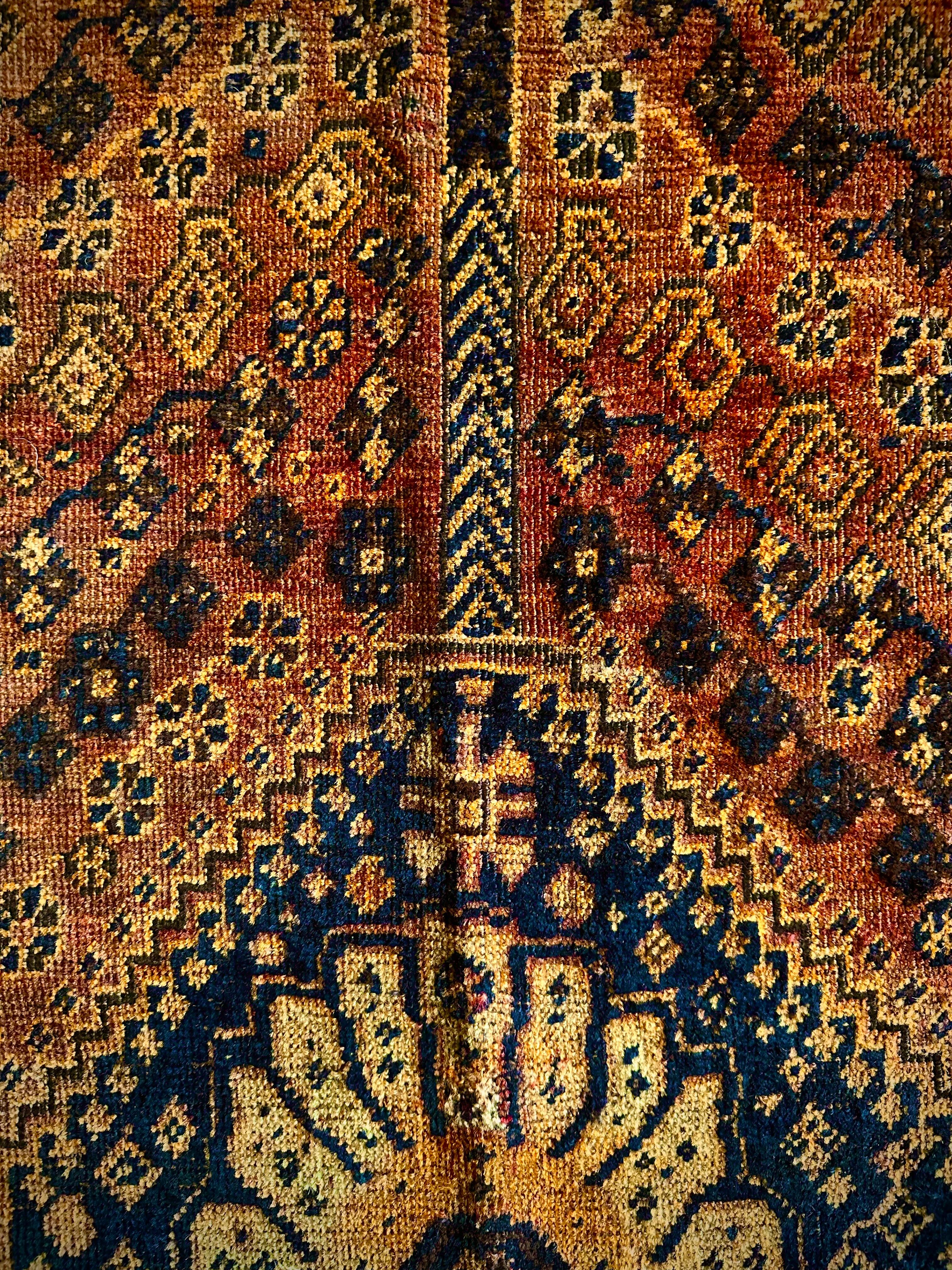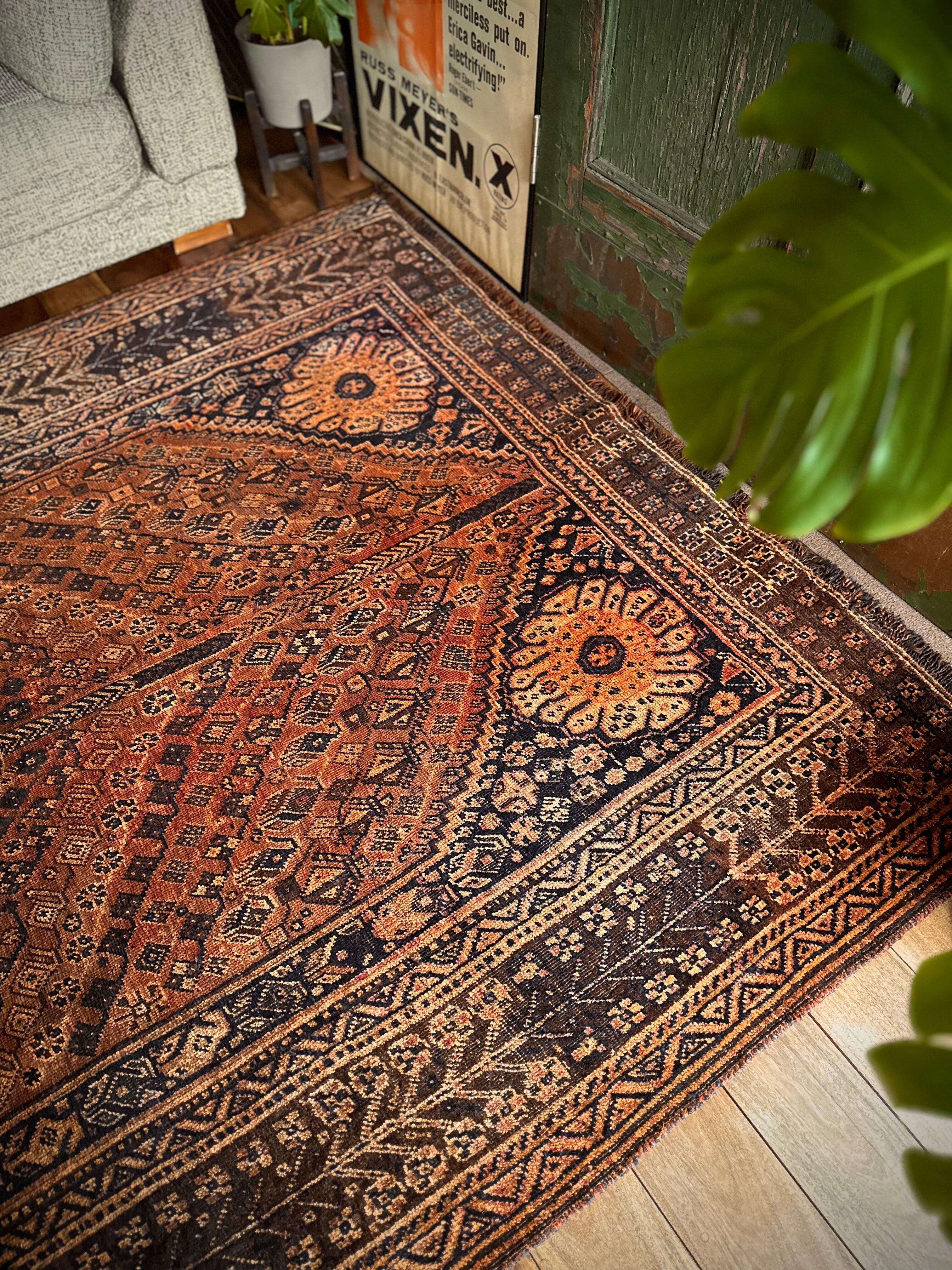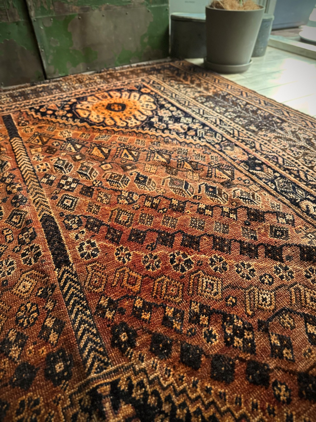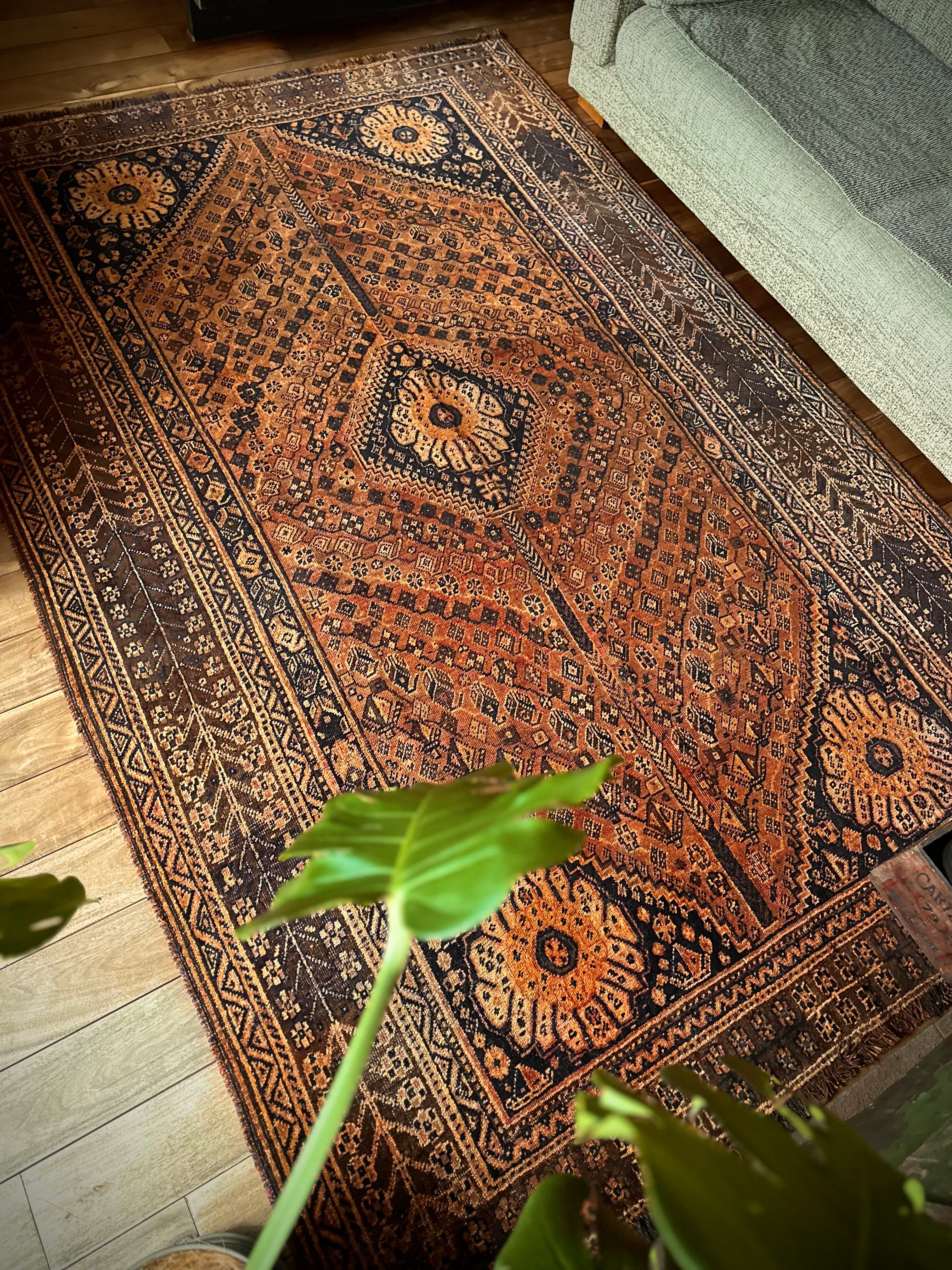 見るからの大判サイズで自宅での撮影に限界を感じるこちらは、オールドならではの色褪せ感がオレンジ・ゴールドに輝く、イラン南部のシラーズ周辺に居住するカシュガイ族の支族であるカシュクリ族のトライバルラグになります。