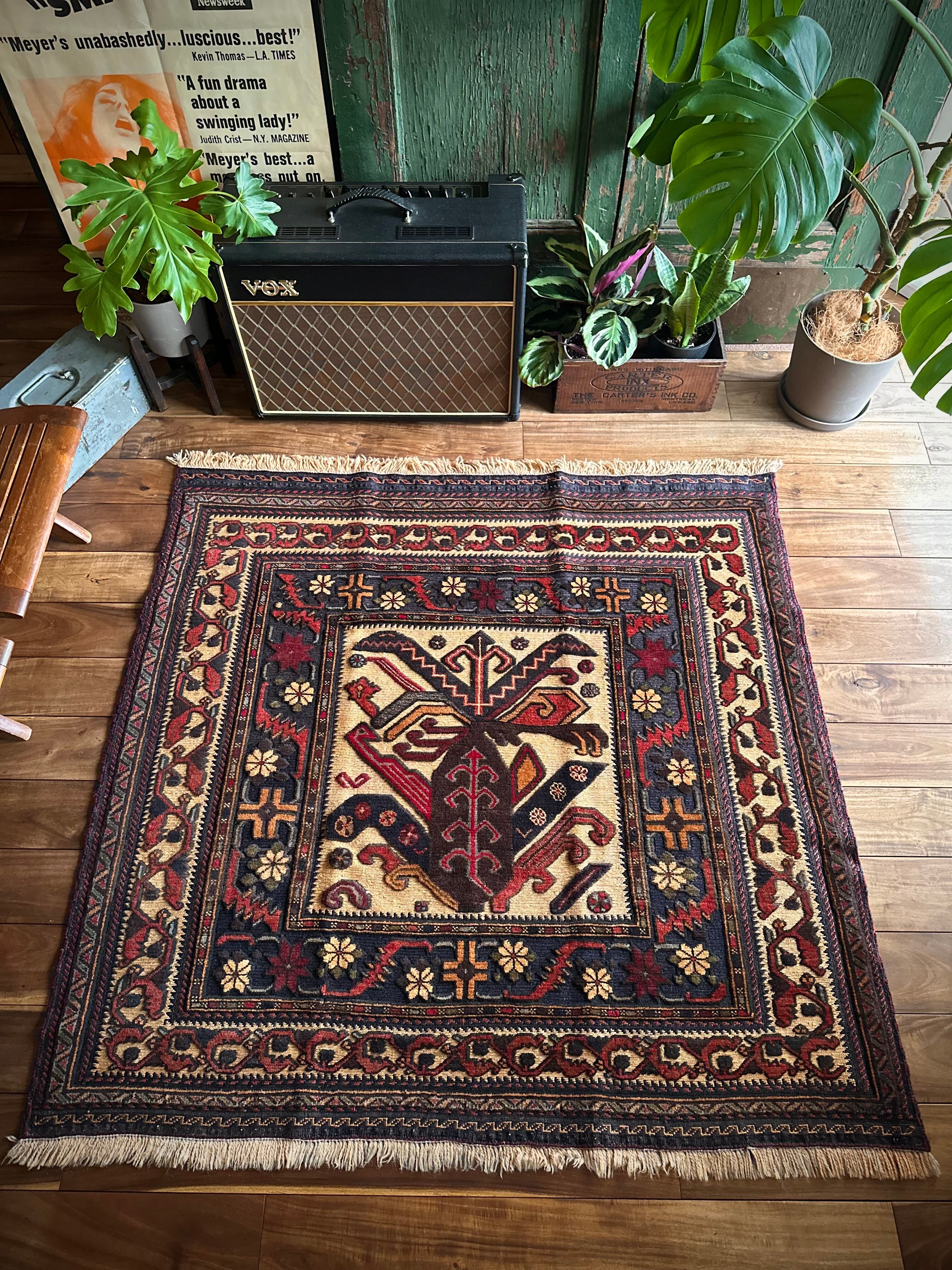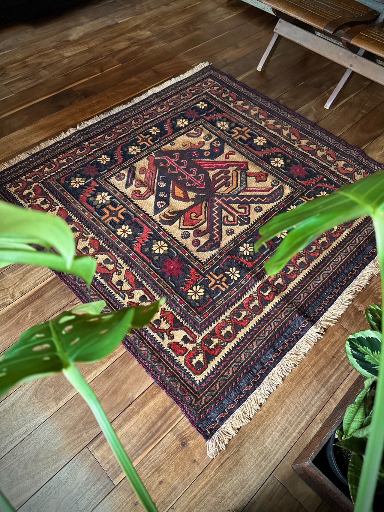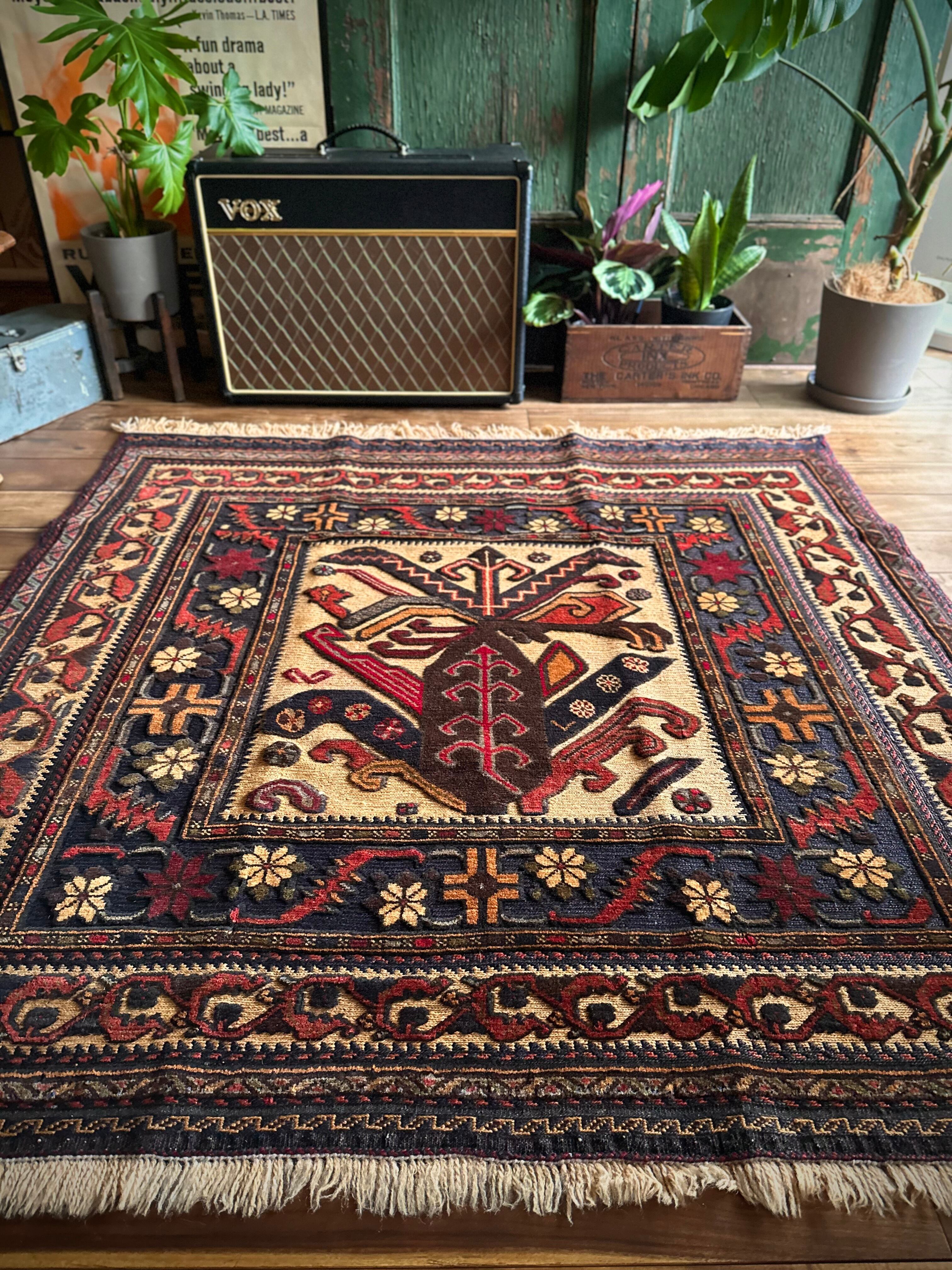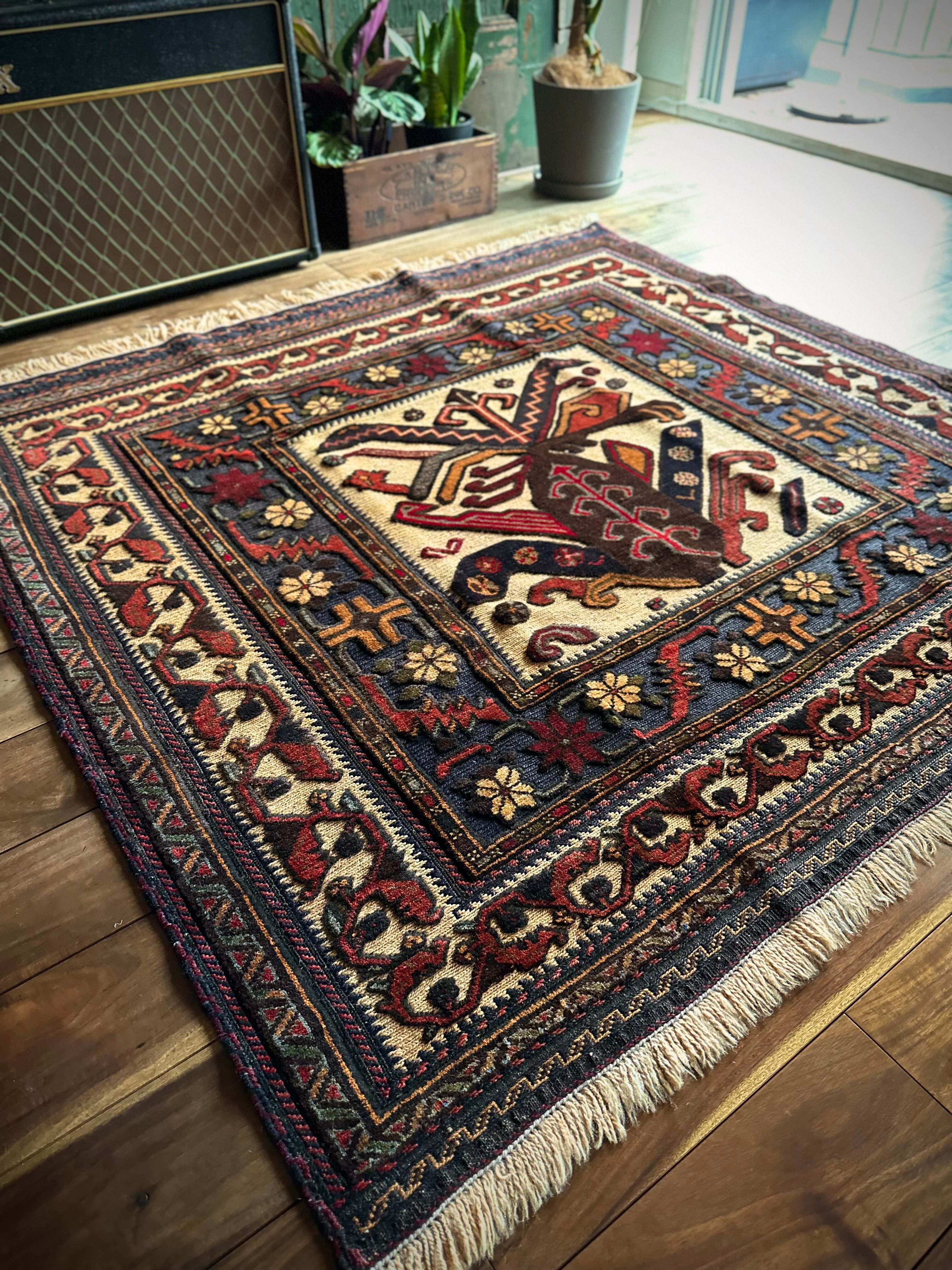 ほぼ正方形に近い珍しい柄のこちらは、アフガニスタンはヘラート州の山岳地帯に居住するタイマニ族のトライバルラグで、彼ら独特のプリミティブ感満載の荒々しいスタイルとは一線を画した、非常に繊細な織りのキリムっぽいラグになります。