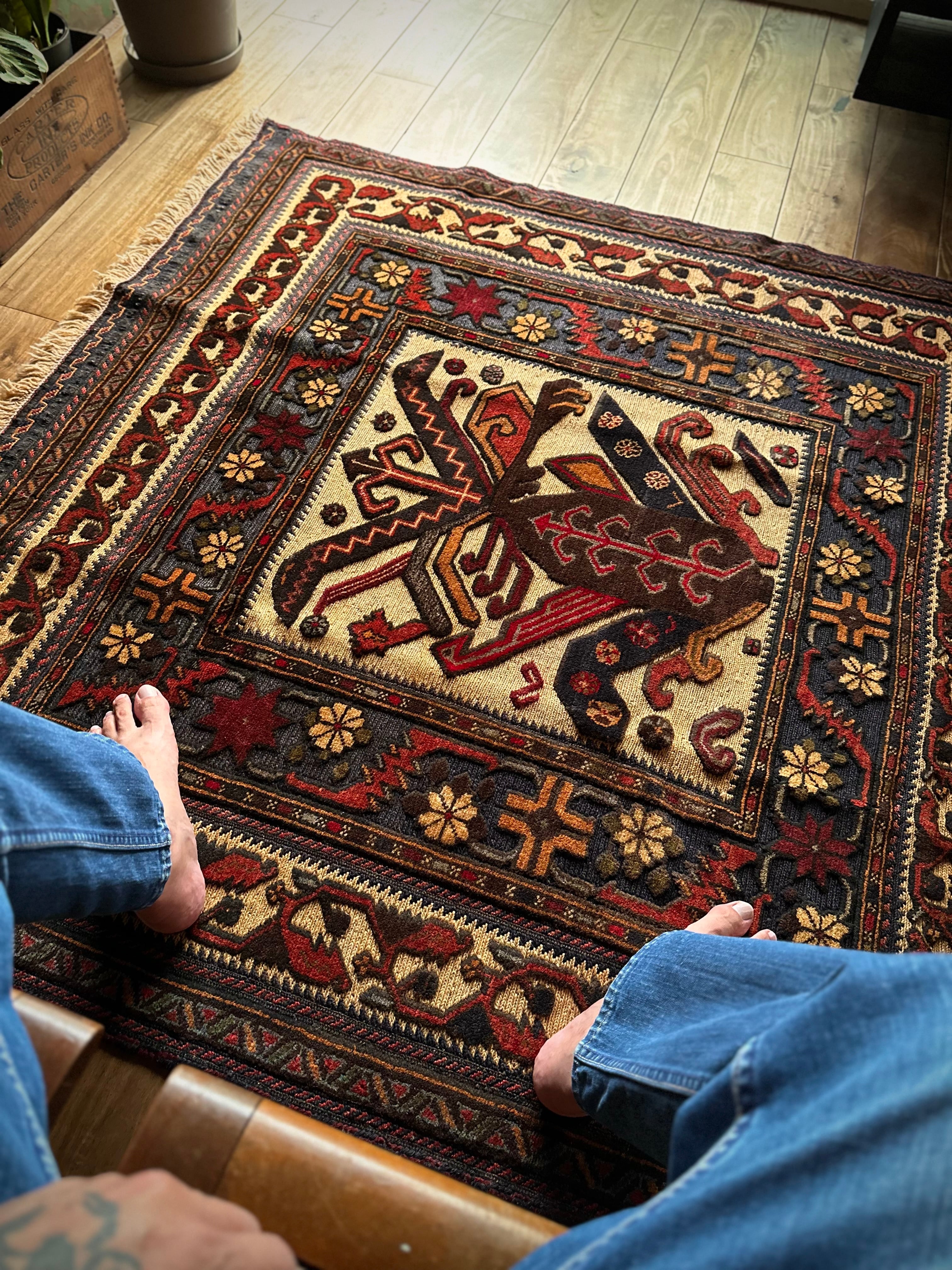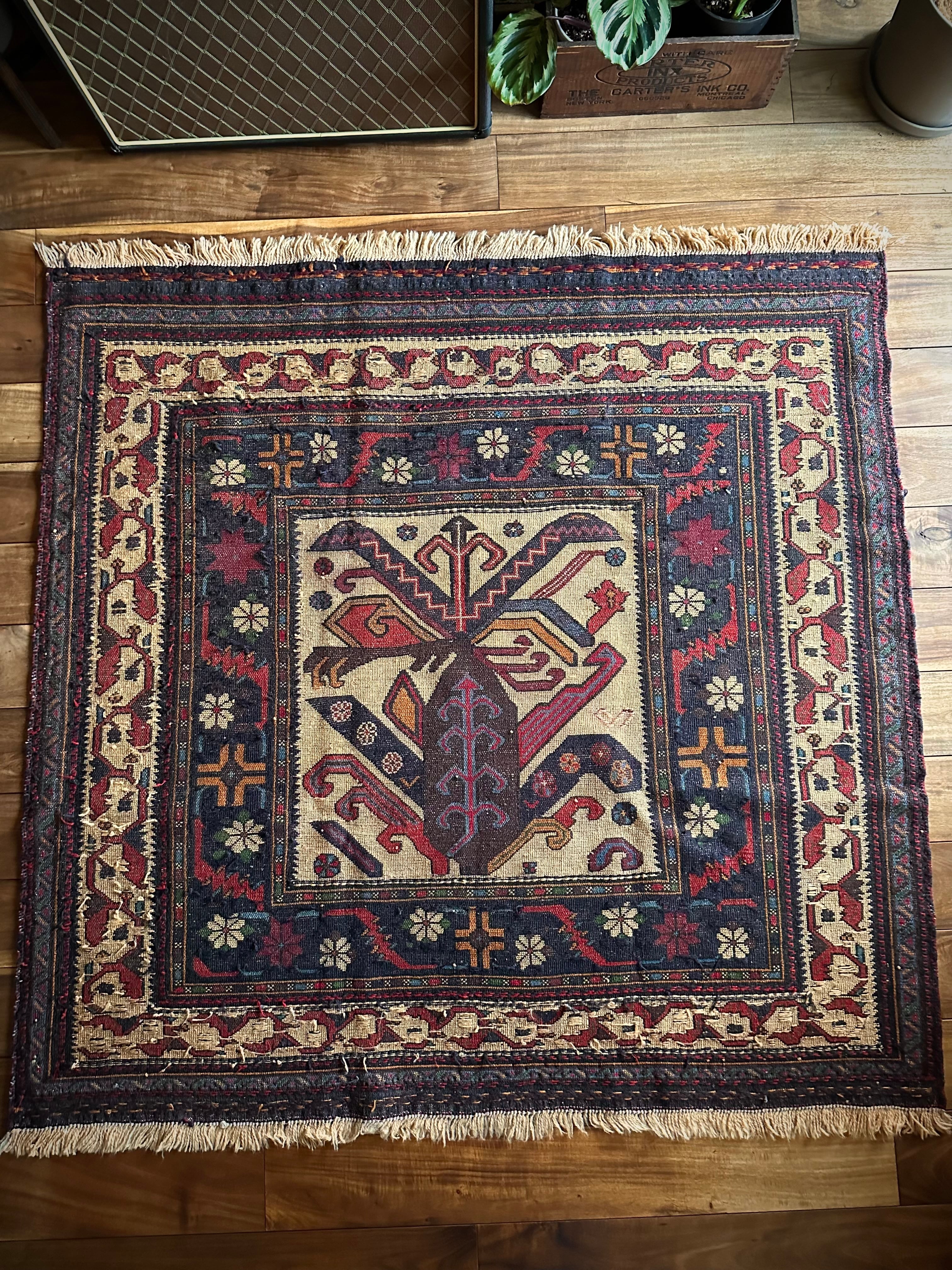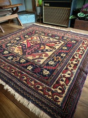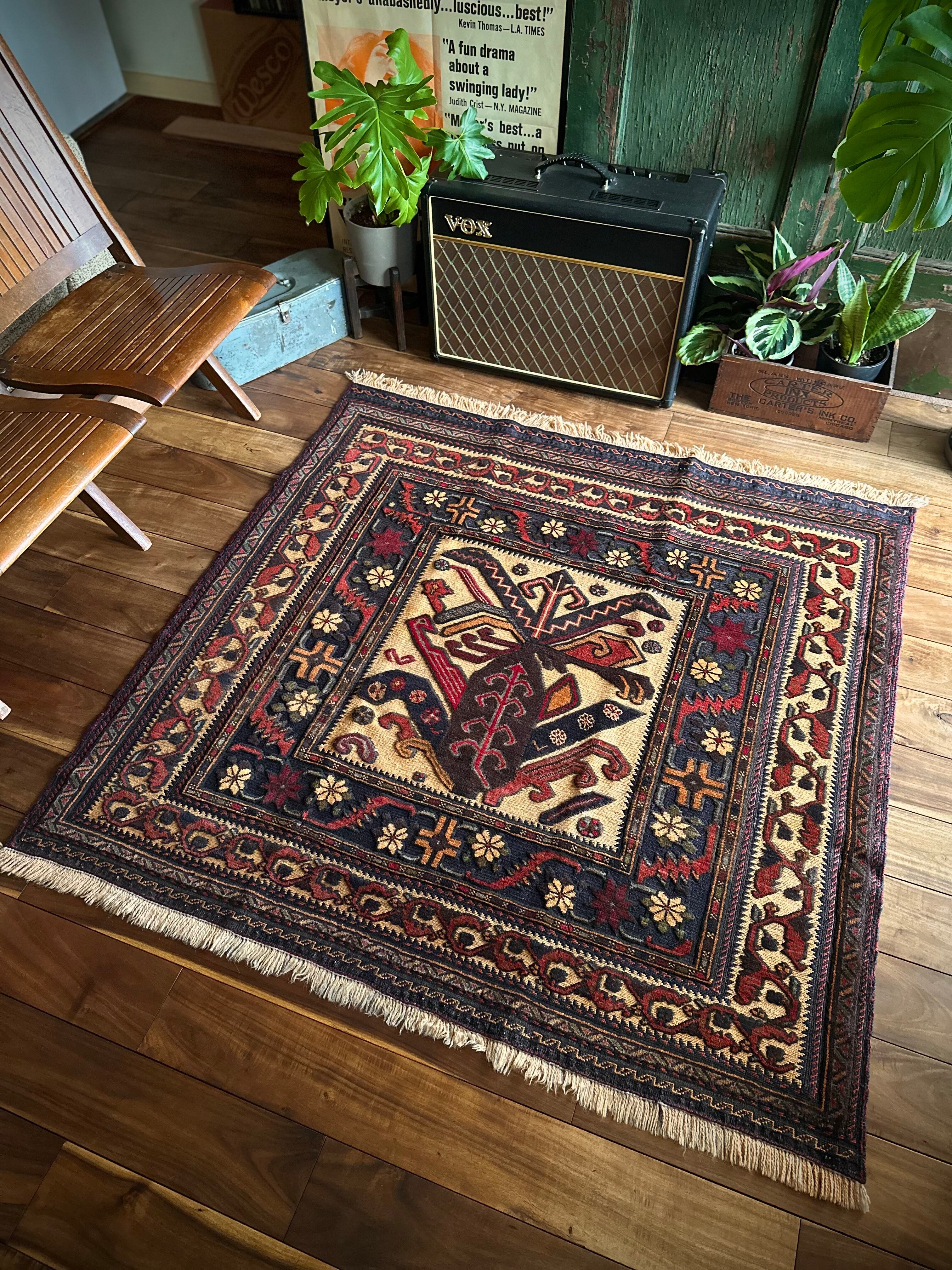 ほぼ正方形に近い珍しい柄のこちらは、アフガニスタンはヘラート州の山岳地帯に居住するタイマニ族のトライバルラグで、彼ら独特のプリミティブ感満載の荒々しいスタイルとは一線を画した、非常に繊細な織りのキリムっぽいラグになります。