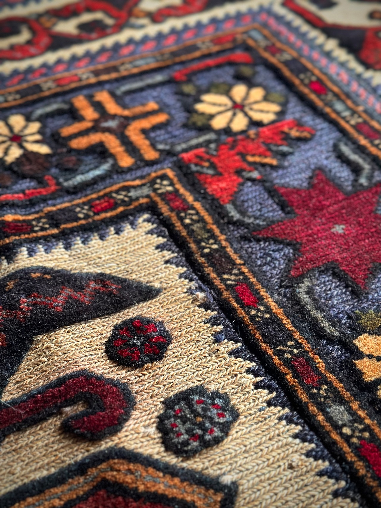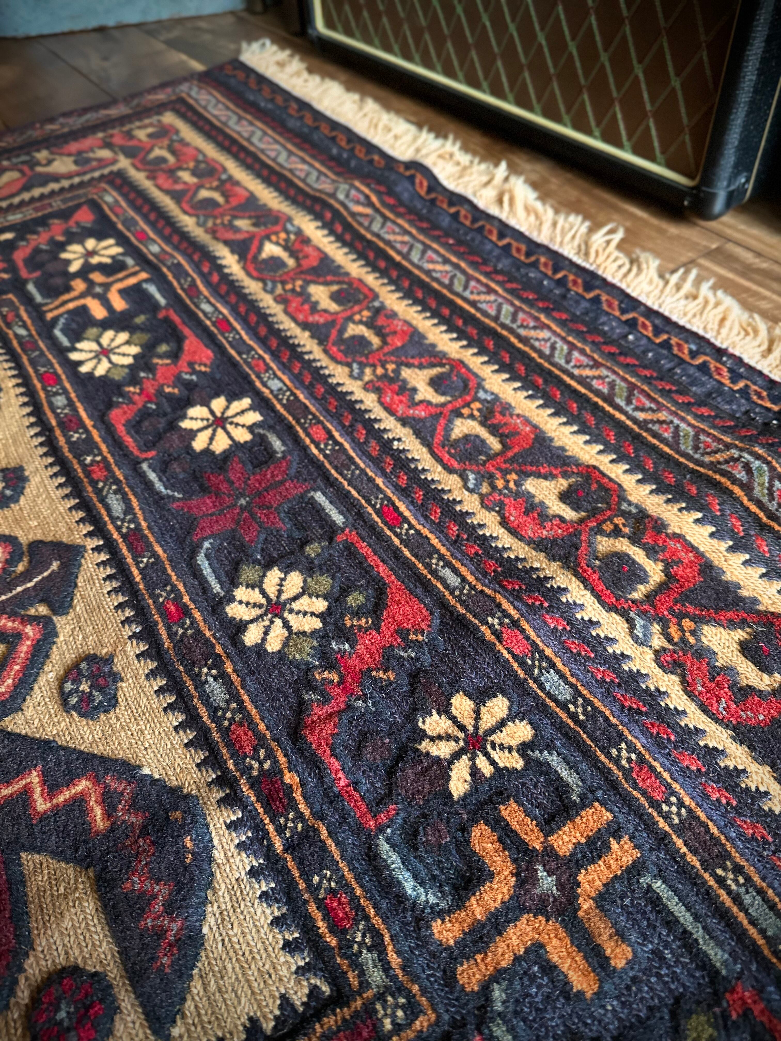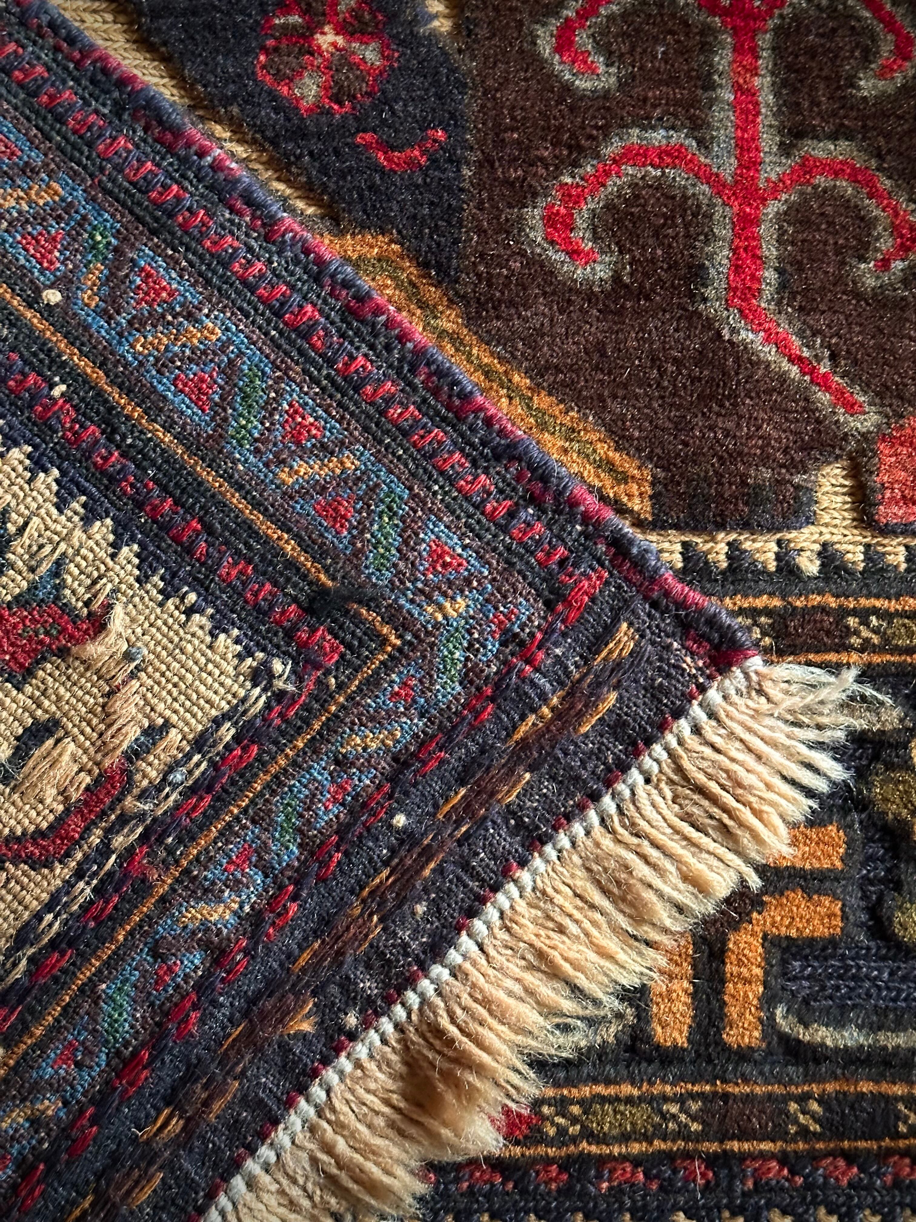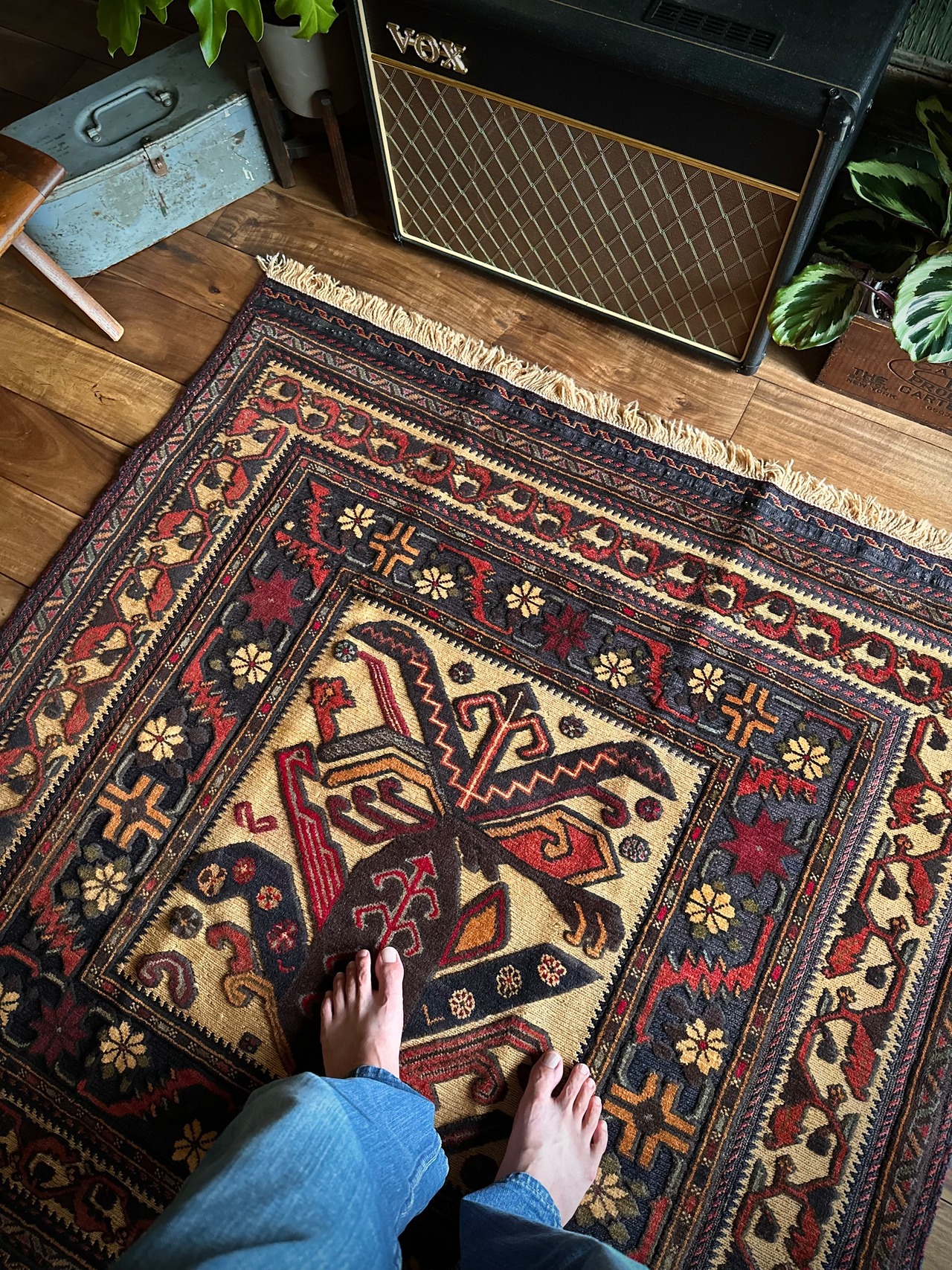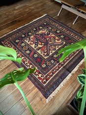 最後にラグそのものに関しては羊毛特有の匂いがあり、採寸は中央付近で計測していますが、手織りならではの歪みによる誤差や水洗いクリーニングによる縮み、また草木染めによる経年劣化の色ムラなどがありますが、それもまたヴィンテージラグの魅力かとご理解ください。