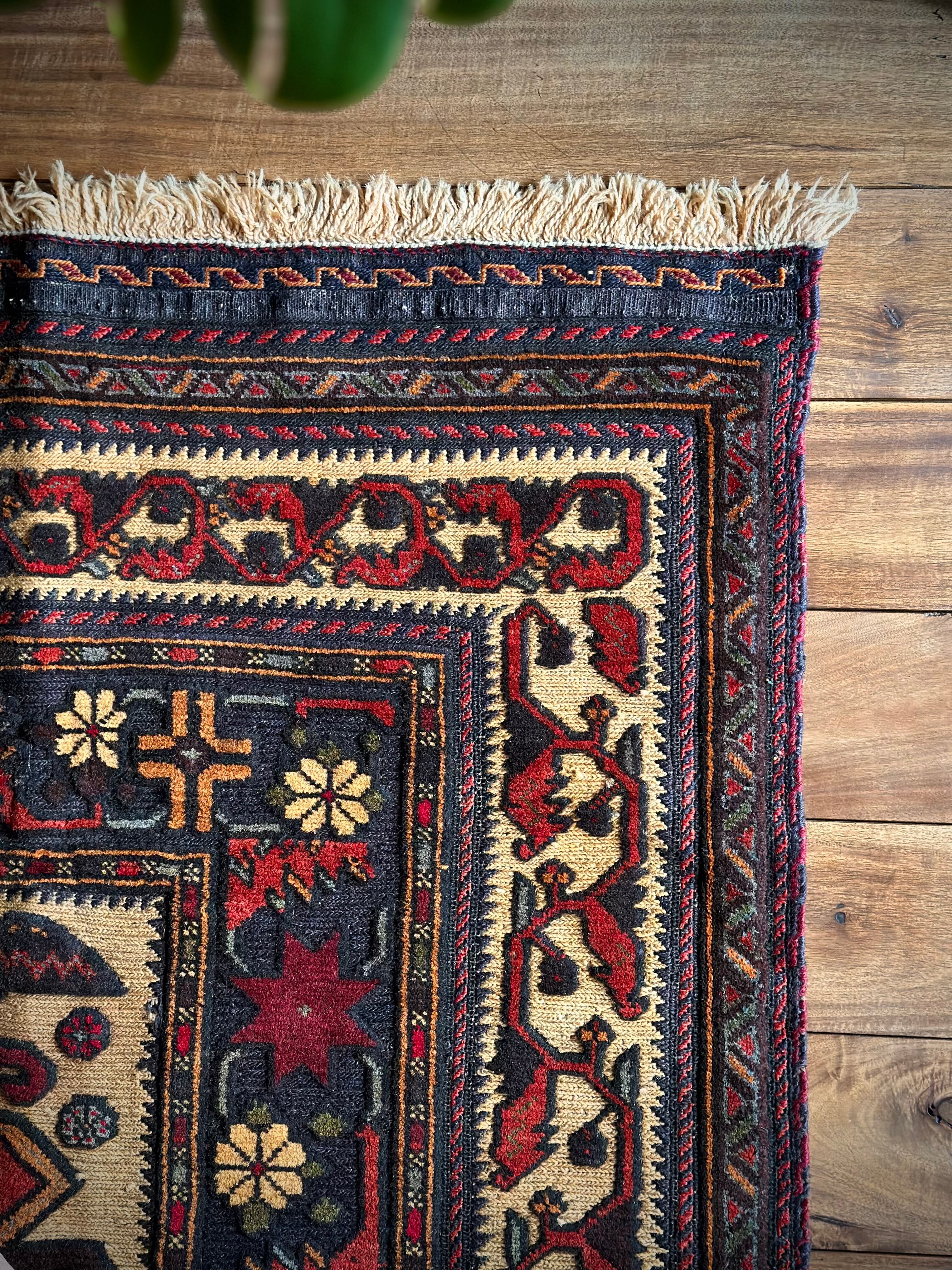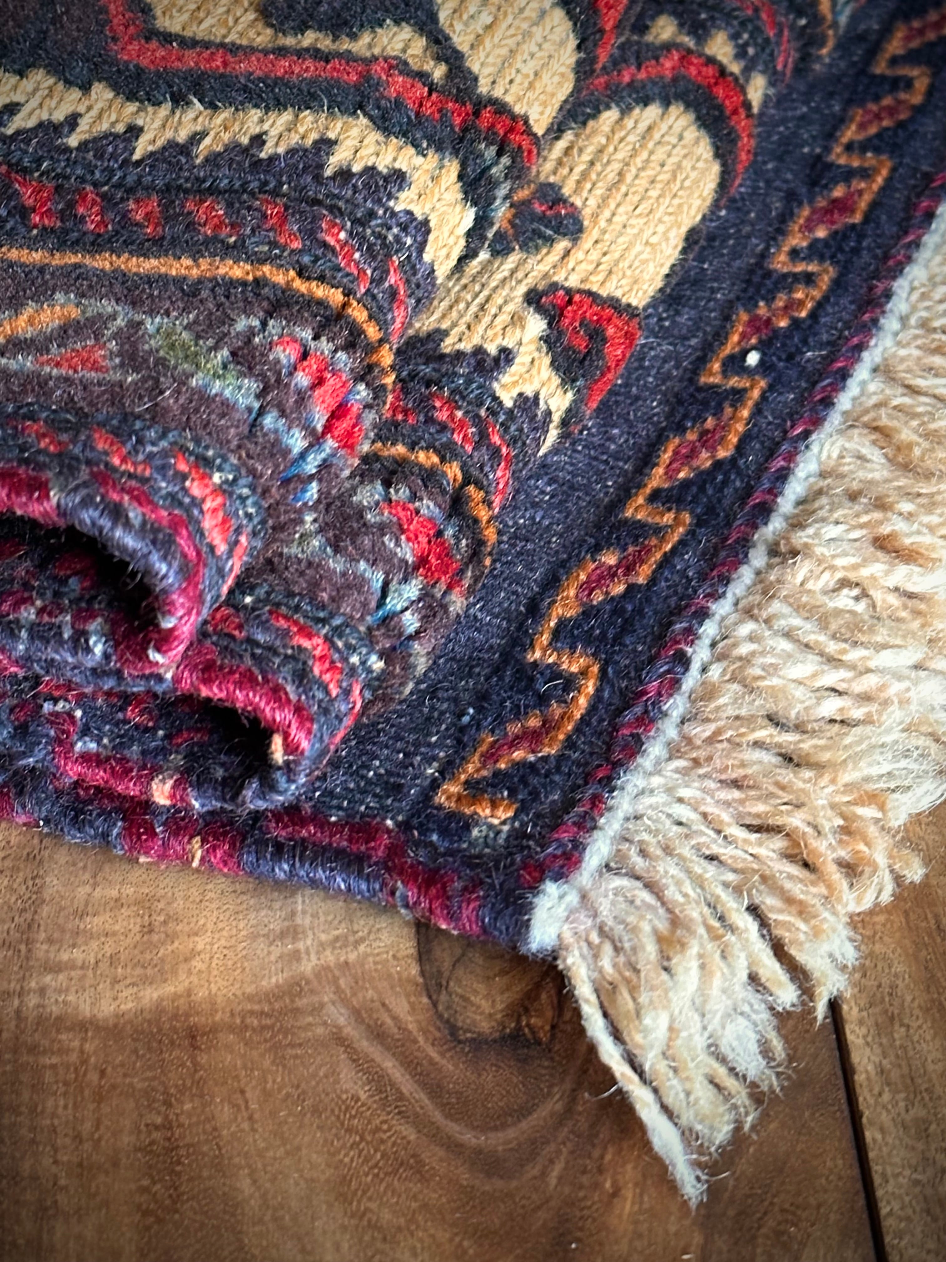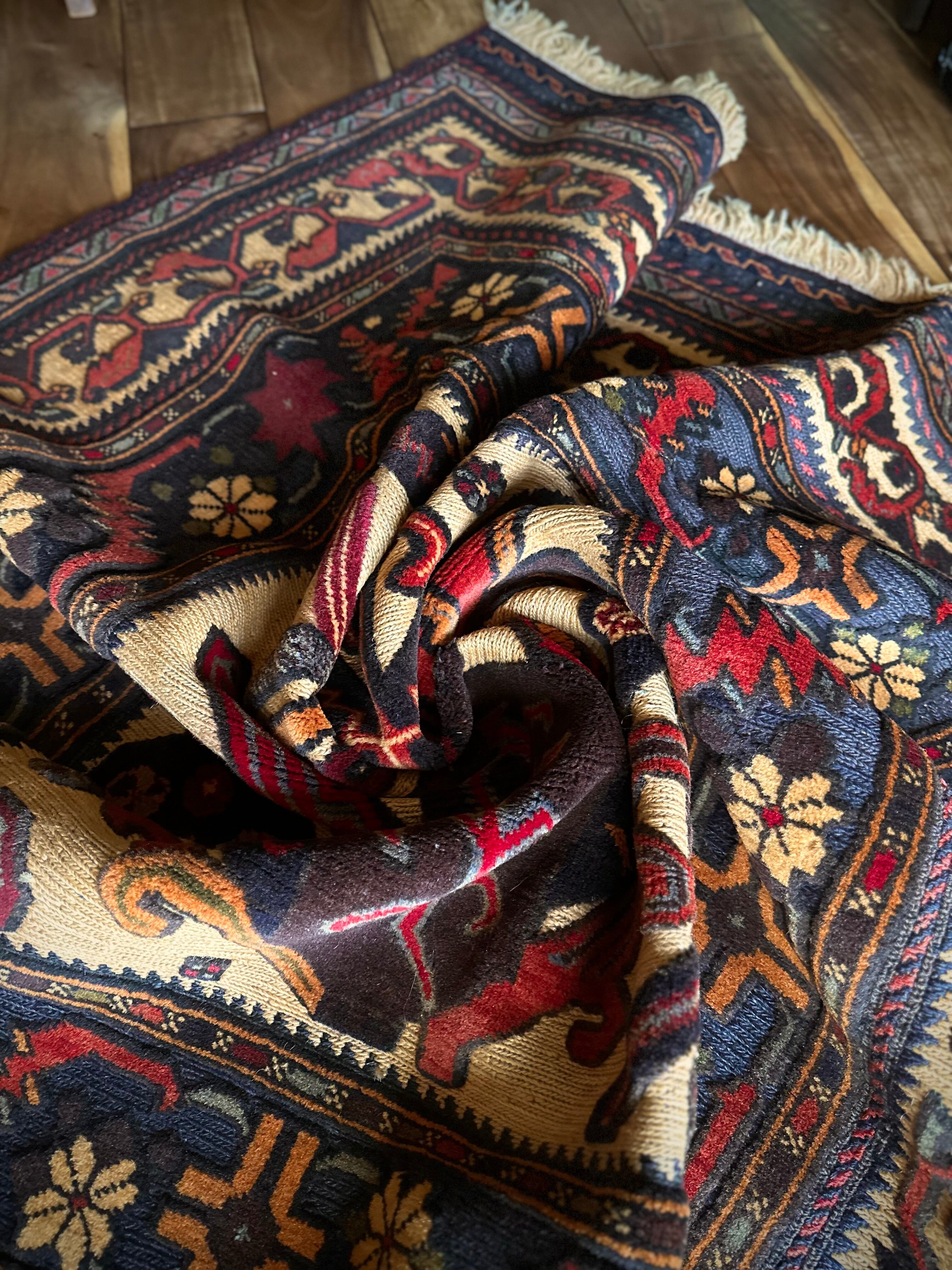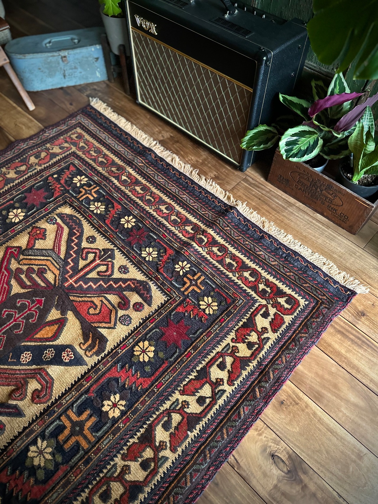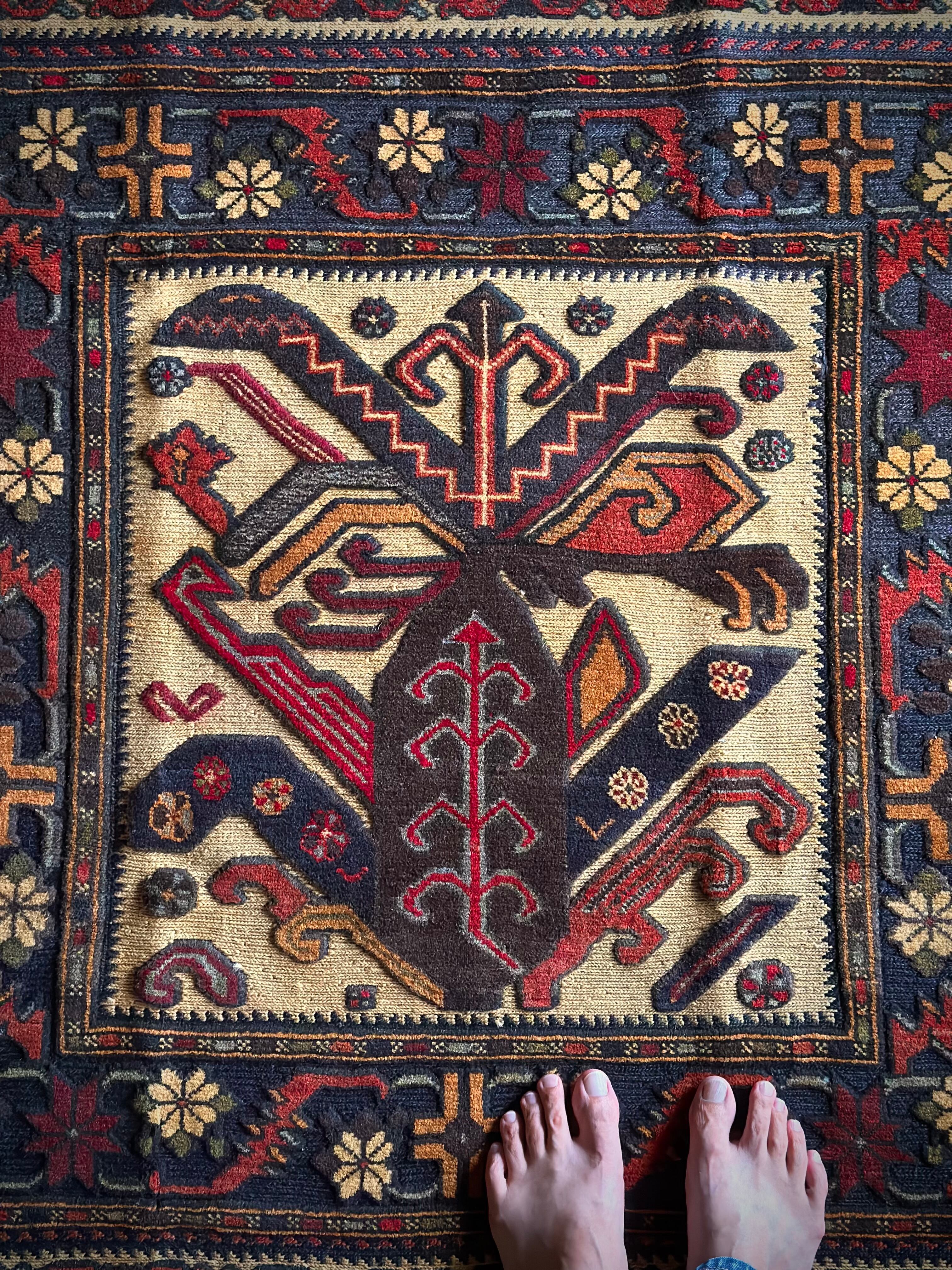最後にラグそのものに関しては羊毛特有の匂いがあり、採寸は中央付近で計測していますが、手織りならではの歪みによる誤差や水洗いクリーニングによる縮み、また草木染めによる経年劣化の色ムラなどがありますが、それもまたヴィンテージラグの魅力かとご理解ください。